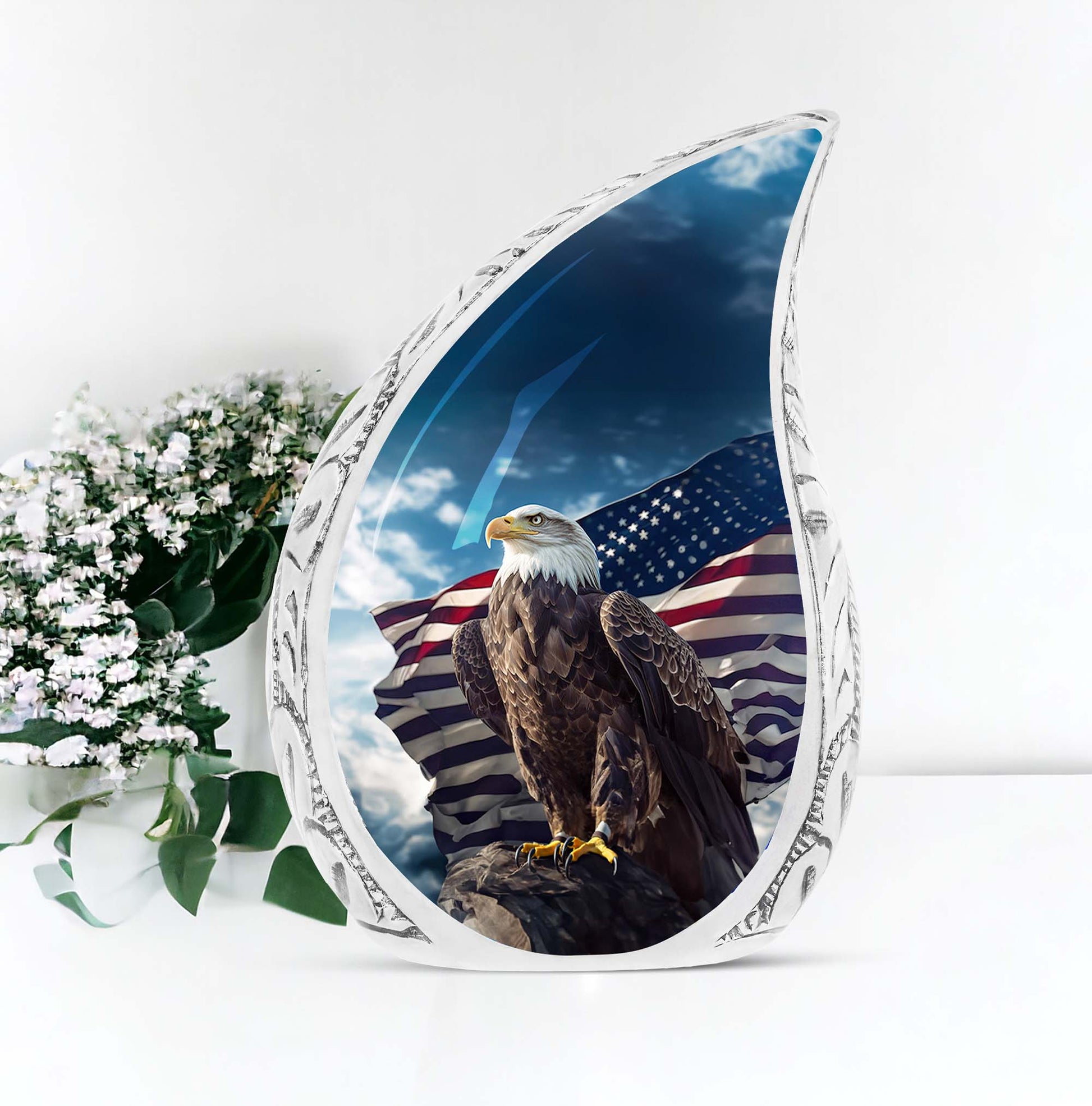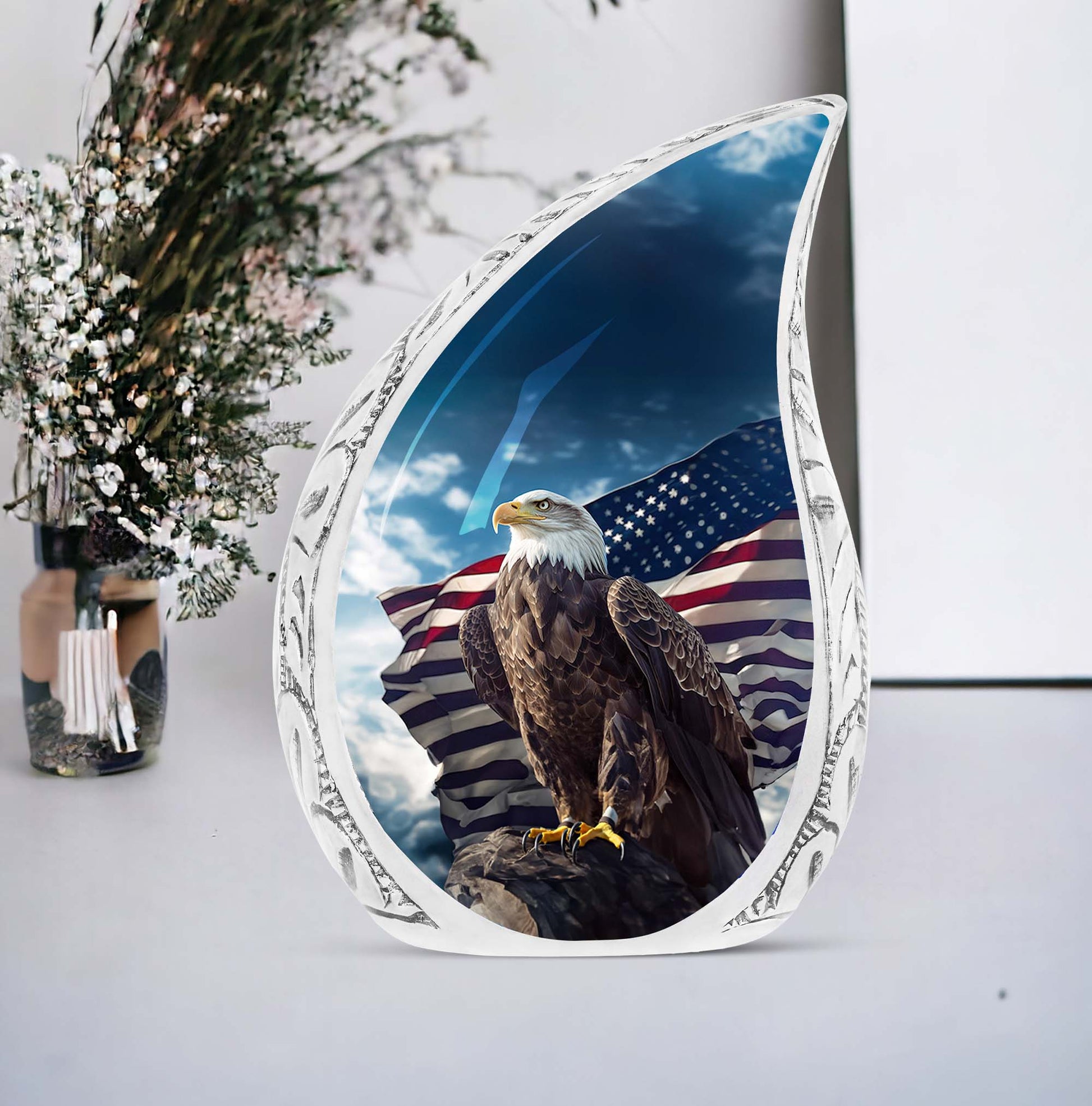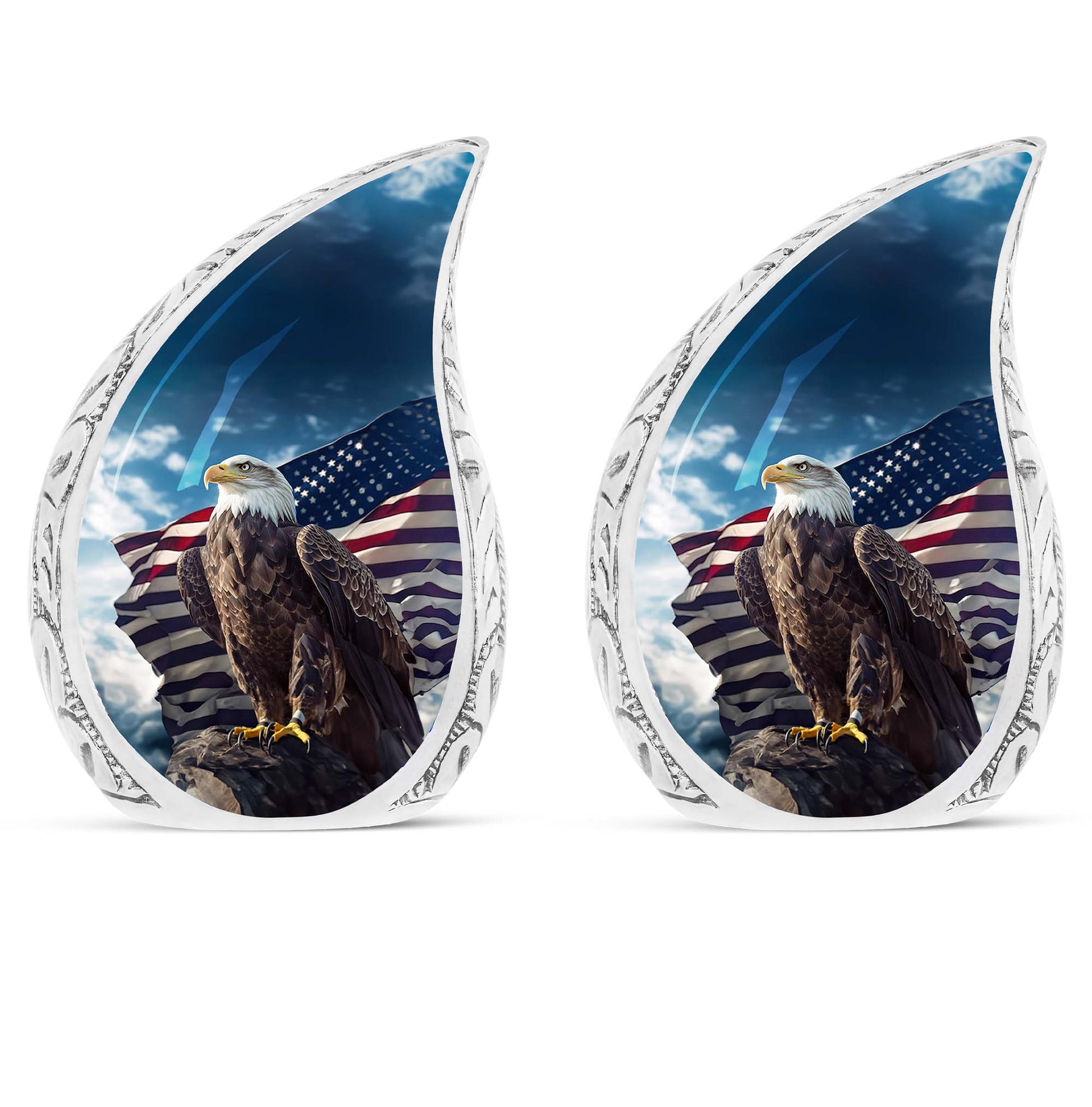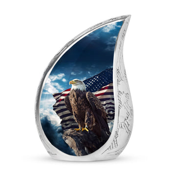 Experience the sublime artistry and craftsmanship with our 10-inch 'Eagle Urn', a beautiful resting place to preserve precious memories. Cast from high mass, durable Aluminium, this piece weighs a solid 3.3 pounds, signifying its robust stature. Despite its imposing presence, it carefully cradles up to 200 cubic inches of remains within its core. Our 'urn for ashes' is not just an object, but a touching tribute to your cherished one. Encased with your purchase comes a velvet pouch, providing a secure yet soft containment for the ashes. Adding a personal touch is made effortless with our customization offer - engrave your loved one's name to immortalize their remembrance. Although referred as 'Large Urns', this urn fits easily within a 3-inch space, making it both heartfelt and practical. Often regarded synonymously with 'cremation urn' or 'urns for cremated remains',