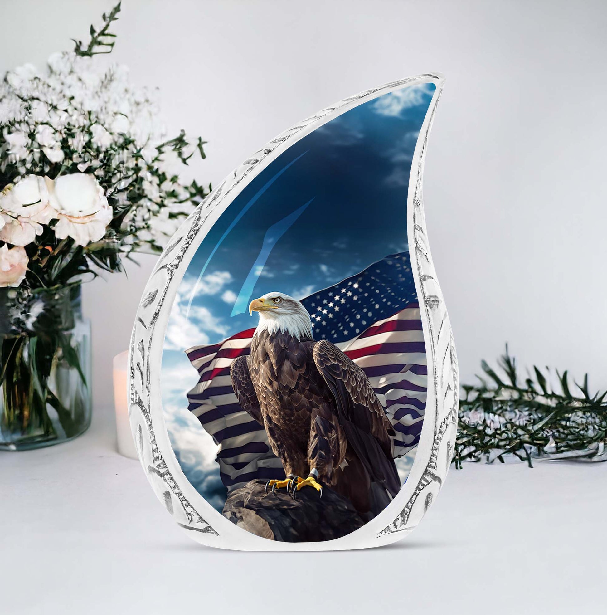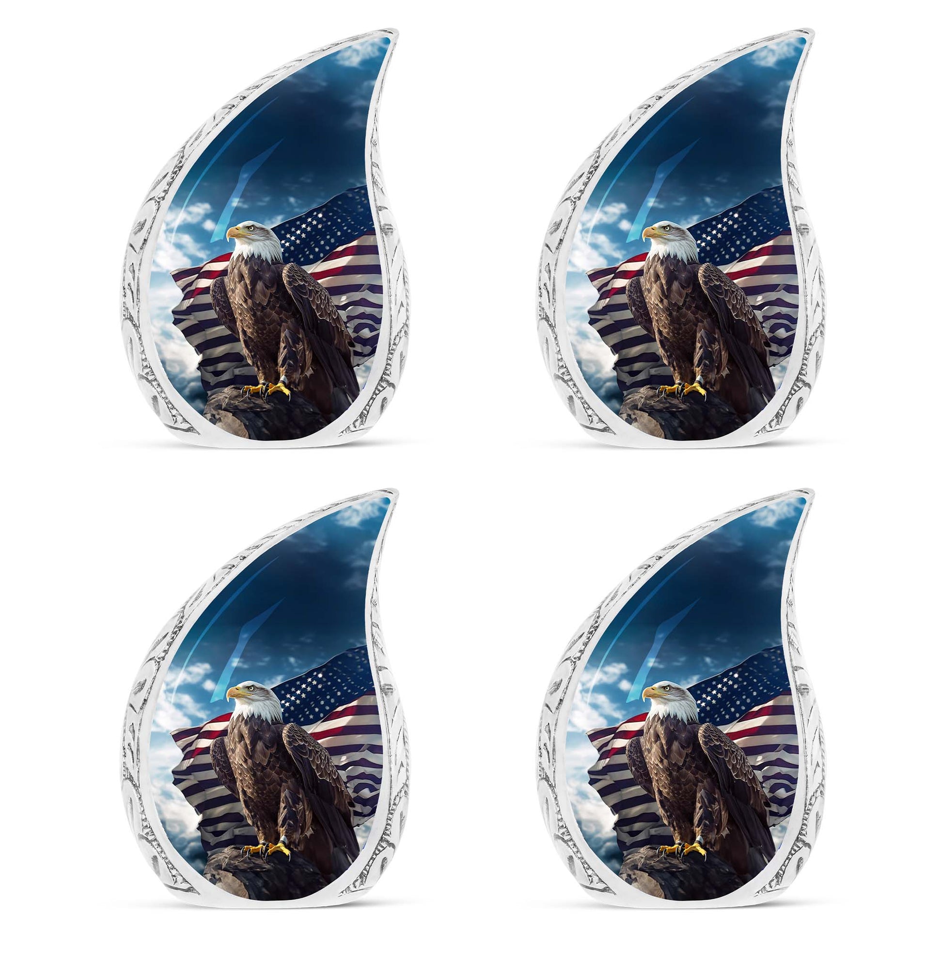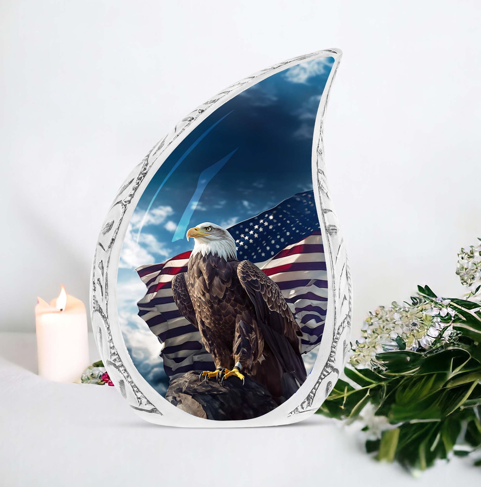 Experience the sublime artistry and craftsmanship with our 10-inch 'Eagle Urn', a beautiful resting place to preserve precious memories. Cast from high mass, durable Aluminium, this piece weighs a solid 3.3 pounds, signifying its robust stature. Despite its imposing presence, it carefully cradles up to 200 cubic inches of remains within its core. Our 'urn for ashes' is not just an object, but a touching tribute to your cherished one. Encased with your purchase comes a velvet pouch, providing a secure yet soft containment for the ashes. Adding a personal touch is made effortless with our customization offer - engrave your loved one's name to immortalize their remembrance. Although referred as 'Large Urns', this urn fits easily within a 3-inch space, making it both heartfelt and practical. Often regarded synonymously with 'cremation urn' or 'urns for cremated remains',