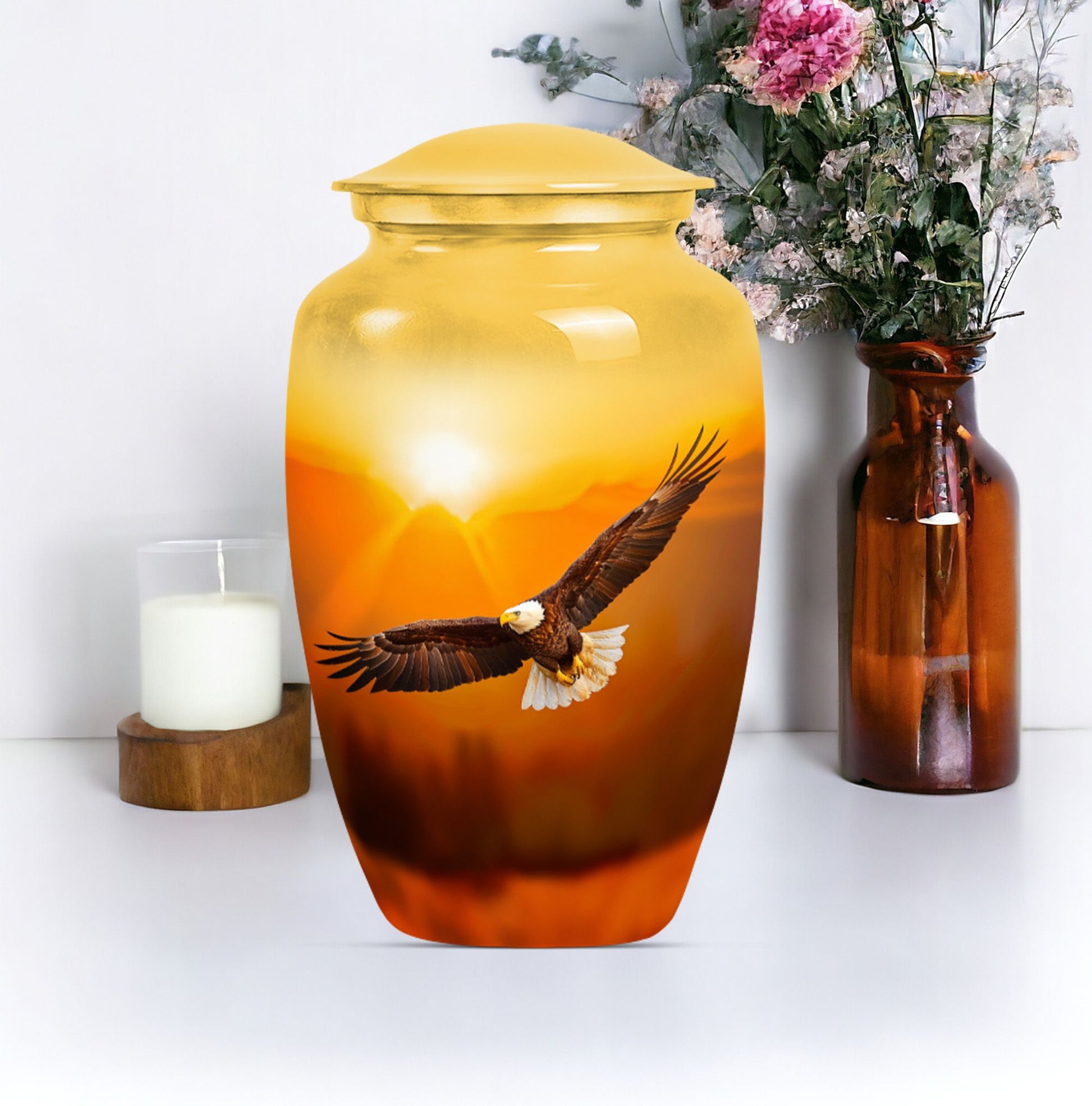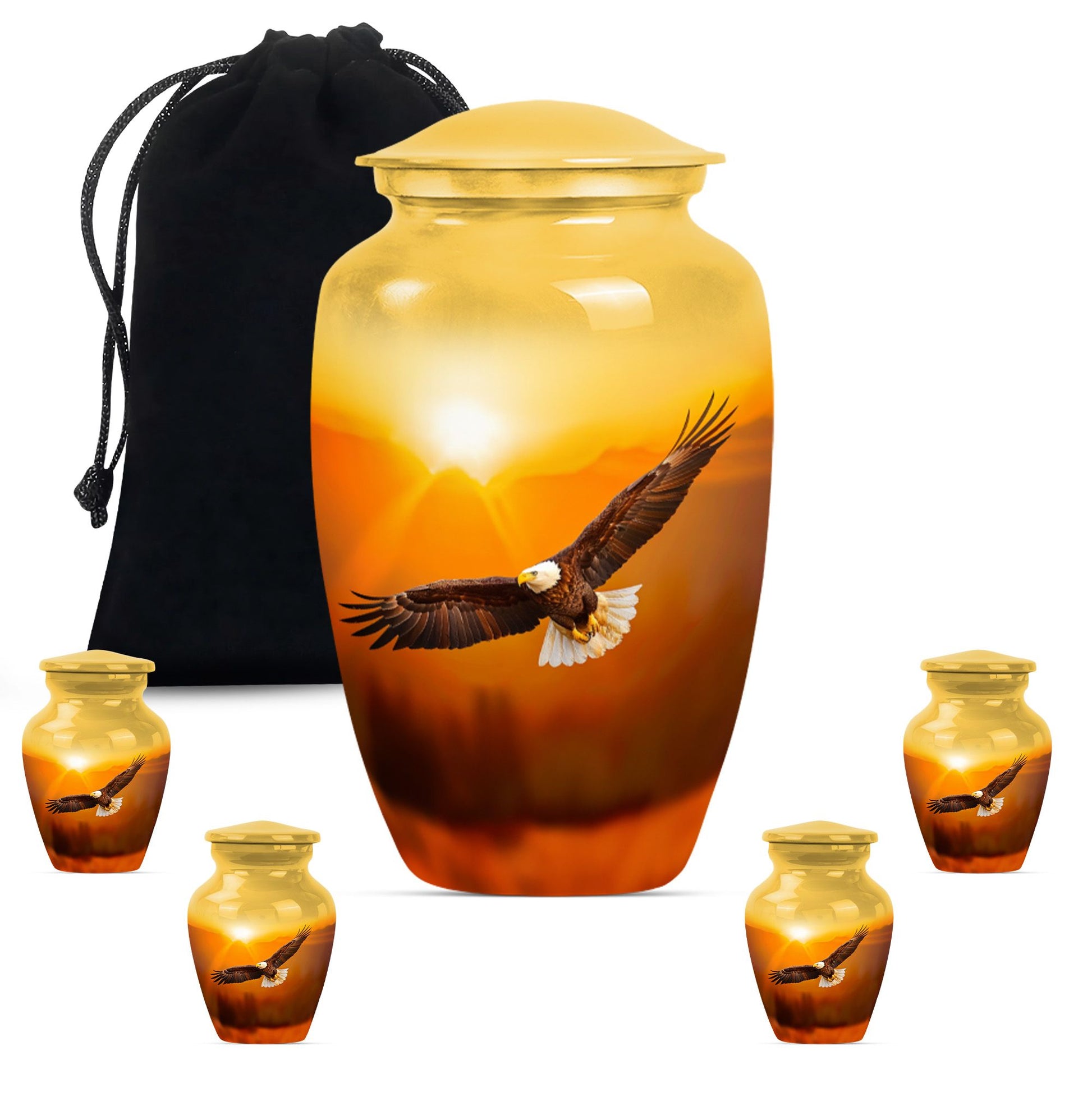 Introducing our EAGLE Urn, a touching symbol of remembrance for your loved one. Sized at a substantial 10-inch height, our cremation urn has been crafted with meticulous detail out of solid aluminium. The urn features a captivating Wolf Howling theme, adding a profound symbolism to this restful memorial medium urn. Weighing in at 3.3 pounds, it is stately without being overbearing. It has a notably high capacity of 200 cubic inches, providing ample space for adult human ashes. Whatsmore, customization options are available to have names engraved, making it a truly meaningful tribute. Alongside your purchase, you'll receive a velvet pouch designed for the dignified containment of ashes. Our funeral burial urns for adult human ashes encapsulate the solemn beauty of final restful places, offering a peaceful, comforting presence through every detail. Each ash burial urn mirrors love, affection, and respects the unique journey of an individual. Every element of our large urns has been considered for its mournful richness and healing properties. Choose an EAGLE Urn and honor your beloved in the most respectful way possible. It is the ideal memorial medium urn for the dearly departed.