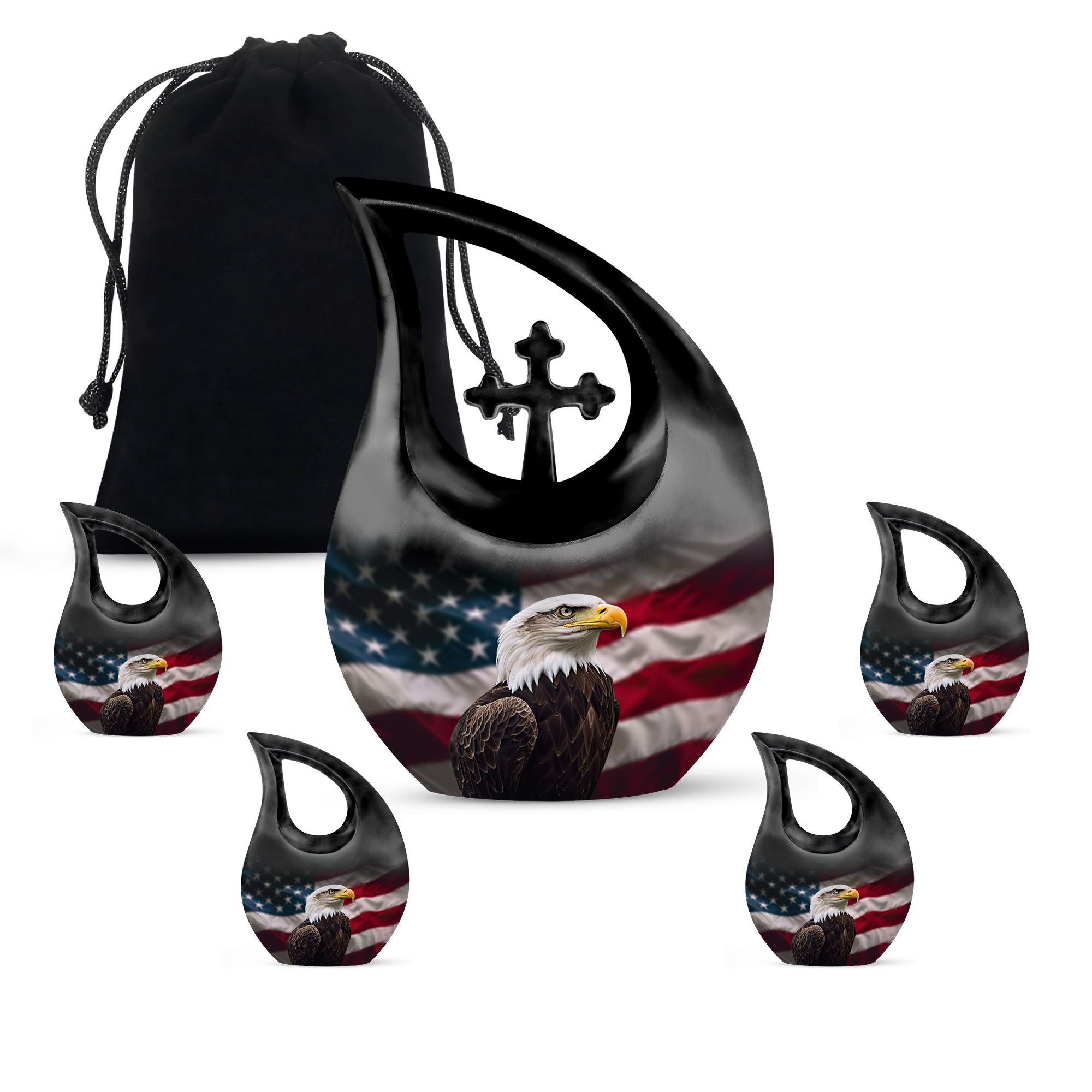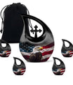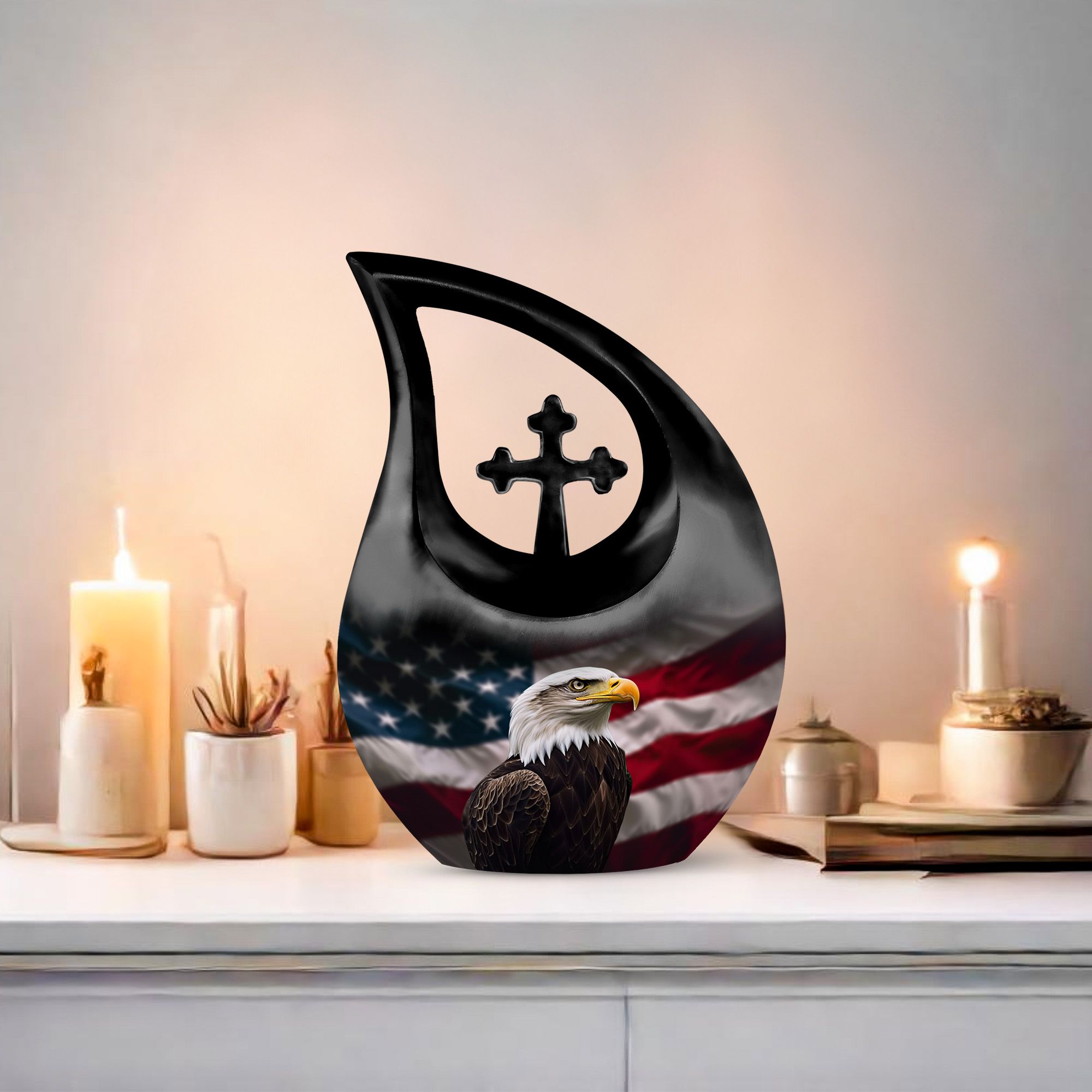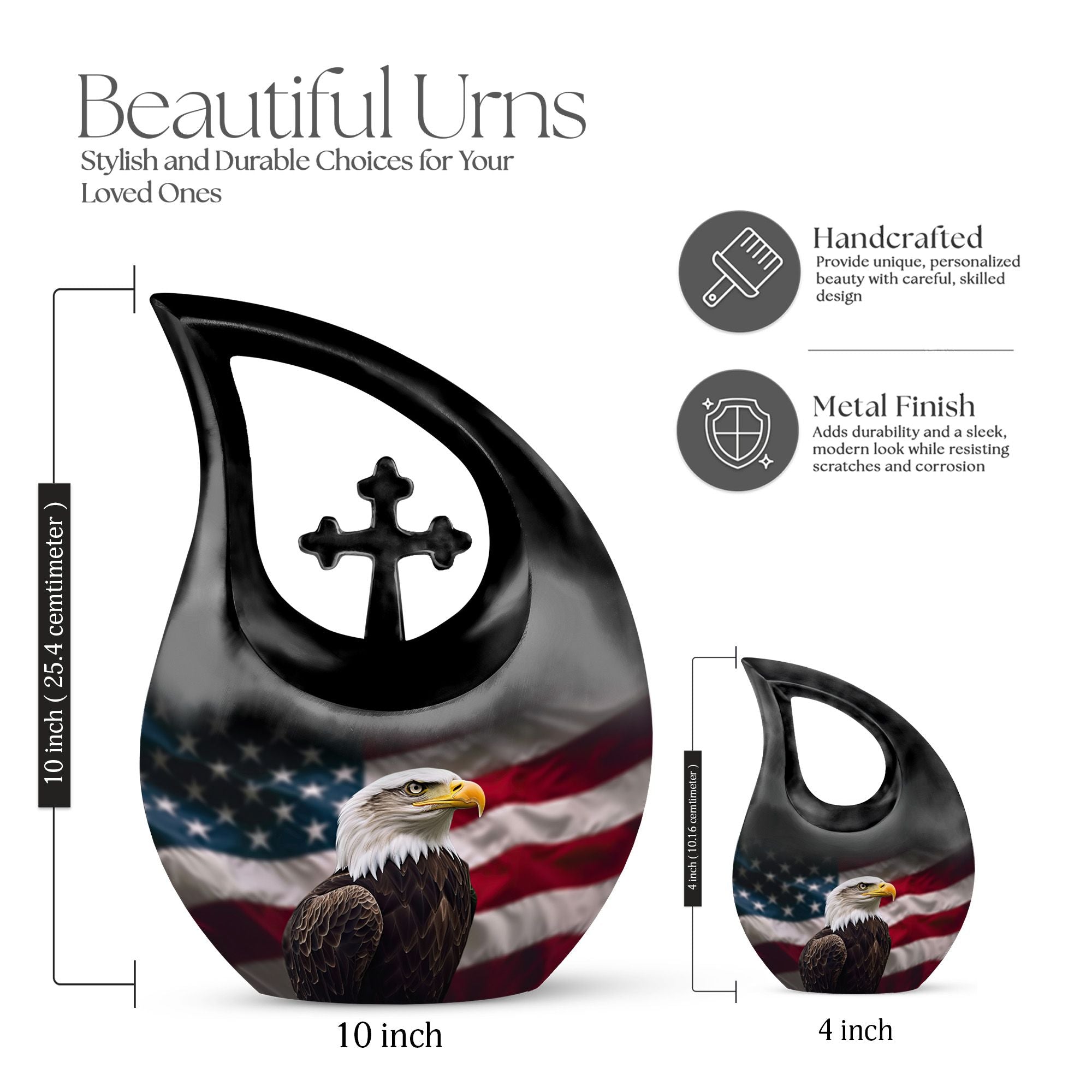 Crafted from durable aluminum, this 10 inch urn features a soaring eagle across the American flag—an iconic emblem of strength and protection. The secure screw-top lid ensures dependable safekeeping, making it suitable for adult urns women, beautiful urns women, or keepsake urns for men ashes when coordinating memorial pieces are needed. Its polished finish provides a bold and elegant presence, whether used for tiny urns for women & men or for ashes keepsake women options shared among loved ones.