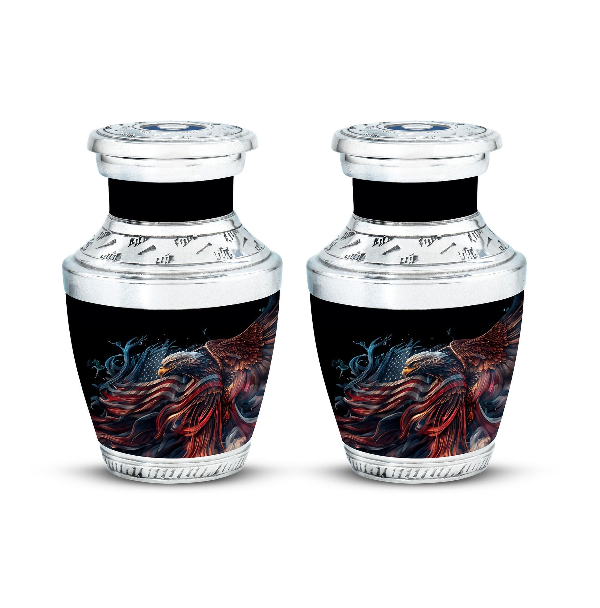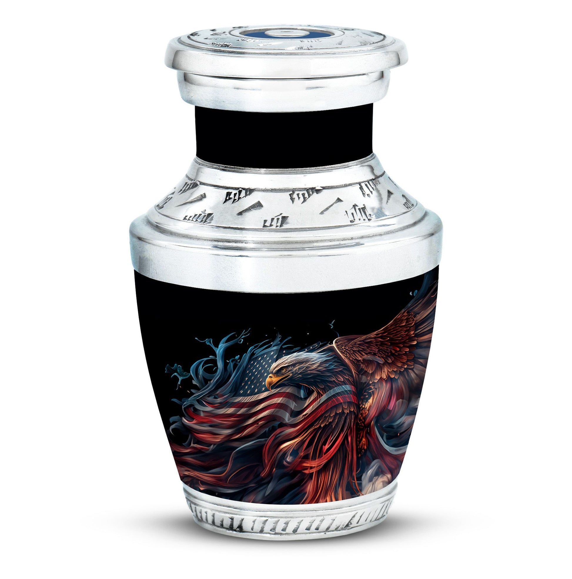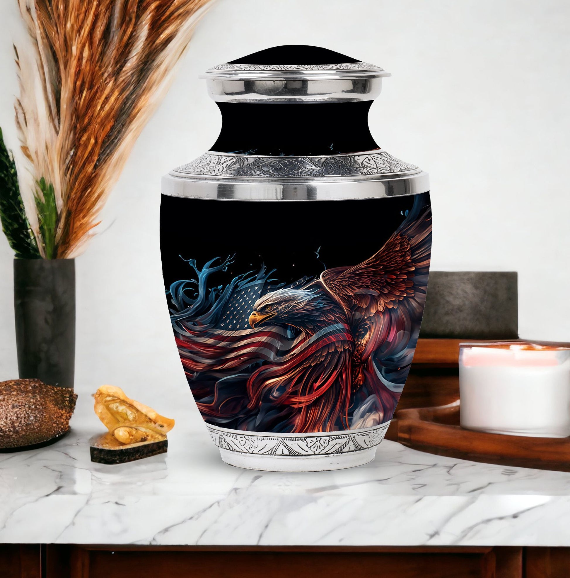 Engulf yourself in the comfort of memories with our elegantly crafted Eagle Urn, an epitome of love and respect for your loved ones. Rendered from robust and lightweight aluminium, this large-sized urn is designed for heart-warming memorials. The urn which weighs 3.3 pounds, stands tall at 10 inches in height with a capacity of about 200 cubic inches, a secure resting place for treasured remains. A 3 Inch size makes it a compatible choice for fitting in various sites, be it your living room or a corner in your office. This urn for ashes can be personalized with engraved names, adding a touch of exclusivity to your poignant tribute. With each purchase, we offer a velvet pouch for discrete containment of ashes, augmented with a comforting touch. As a lasting tribute to the deceased, this urn serves as an ideal blend of aesthetic and function. Our cremation urns, also referred to as decorative urns for human ashes or ashes holders for cremation, resonate with the solemnity and significance of the moment, turning painful farewells into a celebration of life well-lived. Many consumers seeking containers for human ashes or urns for Mom's ashes have found this piece exceptional, and we hope you do too.