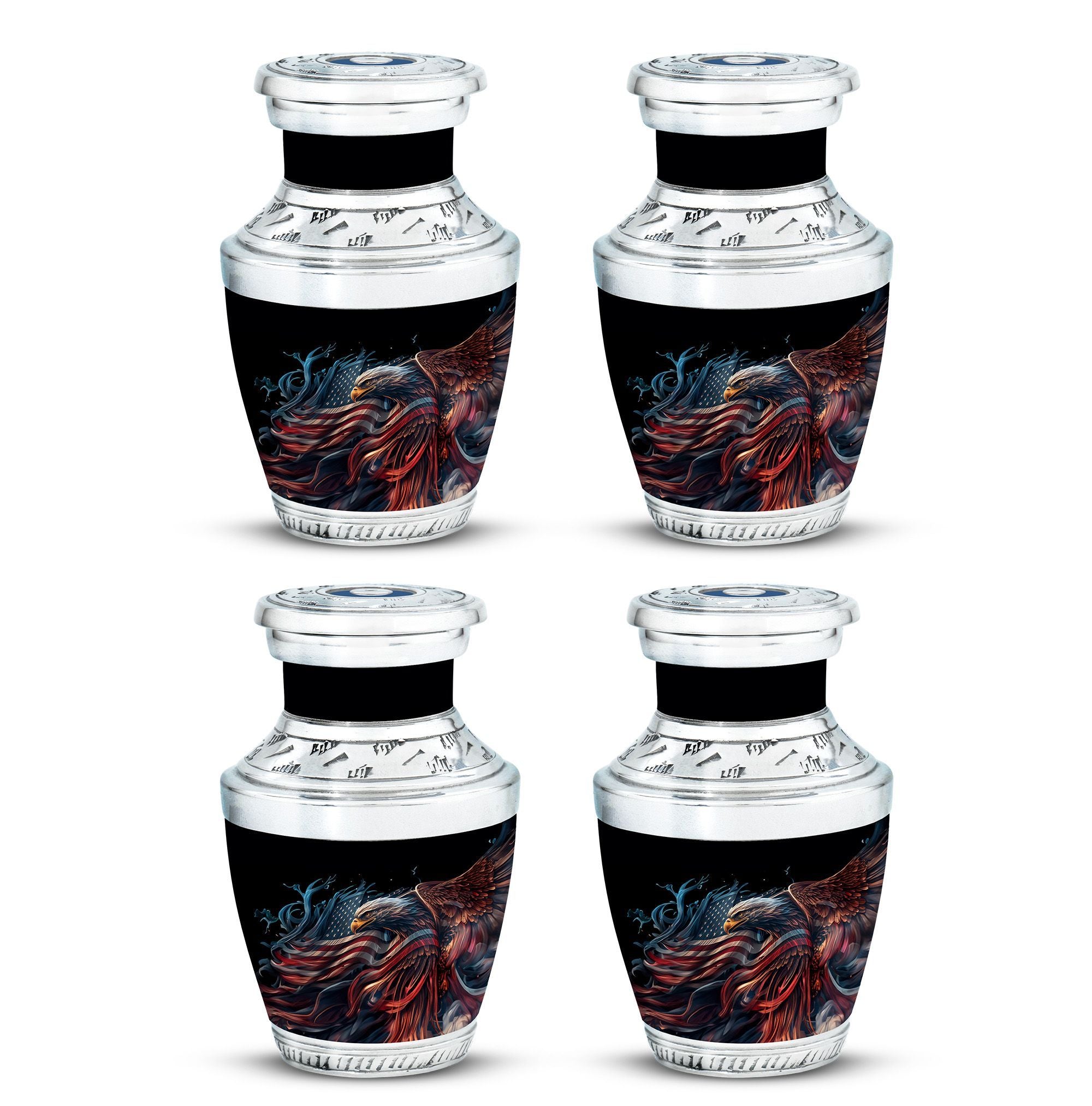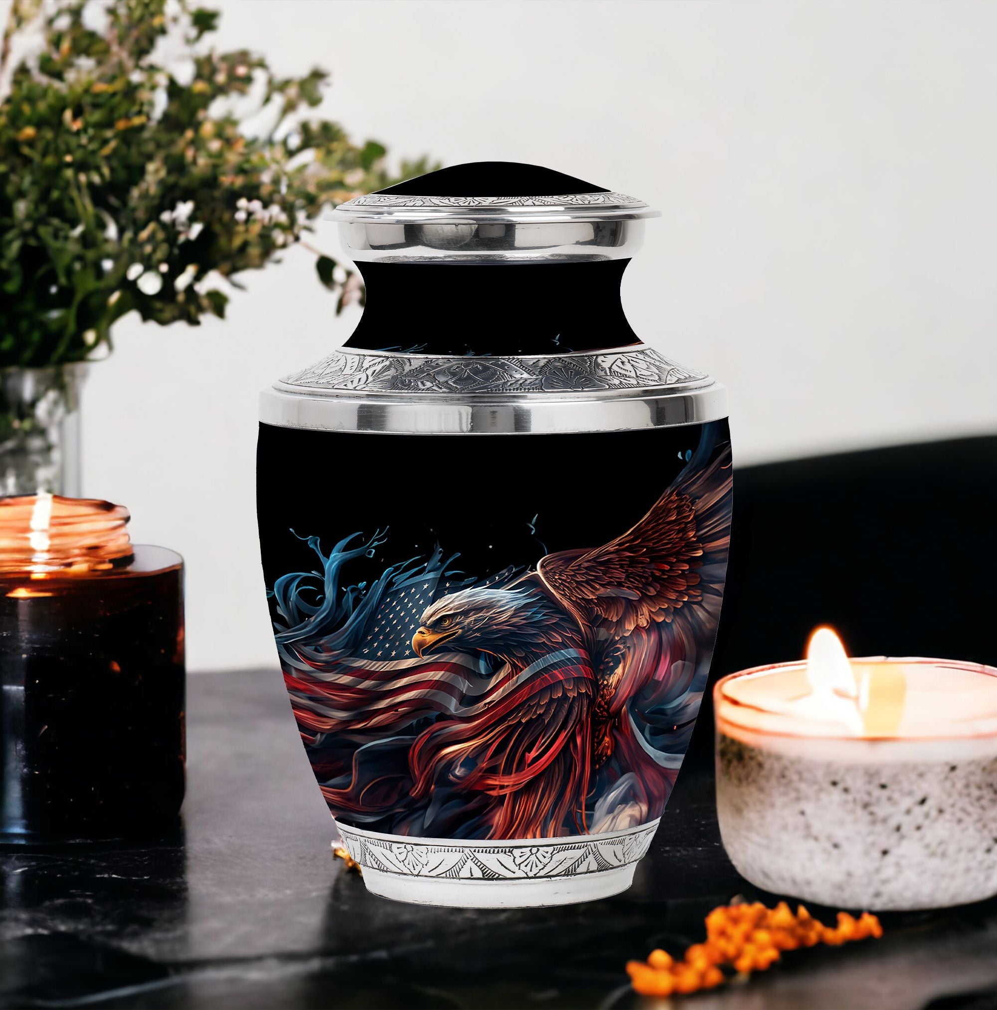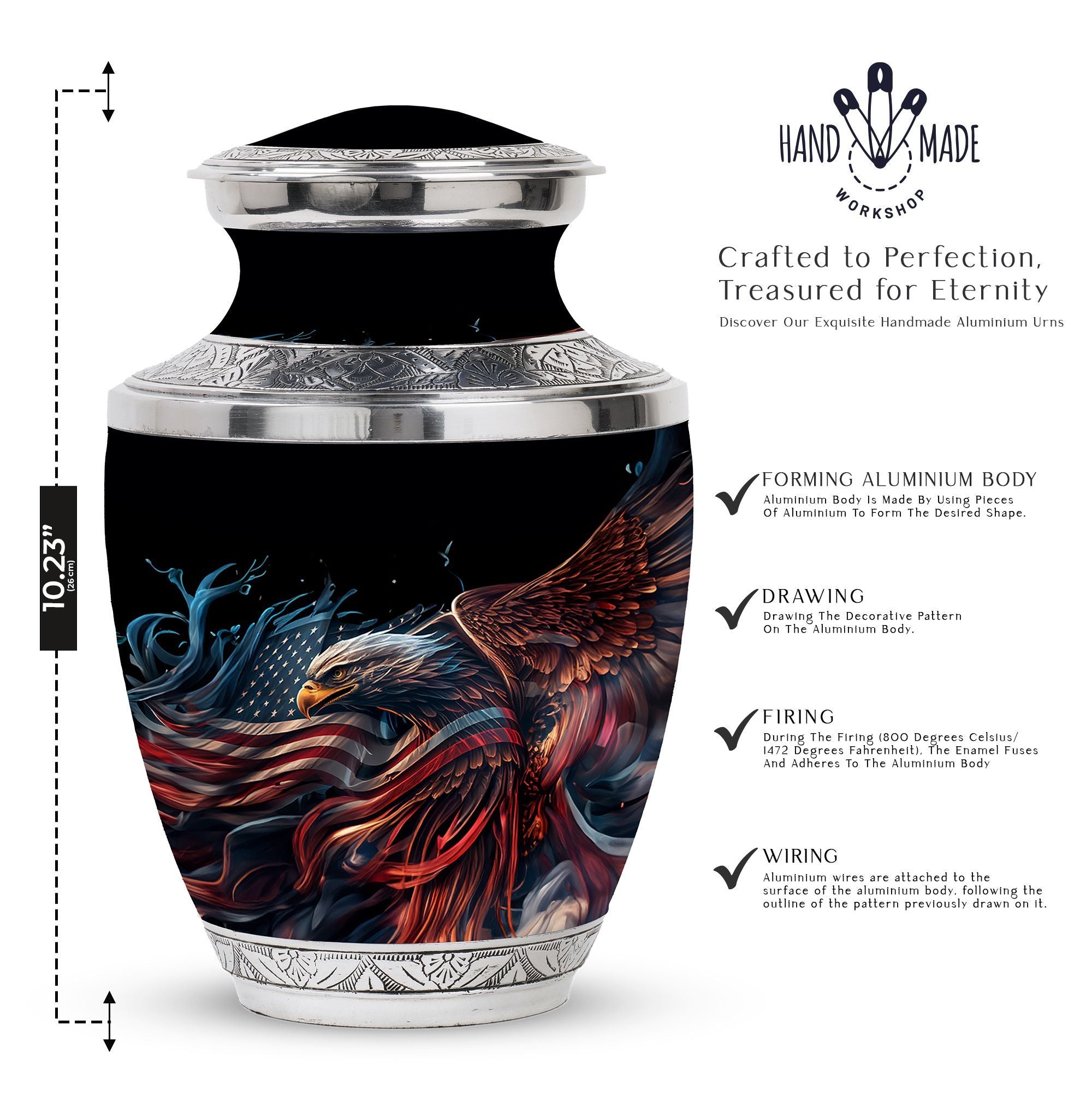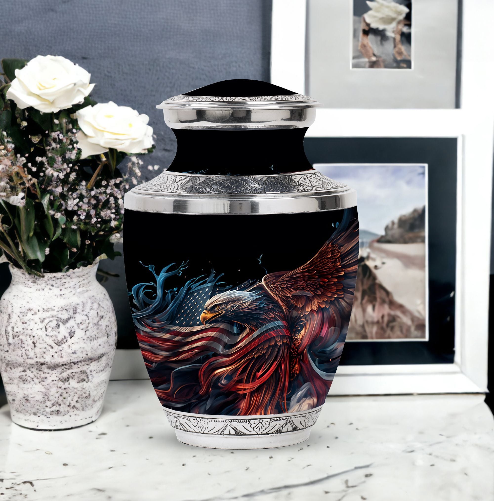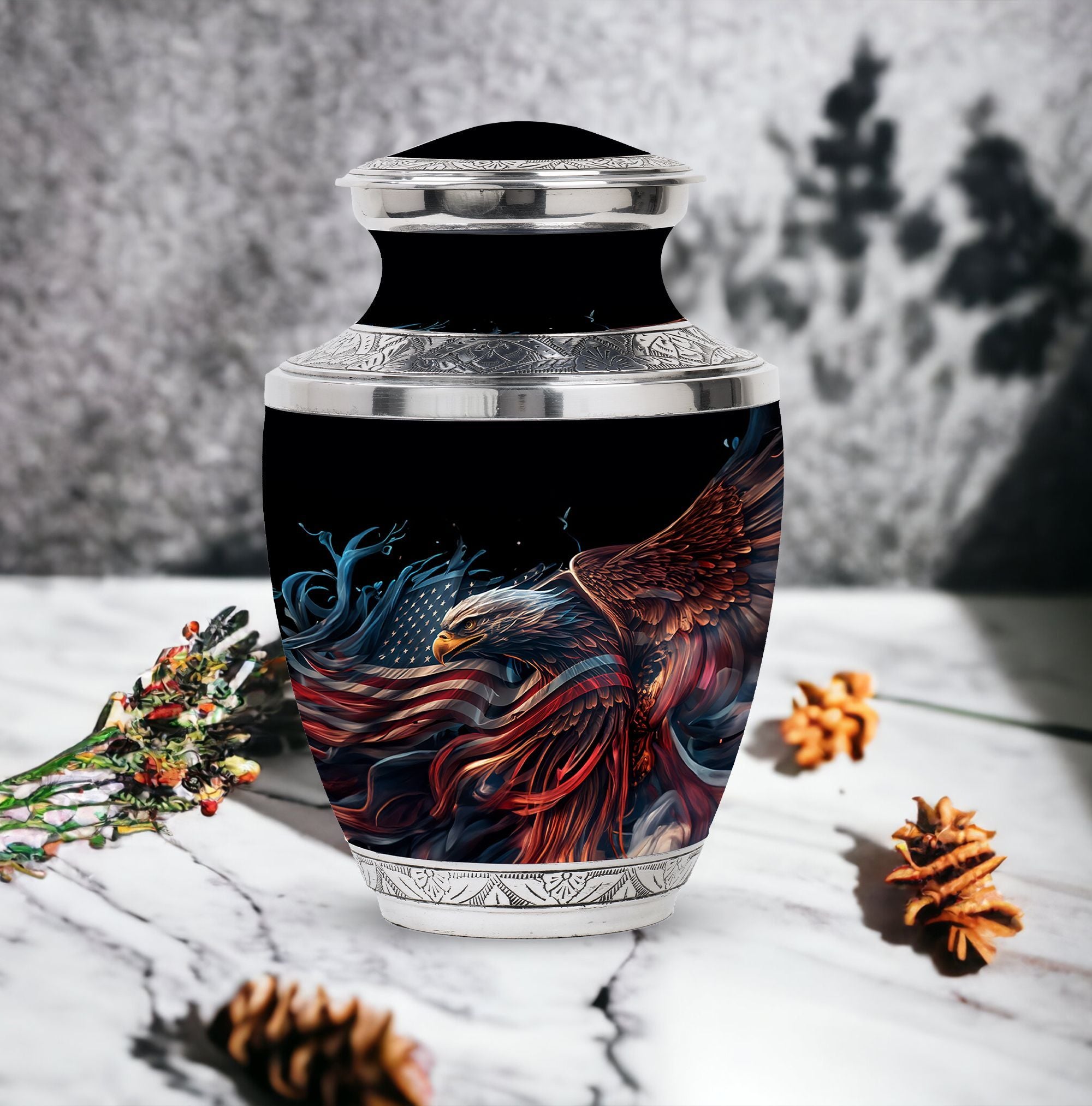 Engulf yourself in the comfort of memories with our elegantly crafted Eagle Urn, an epitome of love and respect for your loved ones. Rendered from robust and lightweight aluminium, this large-sized urn is designed for heart-warming memorials. The urn which weighs 3.3 pounds, stands tall at 10 inches in height with a capacity of about 200 cubic inches, a secure resting place for treasured remains. A 3 Inch size makes it a compatible choice for fitting in various sites, be it your living room or a corner in your office. This urn for ashes can be personalized with engraved names, adding a touch of exclusivity to your poignant tribute. With each purchase, we offer a velvet pouch for discrete containment of ashes, augmented with a comforting touch. As a lasting tribute to the deceased, this urn serves as an ideal blend of aesthetic and function. Our cremation urns, also referred to as decorative urns for human ashes or ashes holders for cremation, resonate with the solemnity and significance of the moment, turning painful farewells into a celebration of life well-lived. Many consumers seeking containers for human ashes or urns for Mom's ashes have found this piece exceptional, and we hope you do too.