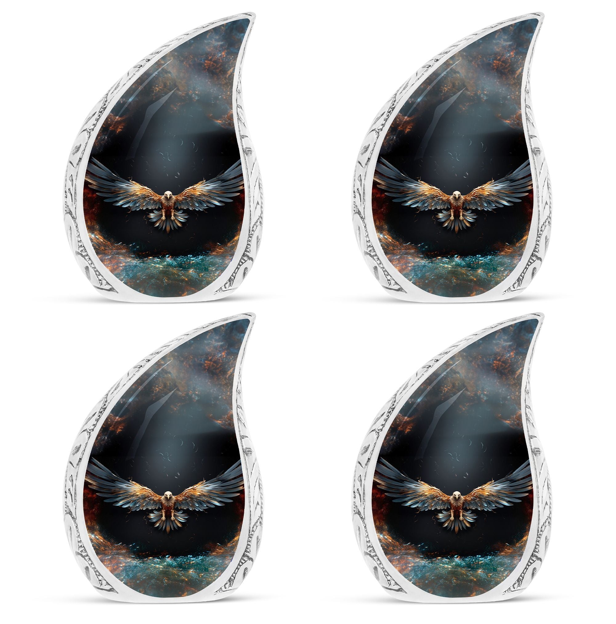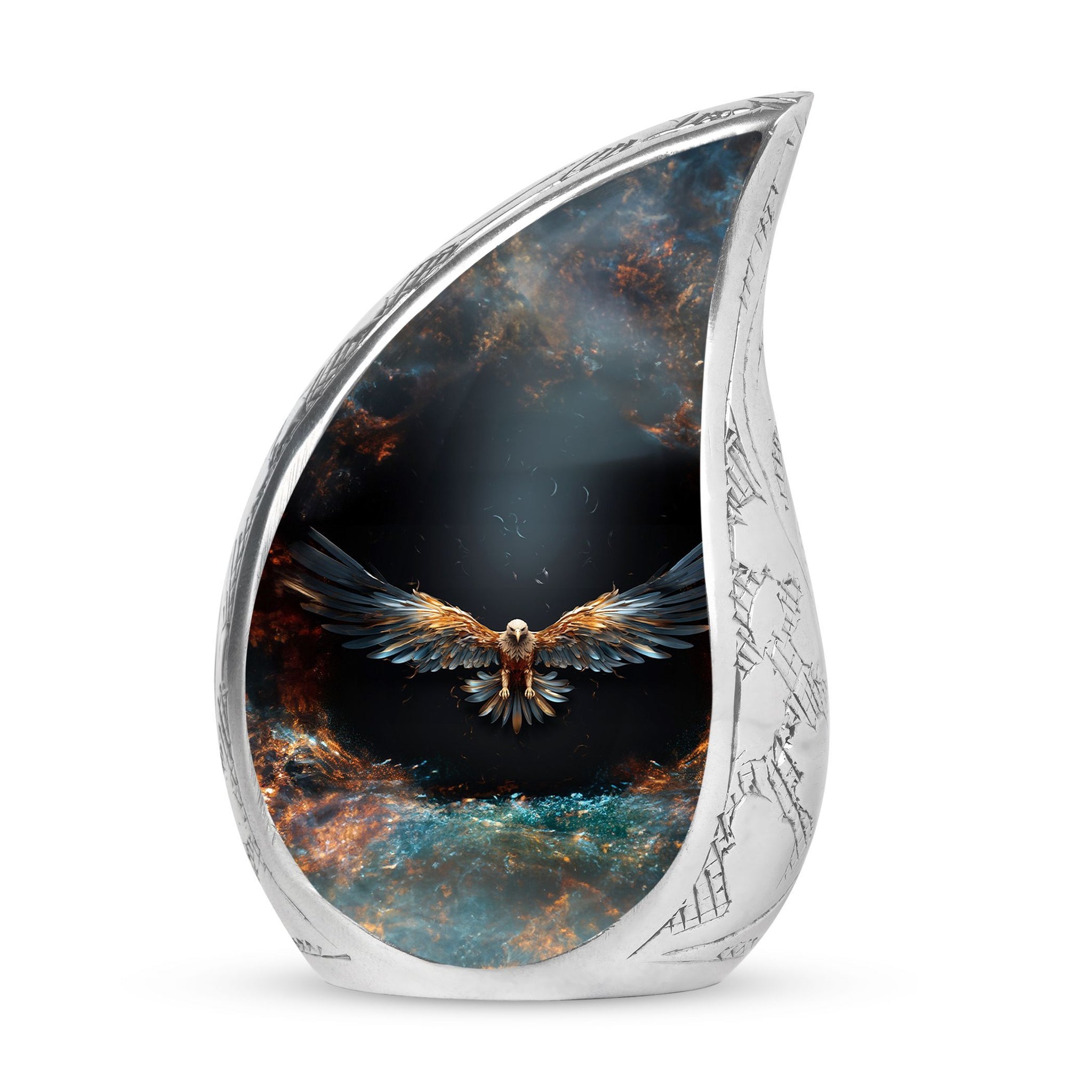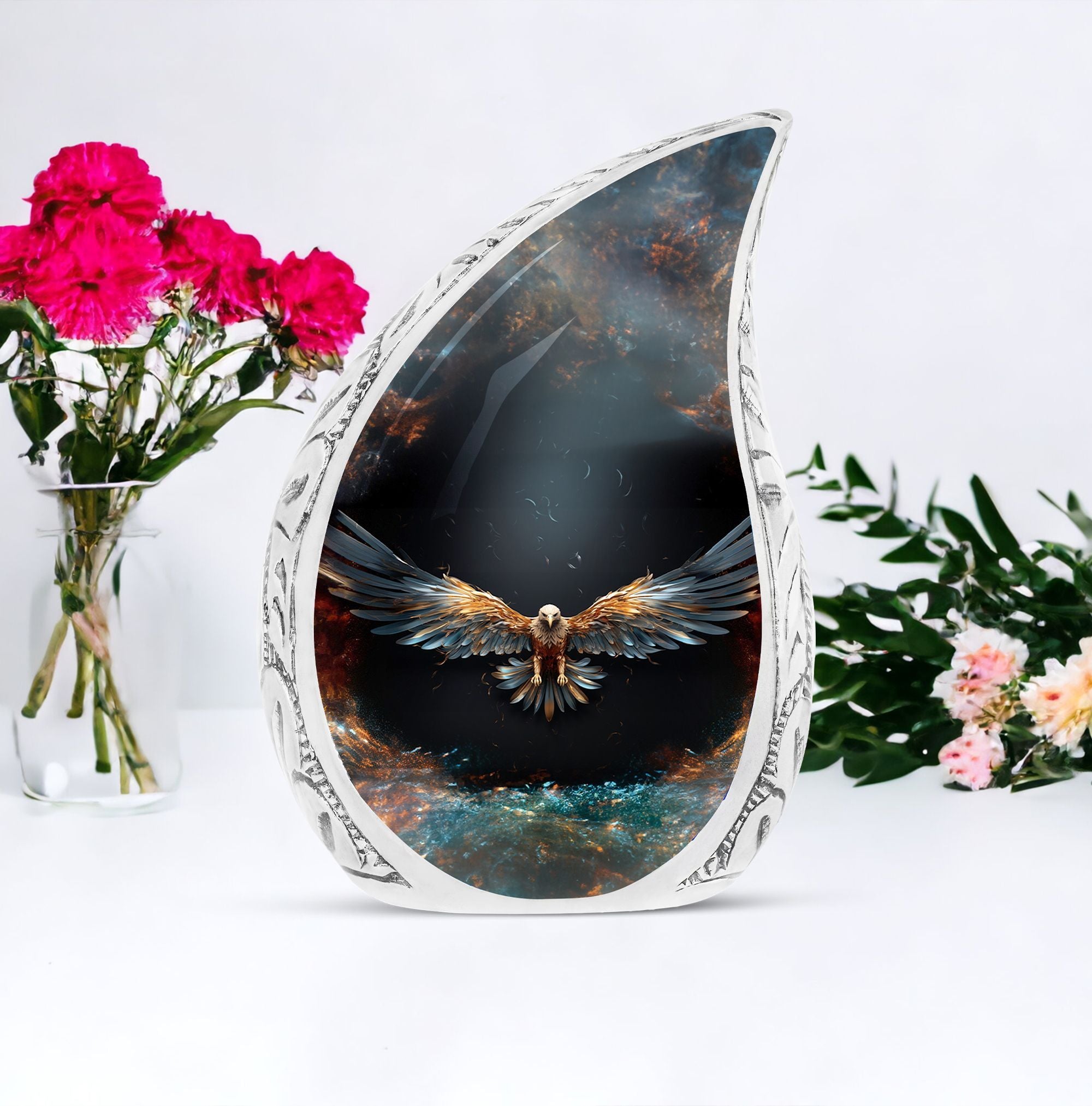 For those seeking a meaningful and dignified way to honor a loved one, our large Eagle Urns for Ashes offer the perfect memorial. These funeral urns, constructed from robust aluminium, have a classic urn design that evokes a sense of timeless tradition and respect. Each urn measures a substantial 10 inches in height, with a dimension that perfectly suits it for use as a centerpiece during remembrance ceremonies. Despite their prominent size, these cremation urns for ashes are lightweight, weighing just 3.3 pounds. Their internal capacity can comfortably accommodate 200 cubic inches of remains. To make your memorial urn truly unique, we offer a personalization option to engrave names on the urn to honor your beloved. The urns come with a velvet pouch, providing a respectful and secure containment for the ashes.