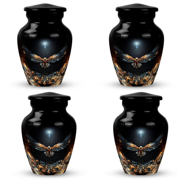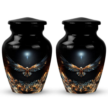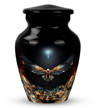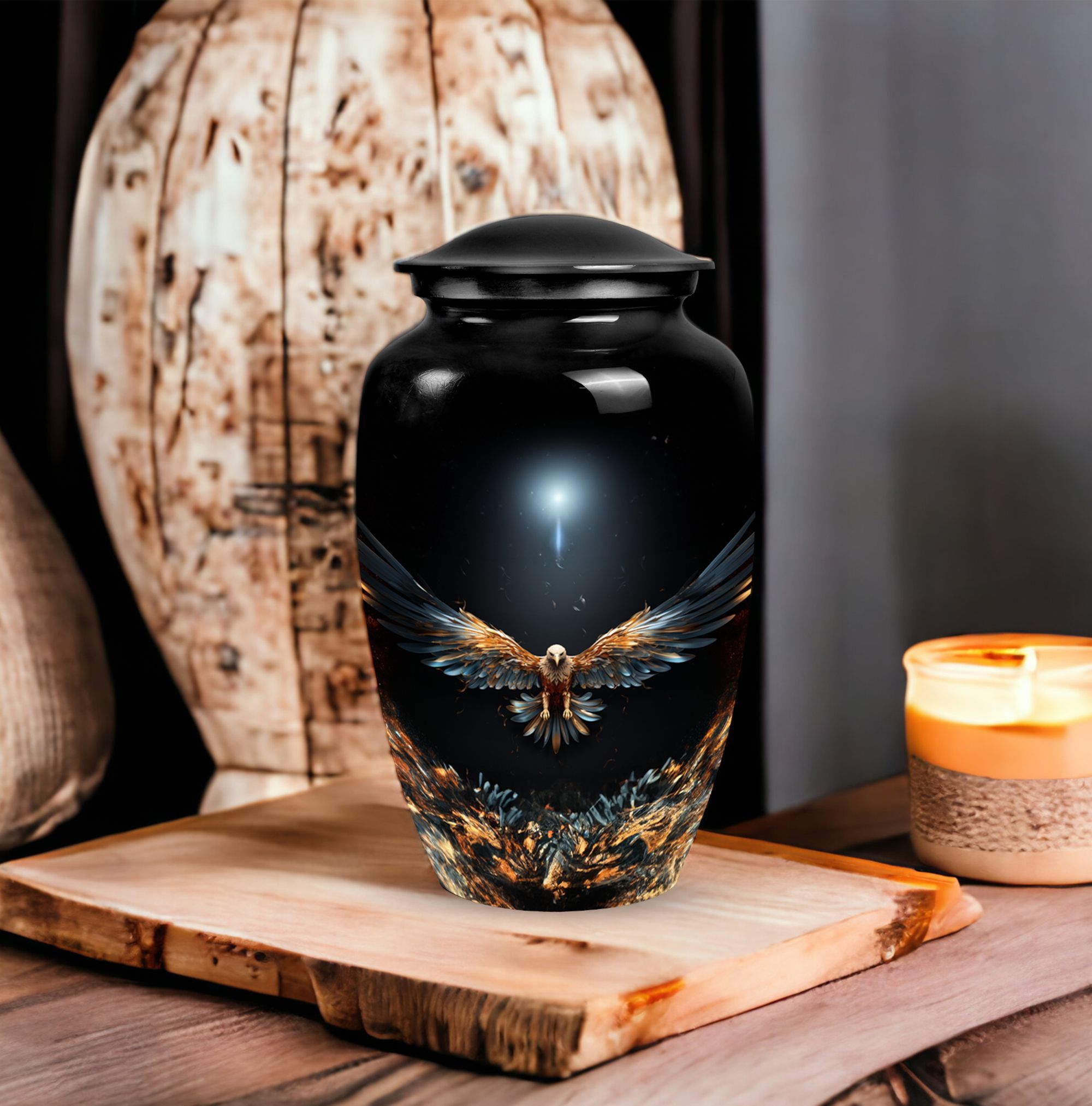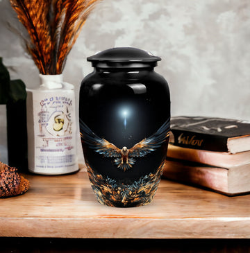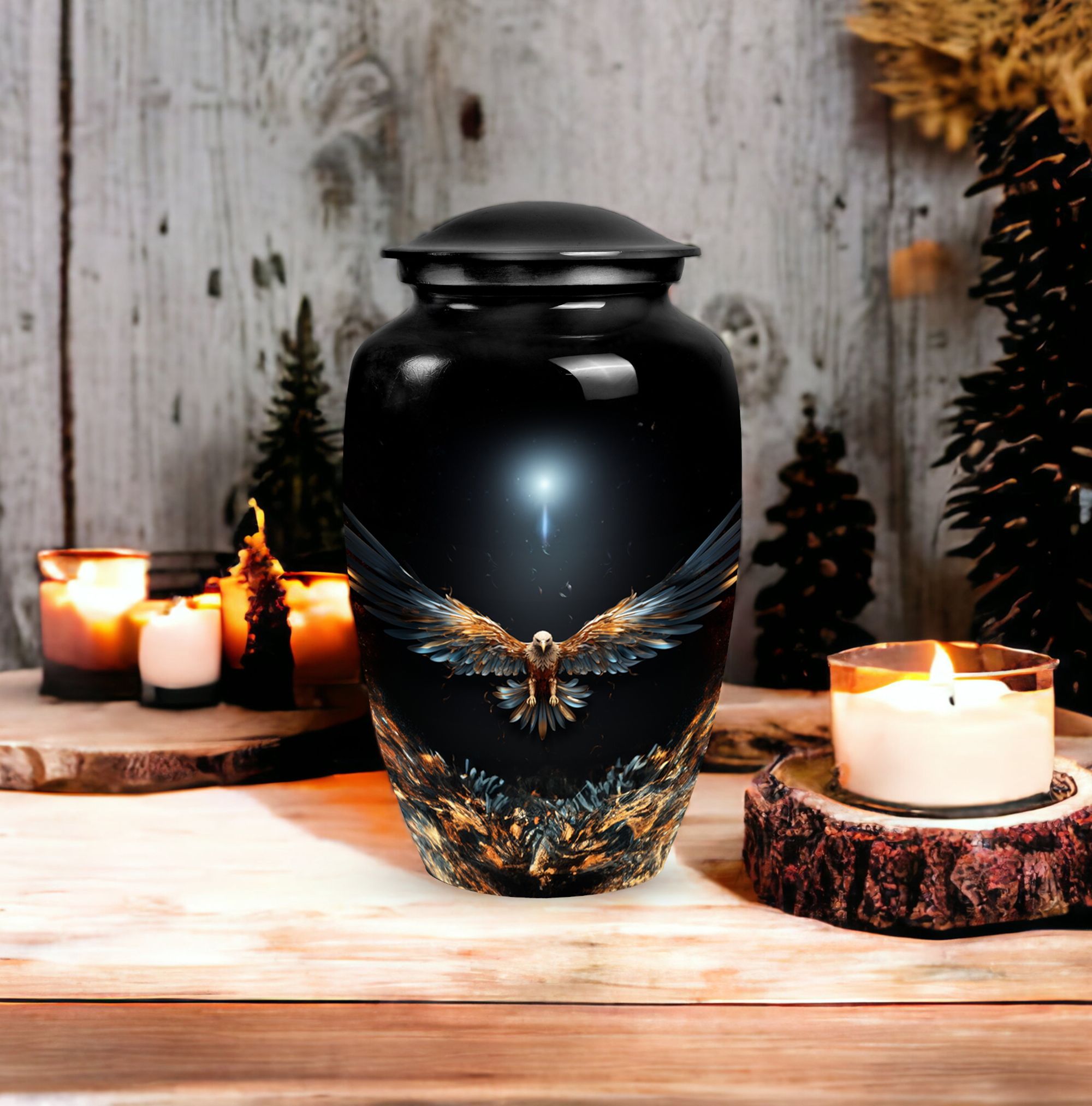 Experience the solace and tranquility with our Classic Urn for the final resting place of your beloved. This 10-inch high funeral urn effortlessly combines an elegant design with the unwavering durability of aluminium. A size of 3 inches and a weight of 3.3 pounds contribute to the urn’s sturdy and compact construct. This Large Urn is capable of securely accommodating up to 200 cubic inches of ashes, aptly functioning as a respectful ashes holder. Further enhancing this 'Eagle Urns for Ashes' offering is our personalized engraving feature; add names to give the urn a unique touch that commemorates your beloved. The package comes complete with a velvet pouch, providing a dignified containment for the ashes. This cremation product addresses all needs - from 'funeral urns' to 'memorial urns', and even 'burial urns for ashes', it serves as an ideal selection for purposes of sacred remembrance. Its understated yet sophisticated appeal makes it a great choice for modern urns for human ashes.