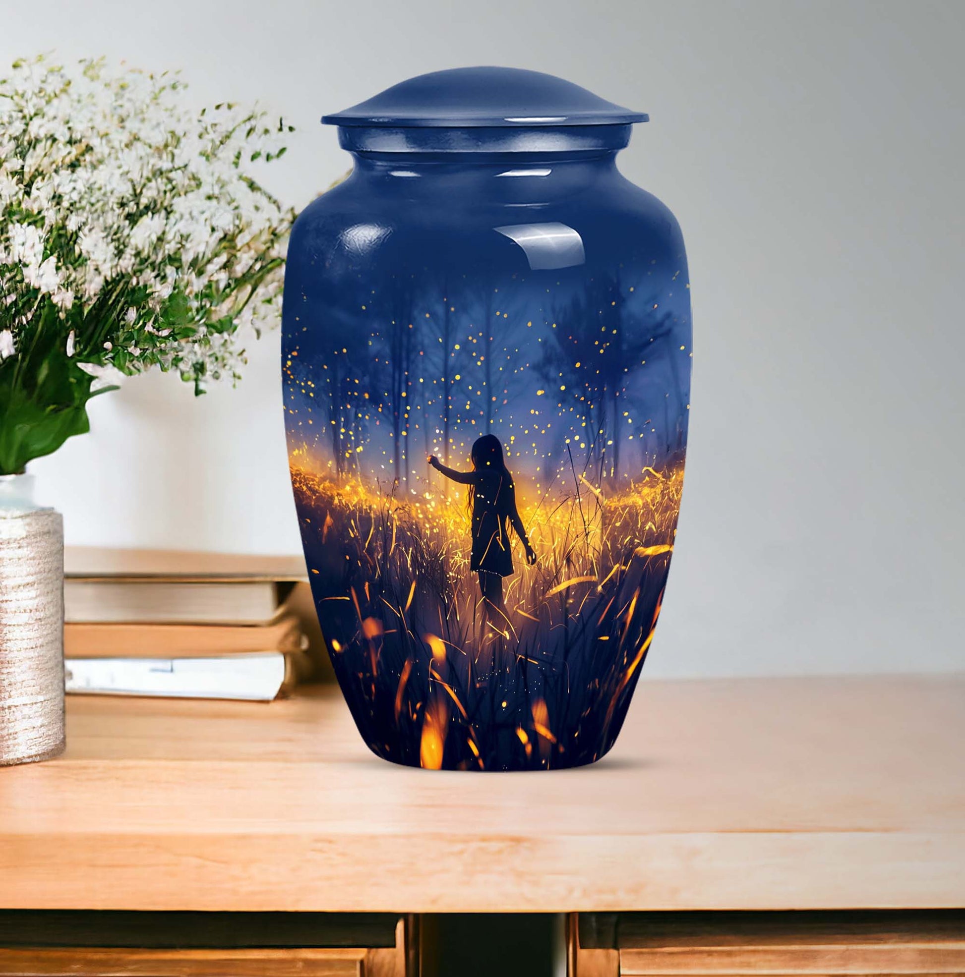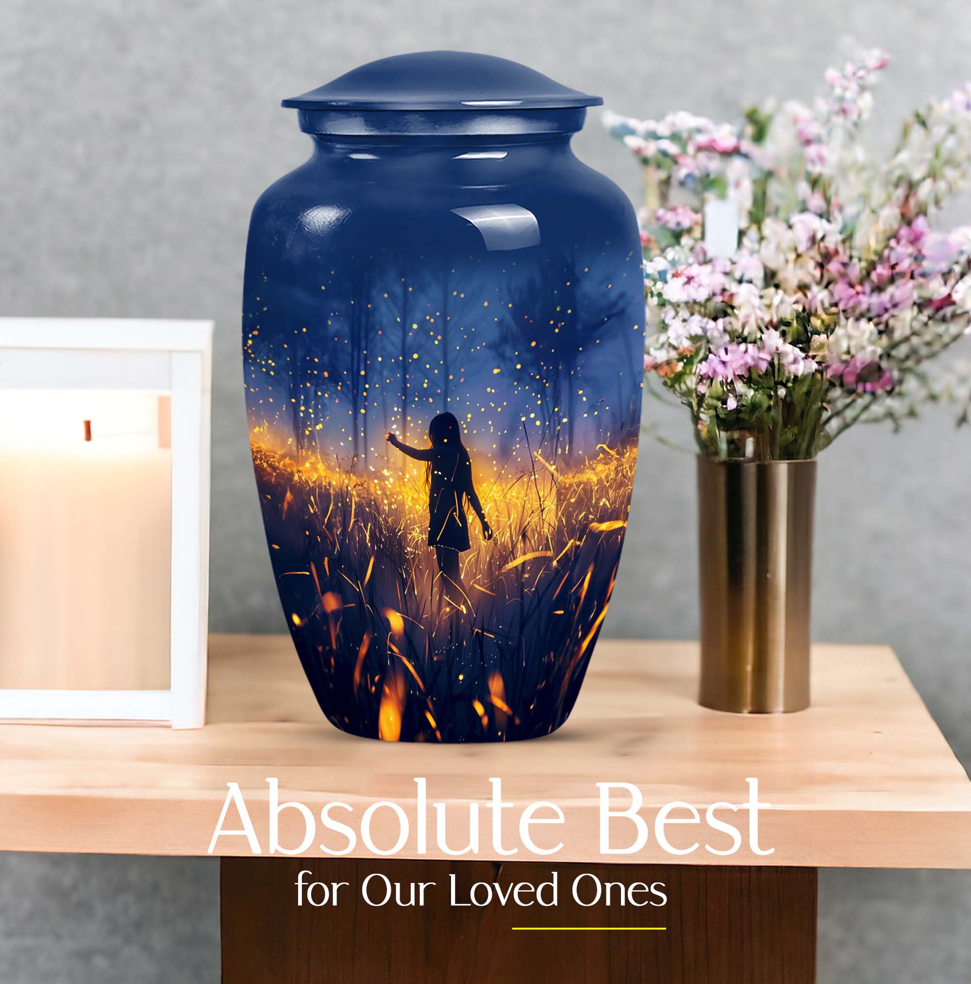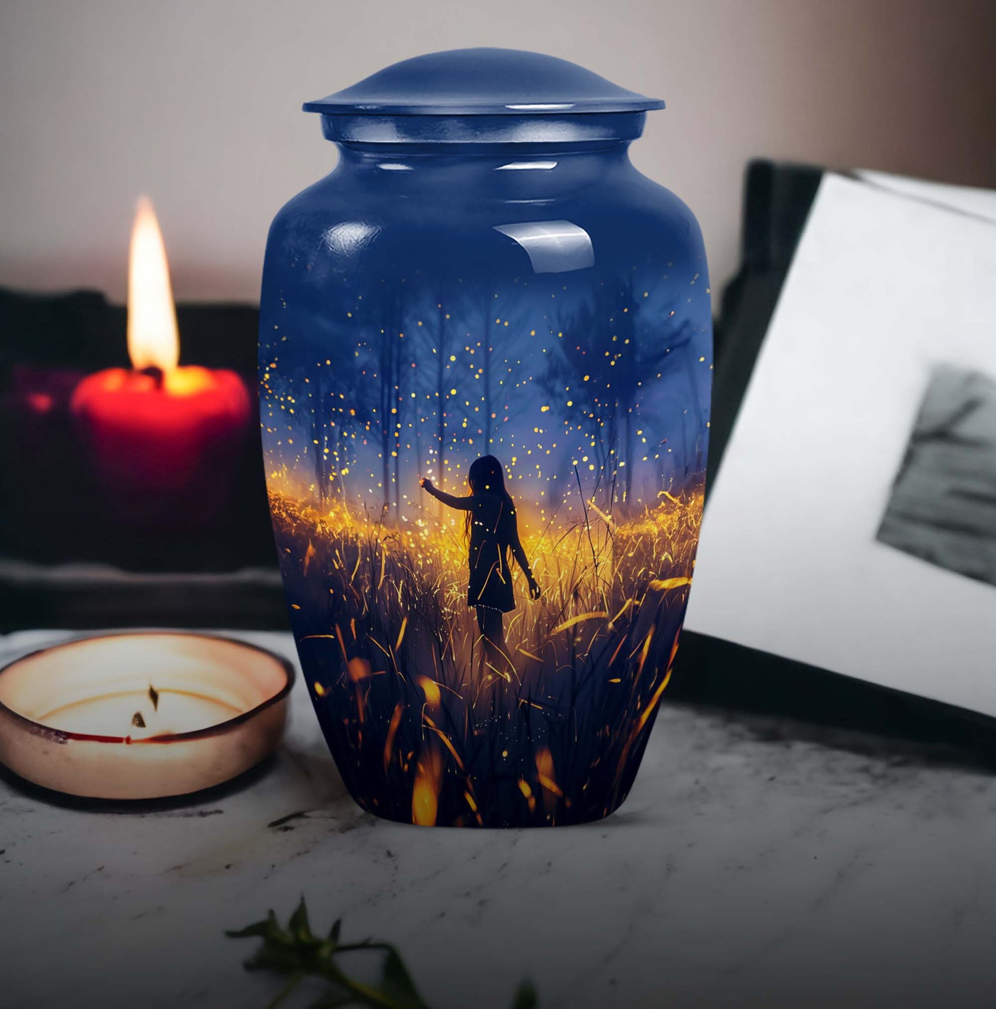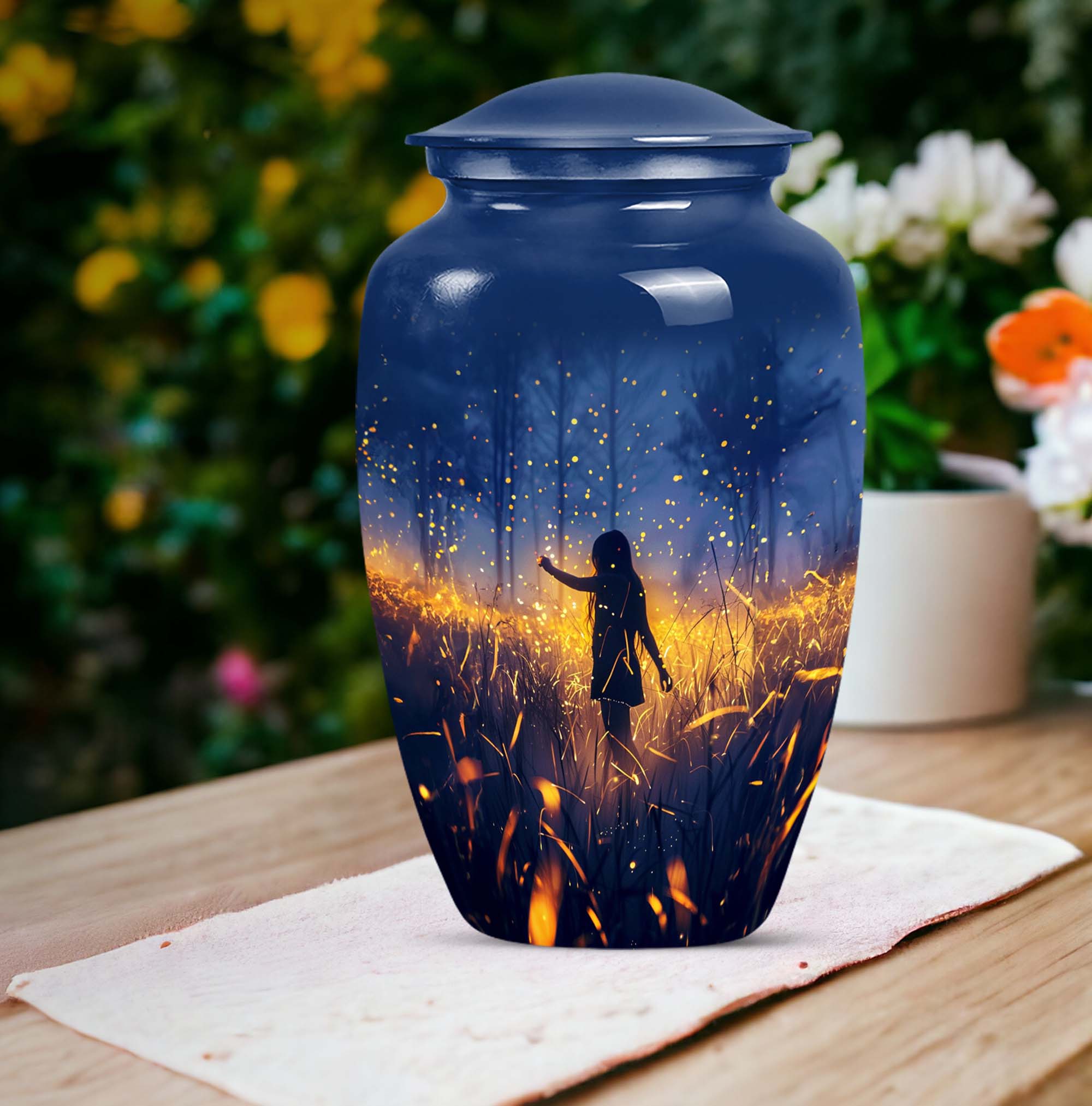 Discover the serene beauty and dignity of our 10-inch 'Twilight Forest' cremation urn, a thoughtful and respectful choice for preserving the cherished memories of your loved ones. This large urn, weighing at 3.3 pounds, is made from premium aluminium assuring durability and a classic look. Despite its substantial size, it maintains an abstract theme that can seamlessly blend into any room decor. This cremation urn for adult ashes can securely contain up to 200 cubic inches of ash, ensuring a fitting tribute to your beloved. It further comes with a plush velvet pouch for containment and safe handling of the ashes. Take advantage of our customization option to personalize this classic urn with engraved names, transforming it from not just an item but to a vessel of affectionate farewells. Ideal for both males and females, it also serves as an appropriate choice for companion cremation urns. Embrace the twilight forest urn, a harmonious blend of tradition, compassion, and elegance.