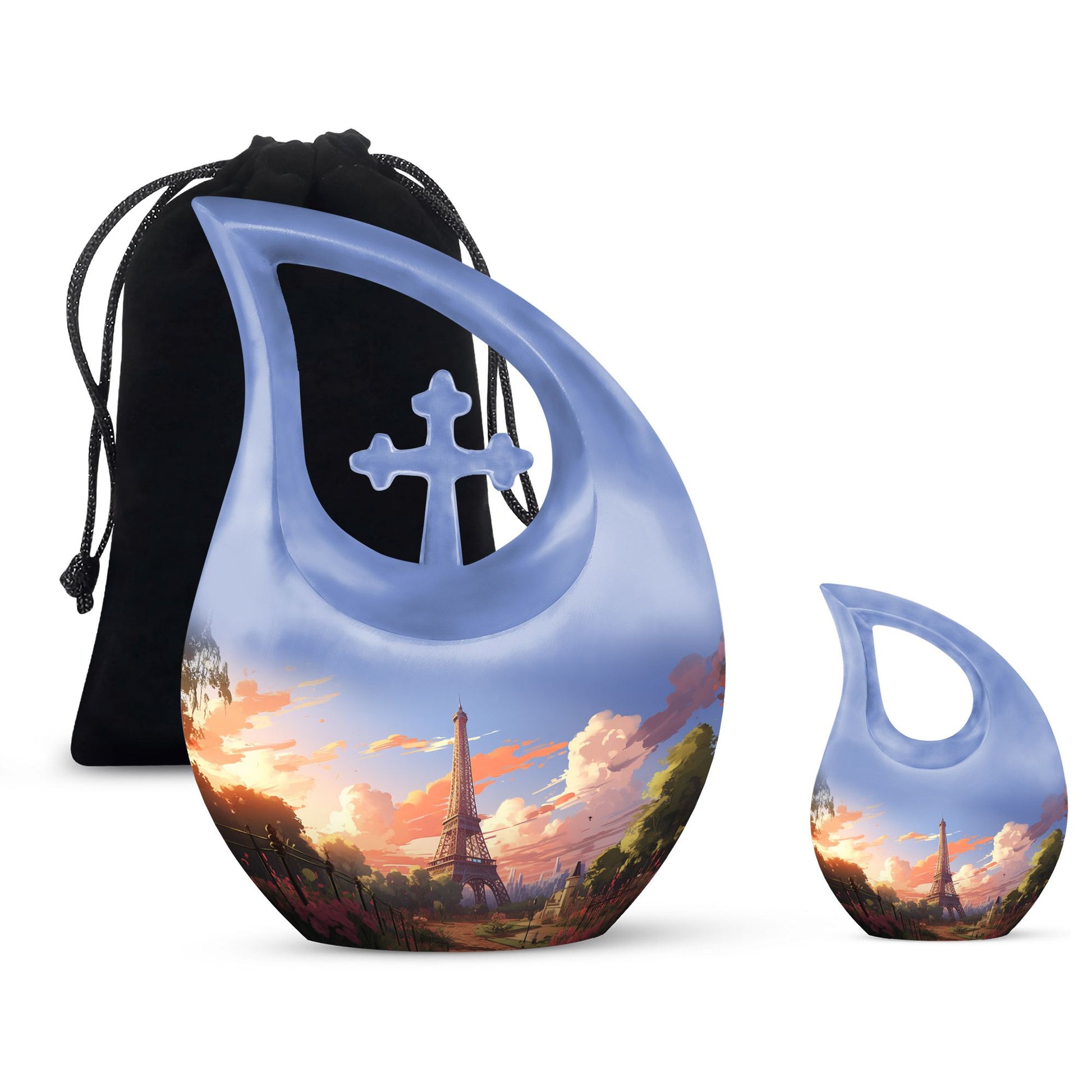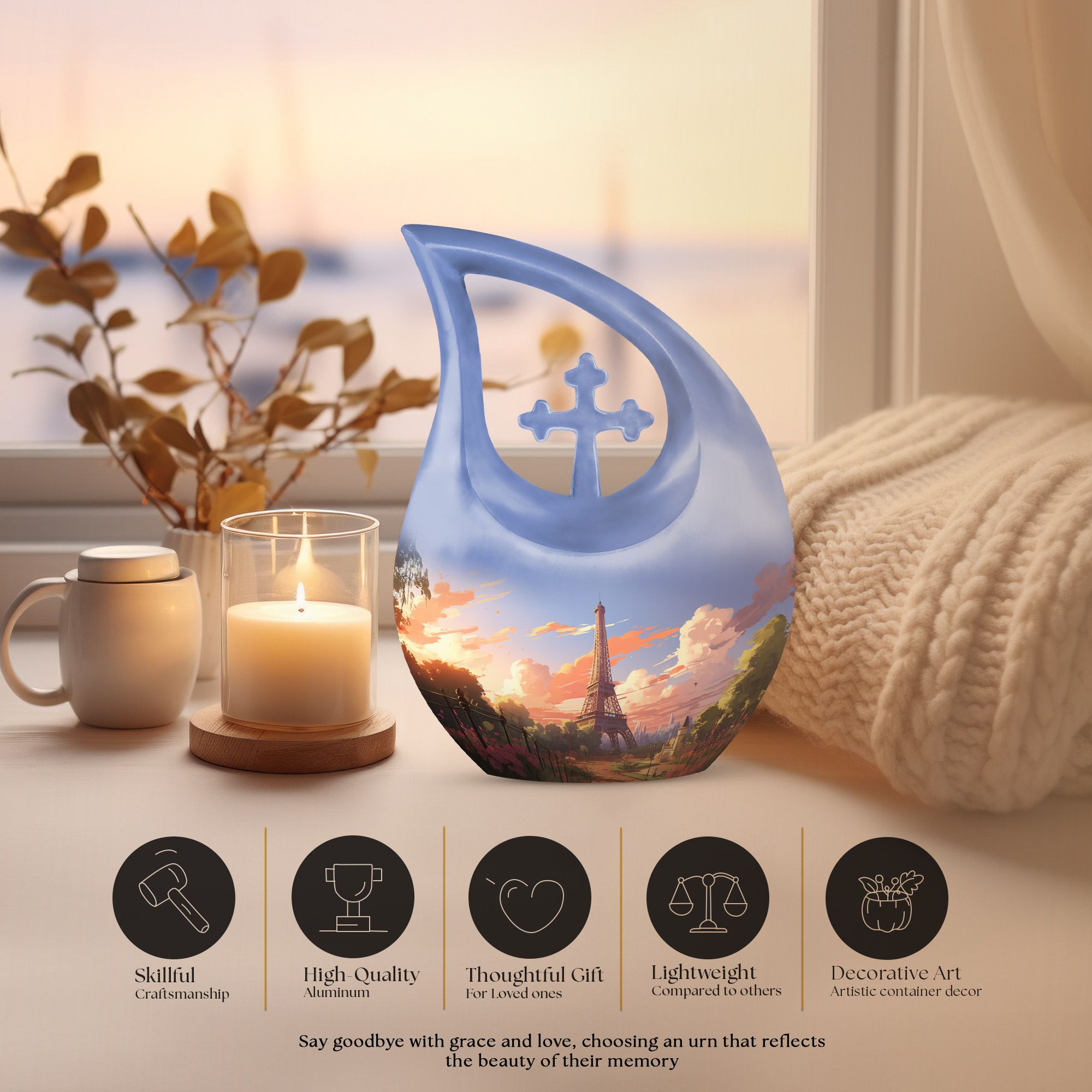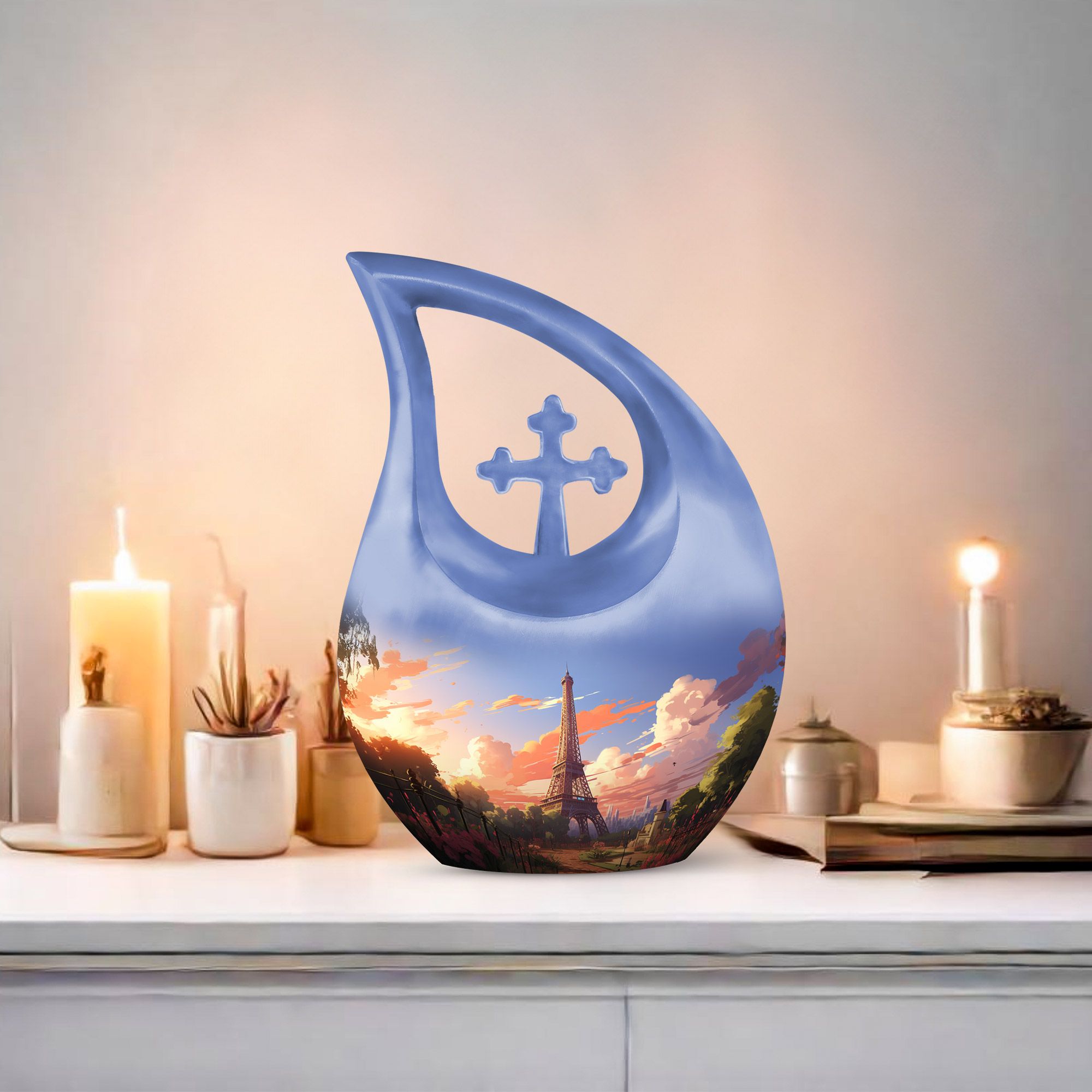 Expertly crafted from premium aluminum, this memorial piece blends art with durability. Its soft sunrise tones and the silhouette of the Eiffel Tower evoke hope and renewal. The urn’s design makes it suitable as urns for adult female small or urns for adult male dad, while its compact yet secure build ensures the ashes of your loved one are preserved with care. Each urn serves as a symbol of affection, strength, and everlasting memory — perfect for home display or ceremonial placement.