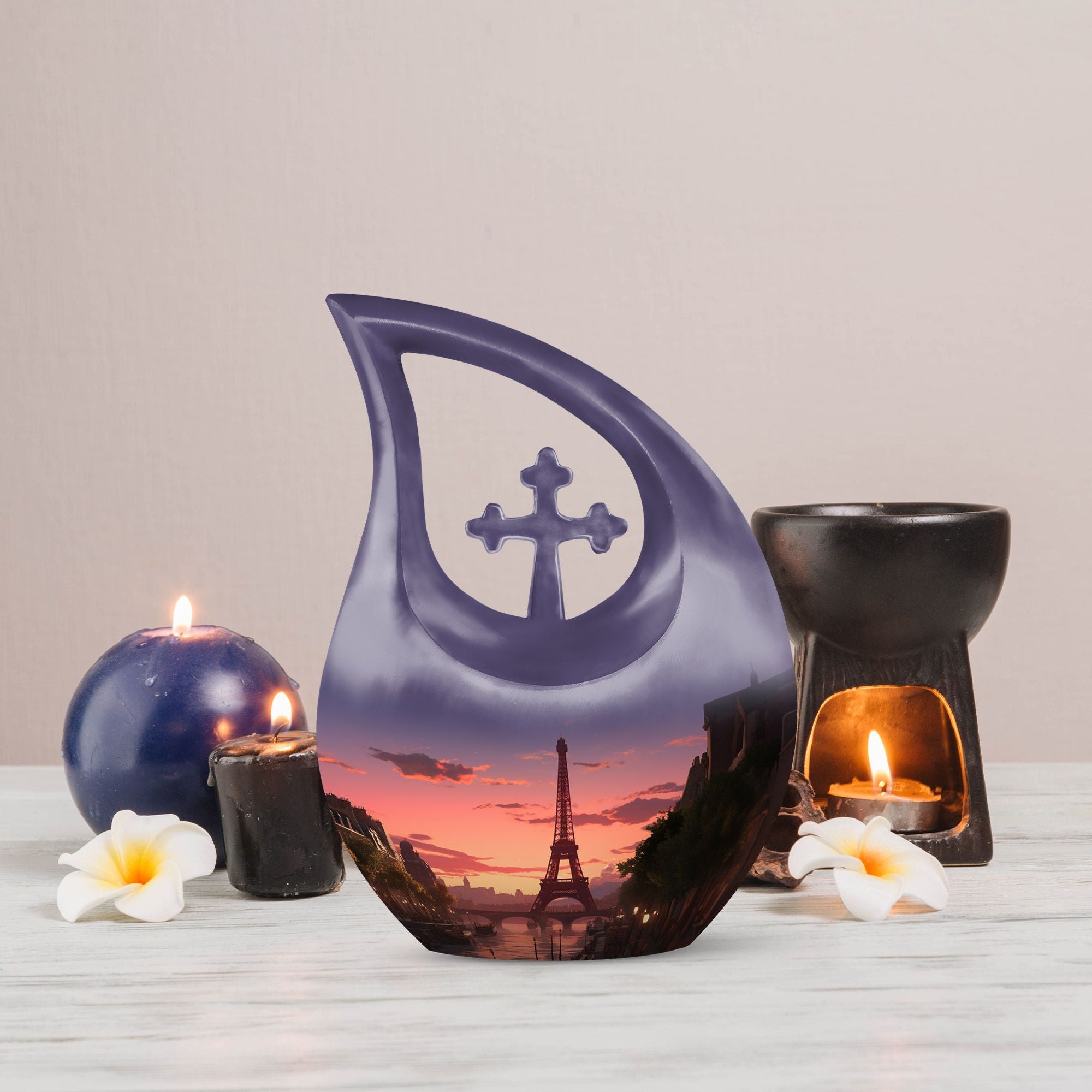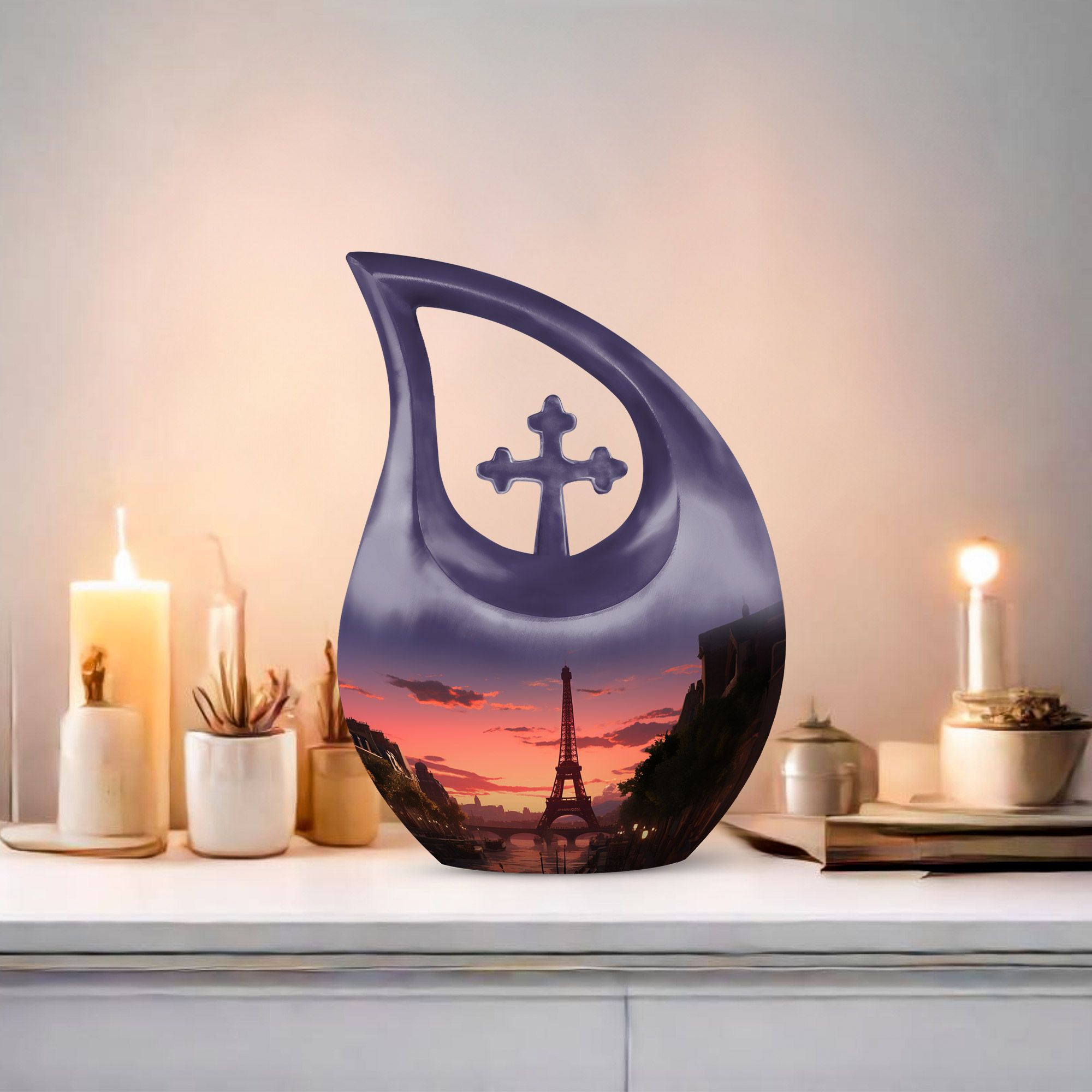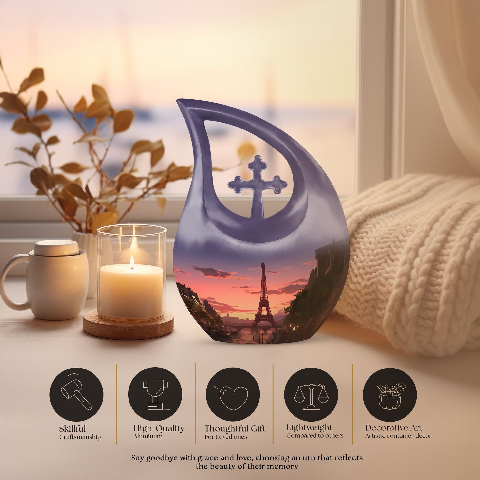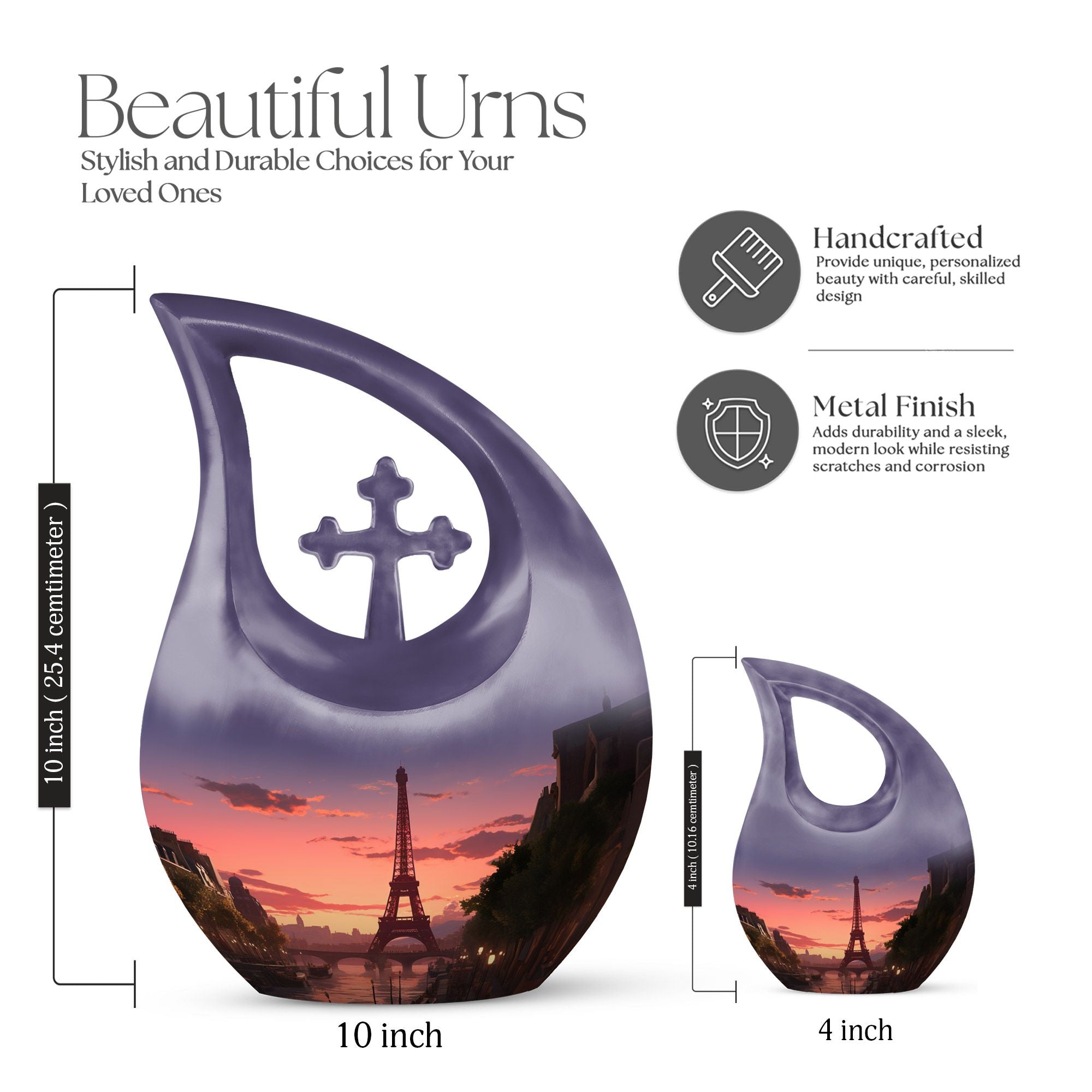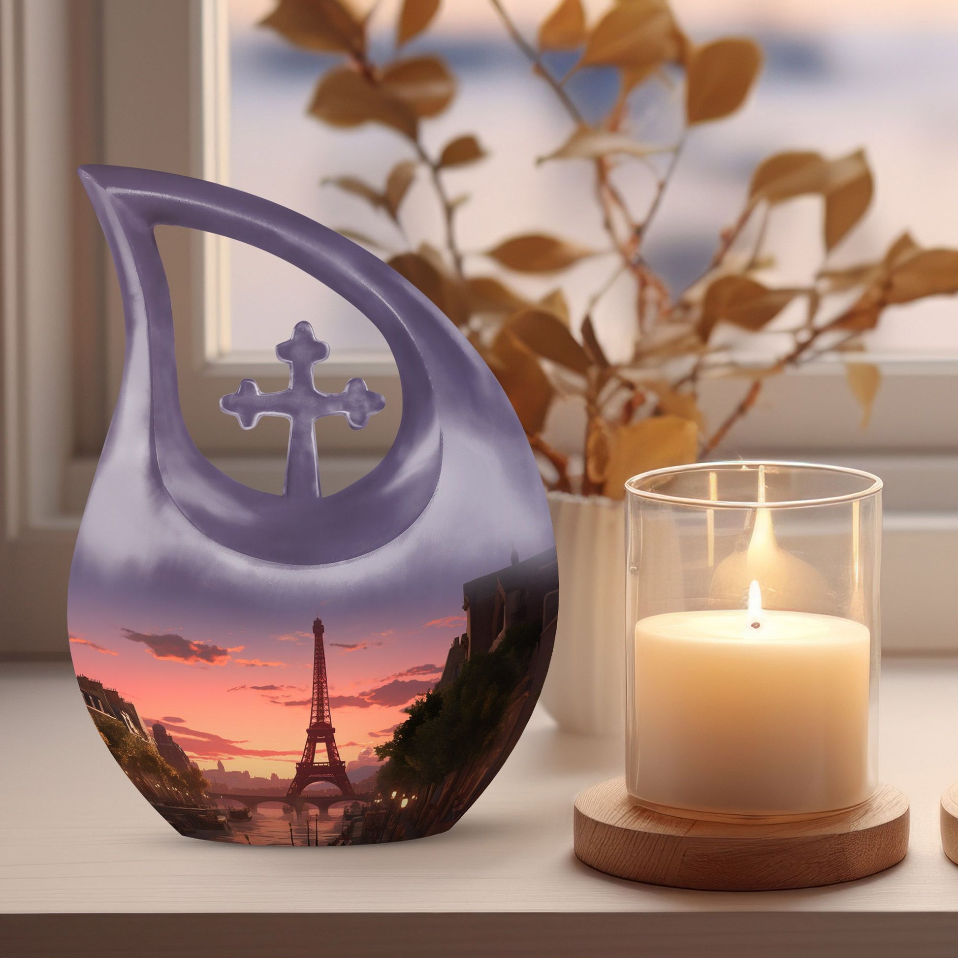 This elegant funeral urn – memorial urn features a breathtaking Eiffel Tower design set against a soothing purple sunset backdrop, symbolizing love and eternal peace. Expertly crafted from durable aluminum, it offers a secure and dignified resting place for urns adult male or funeral urns for human ashes. The detailed artistry and smooth enamel finish make it an ideal funeral decor urn – memorial urn that blends beautifully with home interiors or remembrance spaces.
