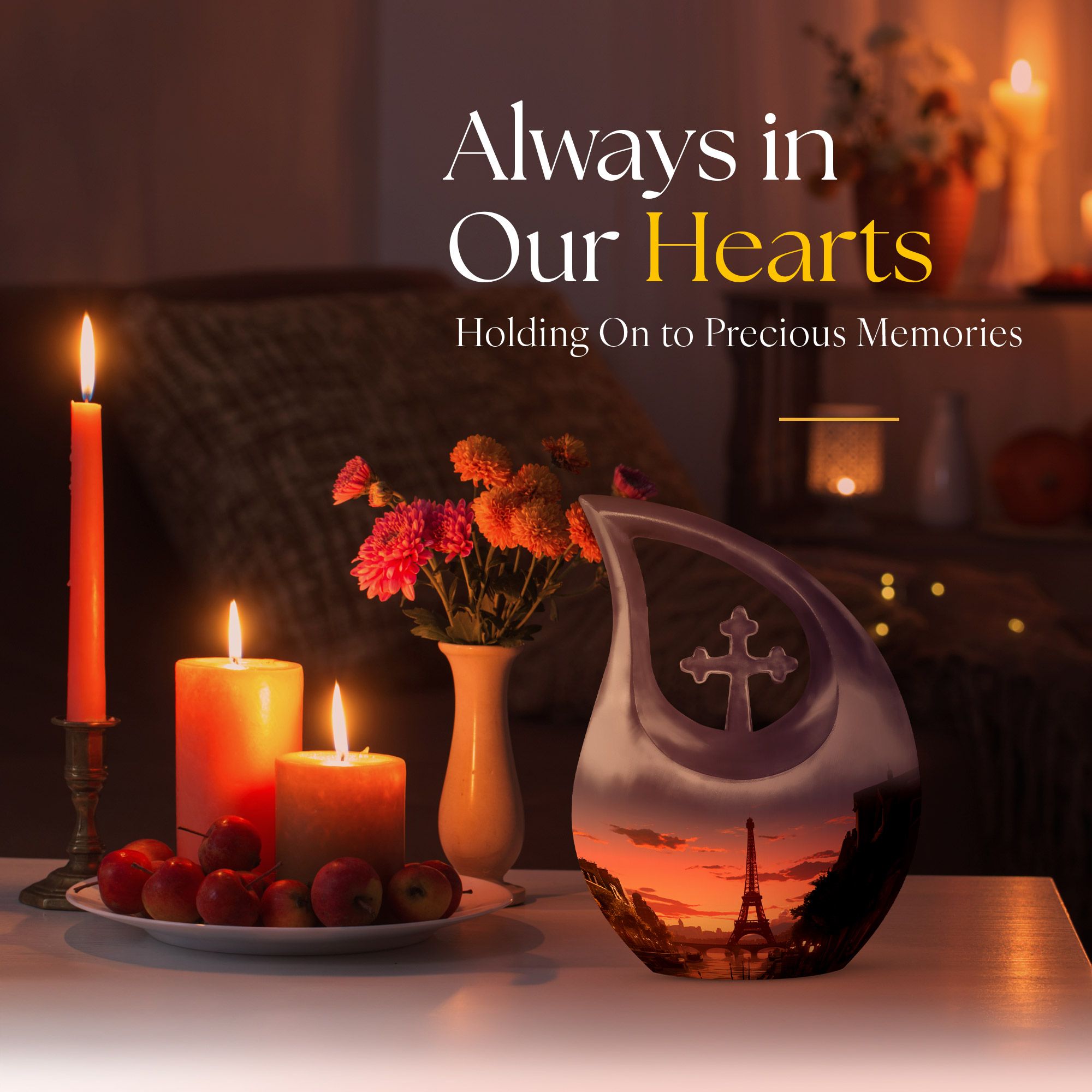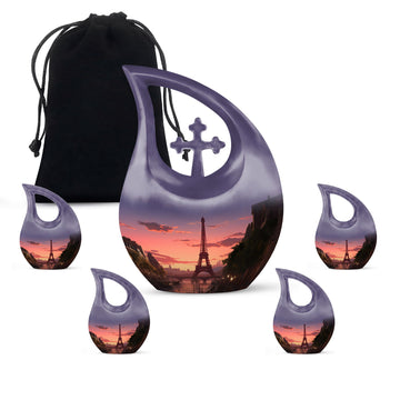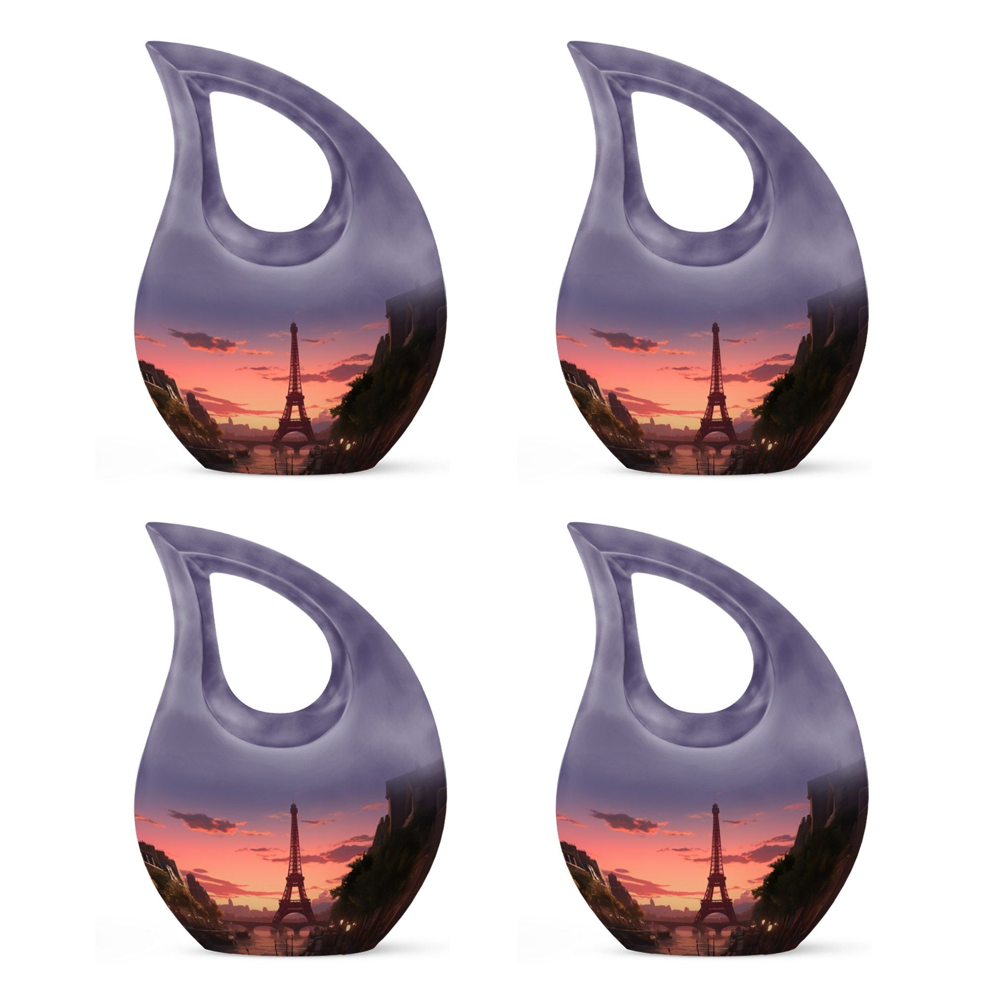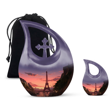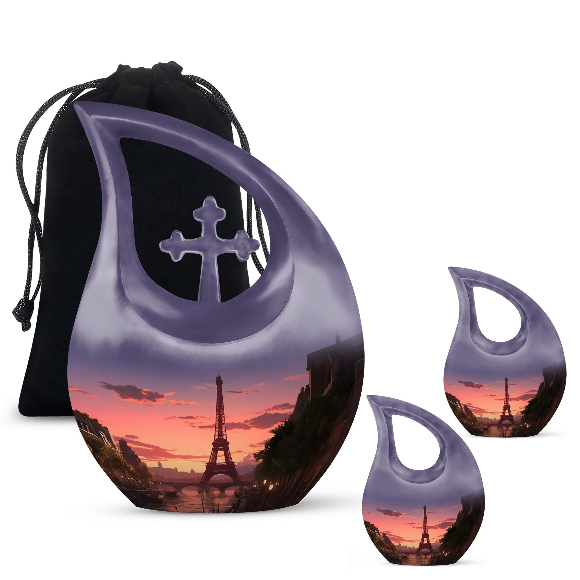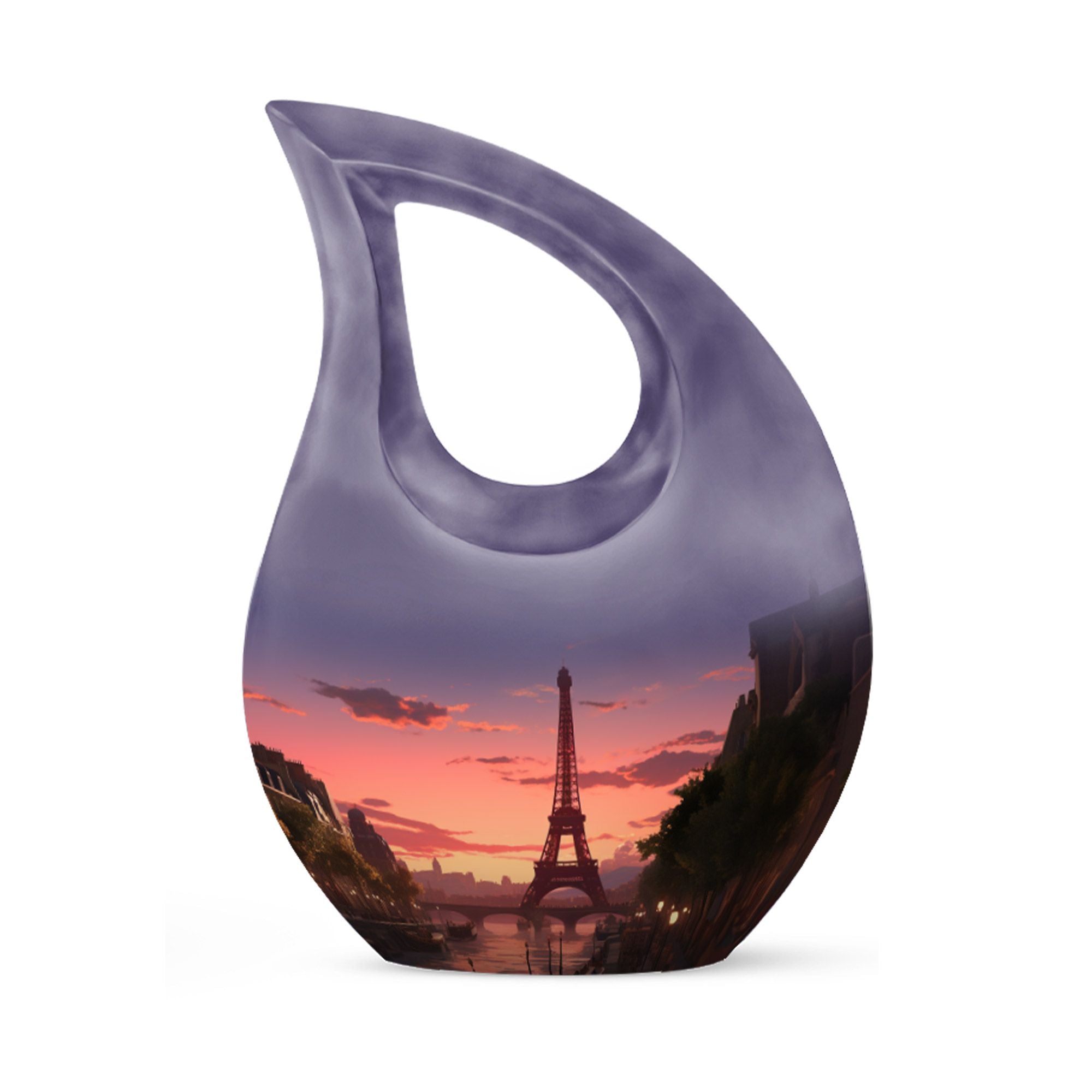 This elegant funeral urn – memorial urn features a breathtaking Eiffel Tower design set against a soothing purple sunset backdrop, symbolizing love and eternal peace. Expertly crafted from durable aluminum, it offers a secure and dignified resting place for urns adult male or funeral urns for human ashes. The detailed artistry and smooth enamel finish make it an ideal funeral decor urn – memorial urn that blends beautifully with home interiors or remembrance spaces.
