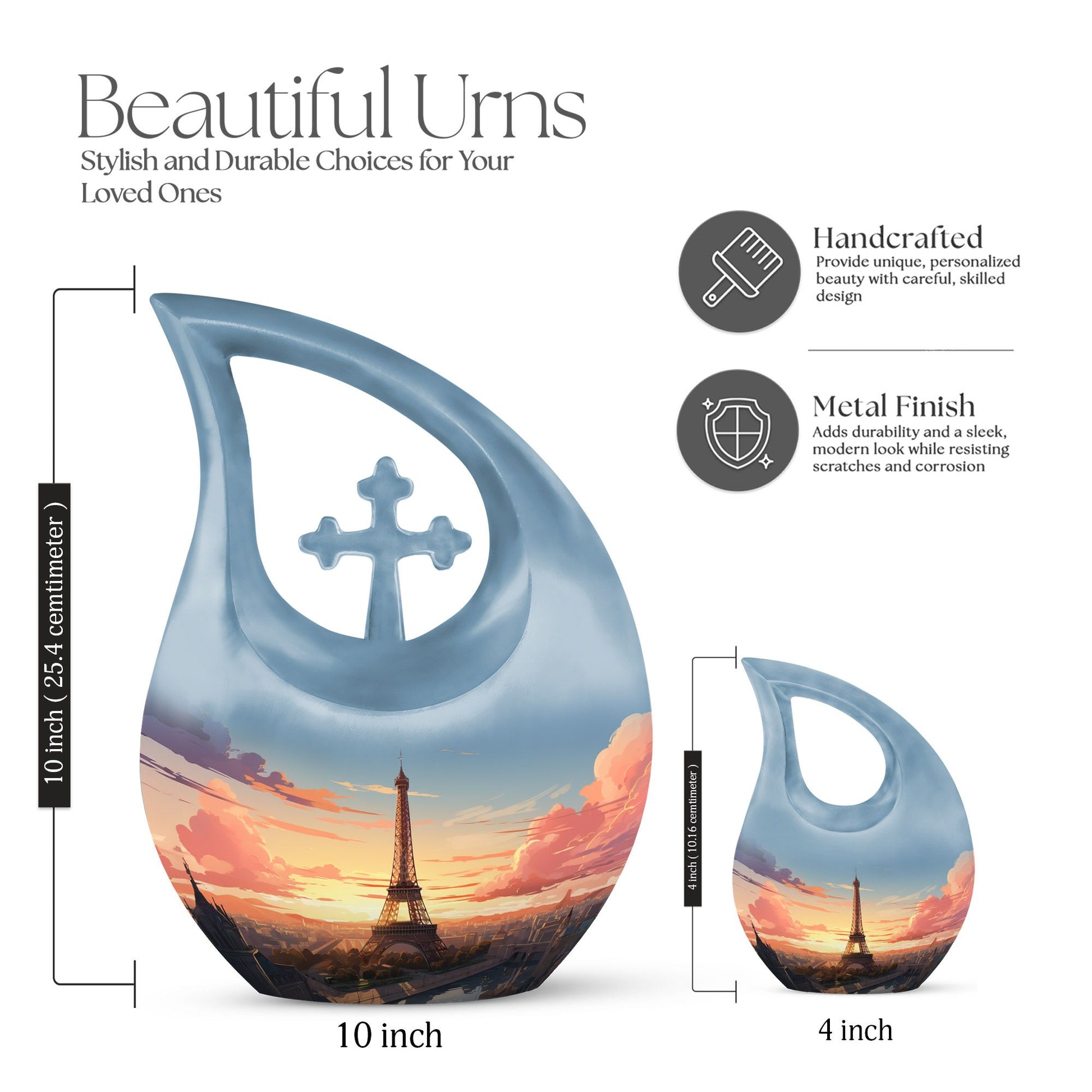 Expertly handcrafted, this urn embodies superior artistry and enduring beauty. The smooth aluminum body features a breathtaking Eiffel Tower design against a serene sunset backdrop, symbolizing peace and eternal connection. Ideal for Urns For Ashes Adult Male Small or Urn For Human Ashes Adult Female, its secure screw-top lid ensures that your loved one’s remains are kept safe. This versatile piece is suitable for display at home or for ceremonial remembrance.