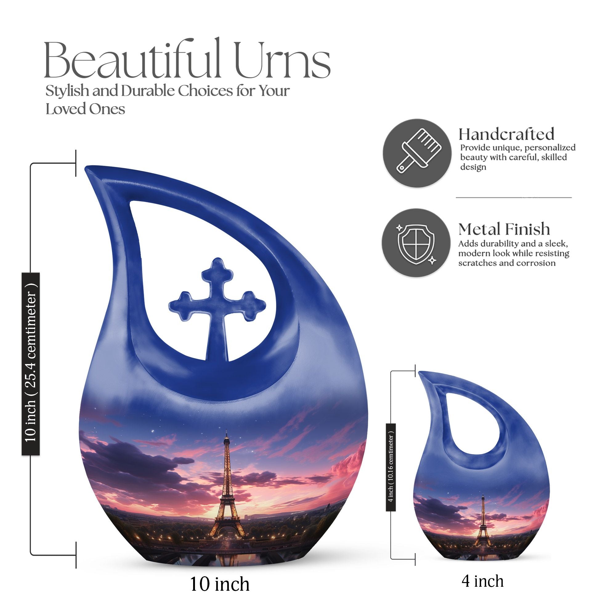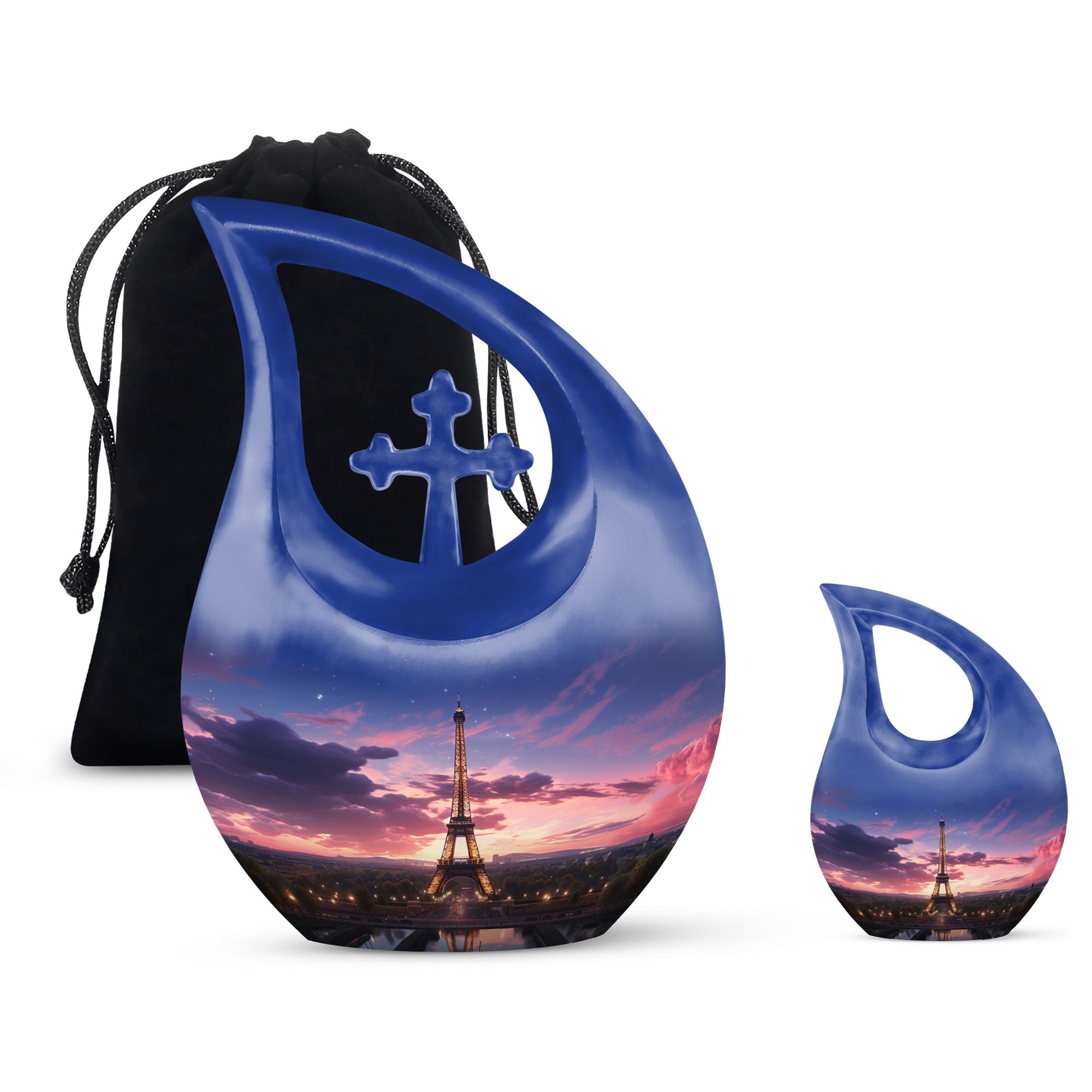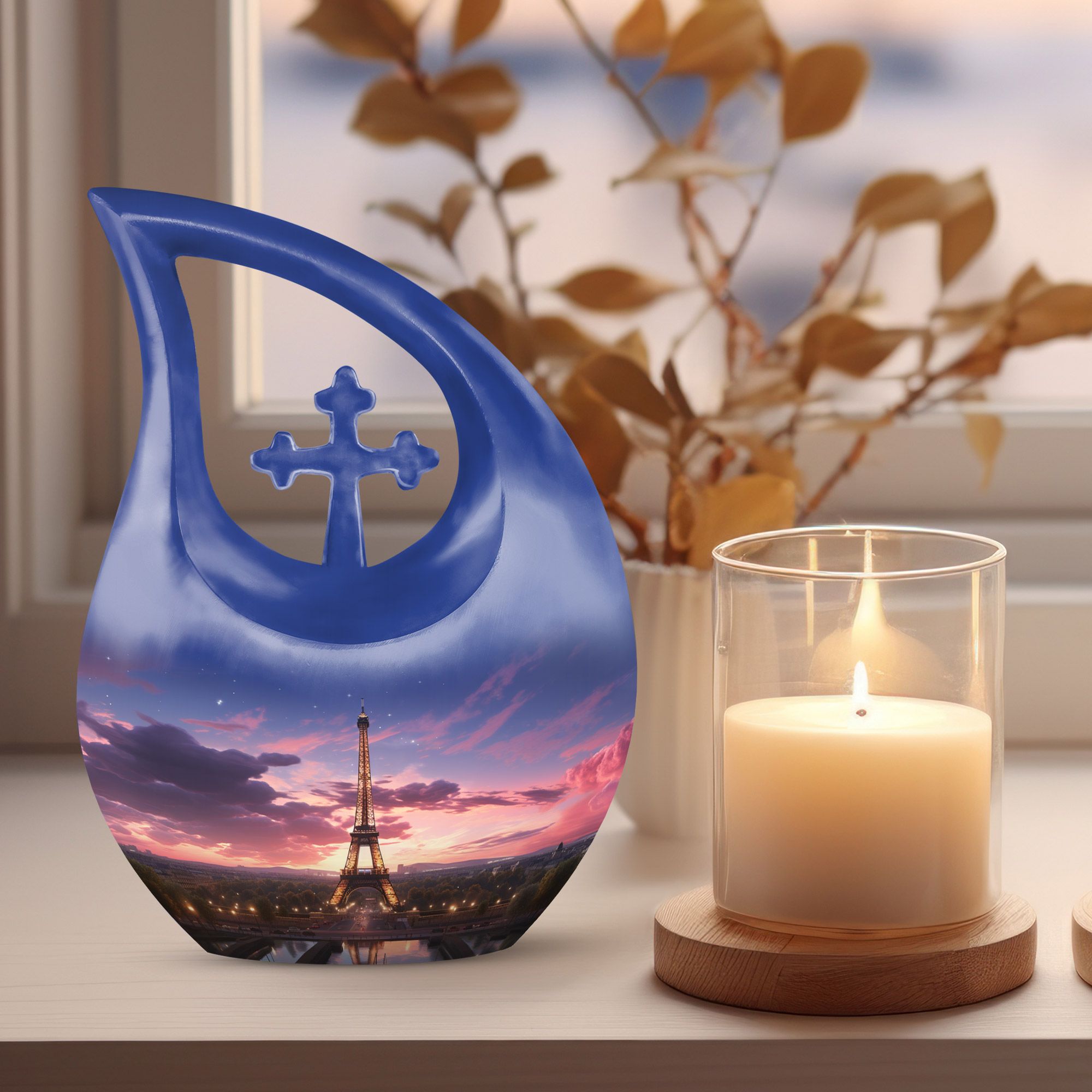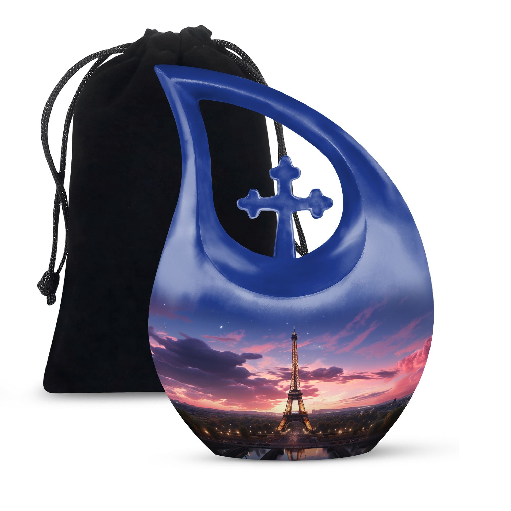 Expertly handcrafted from high-quality aluminum, the urn showcases detailed artistry inspired by the iconic Eiffel Tower — a universal symbol of love and remembrance. The smooth metallic finish, coupled with intricate engravings, enhances its timeless beauty. Ideal for human urns for ashes adult female or ash urns for humans male, this urn blends durability with aesthetic charm, making it suitable for both display and burial. The design ensures that your loved one’s ashes are preserved with utmost care and dignity.