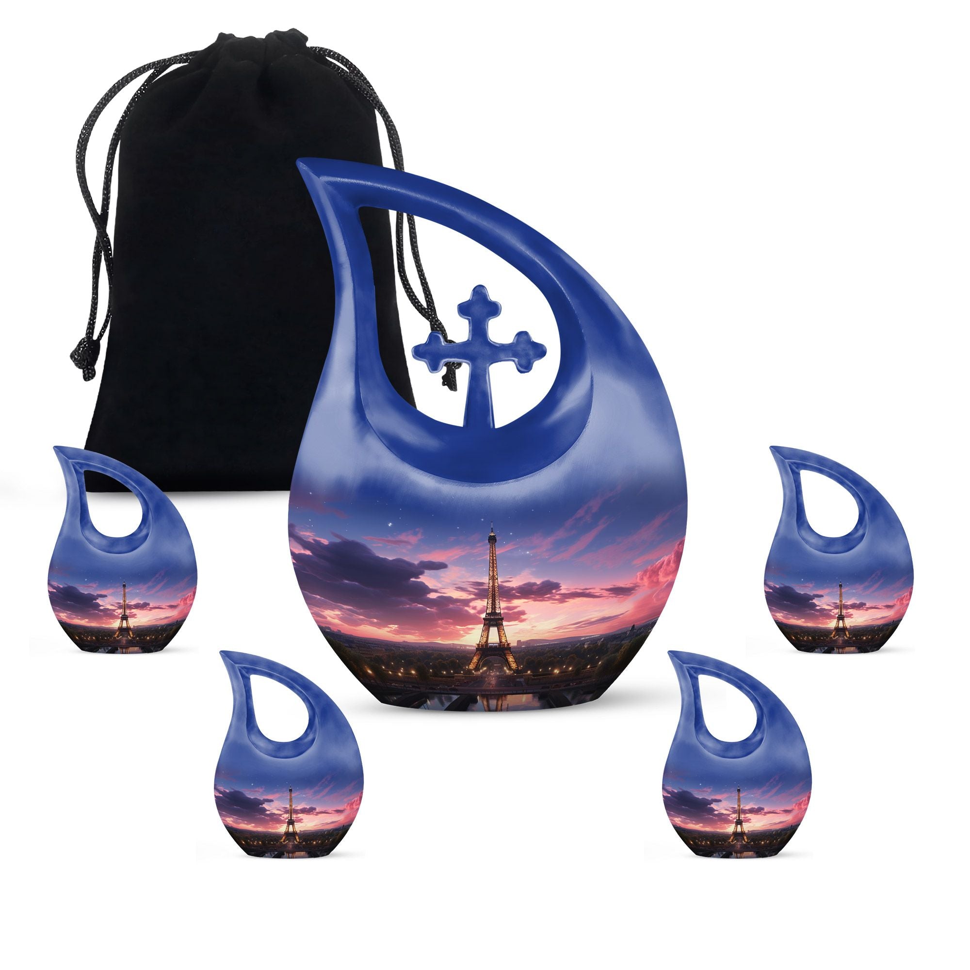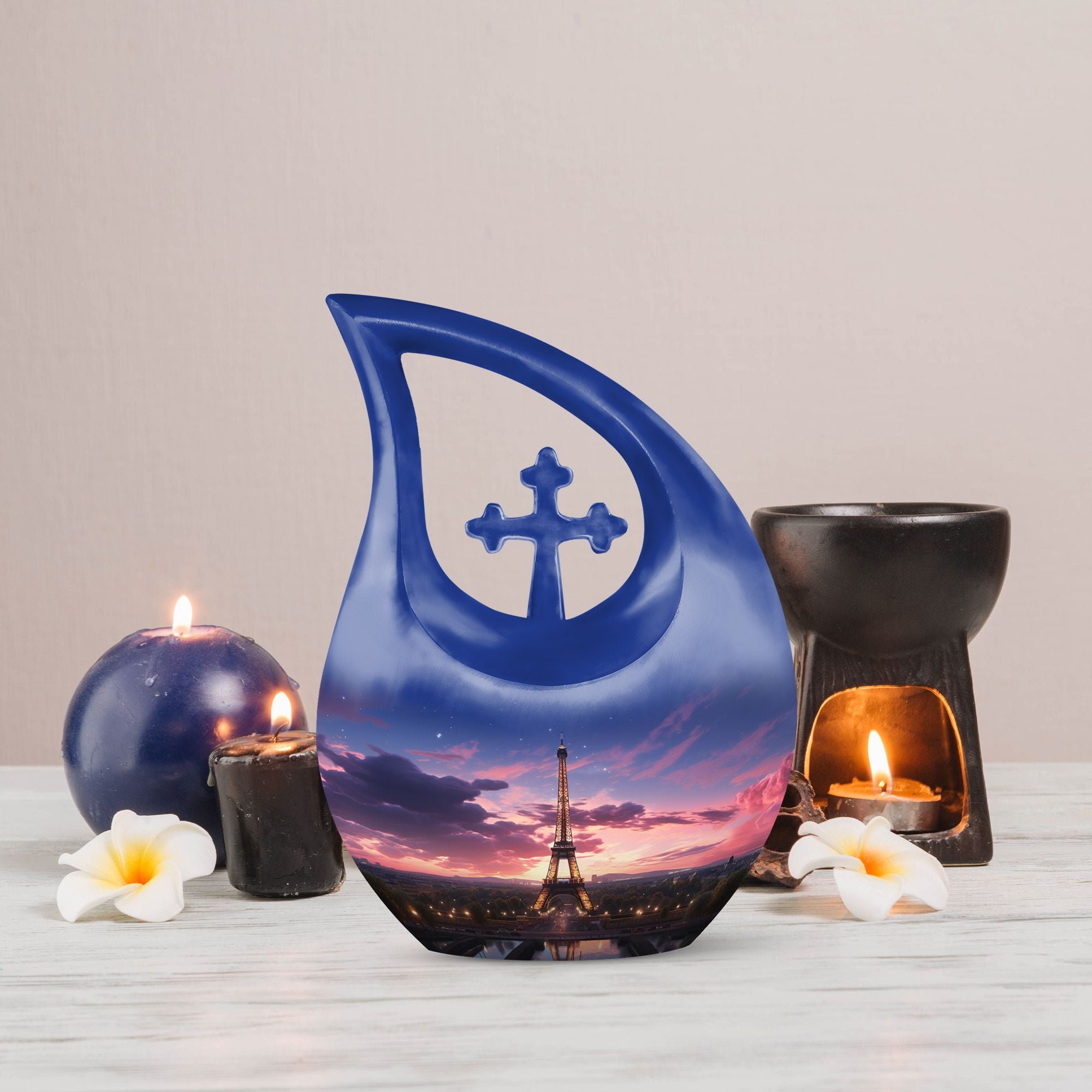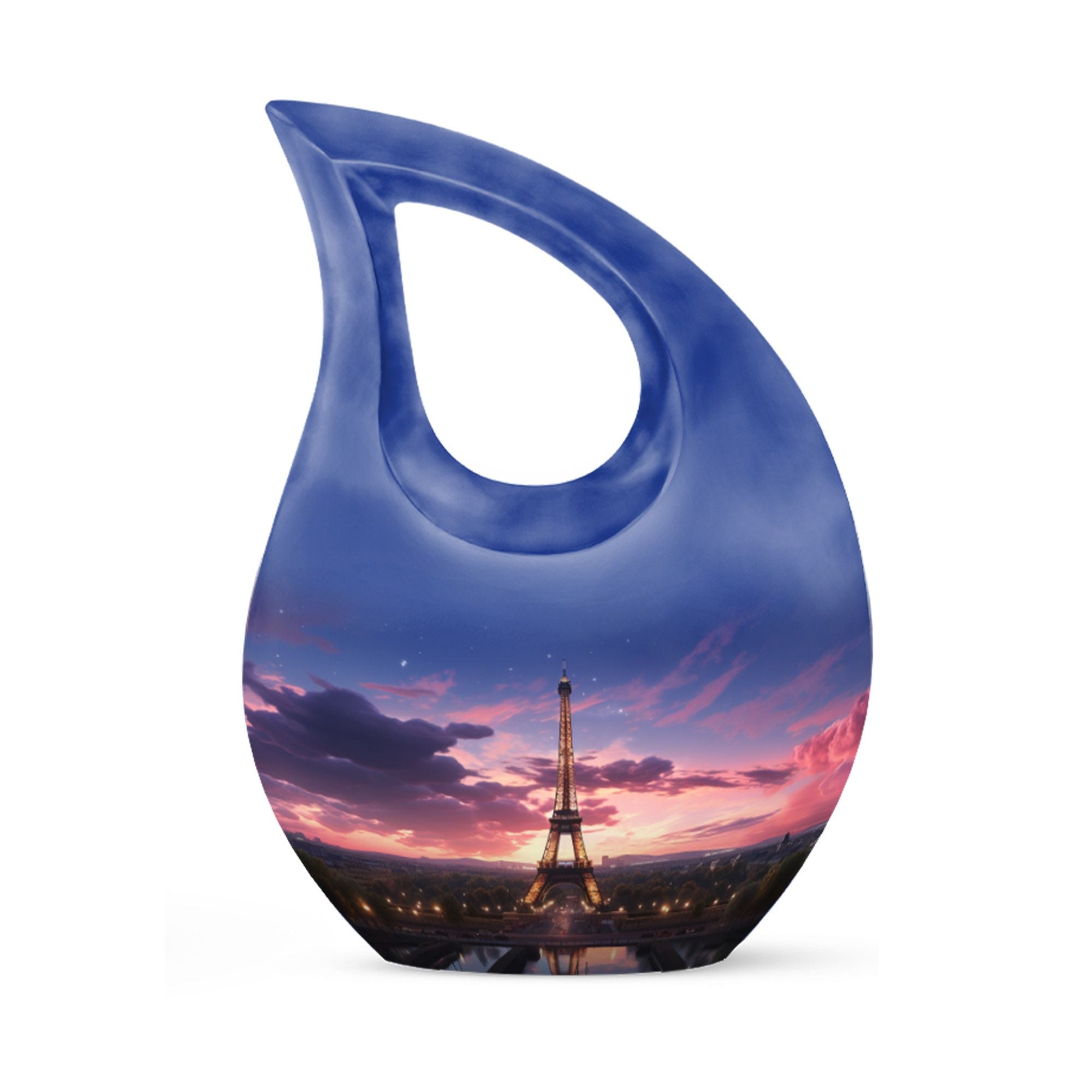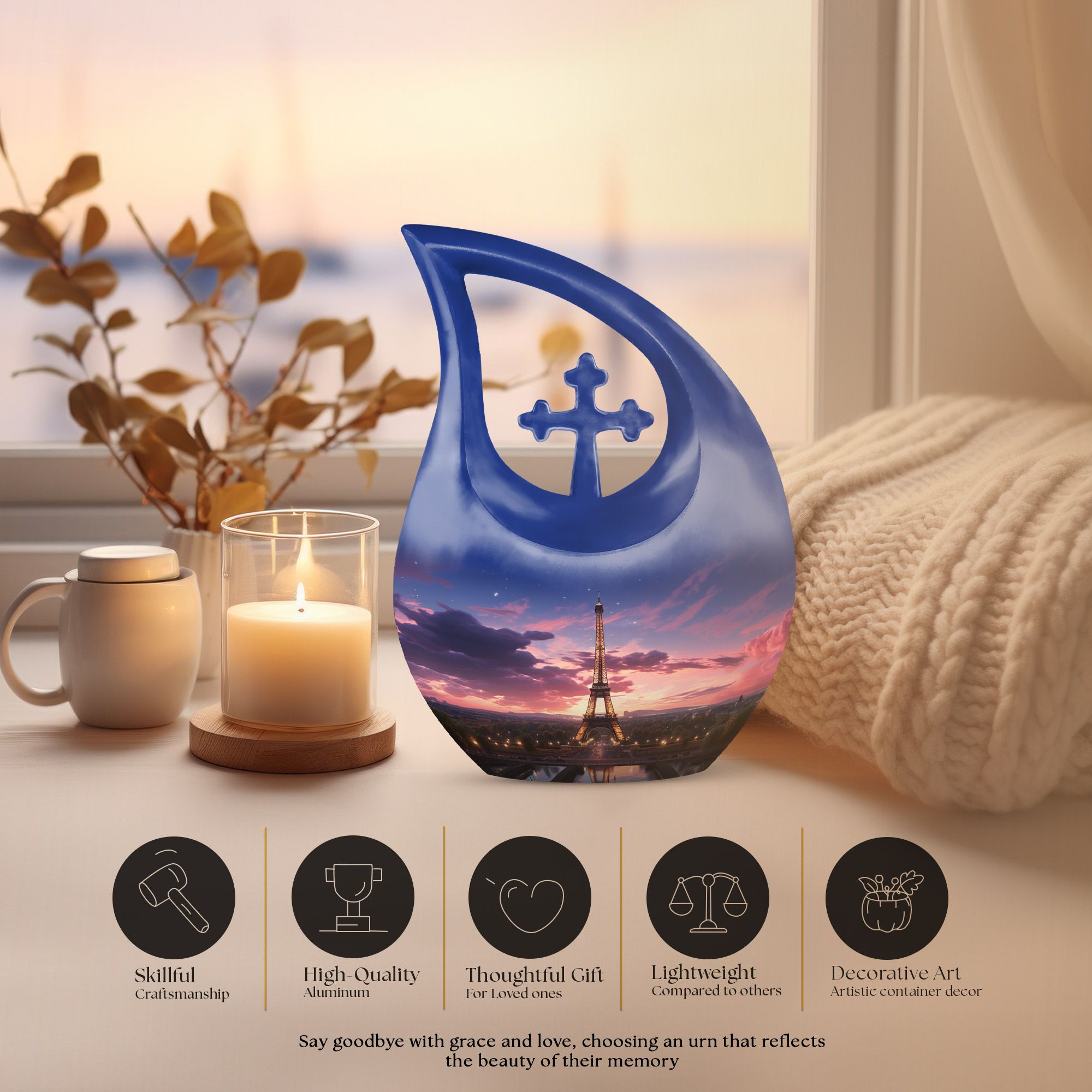 Expertly handcrafted from high-quality aluminum, the urn showcases detailed artistry inspired by the iconic Eiffel Tower — a universal symbol of love and remembrance. The smooth metallic finish, coupled with intricate engravings, enhances its timeless beauty. Ideal for human urns for ashes adult female or ash urns for humans male, this urn blends durability with aesthetic charm, making it suitable for both display and burial. The design ensures that your loved one’s ashes are preserved with utmost care and dignity.