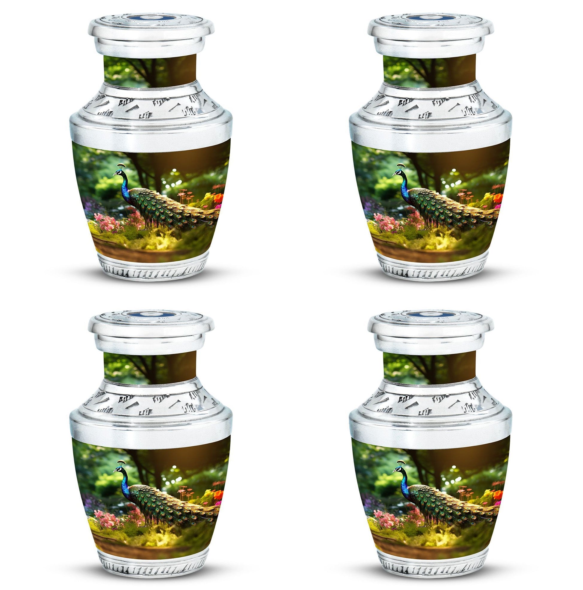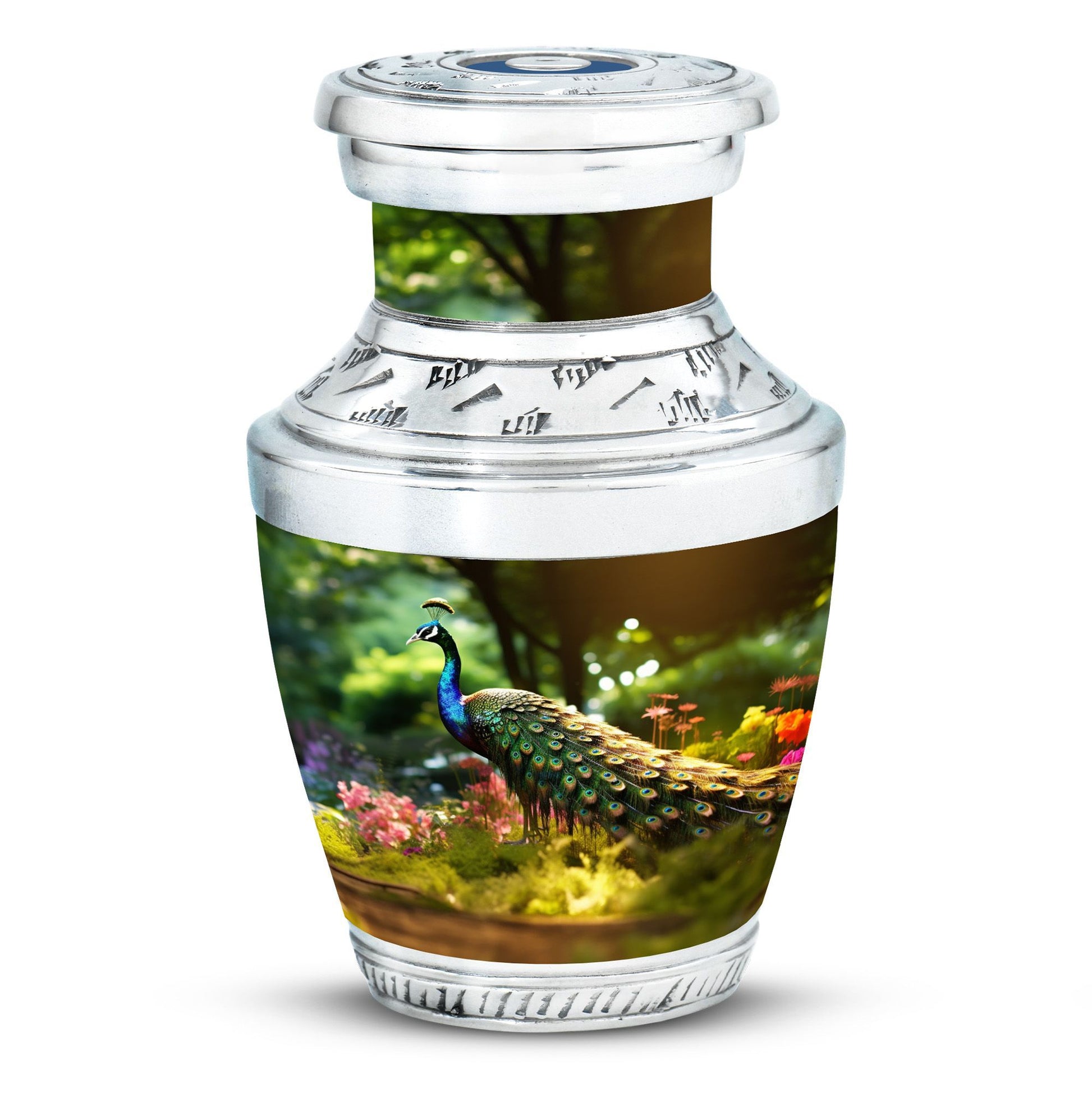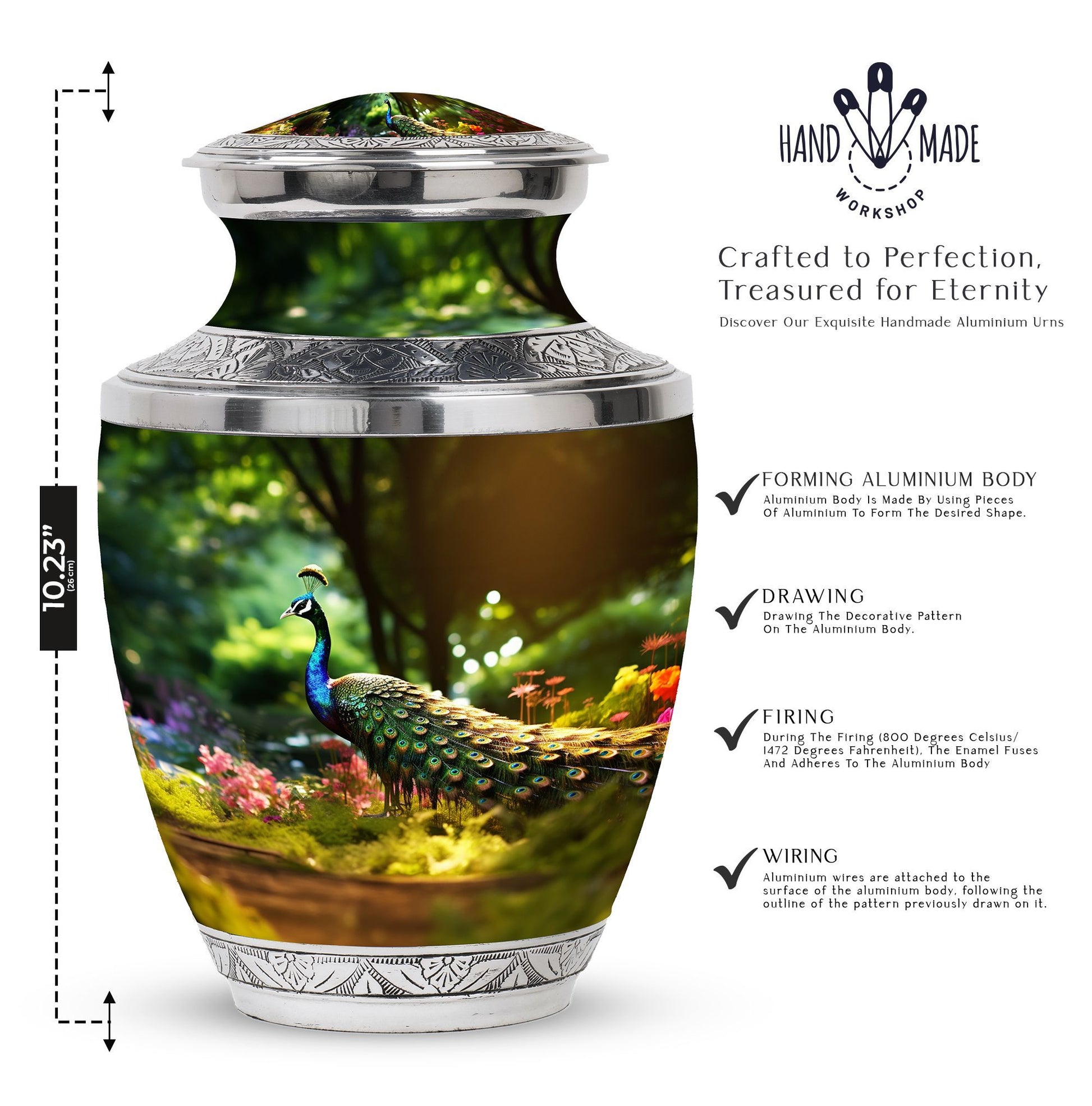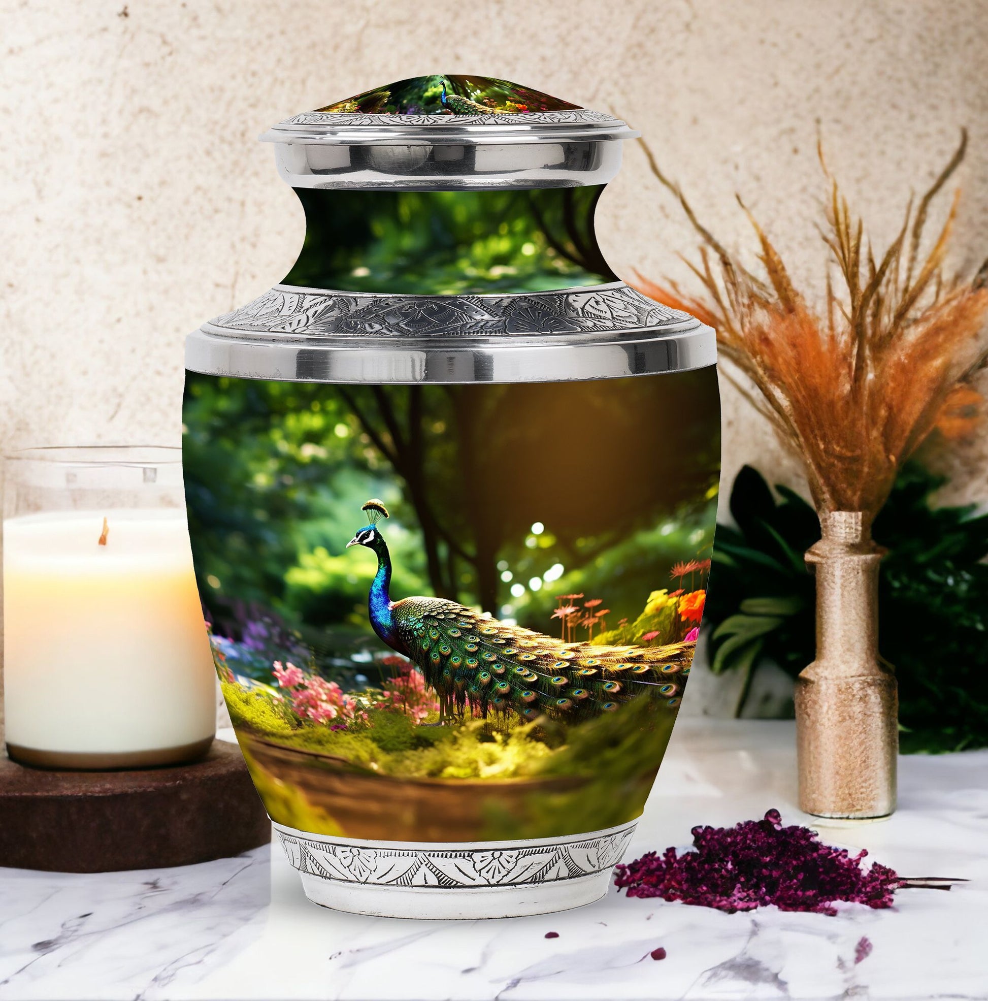 Introducing the Peacock Memorial Urn, an elegant and dignified choice in cremation containers. This large-sized urn, standing 10 inches in height, is designed with an eloquent classic urn style, crafted from durable Aluminium material. Its solid weight of 3.3 pounds speaks for its sturdiness. The urn has a capacity of 200 cubic inches, making it a perfect ashes holder for a loved one. Inside the package, you'll find a soft velvet pouch for discreet containment and cherished safeguarding of ashes. Personalize this piece with engraved names, making it a truly one-of-a-kind memorial. With an appealing design and packaged in a size of merely 3 inches, it complements myriad domestic environments. Ideal for households looking for decorative urns for human ashes or urns for moms' ashes. This eminence embodied product speaks volumes about your love and respect for the departed. Treasure their memory with this exclusive piece.