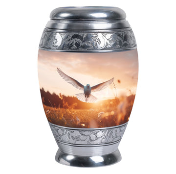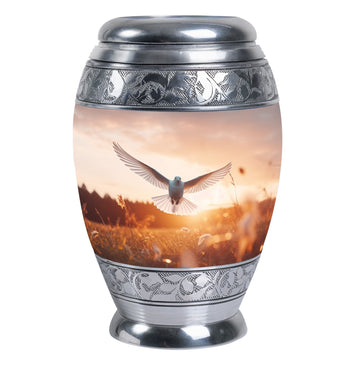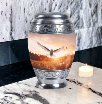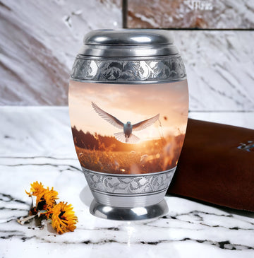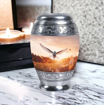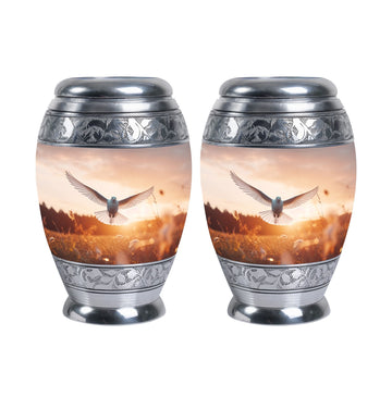 Exemplifying sentiment and compassion, our Dove Urns for Ashes offer an elegant yet modest tribute to your departed loved ones. These Funeral Urns, delicately crafted from high-grade Aluminium, is an ideal addition to any memorial ceremony due to its aptly sized 3 Inch stature and substantial weight of 3.3 pounds. The 'Classic Urn' style presents an ageless appeal, coupled with an impressive capacity to safely encase up to 200 cubic inches of ashes. Unlike the typical cremation urn, our urn is synergized with a personal touch through the option of engraving names for an intimate touch. Additionally, the urn comes with a velvet pouch, ensuring the containment and preservation of your loved one's ashes. These Metal Urns for Human Ashes, Funeral Ashes Containers, and Modern Urns for Ashes have been consciously designed to honor and celebrate a life well-lived. Respect their memory in an esteemed manner with our Custom Cremation Urns.