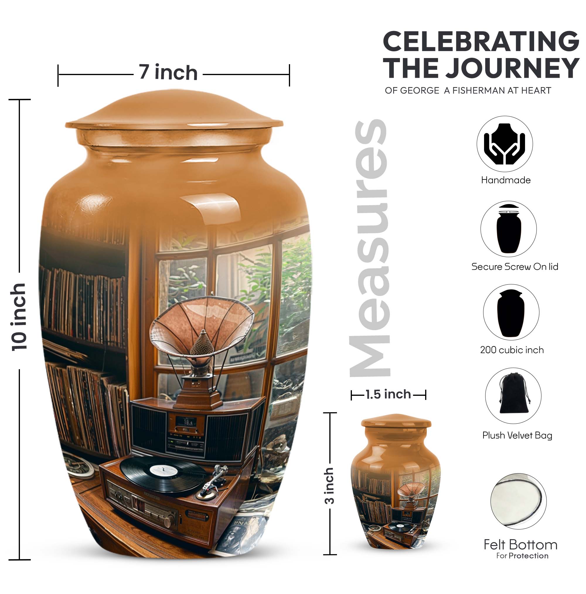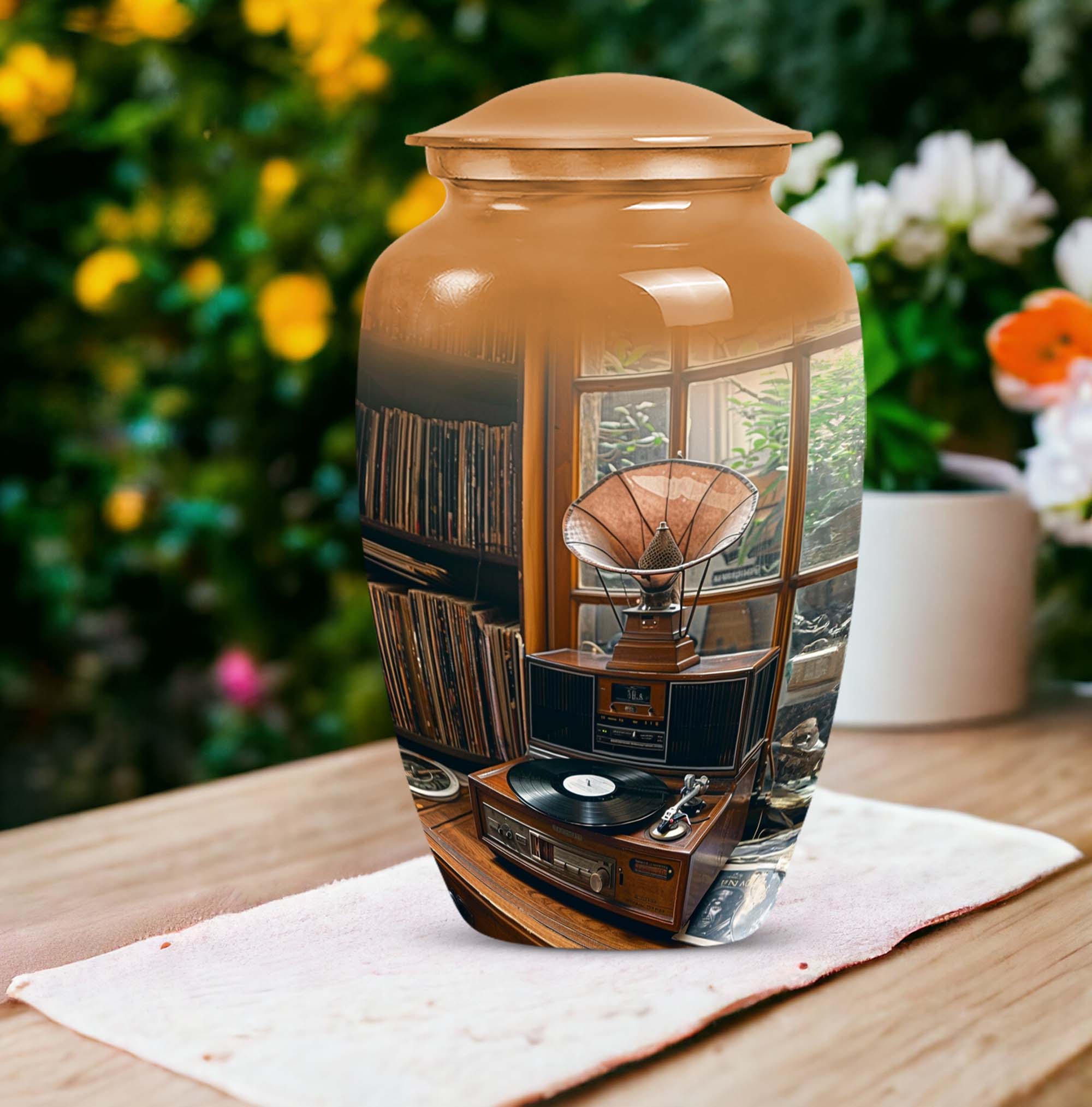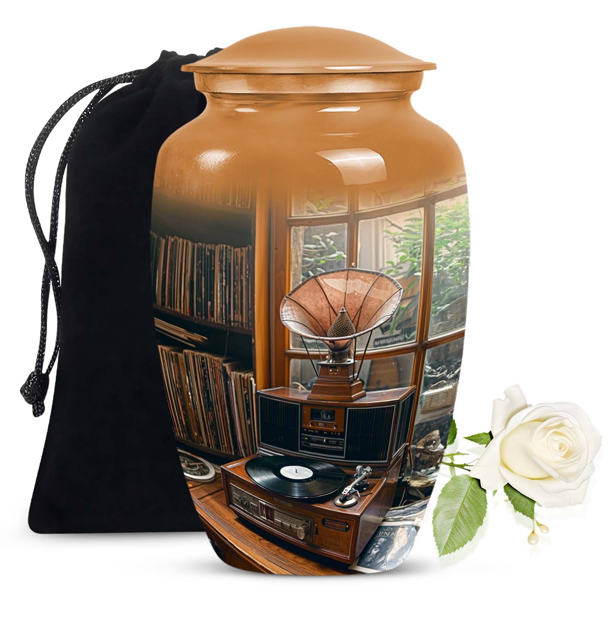 Introducing the Gramophone Cremation Urne, a charming tribute designed to hold the final rest of a loved one. Crafted in sturdy aluminium, this large urn boasts a weight of 3.3 pounds and is able to accommodate 200 cubic inches of ashes. At 10 inches in height, this Medium sized funeral urn adds a touch of classic elegance for preserving your loved one's memory. A thoughtful inclusion, you'll find a velvet pouch for containment of ashes which accompanies this urn. Customization options are available, allowing for the engraving of names to add a heartfelt personal touch. A fitting symbol of love and remembrance, this urn refrains from the typical design, instead inspired by the nostalgia-evoking gramophone. Easily found keyword searches include 'urns for human ashes', 'funeral medium size urns for human ashes', and 'urns for cremation'. Give a dignified homage to your loved one with this exquisite piece of memorial ceremony supply.