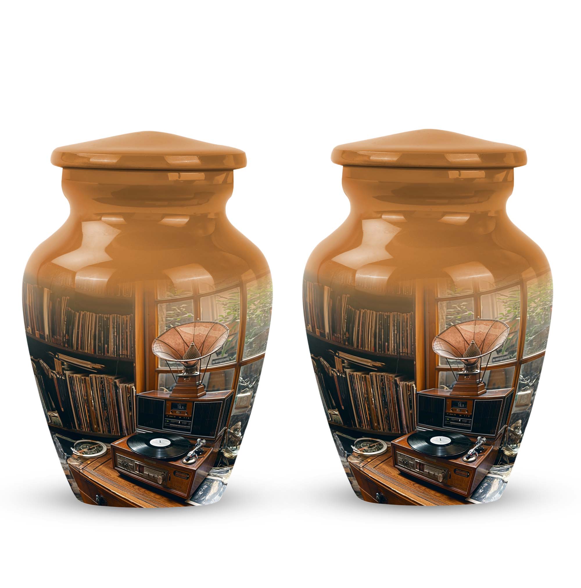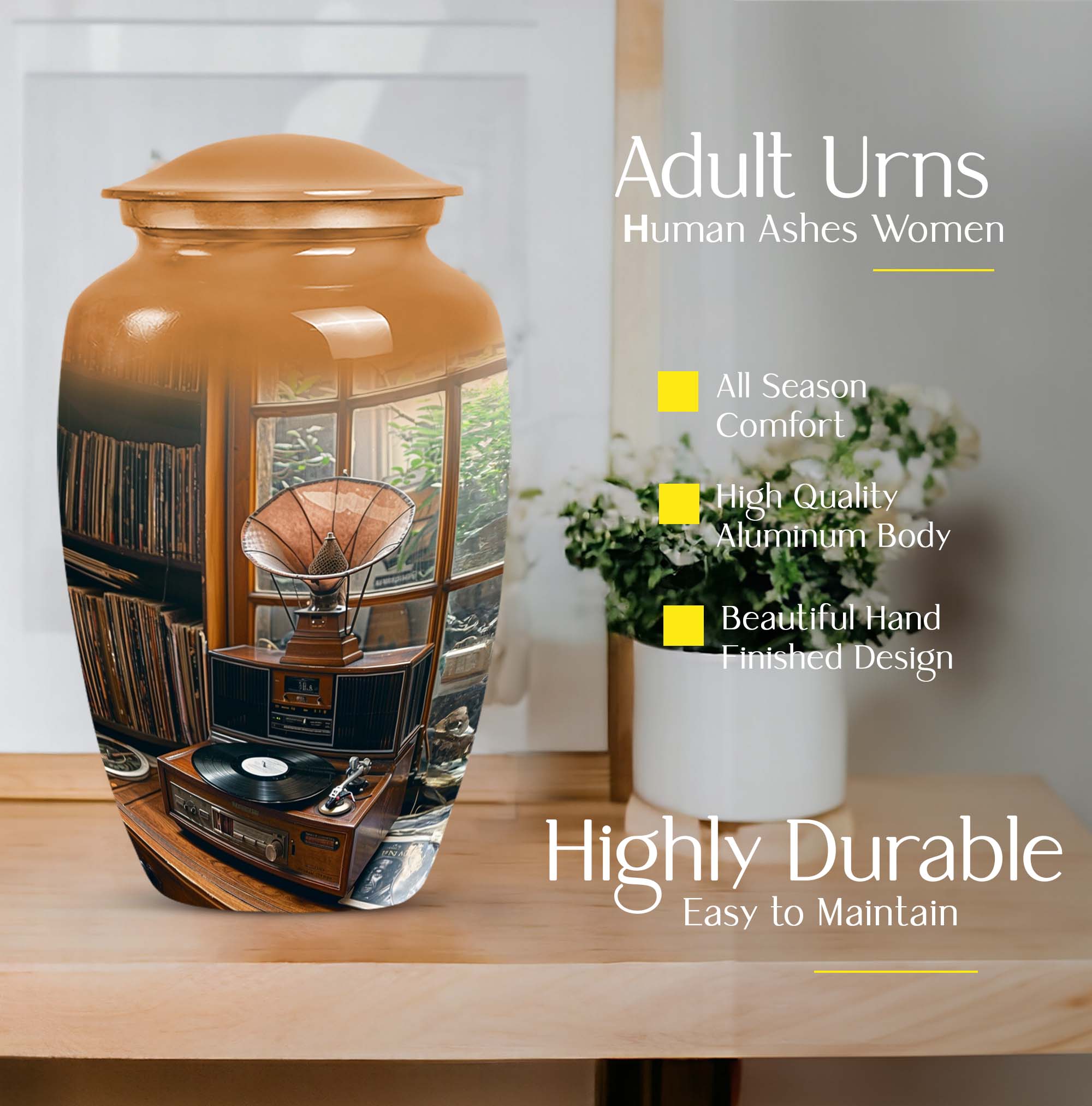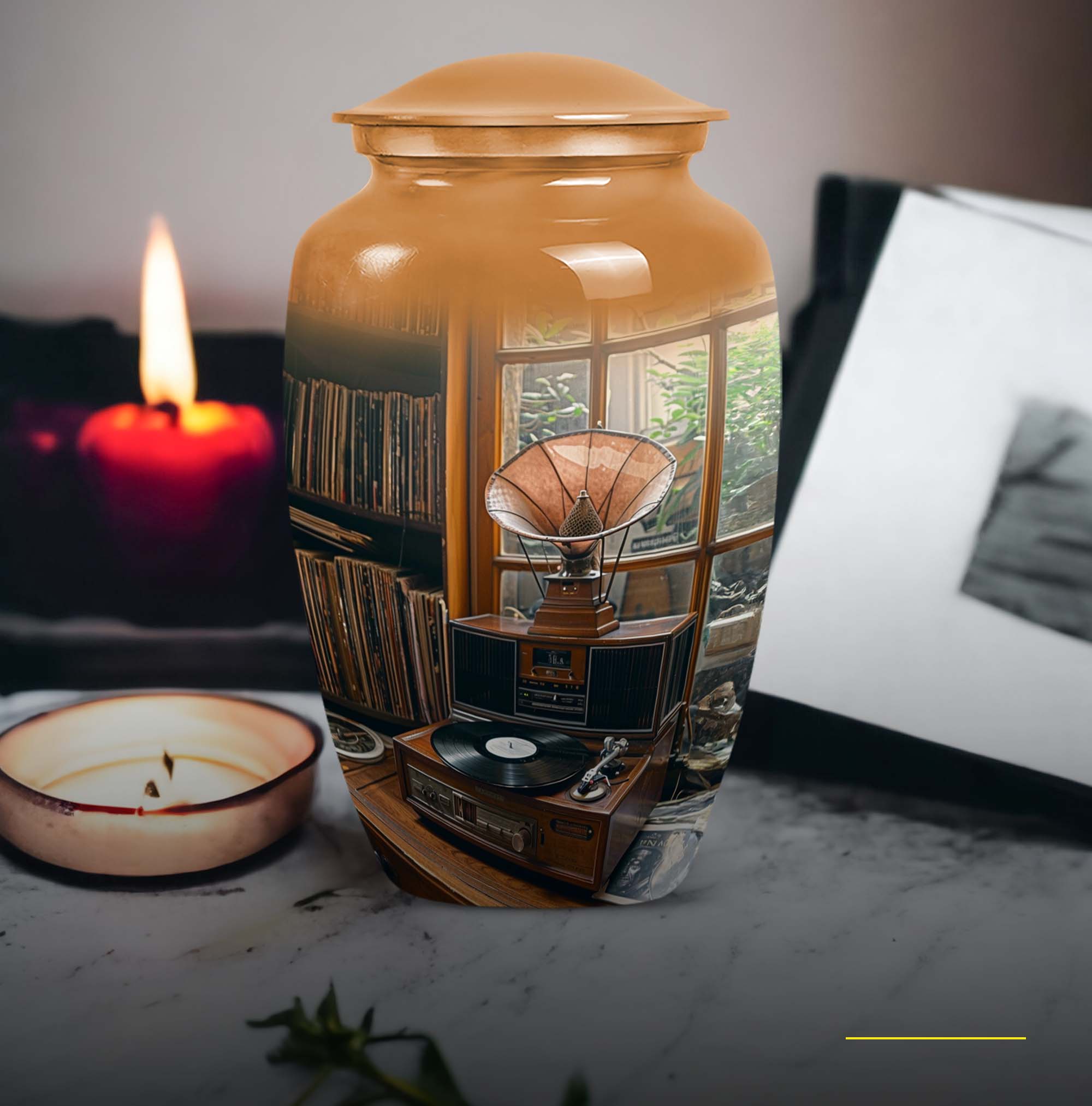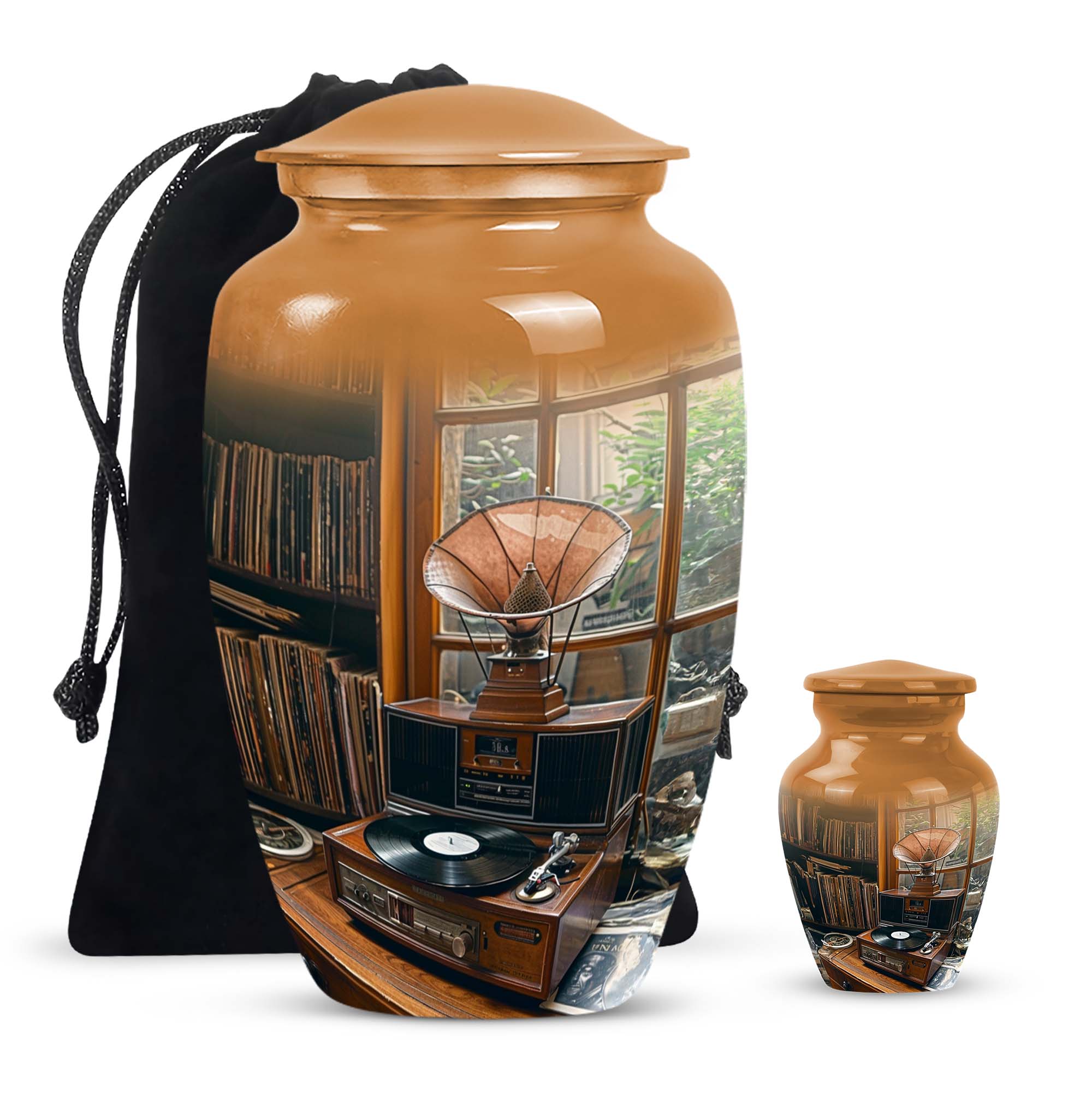 Introducing the Gramophone Cremation Urne, a charming tribute designed to hold the final rest of a loved one. Crafted in sturdy aluminium, this large urn boasts a weight of 3.3 pounds and is able to accommodate 200 cubic inches of ashes. At 10 inches in height, this Medium sized funeral urn adds a touch of classic elegance for preserving your loved one's memory. A thoughtful inclusion, you'll find a velvet pouch for containment of ashes which accompanies this urn. Customization options are available, allowing for the engraving of names to add a heartfelt personal touch. A fitting symbol of love and remembrance, this urn refrains from the typical design, instead inspired by the nostalgia-evoking gramophone. Easily found keyword searches include 'urns for human ashes', 'funeral medium size urns for human ashes', and 'urns for cremation'. Give a dignified homage to your loved one with this exquisite piece of memorial ceremony supply.
