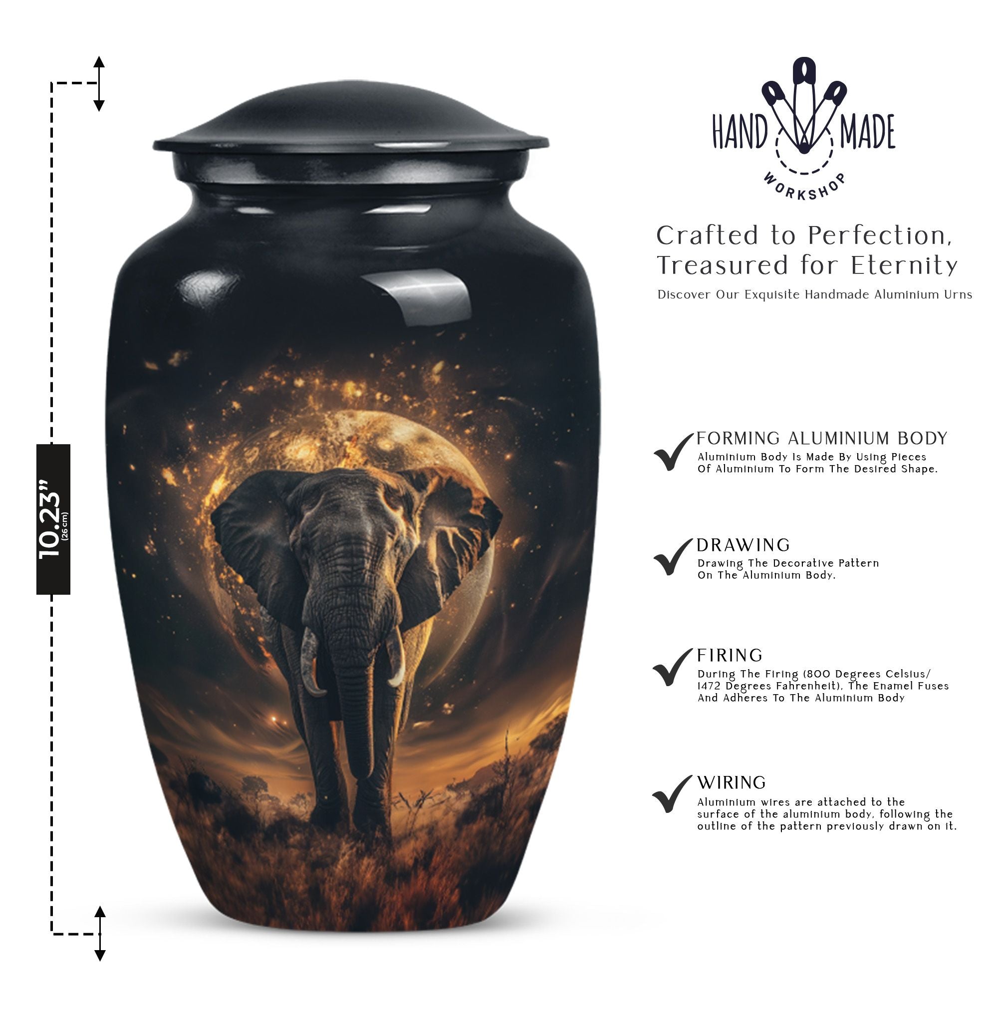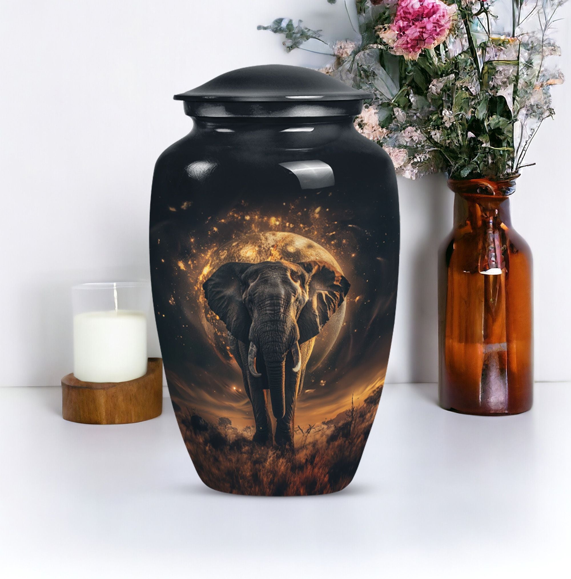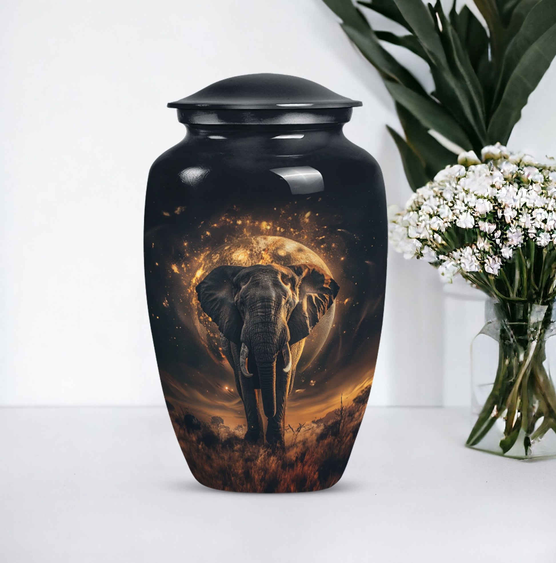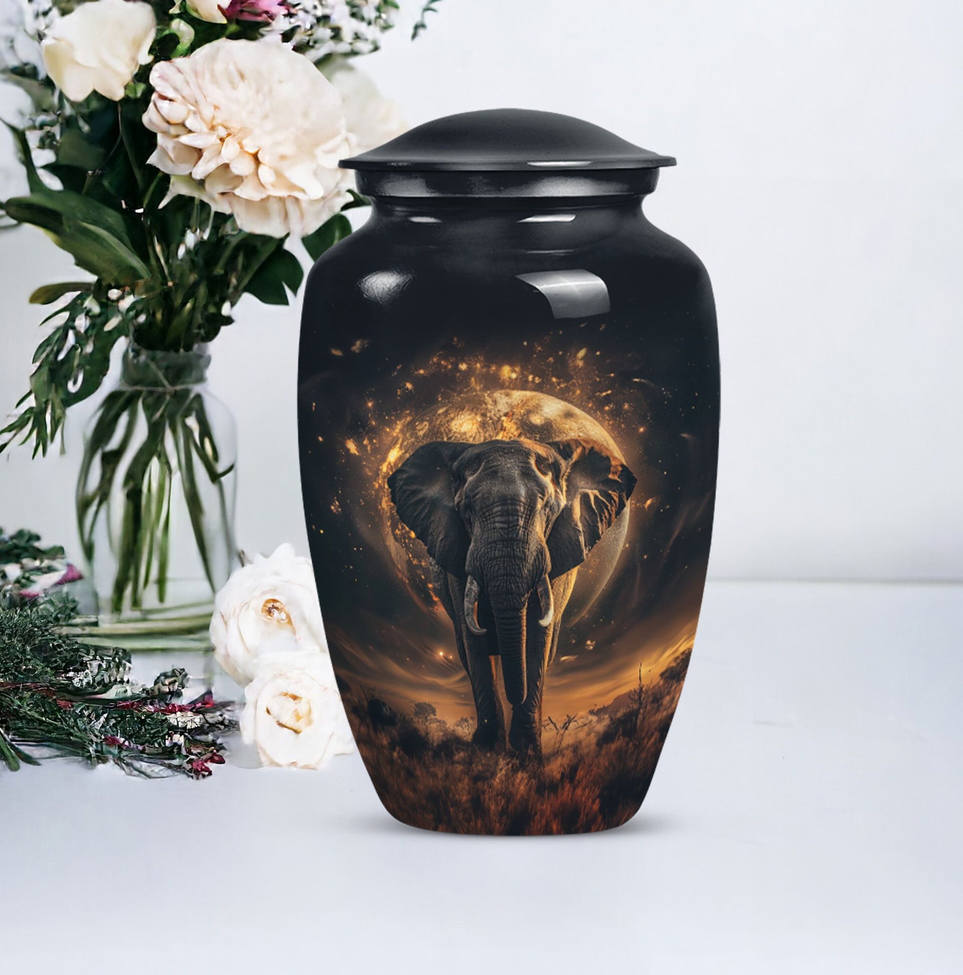 Honour your loved one with our high quality Butterfly-themed, 10-inch Tall Elephant Urn. This unique cremation urn is meticulously crafted from robust aluminium, ensuring it stands the test of time. Its substantial size allows for a capacity of 200 cubic inches, comfortably holding the ashes of adults; a unisex choice adept for both males and females. Weighing in at a steady 3.3 pounds, with a stand shaped to perfection, it sits stably wherever you wish to place it. Every urn comes with a complementary velvet pouch providing a tasteful containment for the preserved ashes. The urn's exterior is gracefully adorned with an elegant butterfly theme - a symbol of transformation and the cycle of life. To make it further special, a customization option is available; personalize it by engraving names of your choice to capture the essence of your loved one's life. This stately, classic urn is more than a memorial product; it's a gentle, daily reminder of a cherished life. Remember, an Elephant Urn is more than just a funeral urn for females; it symbolizes an eternal rest, a celebration of life lived full. Enhance your memorial ceremonies with the blend of elegance, beauty, and remembrance it offers.
