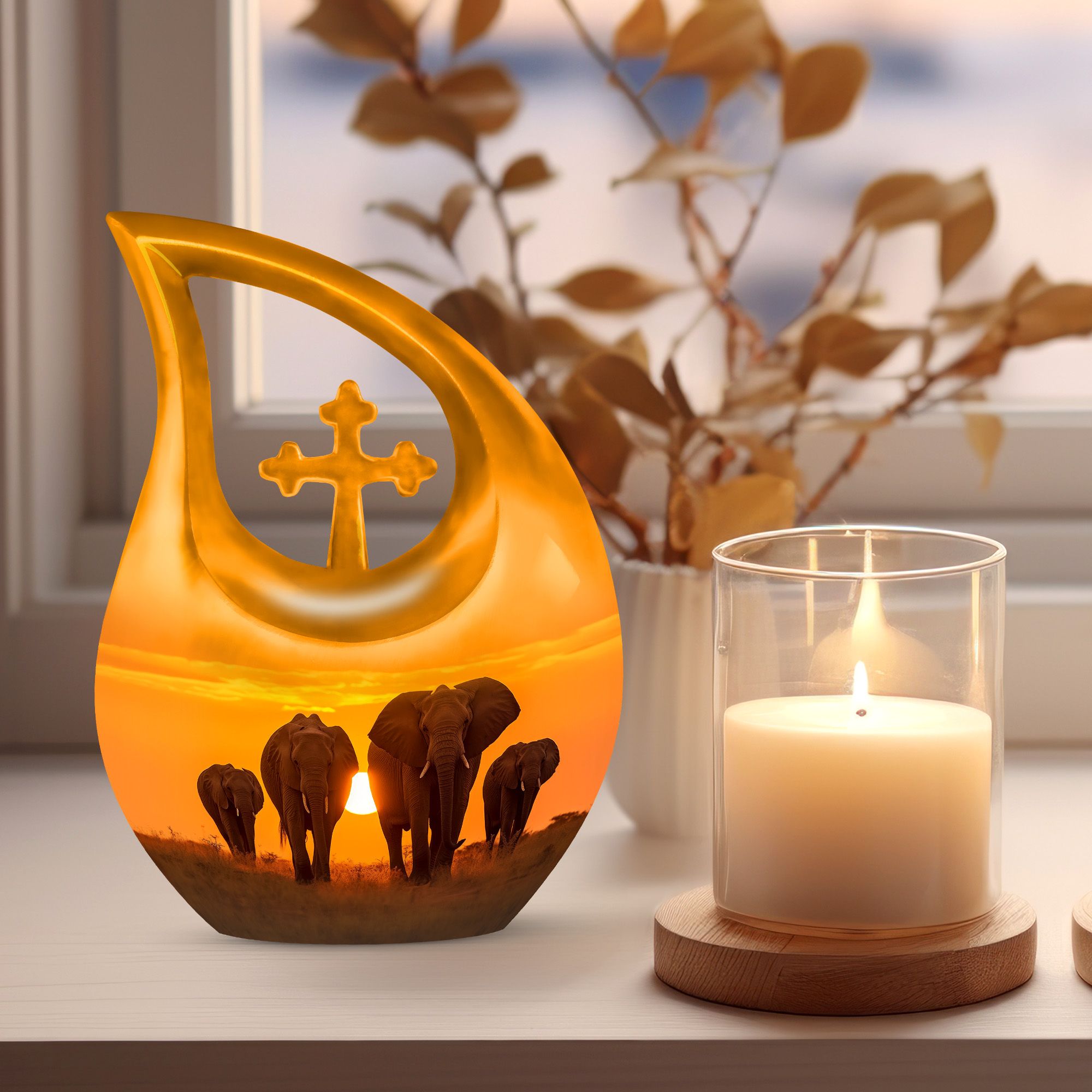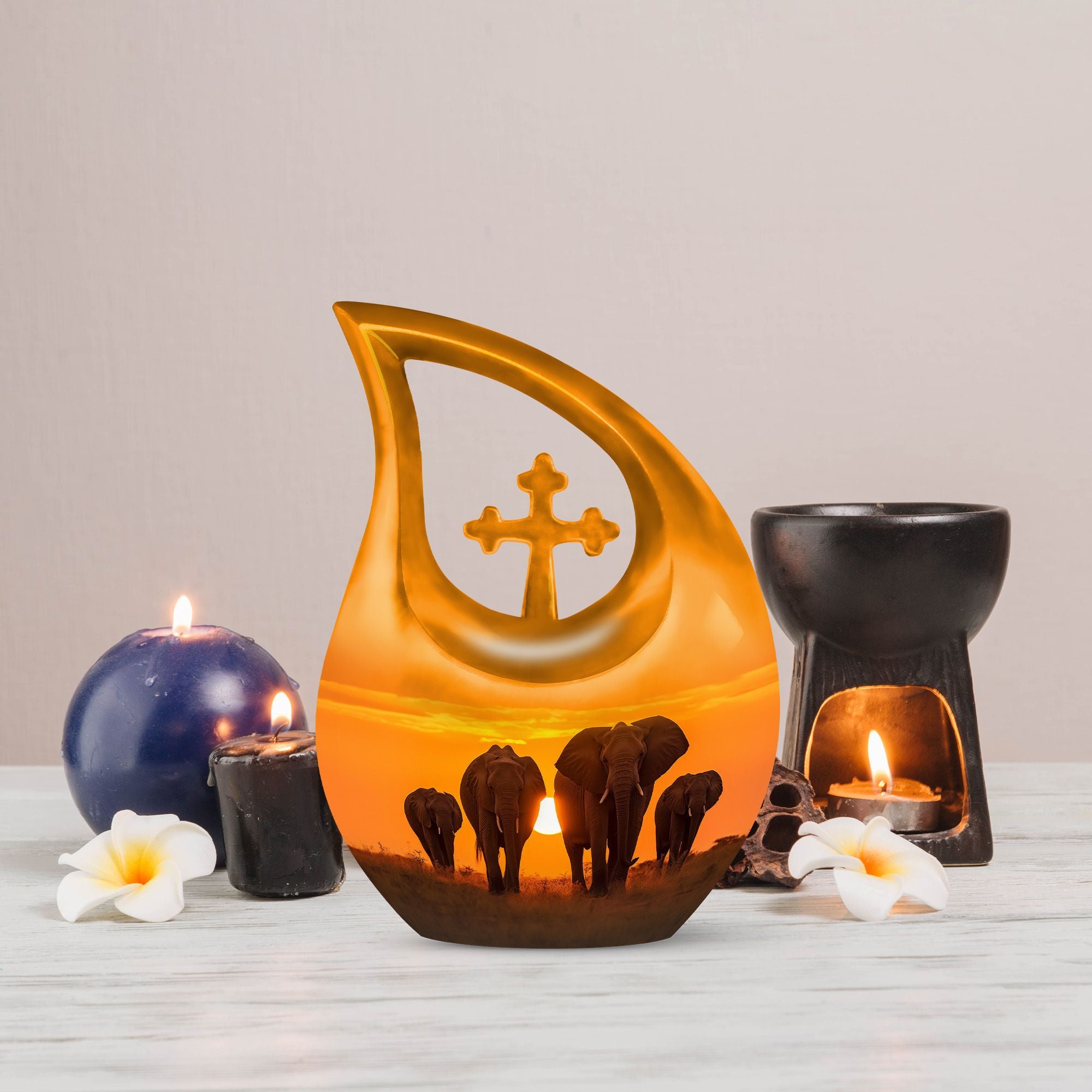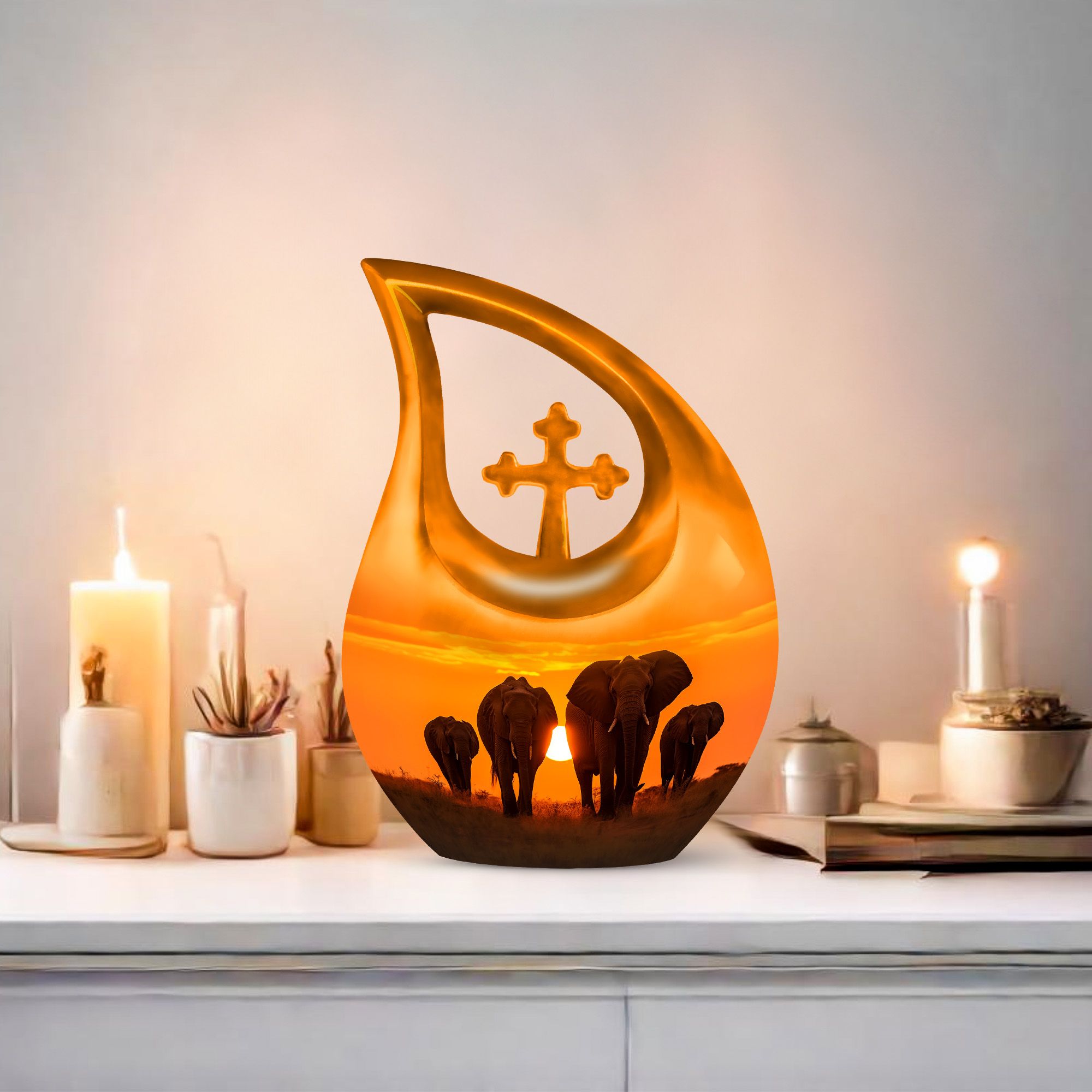 Expertly handcrafted from durable aluminum, this large decorative urn showcases a mesmerizing sunset backdrop featuring a majestic elephant family walking together, symbolizing loyalty and eternal bonds. The urn’s fine detailing and warm tones make it one of the most meaningful large urns for human ashes available. Its smooth finish and high-quality polish ensure both beauty and longevity, making it ideal for display in your home or as part of a memorial ceremony.