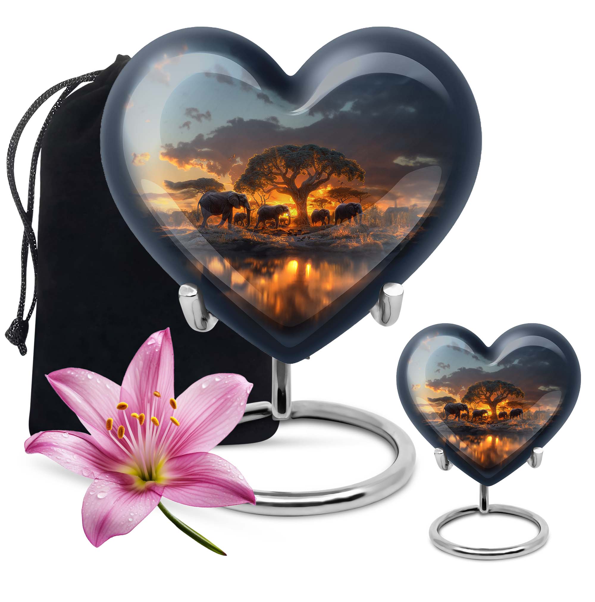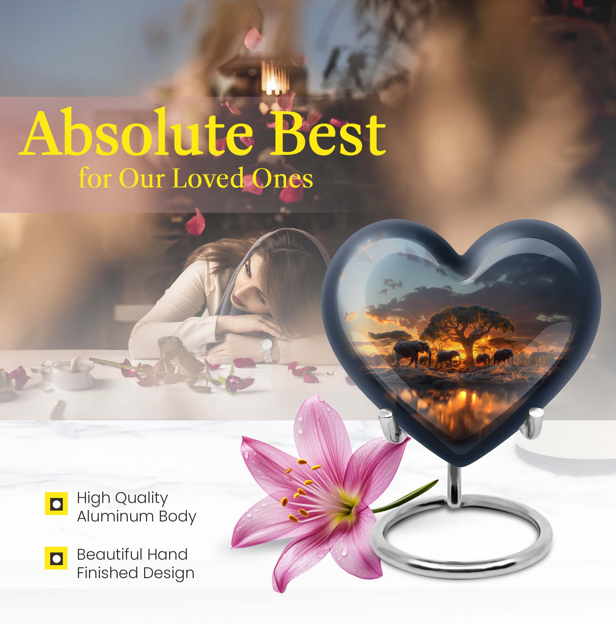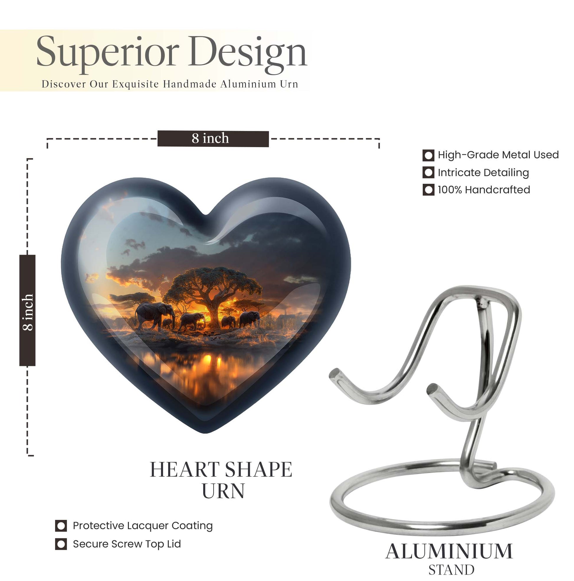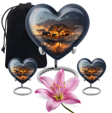 Cherish the memory of your loved one with our captivating Elephant Family Urn. This large 10-inch cremation urn is skilfully crafted from durable aluminium, ensuring longevity and timeless elegance. The enchanting theme of butterflies combined with the heartfelt symbol of an elephant family guarantees a unique visual appeal that respects your sentiments. Weighing just 3.3 pounds, this eye-catching urn has a capacity of 200 cubic inches, suitable for accommodating the ashes of adults. It comes with a velvet pouch that provides a dignified containment of the ashes, reinforcing the importance of remembrance. Personalize this artful funeral urn by engraving names to add a significant touch of love. Representing more than just a resting place for ashes, our Elephant Family Urn showcases art, evokes emotions and revives a whirlpool of fond memories. Ideal for artistic souls, this handcrafted memorial urn is a beautiful testament to a life well lived.