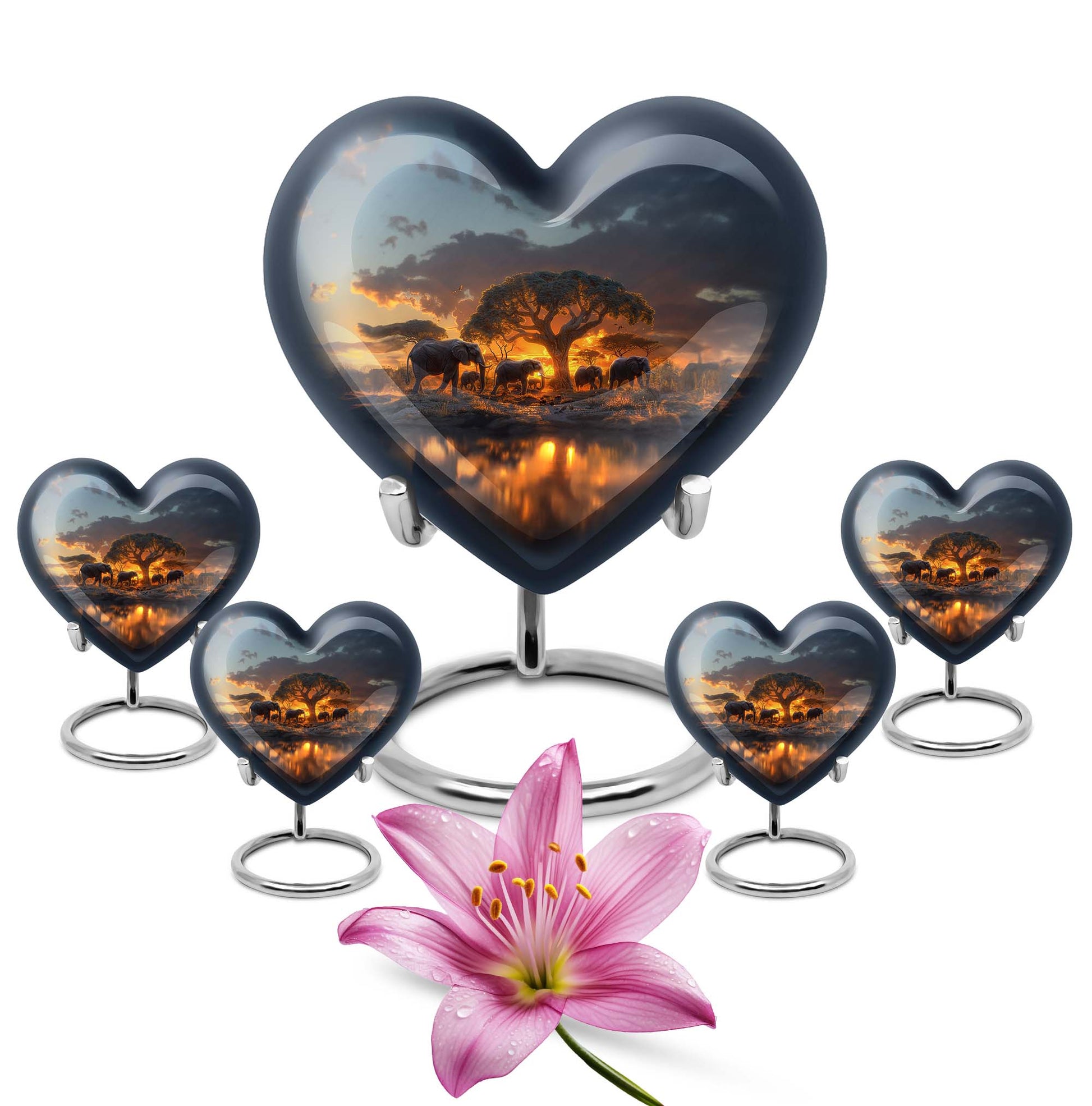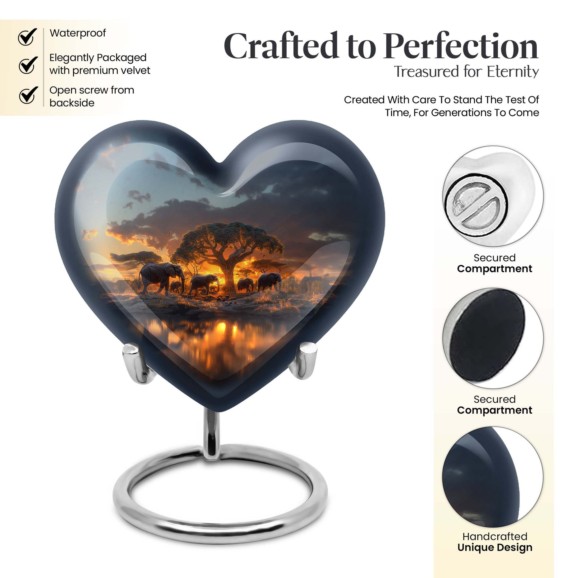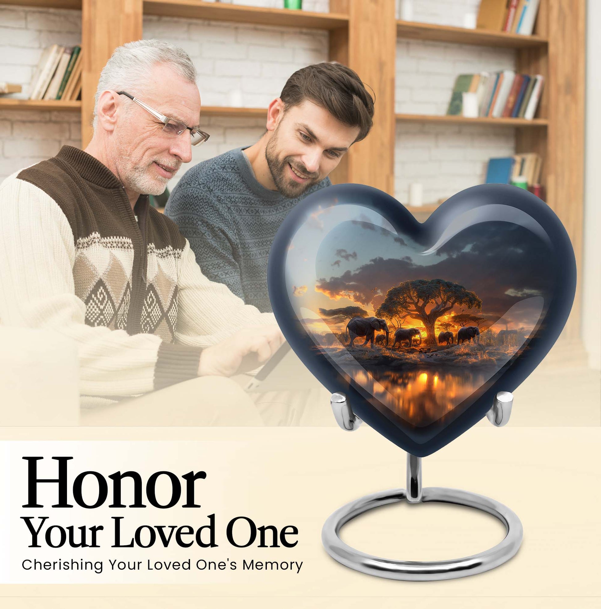 Cherish the memory of your loved one with our captivating Elephant Family Urn. This large 10-inch cremation urn is skilfully crafted from durable aluminium, ensuring longevity and timeless elegance. The enchanting theme of butterflies combined with the heartfelt symbol of an elephant family guarantees a unique visual appeal that respects your sentiments. Weighing just 3.3 pounds, this eye-catching urn has a capacity of 200 cubic inches, suitable for accommodating the ashes of adults. It comes with a velvet pouch that provides a dignified containment of the ashes, reinforcing the importance of remembrance. Personalize this artful funeral urn by engraving names to add a significant touch of love. Representing more than just a resting place for ashes, our Elephant Family Urn showcases art, evokes emotions and revives a whirlpool of fond memories. Ideal for artistic souls, this handcrafted memorial urn is a beautiful testament to a life well lived.