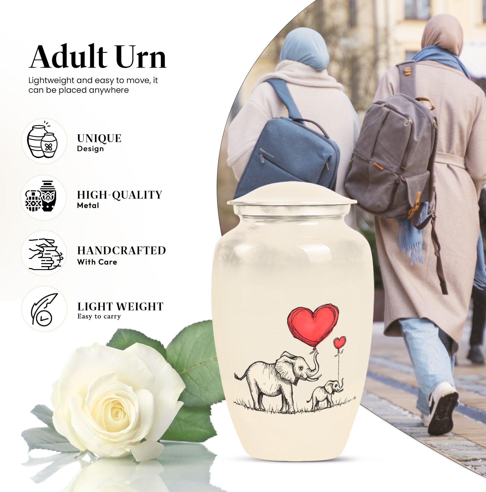 Elevate your tribute to your loved ones with our meticulously fashioned 10 Inch Elephant Family Urn. Crafted from robust aluminium, this large urn weighs a study 3.3 pounds and stands at a dignified height of 10 inches. Able to hold up to 200 cubic inches of remains, it offers ample space for adult human ashes, making it an apt choice for either men or women. The abstract theme adds an artistic touch to the classic urn design, which is further accentuated by the option to personalize it with engraved names. Each purchase includes a sumptuous velvet pouch, providing a delicate containment for the ashes. Ideal for anyone on the lookout for 'burial ash urns for humans', this 'cremation urn' perfectly balances tradition with modernity. The 'elephant family urn' captures a sense of unity and eternal connection, serving as a beautiful symbol of your everlasting bond with the departed.
