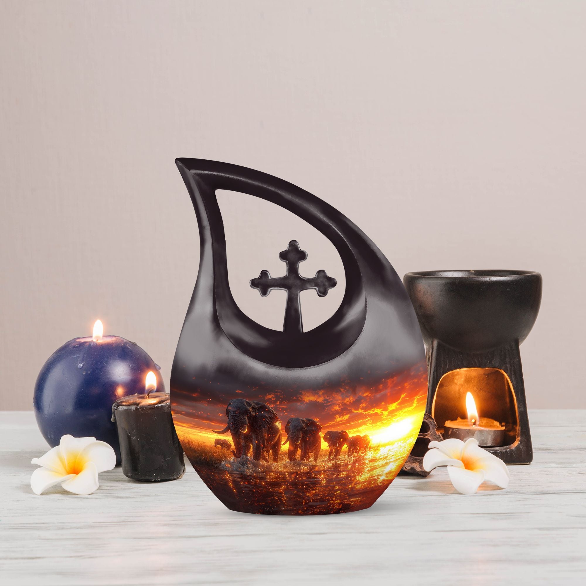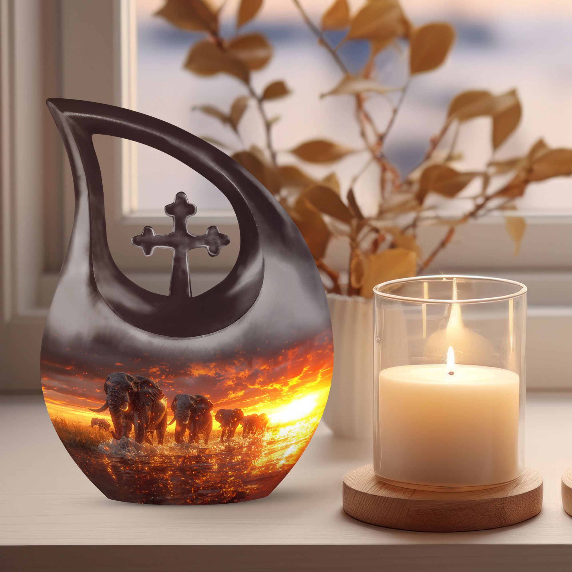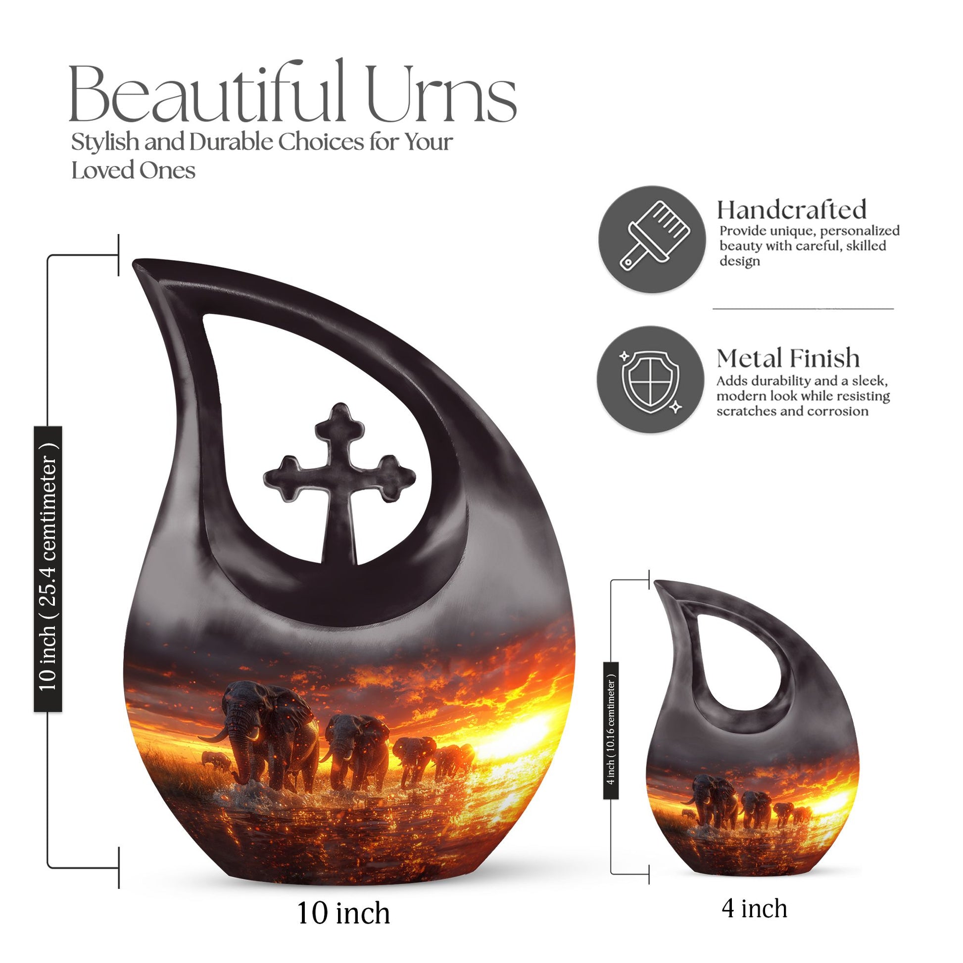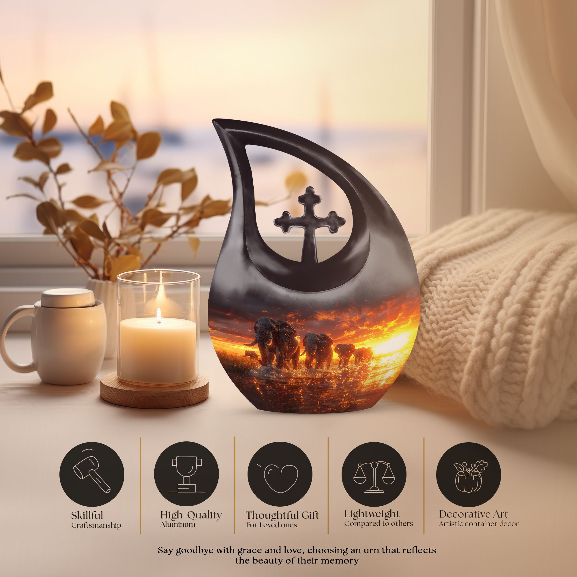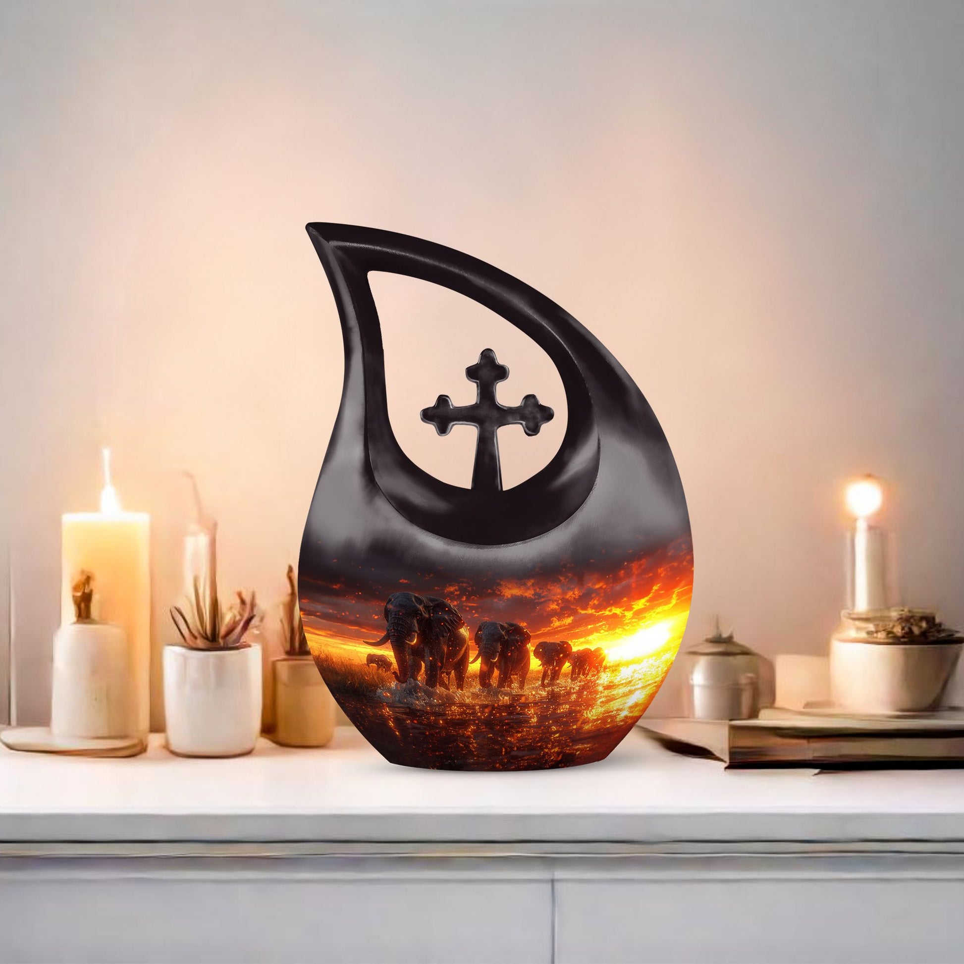 For those seeking a meaningful, commemorative treasure that honors the memory of a loved one, we present the Elephant Family Urn. Its symbolic design is carved into a supportive aluminium framework, signifying the strength of an elephant family. This 10-inch large urn exemplifies a beautiful Cross Drop theme, and is ideally made for burial, serving as one of the best urns for ashes. With a capacity of 200 cubic inches, it can comfortably carry the ashes of your beloved safely encapsulated within. The urn is conscientiously packaged with a velvet pouch, aiding in secure containment of the ashes. Now, you can make this already unique Elephant Family urn even more exceptional by personalizing it with engraved names. With careful consideration given to its weight, we have maintained it at just 3.3 pounds, making it conveniently portable. Our memorial urns are a gentle reminder of your loved one, giving them a place of respect and love in your home. This urn, apart from its role of remembrance, can also serve as a tasteful home decor element. The keywords to guide your search in this category are cremation containers, cremation boxes, burial urns, and cremation urns.