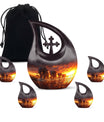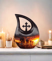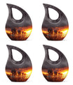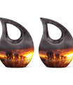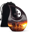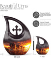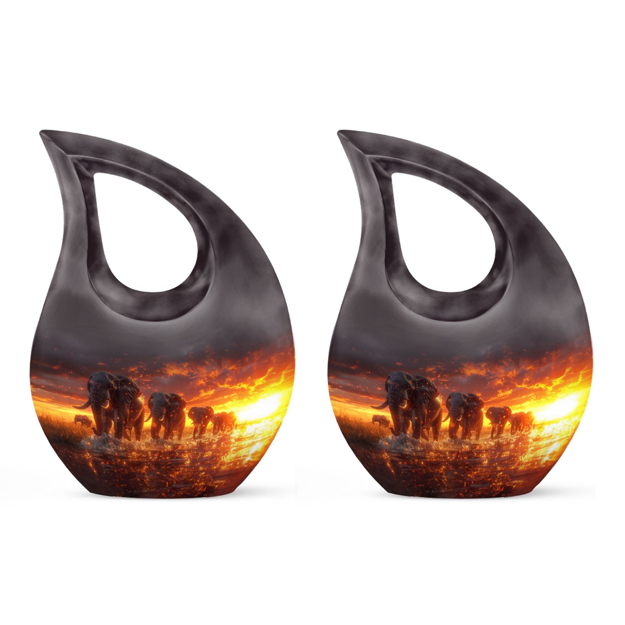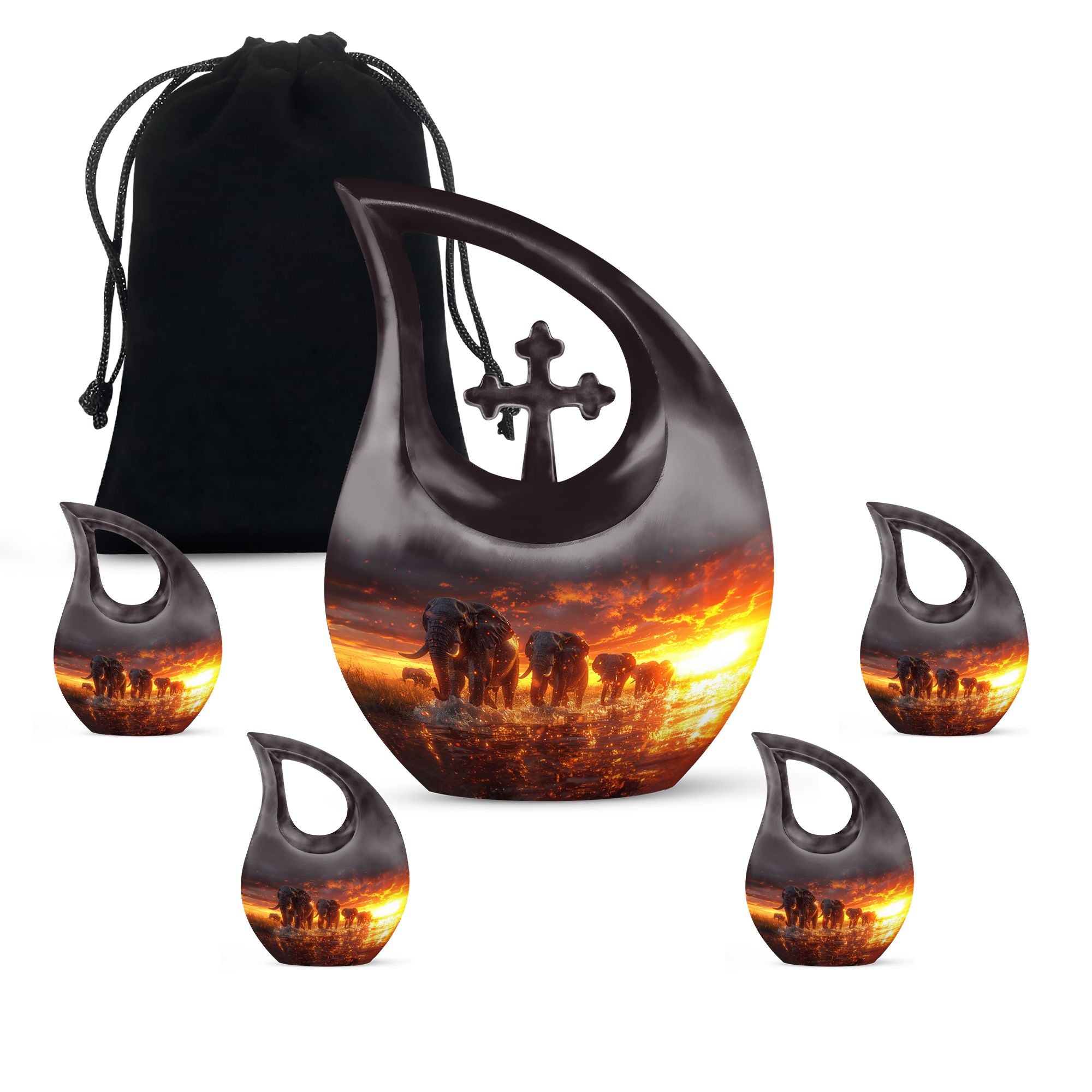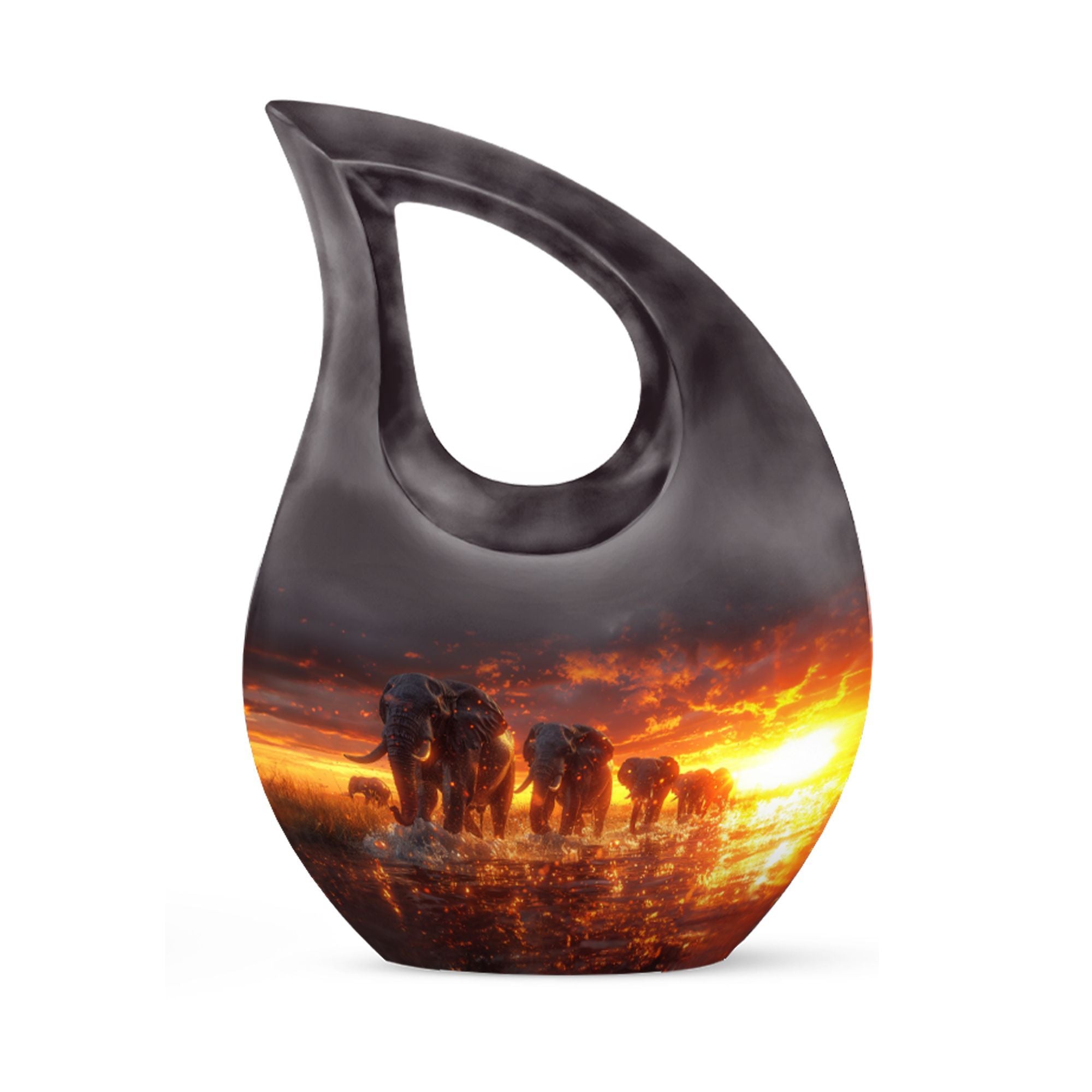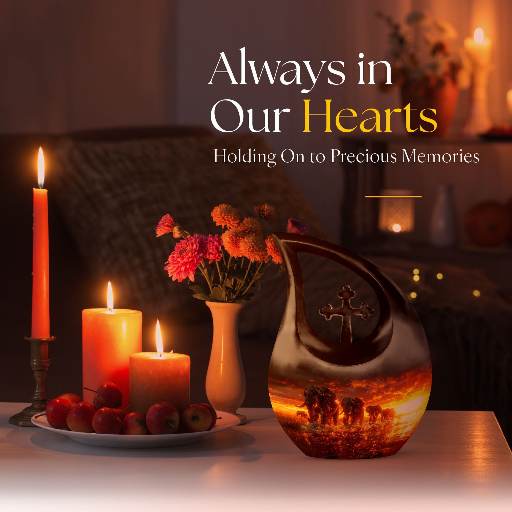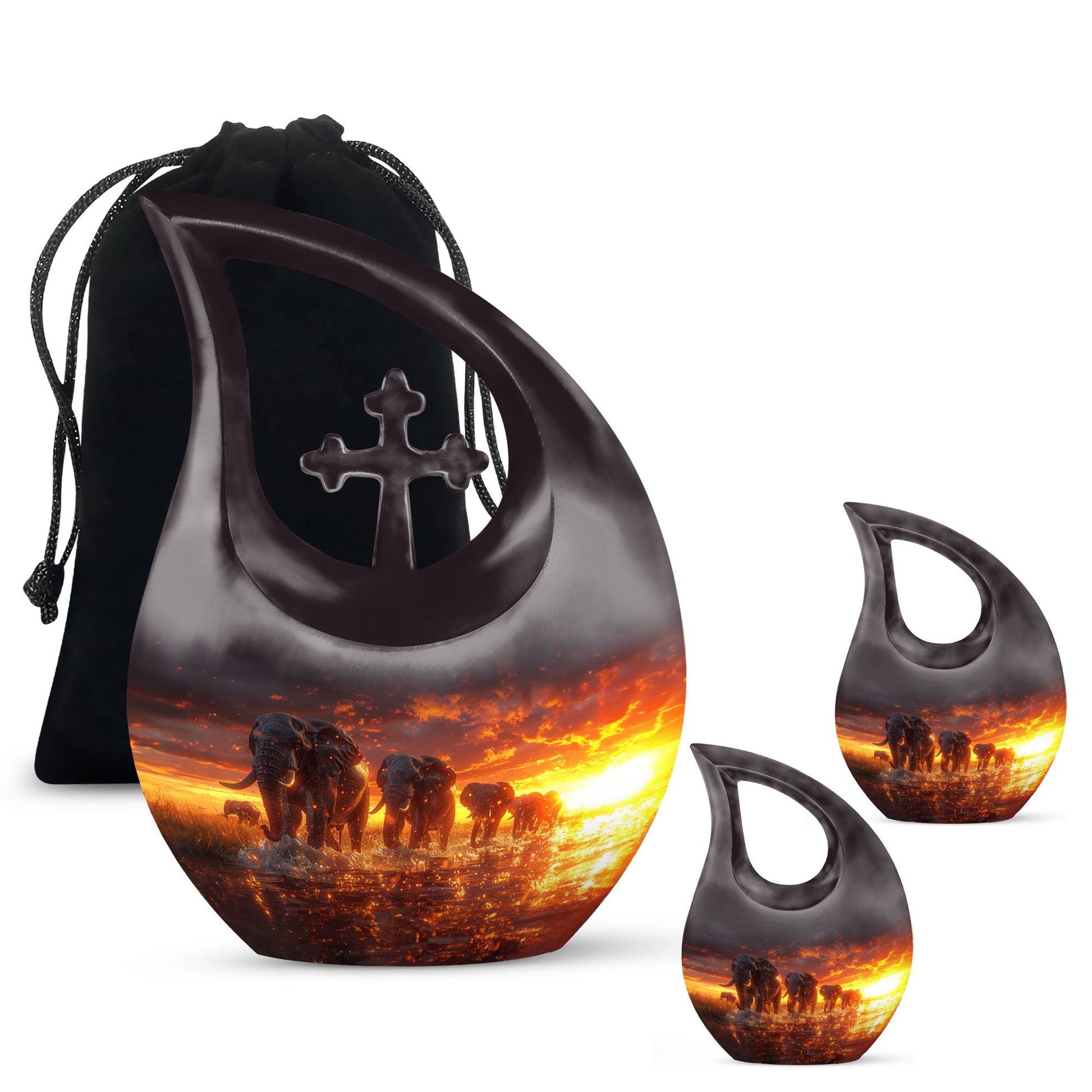 For those seeking a meaningful, commemorative treasure that honors the memory of a loved one, we present the Elephant Family Urn. Its symbolic design is carved into a supportive aluminium framework, signifying the strength of an elephant family. This 10-inch large urn exemplifies a beautiful Cross Drop theme, and is ideally made for burial, serving as one of the best urns for ashes. With a capacity of 200 cubic inches, it can comfortably carry the ashes of your beloved safely encapsulated within. The urn is conscientiously packaged with a velvet pouch, aiding in secure containment of the ashes. Now, you can make this already unique Elephant Family urn even more exceptional by personalizing it with engraved names. With careful consideration given to its weight, we have maintained it at just 3.3 pounds, making it conveniently portable. Our memorial urns are a gentle reminder of your loved one, giving them a place of respect and love in your home. This urn, apart from its role of remembrance, can also serve as a tasteful home decor element. The keywords to guide your search in this category are cremation containers, cremation boxes, burial urns, and cremation urns.