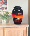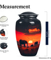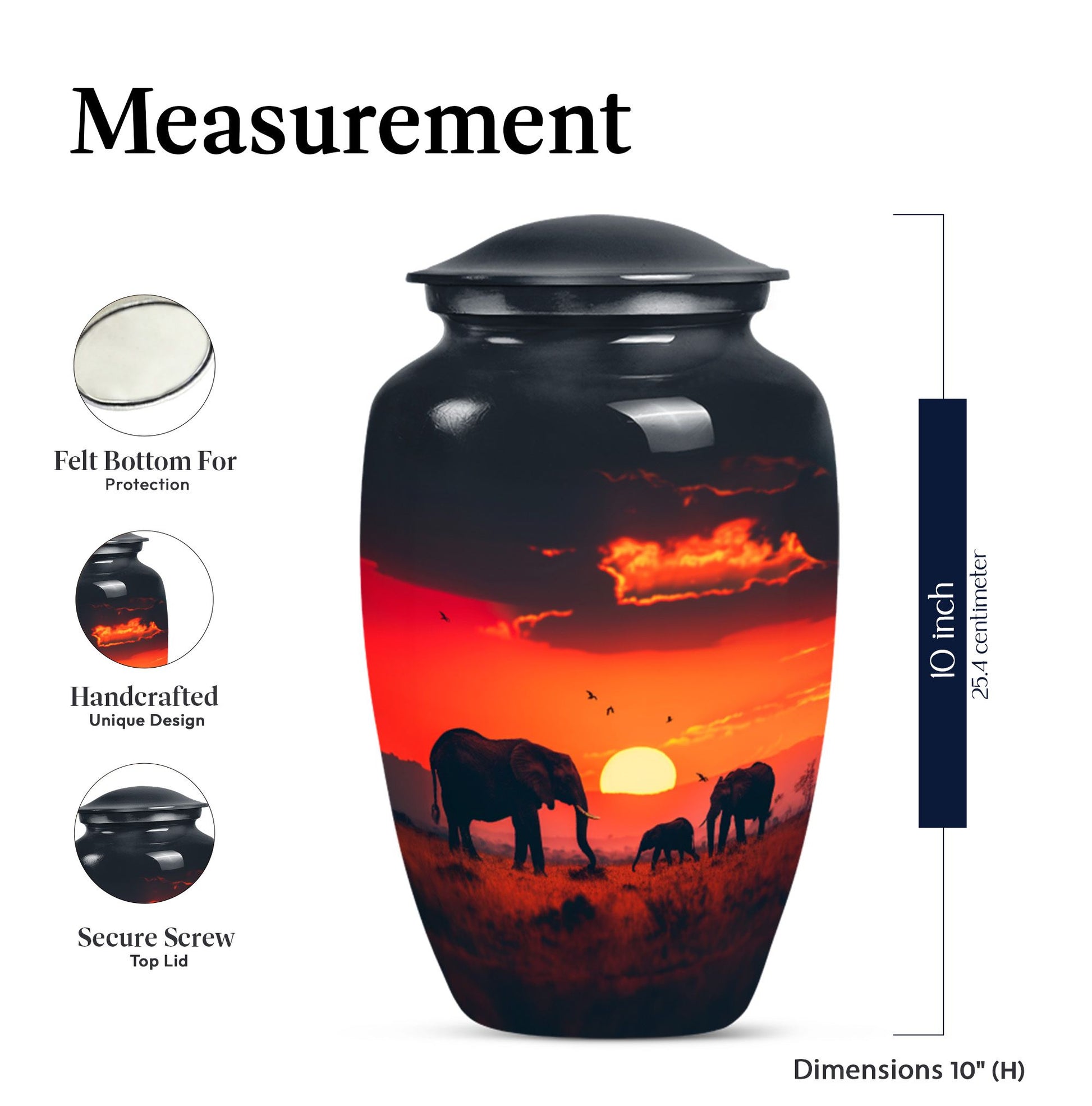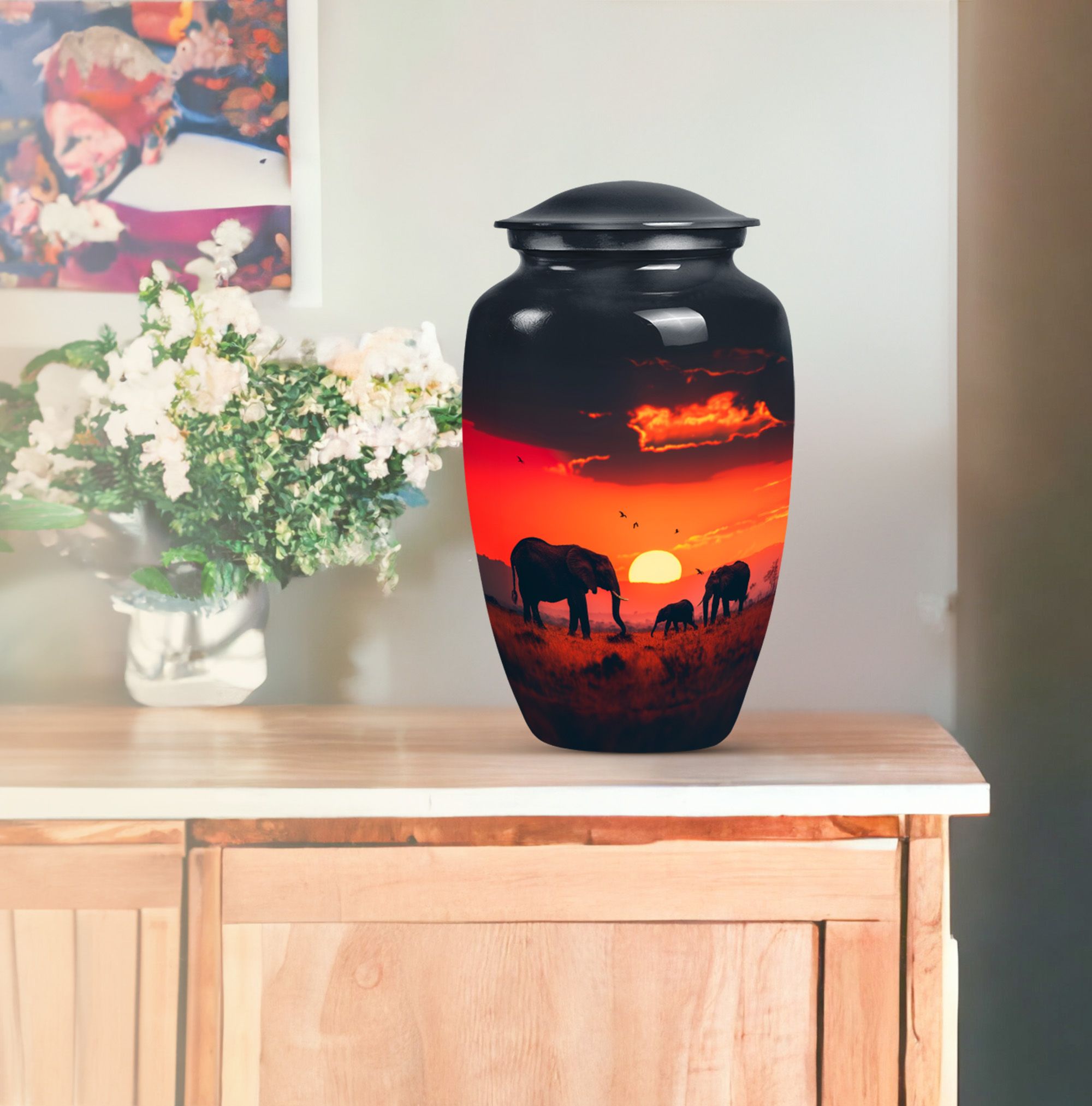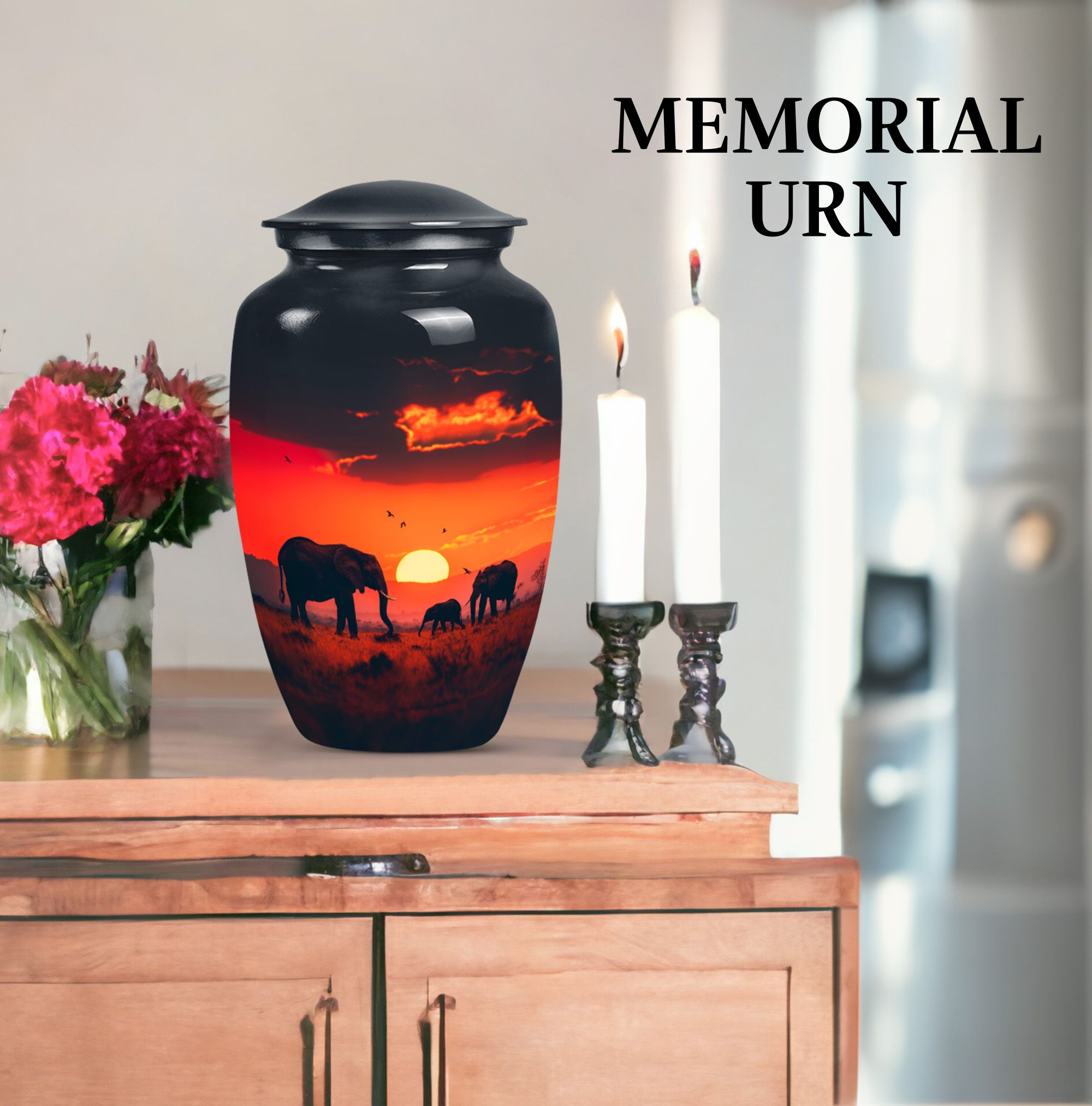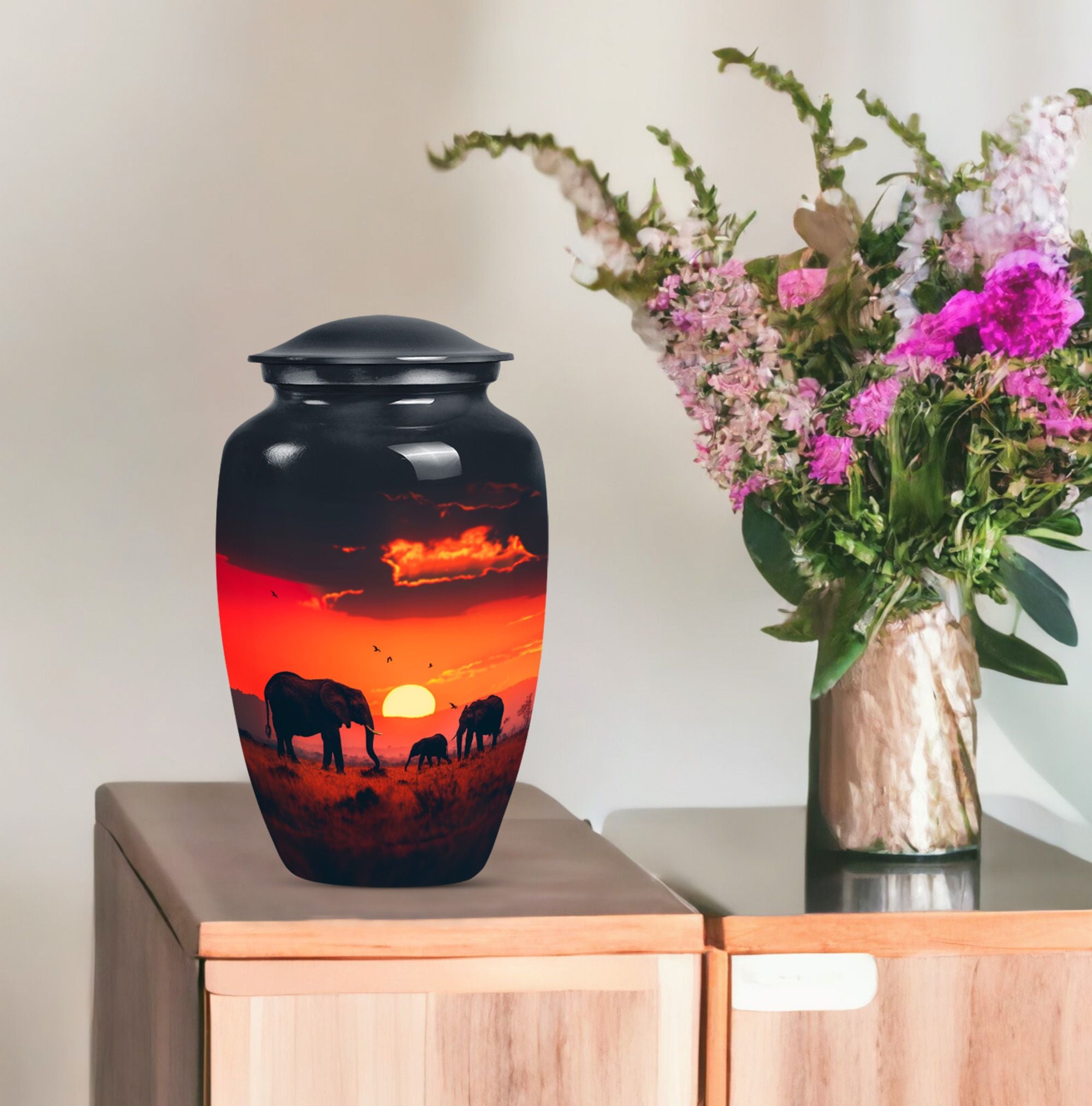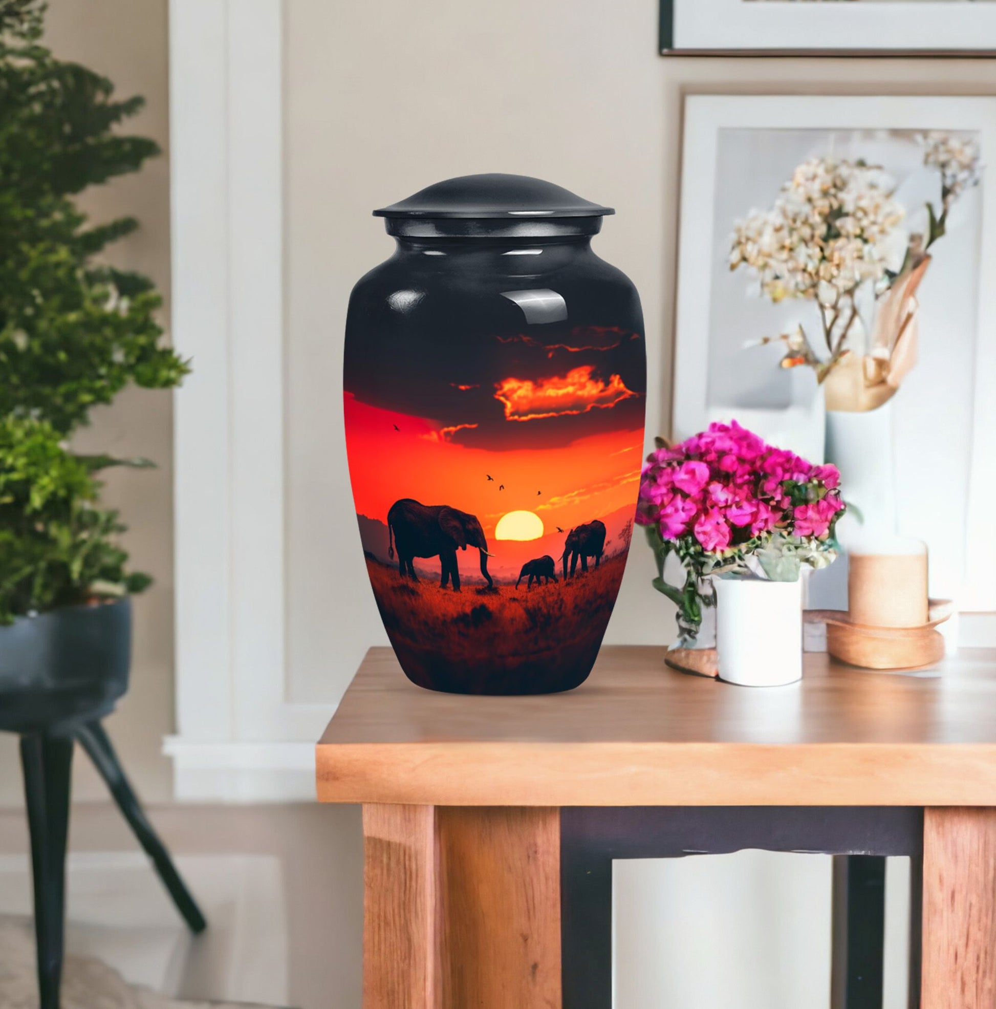 Crafted with care, this large decorative urn features durable aluminium construction with a secure screw-top lid, ensuring the safe keeping of ashes. Its elegant elephant family motif adds a touch of artistry and warmth, making it a standout among large urns for human ashes. The cremation urn large design balances functionality and style, perfect for display at home or in a memorial setting.