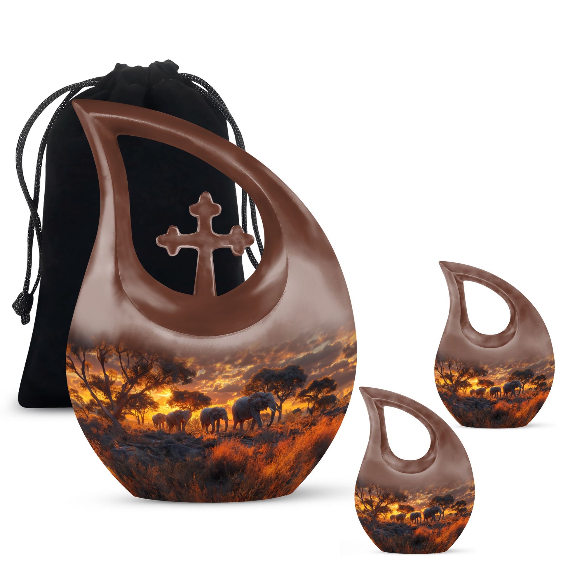 Bring dignity and respect to the celebration of your loved one's life by choosing our Elephant Family Urn. Crafted with precision from sturdy Aluminum, this 10-inch Large Urn is not just a resting place for ashes, but also a beautiful work of art. It features a 'Cross Drop' theme that adds a tranquil and serene touch to your garden. Weighing just 3.3 pounds with dimensions of 10 inches in height, this garden-friendly urn has a capacity of 200 cubic inches. Complement this with a velvet pouch provided for containing the precious ashes securely. Personalize your Elephant Family Urn with engraved names to keep the remembrance alive. Perfect for those in search of Personalized Urns, Garden Urns, or Cremation/Burial Urns for ashes. Always remember that life is a journey and every ending is the start of something beautiful.