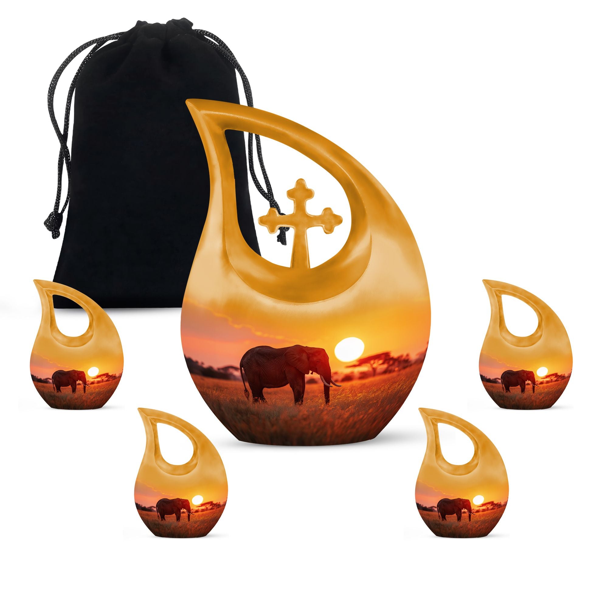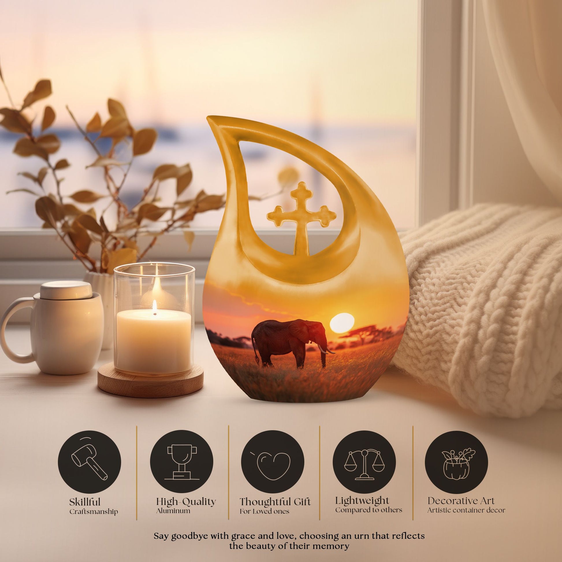 Find solace in our Extra Large Elephant Urn, a dignified and timeless way to preserve the memory of your loved one on a grand scale. This exemplar of memorial urns stands at 10 inches tall, featuring an intricately depicted Elephant theme, symbolizing strength and wisdom. Every detail is lovingly crafted from durable Aluminum, weighing a sturdy 3.3 pounds. The Cross Drop design offers a comforting touch to this resting place, symbolizing faith and hope. With a generous capacity of 200 cubic inches, it is highly suitable for larger individuals or for holding the remains of two individuals who wish to be together in eternity. Along with the urn, you will receive a soft velvet pouch, providing a respectful containment for ashes. For that extra personal touch, you can customize the urn by engraving names on it. This urn isn't just a container, it's a majestic testimony of a life well-lived. Ideal for those searching to Buy Urn or seeking the Best Urns, our Elephant Urn truly stands out in the Metal Urns For Ashes category, perfectly blending elegance with an enduring sentiment.
