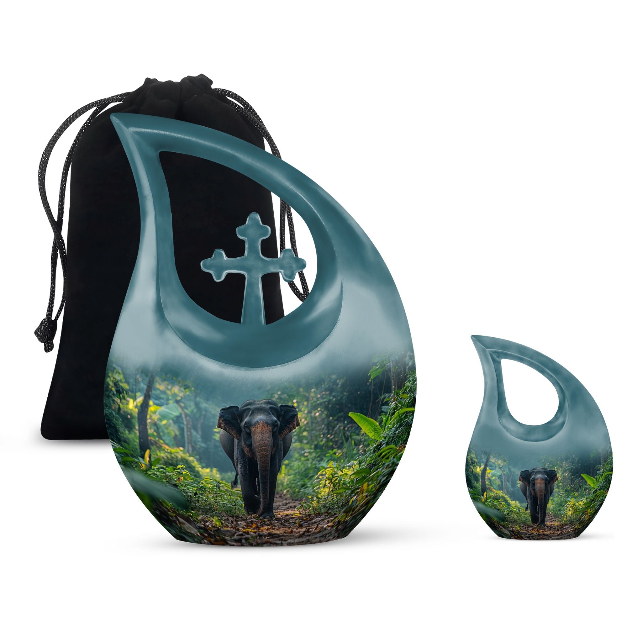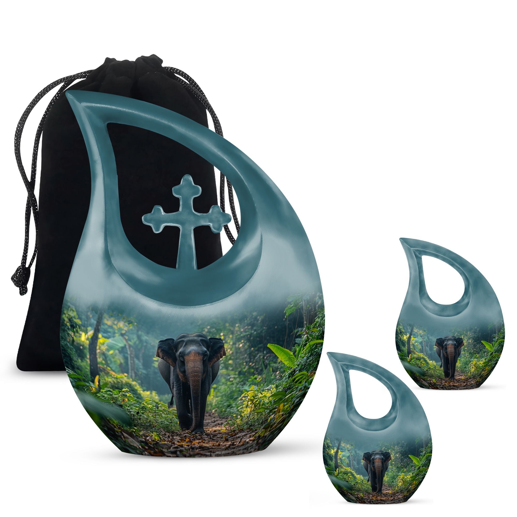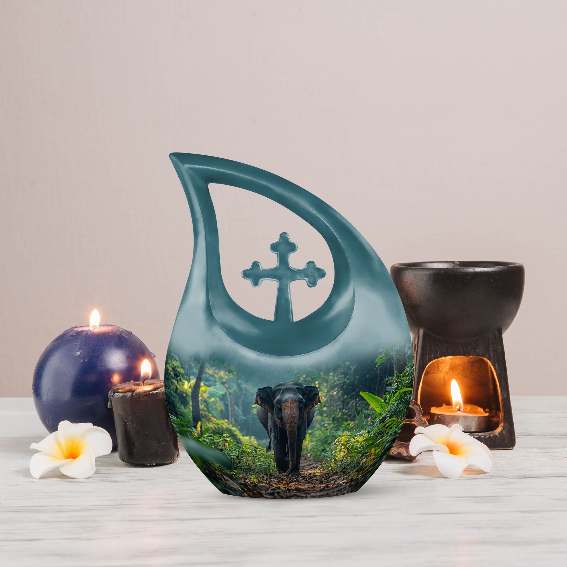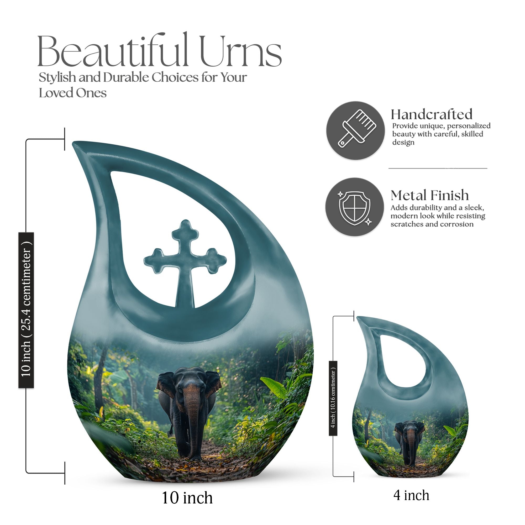 Carrying a blend of striking symbolism and subtle elegance, our Elephant Urn beautifully renders a distinctive tribute to your beloved one. Crafted from high-quality Aluminium, this unique urn for your Dad is tastefully adorned with a gently cascading Cross Drop motif, symbolizing light, divinity, and faith. Sized at a generous 10 inches, it can accommodate up to 200 cubic inches of ashes, making it a fitting choice for large urns category. With a substantial weight of 3.3 pounds, it radiates a reassuring presence. To add a personal touch, use our customization option and engrave names on it. Your purchase comes with a velvet pouch for the dignified containment of ashes. Doubling up as cremation boxes for adults or cremation containers, this large urn for ashes is also ideal for use as funeral urns for adults. Acquaint yourself with the solace one’s presence can continue to bring, even in their physical absence — remember and honour with our Elephant Urn.