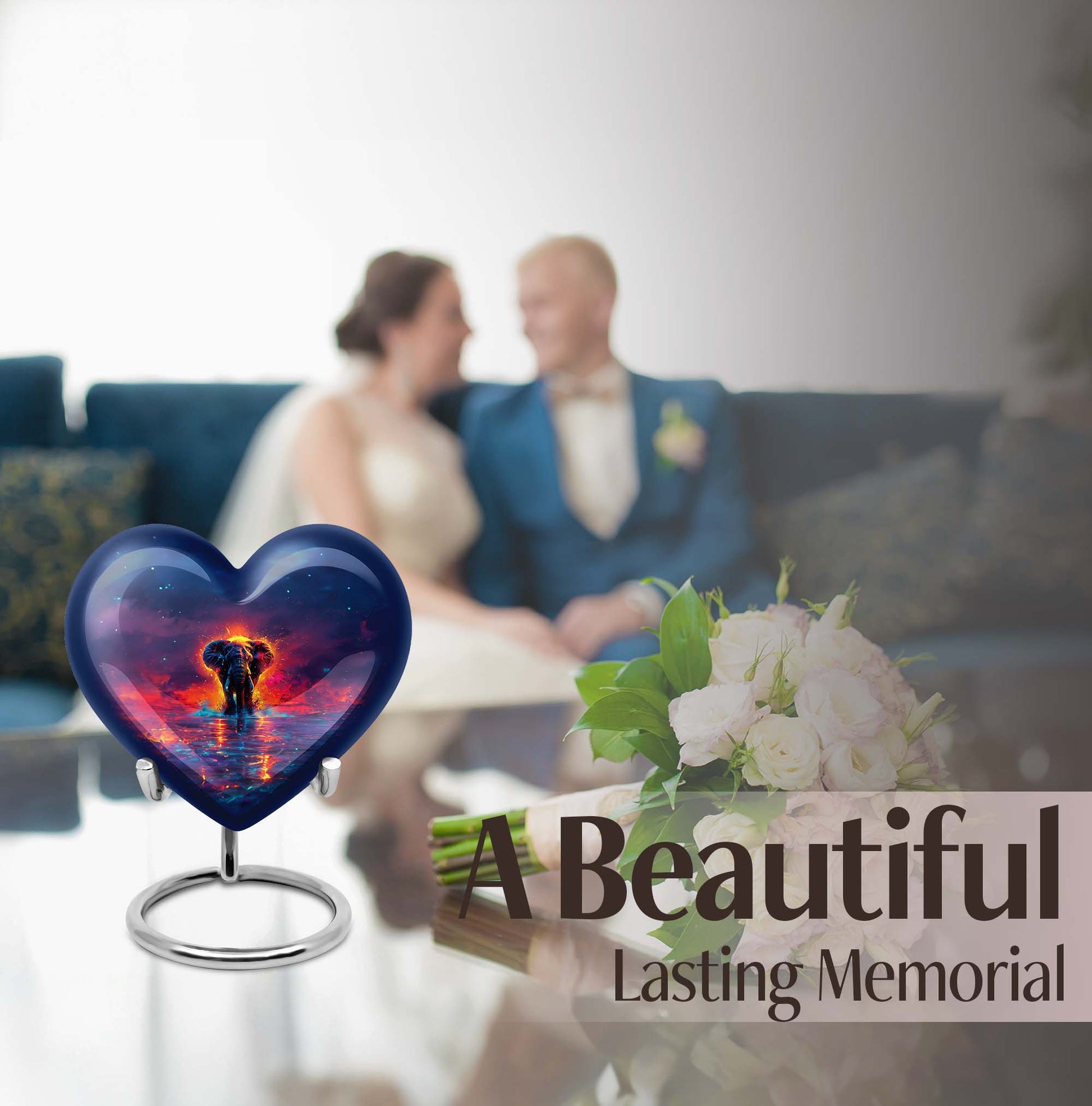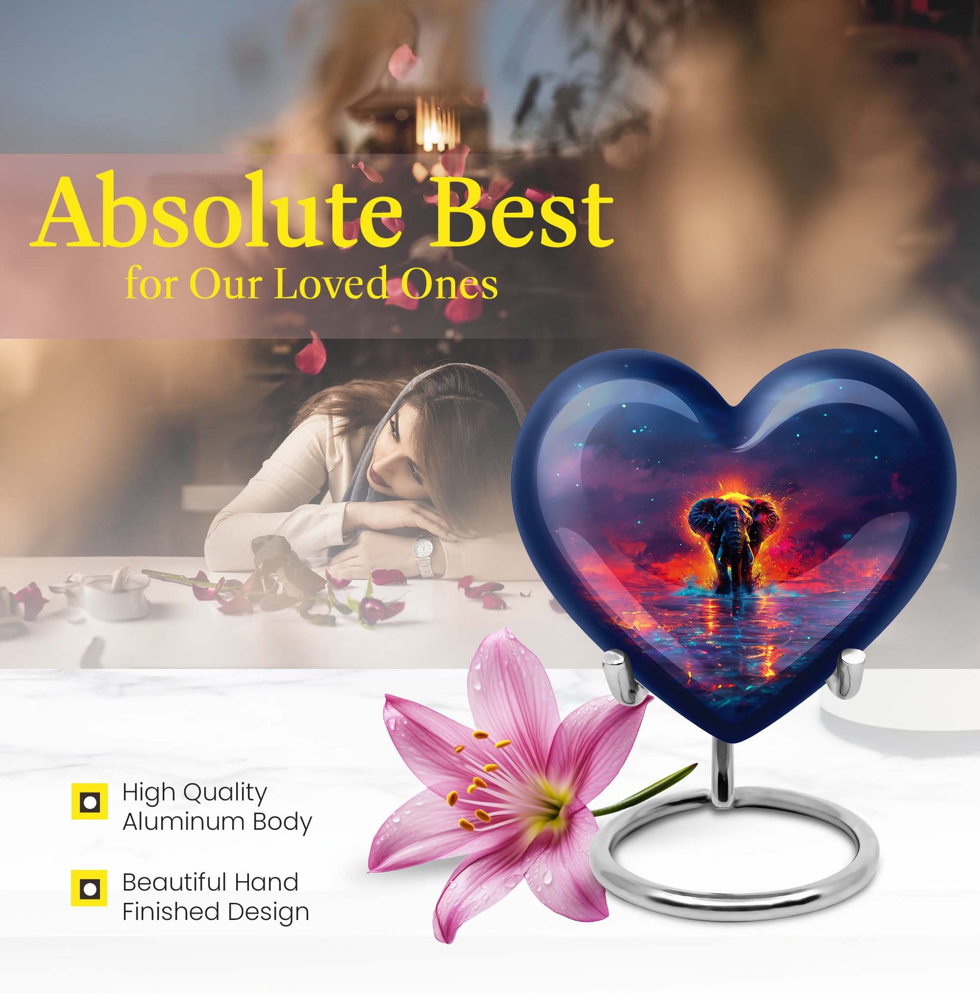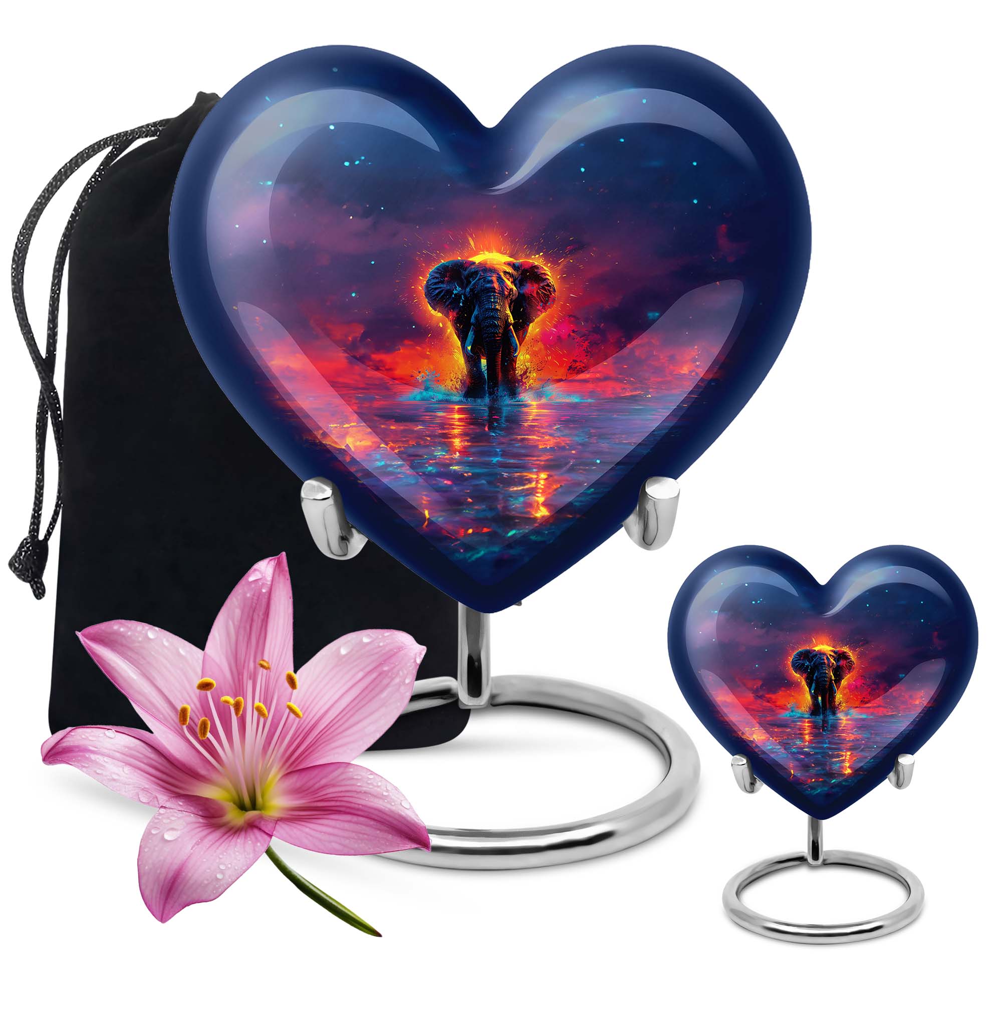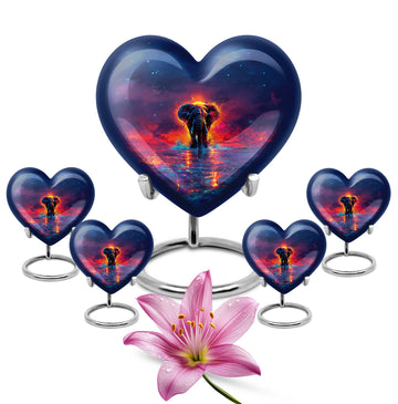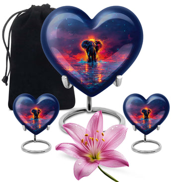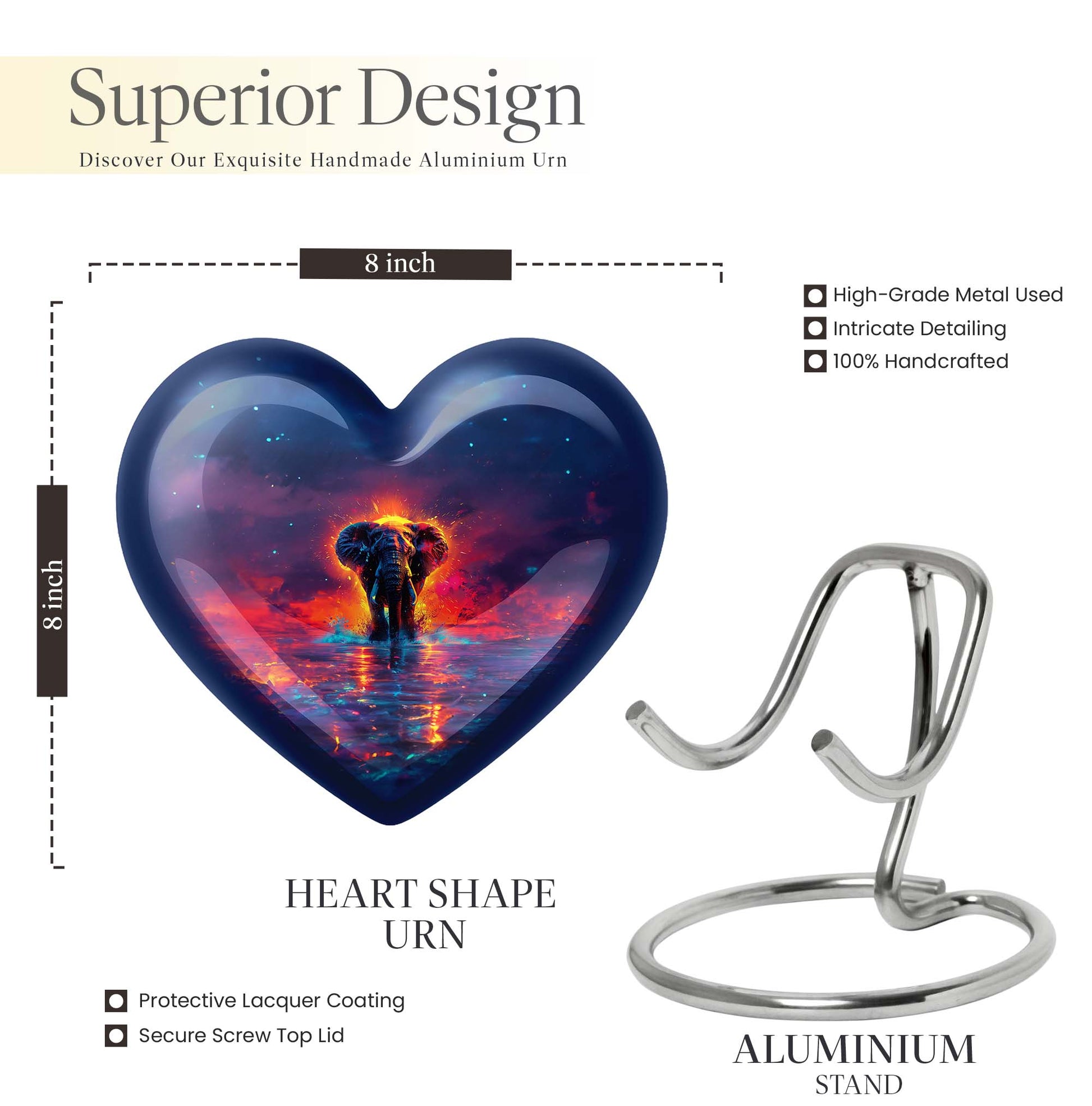 An exquisite memorial piece, this 10-inch Elephant Urn epitomizes care, majesty, and immortal love. Apart from its enduring butterfly theme, this large urn has been meticulously crafted from premium quality aluminum, weighing a sturdy 3.3 pounds. Its dimensions provide 200 cubic inches of space, generously sized to hold adult human ashes. This cremation urn comes with a velvet pouch that creates a tender cocoon for the remains of your loved one. Add an intensely personal touch by engraving names of your choice on this heart-formed urn. This cremation urn is a profound way to cherish and remember your loved ones. Notably, it is a unisex piece, thoughtfully suited to be a memorial urn for men and women alike. The beautiful shape and theme make it more than a resting place for ashes; it's a majestic tribute art piece to the departed. Packed with emotional depth and specifically geared towards seniors' aesthetic preferences, this urn offers unique comfort during heart-rendering moments of loss. Filled with a symbolic representation of eternal love, this Elephant Urn is an extraordinary testimony to a life well-lived and loved. Keep your memories present and spiritual connection alive with this remarkable urn.