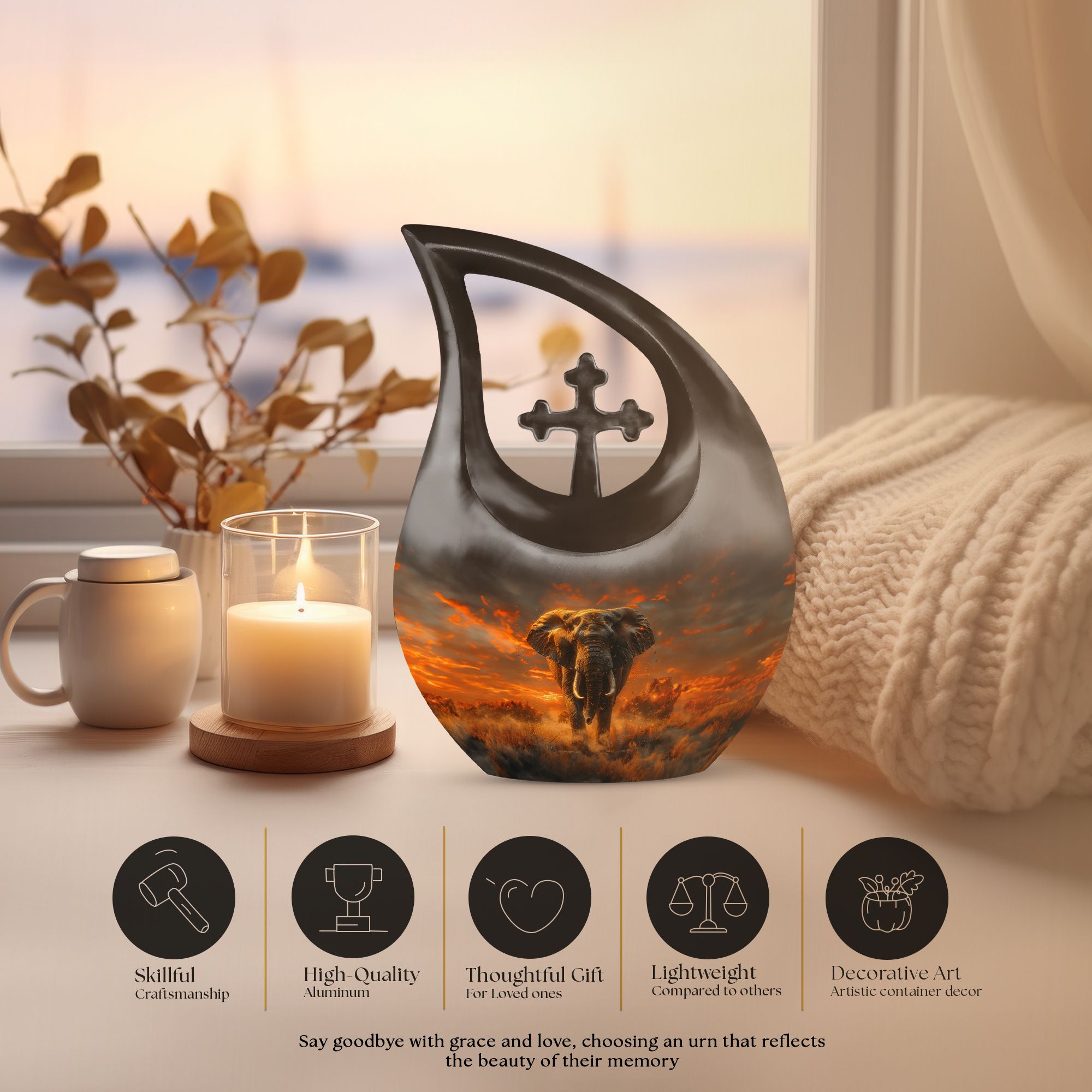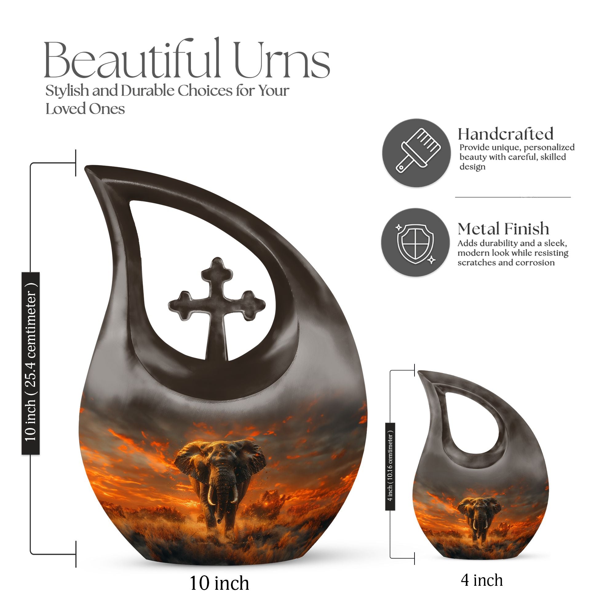 Cherish the memory of your loved one with our large 'Elephant Urn,' thoughtfully chosen from our Urns for Angels collection. The urn's captivating 'Cross Drop' theme exemplifies strength and respect, ideal for a peaceful and dignified resting place. Beautifully fashioned with strong and resilient aluminium, the piece exhibits exquisite craftsmanship. Its dimension stands regal at 10 inches, possessing a capacity of 200 cubic inches, suitable for human ashes. The urn weighs 3.3 pounds, symbolic of the solid, enduring love and memories it encapsulates. A velvet pouch is provided for careful containment of the ashes. Furthermore, our urn allows for customization, offering an opportunity to personalize its appearance with engraved names, reflecting a tribute that's uniquely yours. Incorporate this blend of functional and aesthetic appeal in your memorial tribute with our modern urns, either as a burial urn or a remembrance urn for ashes. Let this well-crafted piece in your memorabilia bring solace and celebrate love beyond life.