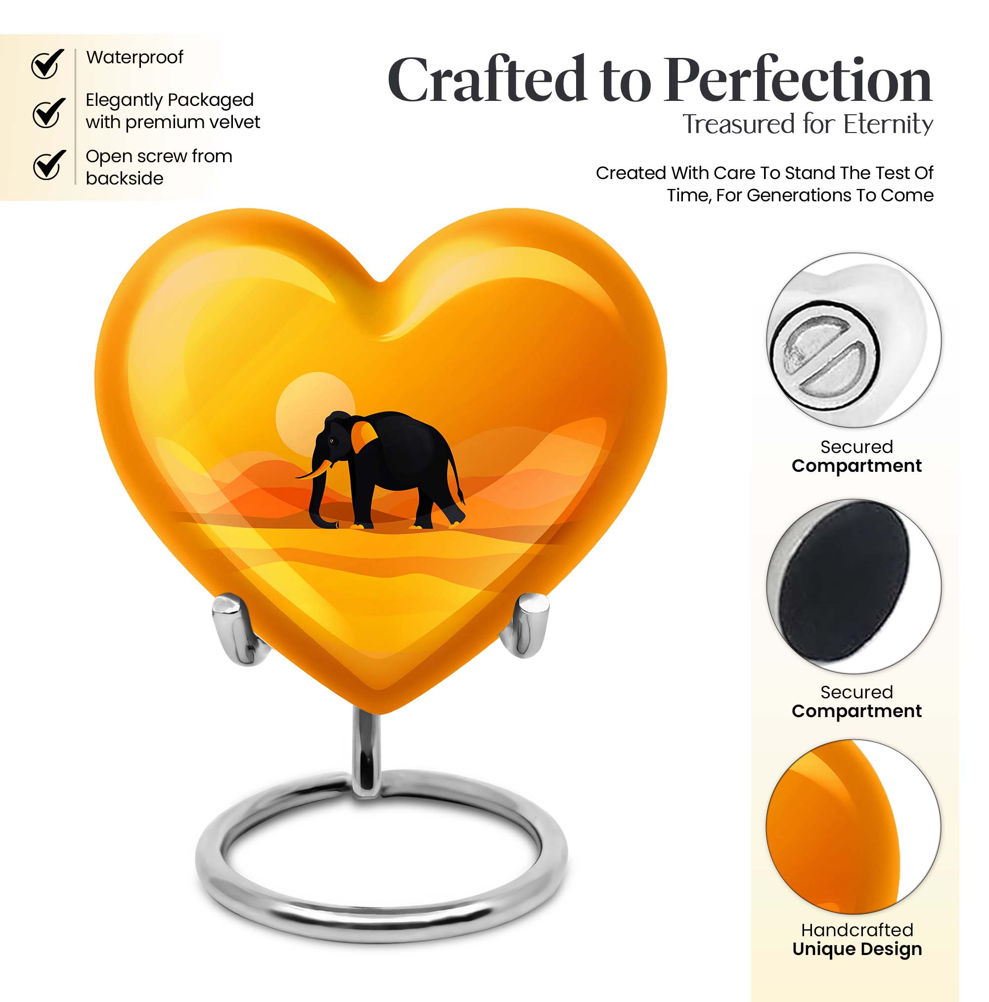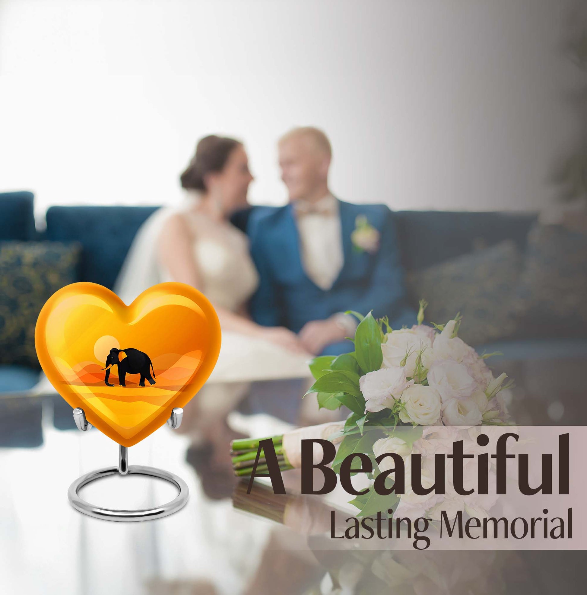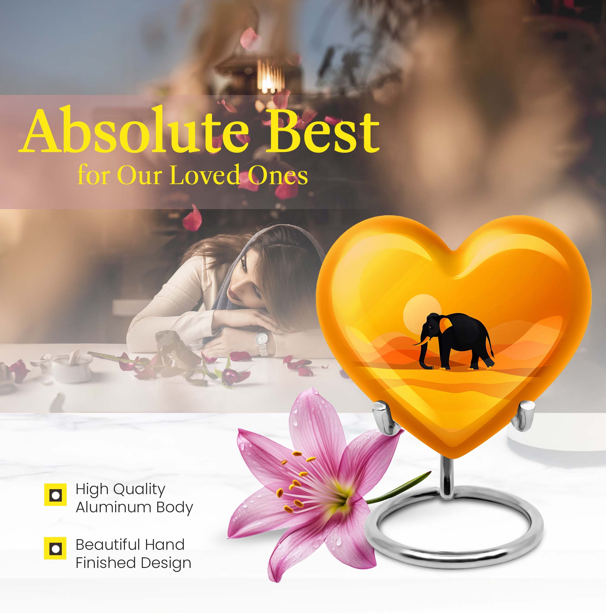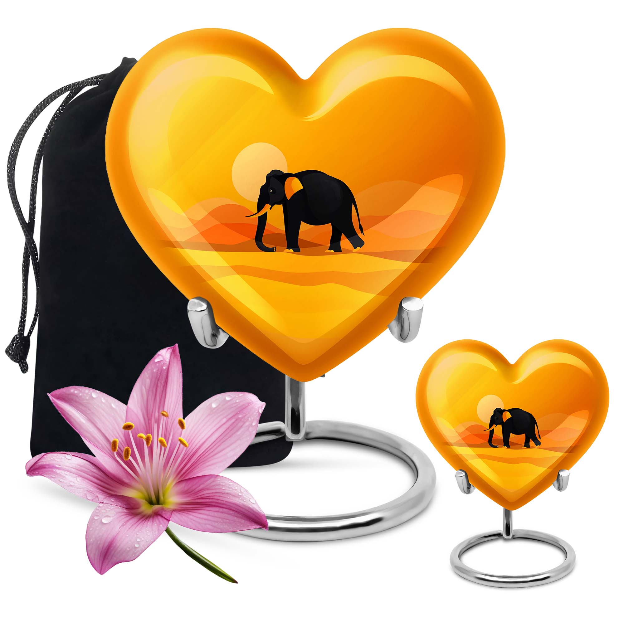 Introducing our unique and exquisite Elephant Urn, a large memorial ash urn specifically designed with seniors in mind. This one-of-a-kind 10-inch Aluminium urn weighs a comfortable 3.3 pounds and has the capacity to securely hold up to 200 cubic inches of ashes. Touching upon the theme of Flowers, it showcases the beloved Heart Urn design. This piece of memorial ceremony supply offers personalization options, allowing you to engrave the names of your departed loved ones, making it even more treasured. This memorial urn is thoughtfully packaged in a soft velvet pouch, ensuring secure containment of the ashes. It is not just an urn, but a heartfelt tribute that embodies love, memories, and respect. Best suited for those needing funeral urns for men's ashes, as well as anyone drawn towards elegant memorial urns, this piece offers a tasteful way to honor and commemorate your loved ones.