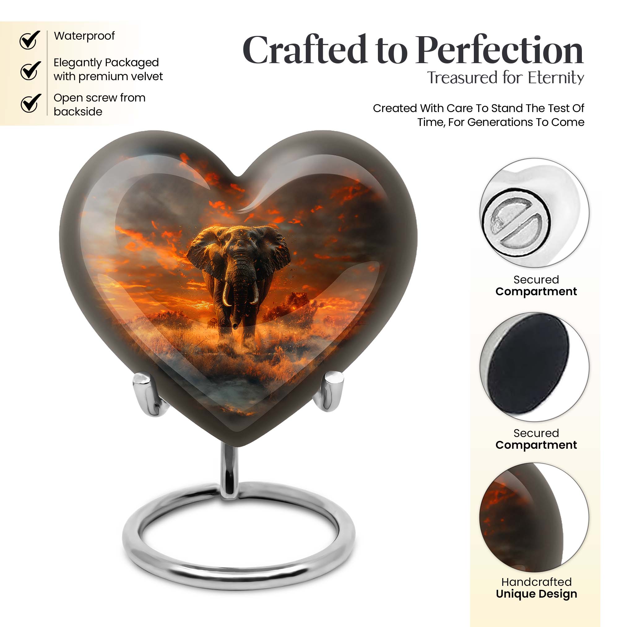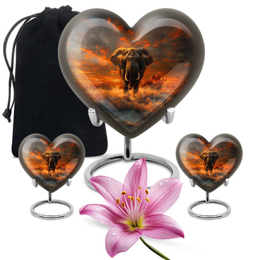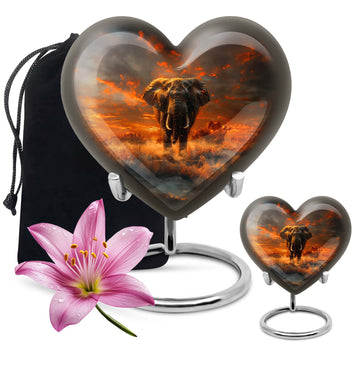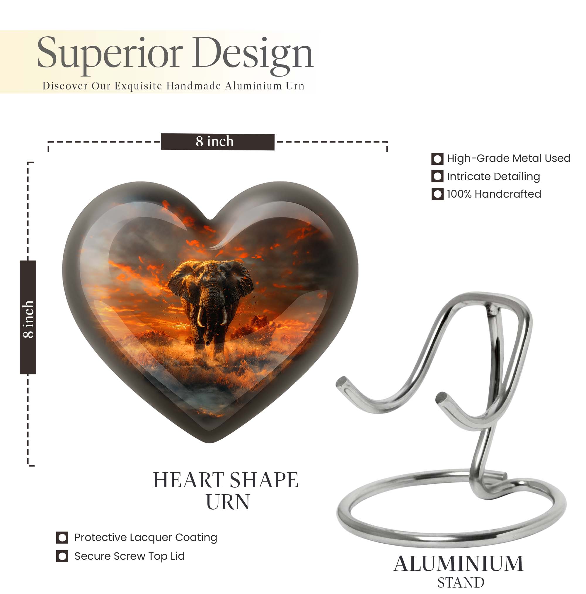 A cherished symbol of rest, this large-sized 'Heart Urn' is more than a resting place for your loved one, it’s a beautiful piece of art. Crafted from sturdy aluminum with an intricate floral theme, this urn serves as a heart-touching tribute. Standing at a substantial 10 inches in height and accommodating an impressive 200 cubic inches in capacity, it's exceptionally suited to serve as a memorial urn for human ashes. Weighing a sturdy 3.3 pounds, the urn adds gravitas to your memorial display. The touching homage extends to a beautiful velvet pouch that elegantly contains the ashes. For an intimate touch, the urn also allows for personalization. Engrave it with the dearly departed's name to create a unique testament to their life. Perfectly fitting keywords to search for this product include 'elephant urn', 'funeral adult urns for human ashes', 'memorial forever urns', 'urn human women', 'urns for mom', and 'funeral urns for ashes'. Honor your loved one's memory - choose our Heart Urn today.