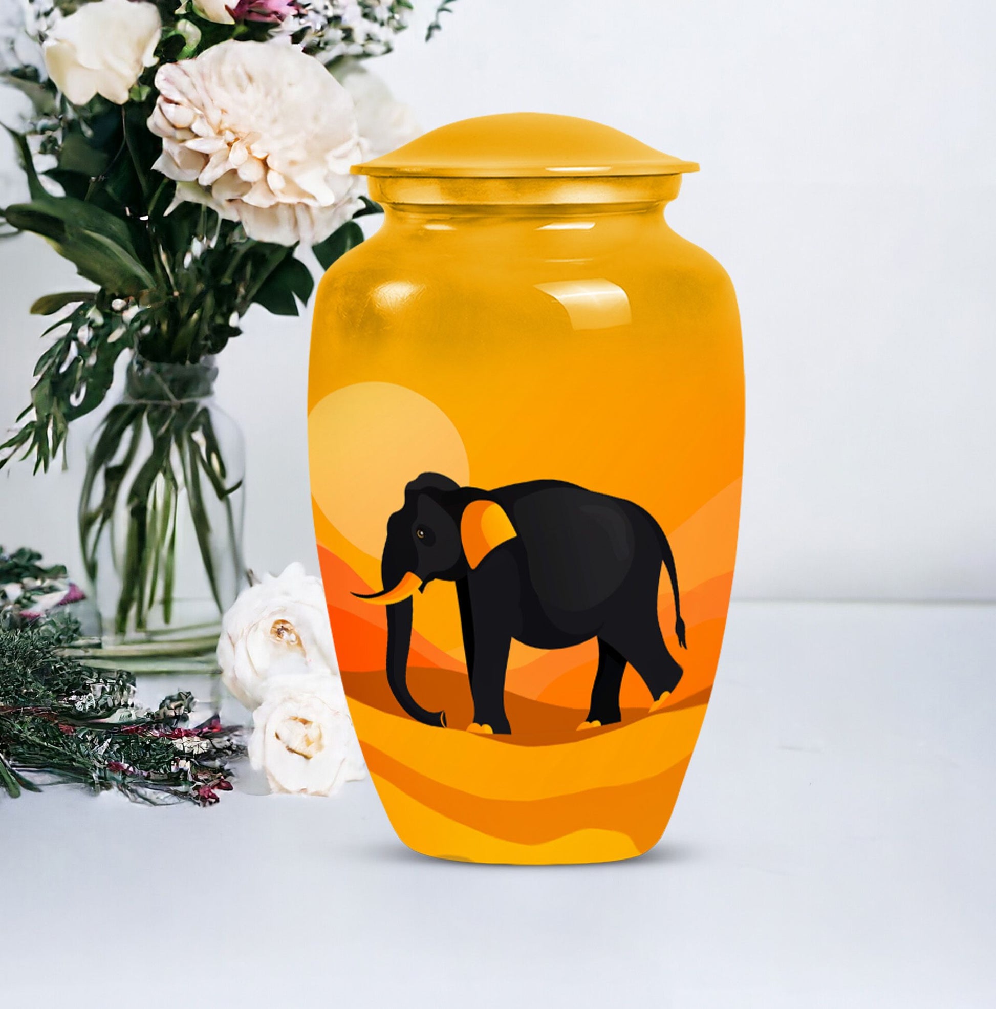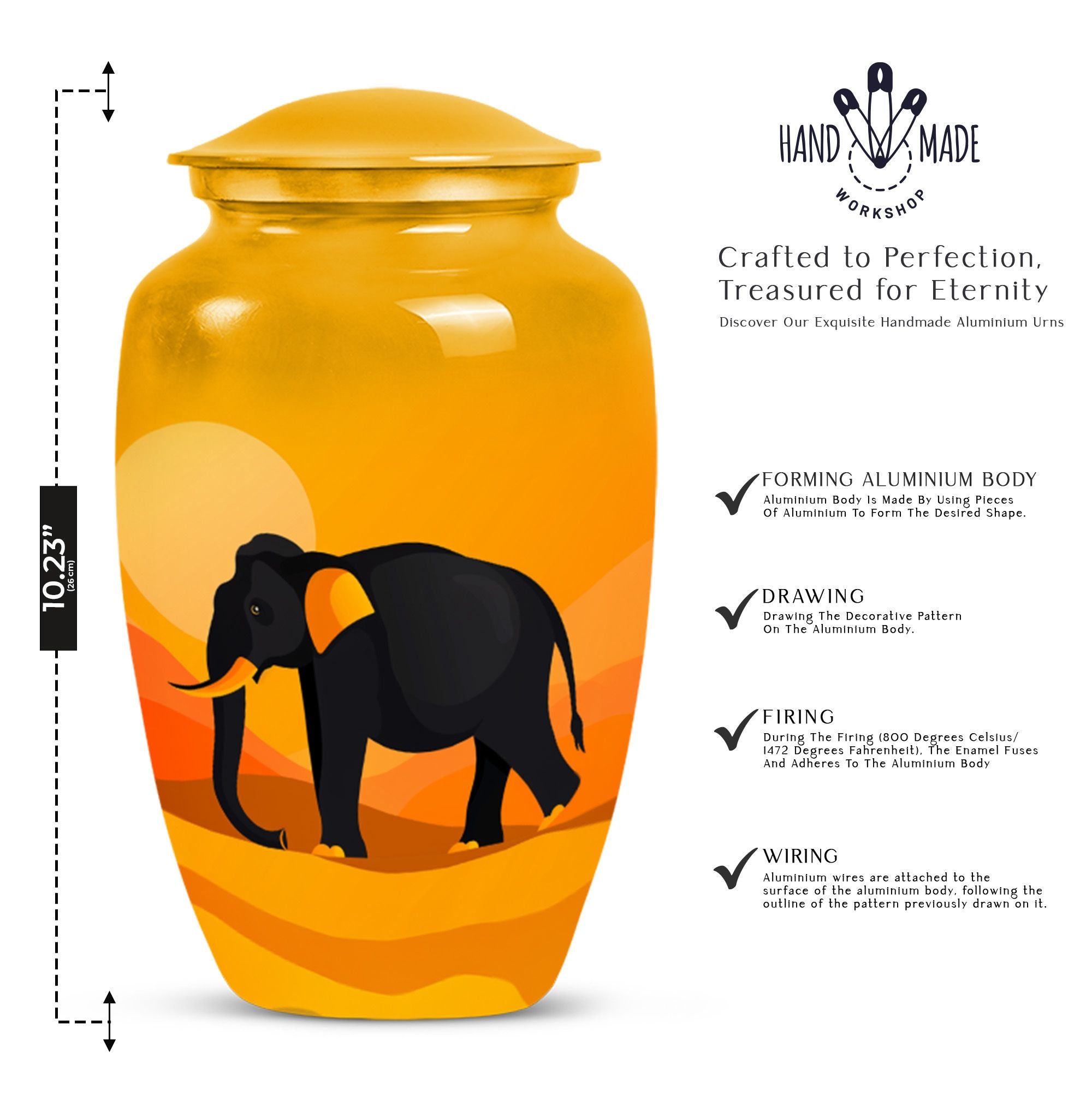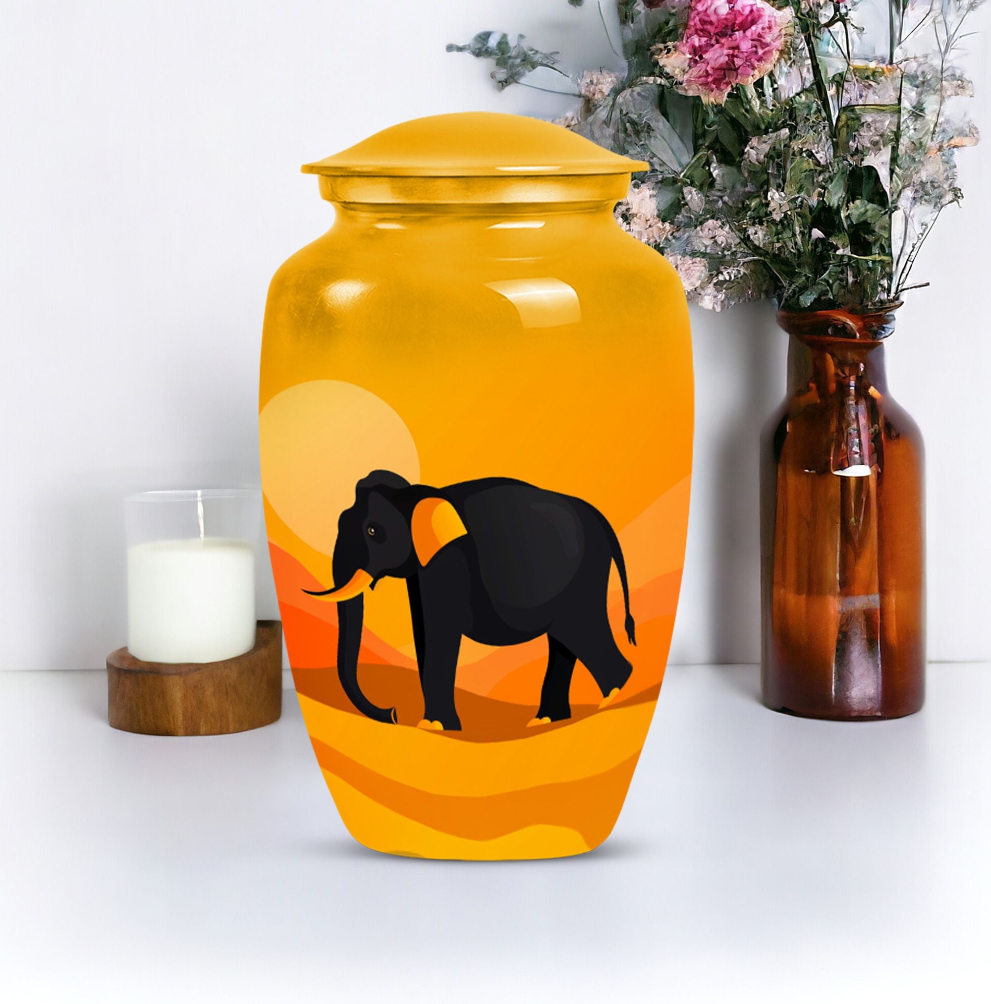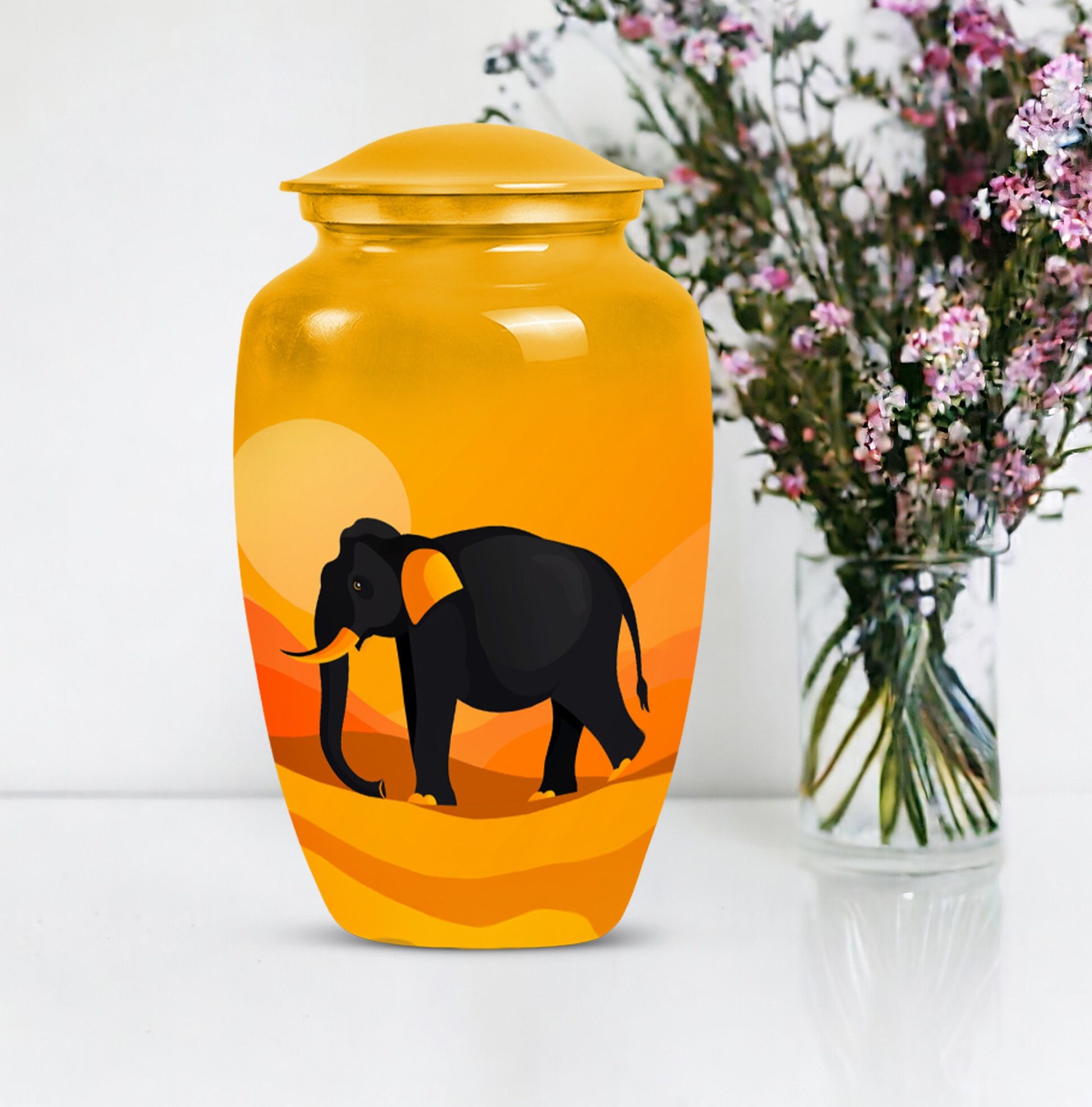 Experience comfort and peace during your memorial ceremonies with our meticulously crafted 10-inch Elephant Urn. This urn, bearing floral designs and a classic touch, captures the tranquility often sought during these emotional times. Fabricated from sturdy aluminium, the urn is sizable enough, with a capacity of 200 cubic inches, to safely contain adult ashes. Weighing 3.3 pounds, it offers a substantial presence, promising longevity and perpetual remembrance. It's more than just a memorial ash urn, it's a cherished keepsake. The urn is also customizable, giving you the liberty to inscribe engraved names, adding an even more personal touch. Our Elephant Urn also comes with a velvet pouch, ensuring the contained ashes are well protected. From elegant urns to funeral urns for men, we make sure to tenderly fuse sentiment and remembrance in every detail. Using uncommon phrases like 'elephant urn' can help your search stand out in this category. Please note, design is not a definable feature of this product.