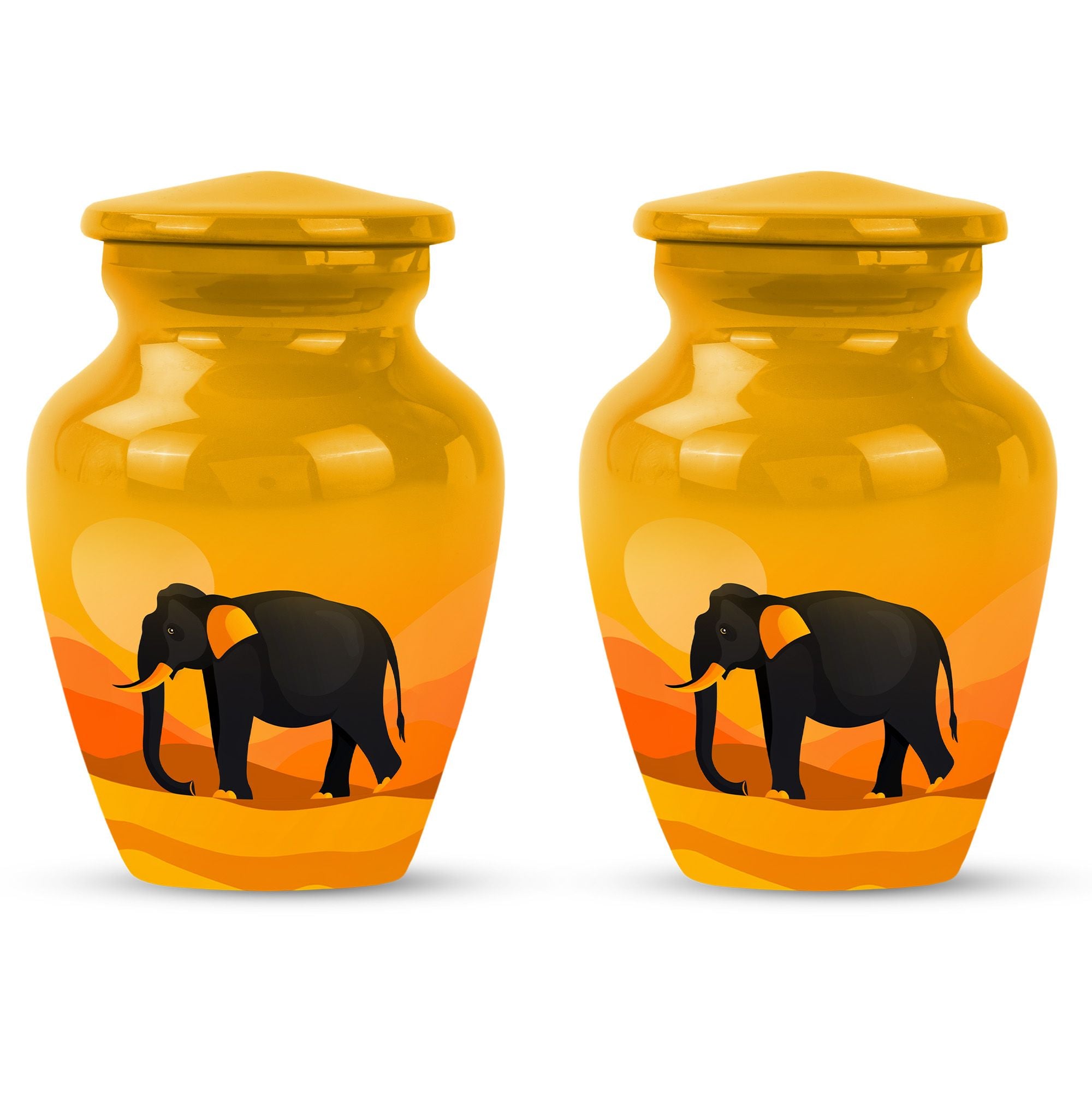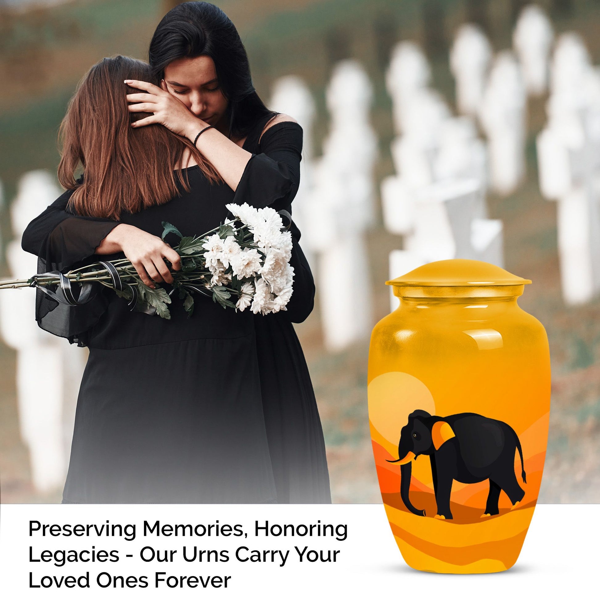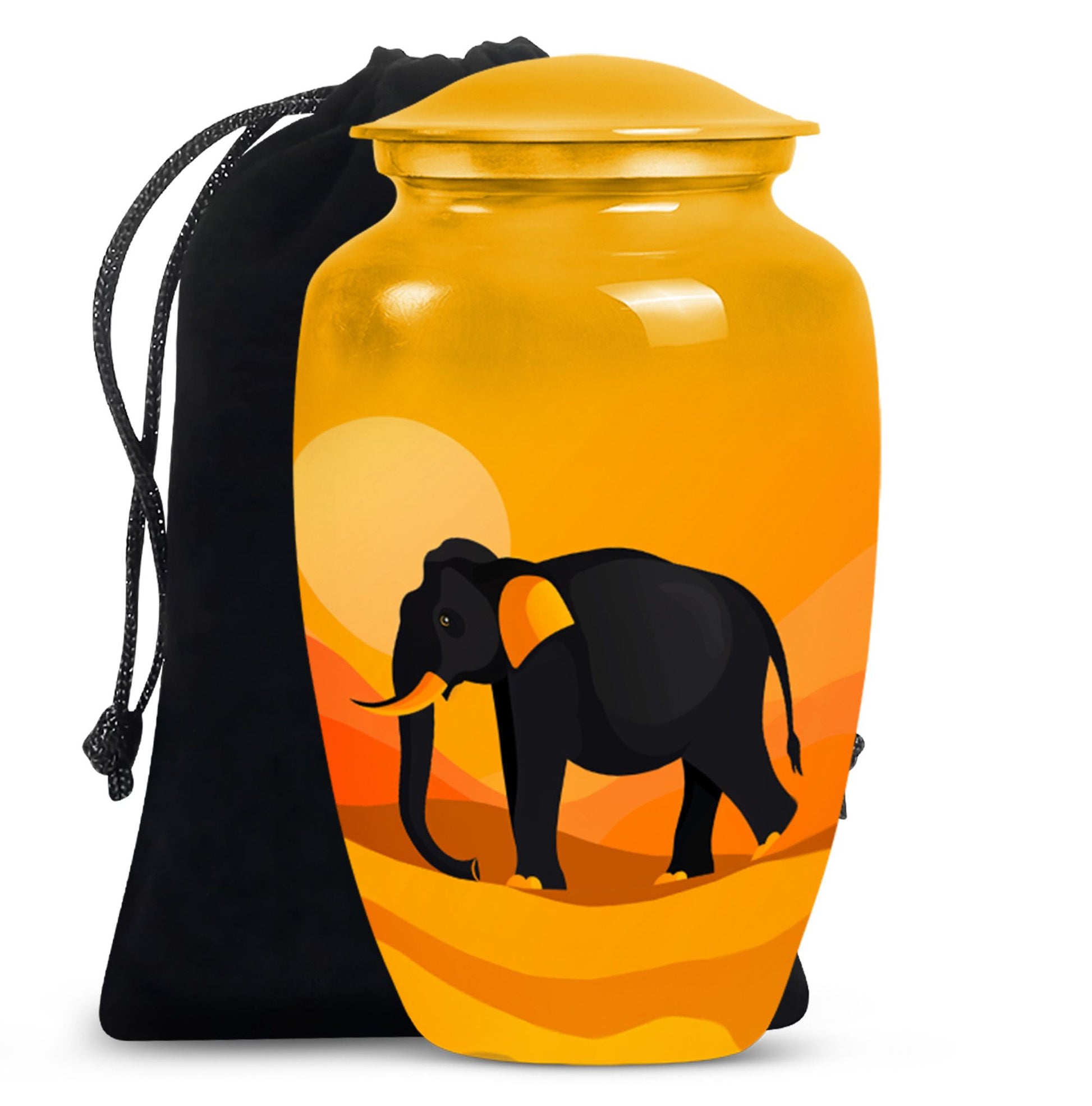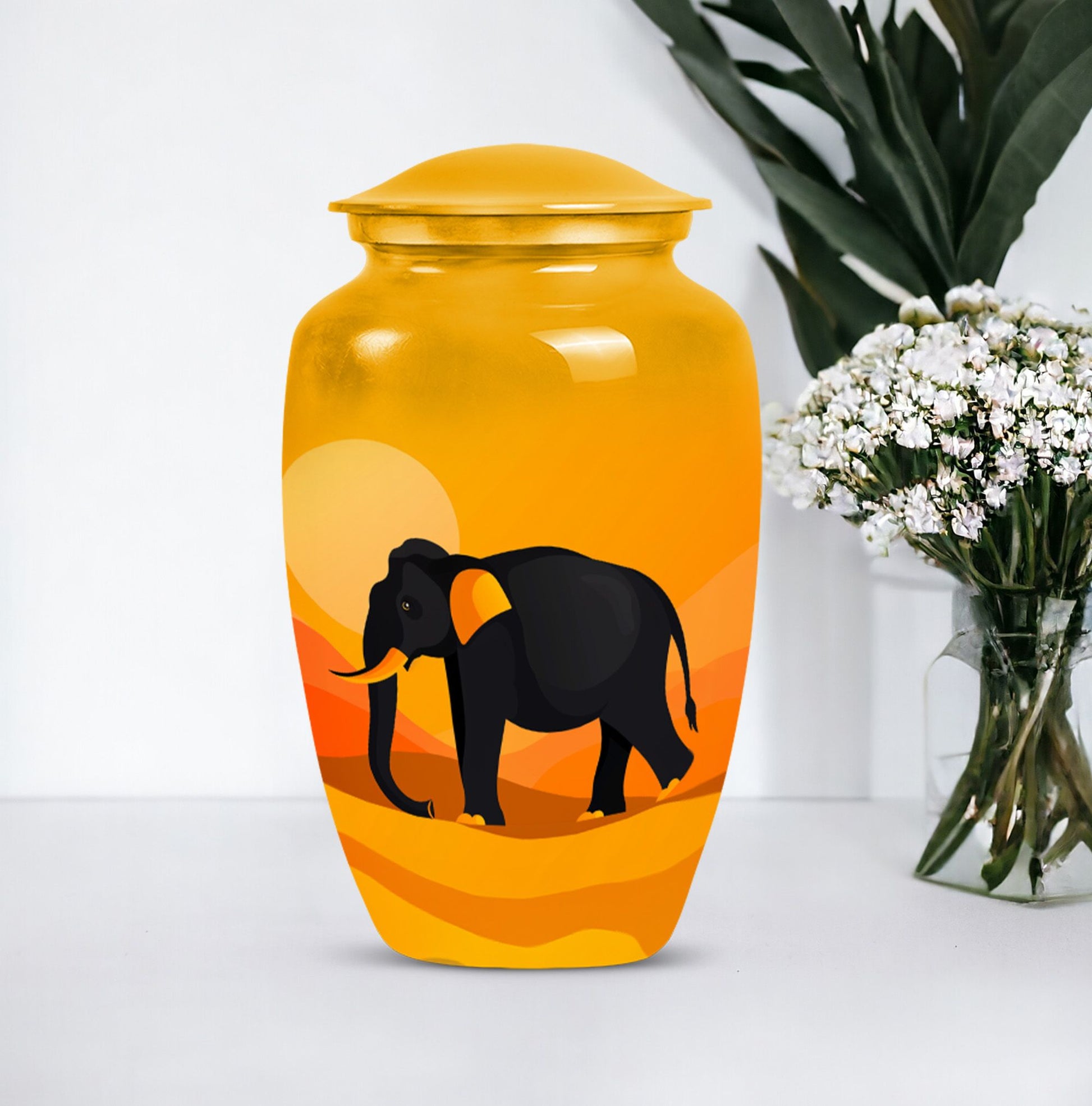 Experience comfort and peace during your memorial ceremonies with our meticulously crafted 10-inch Elephant Urn. This urn, bearing floral designs and a classic touch, captures the tranquility often sought during these emotional times. Fabricated from sturdy aluminium, the urn is sizable enough, with a capacity of 200 cubic inches, to safely contain adult ashes. Weighing 3.3 pounds, it offers a substantial presence, promising longevity and perpetual remembrance. It's more than just a memorial ash urn, it's a cherished keepsake. The urn is also customizable, giving you the liberty to inscribe engraved names, adding an even more personal touch. Our Elephant Urn also comes with a velvet pouch, ensuring the contained ashes are well protected. From elegant urns to funeral urns for men, we make sure to tenderly fuse sentiment and remembrance in every detail. Using uncommon phrases like 'elephant urn' can help your search stand out in this category. Please note, design is not a definable feature of this product.