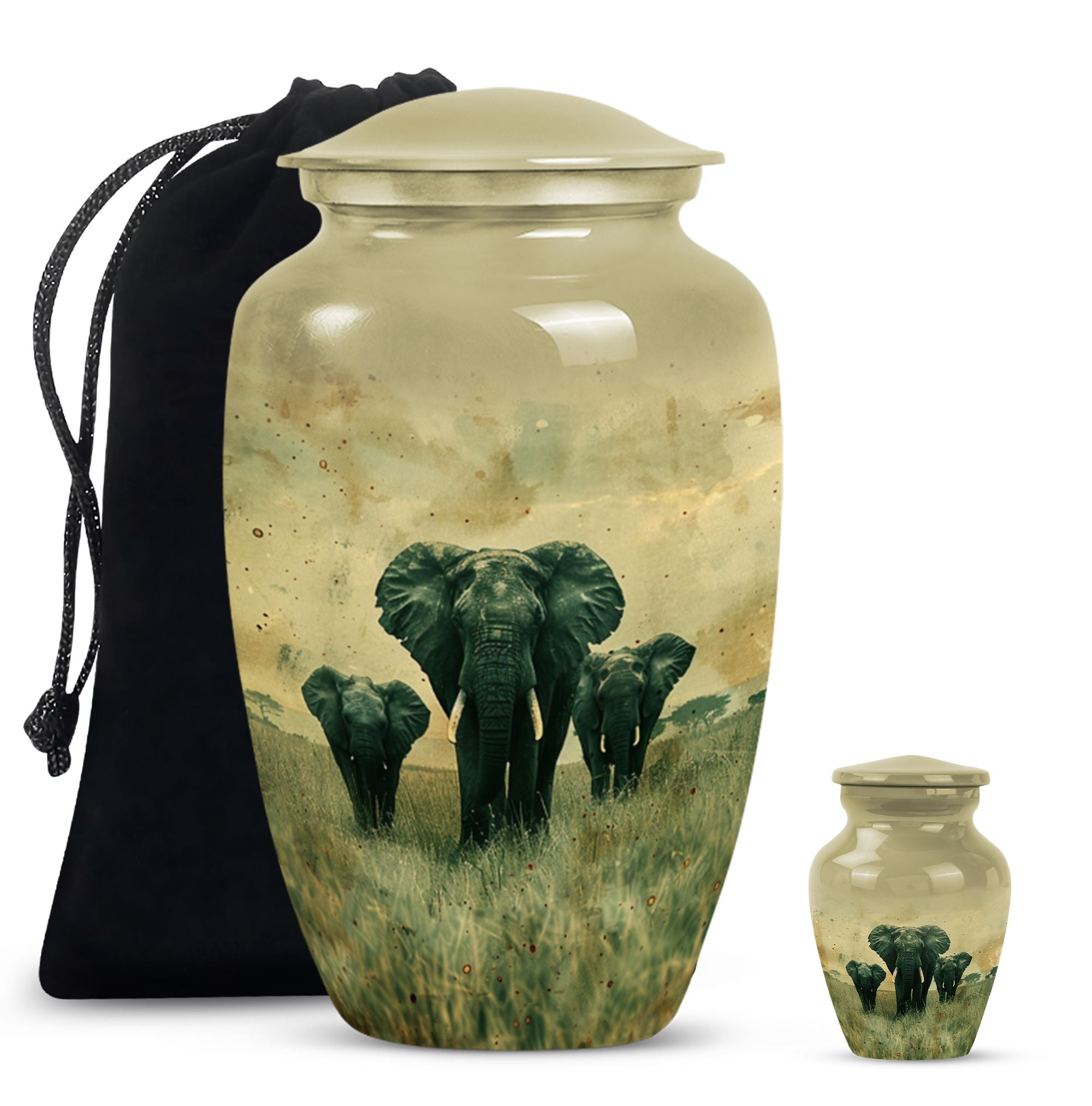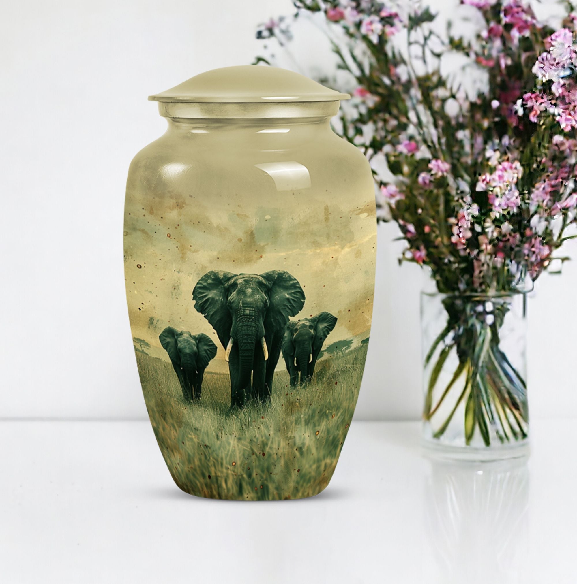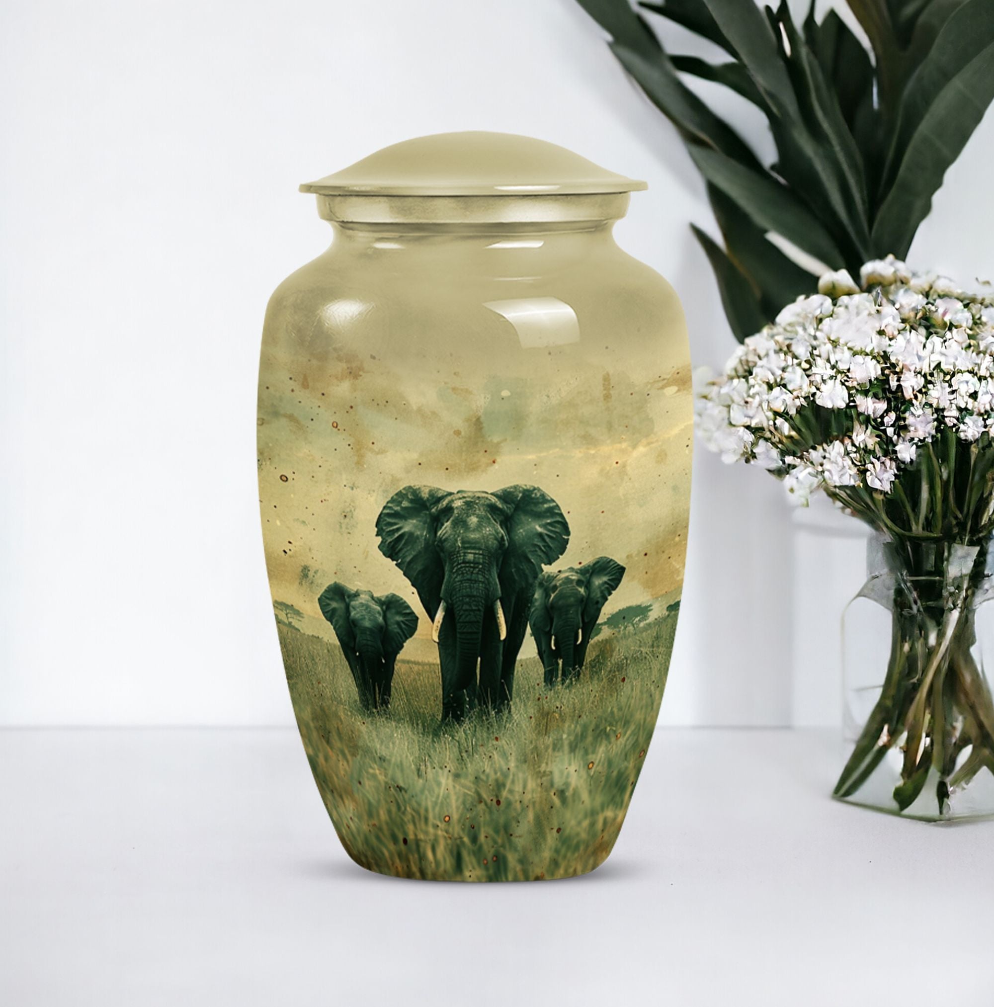 Introducing our beautifully detailed, customisable Elephant Urn - the perfect resting place for your beloveds, designed meticulously for all genders. This sizeable 10-inch cremation urn, weighing a solid 3.3 pounds, is skillfully crafted from sturdy aluminium for lasting durability. The Elephant Urn warmly encapsulates the ashes in a capacity of 200 cubic inches. Pay your respects with the smooth yet rich butterfly theme that adorns the surface. The aluminium urn comes with a velvet pouch for secure containment of ashes. Make the memorial even more special by personalizing it with engraved names, adding a tender touch to your commemoration. This urn is not just for cremation ashes, it can serve as a beautiful decorative urn to keep in your home. Irrespective of whether you're looking for urns for an adult male or a memorable urn for mom, this large urn seamlessly blends function, sentiment, and design.