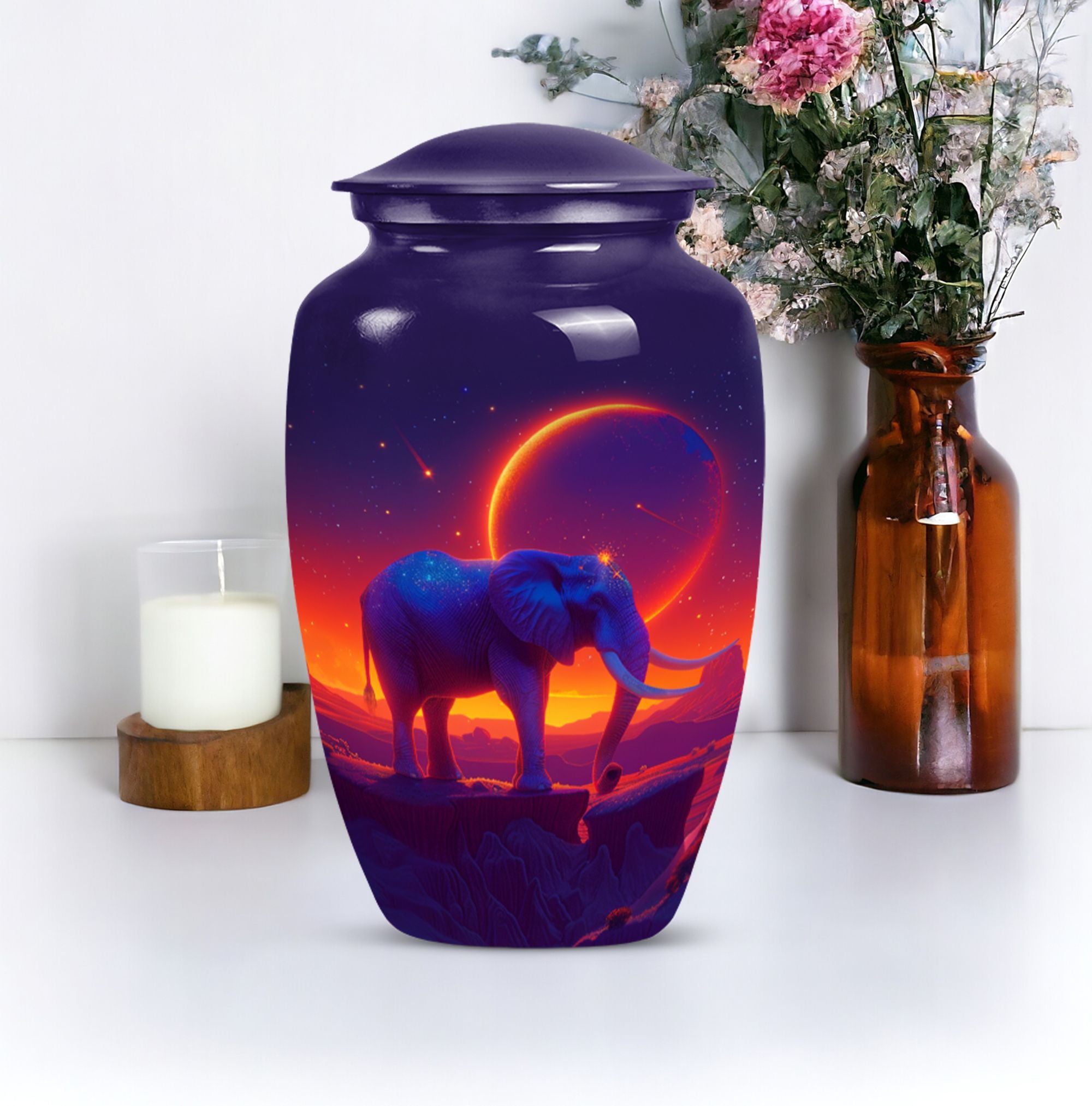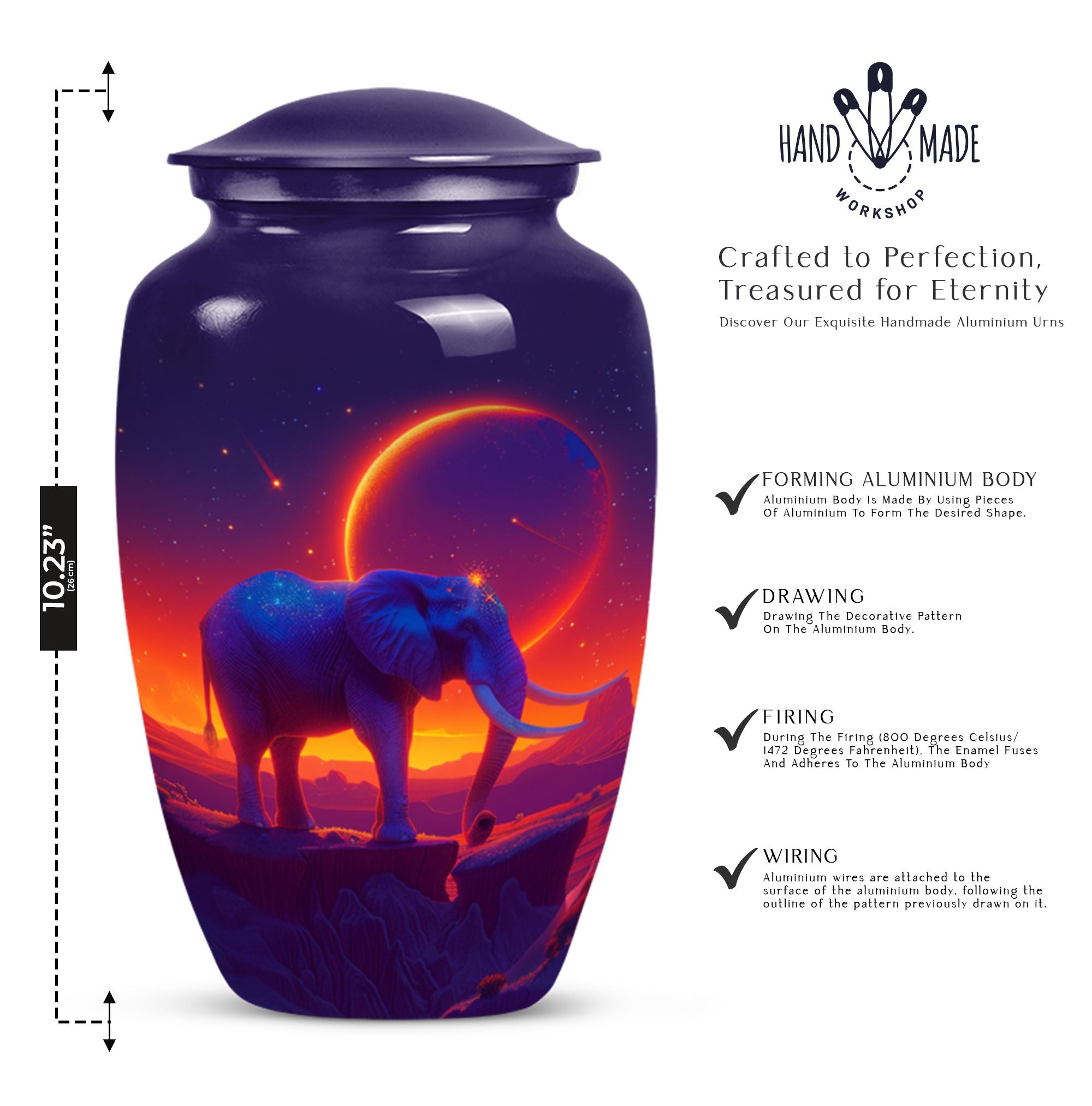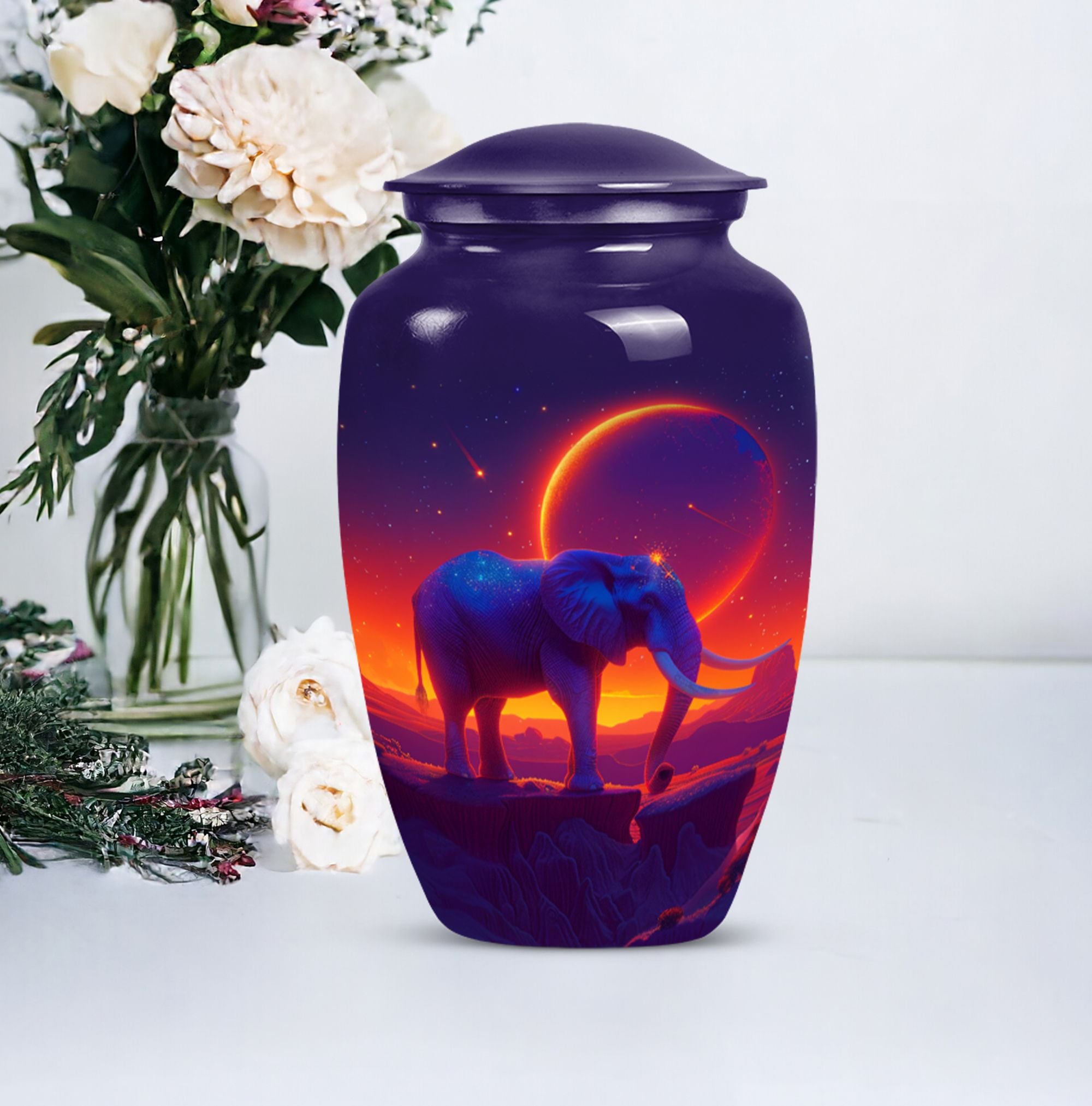 Treasure the memory of lost loved ones with the Classic Elephant Urn - a towering testament of love and respect. Standing tall at 10 inches with a weight of 3.3 pounds, this large memorial urn combines the robust character of high-quality Aluminium with a graceful Butterfly theme elegantly placed on its surface. It offers an ample capacity of 200 cubic inches, ensuring a worthy containment for the ashes of male adults. This significant symbol of remembrance comes with a plush velvet pouch to provide an extra layer of protection. Offer your respect and devotion with a personalized touch by engraving names onto the urn. Varied in its appeal, it makes for a perfect memorial element not only for male adults but can also be used as a female urn. Large in stature, it could be shared as a companion urn for two adults as well. The Classic Elephant Urn is a beautiful synergy of strength and delicacy - a true homage to those loved and missed.