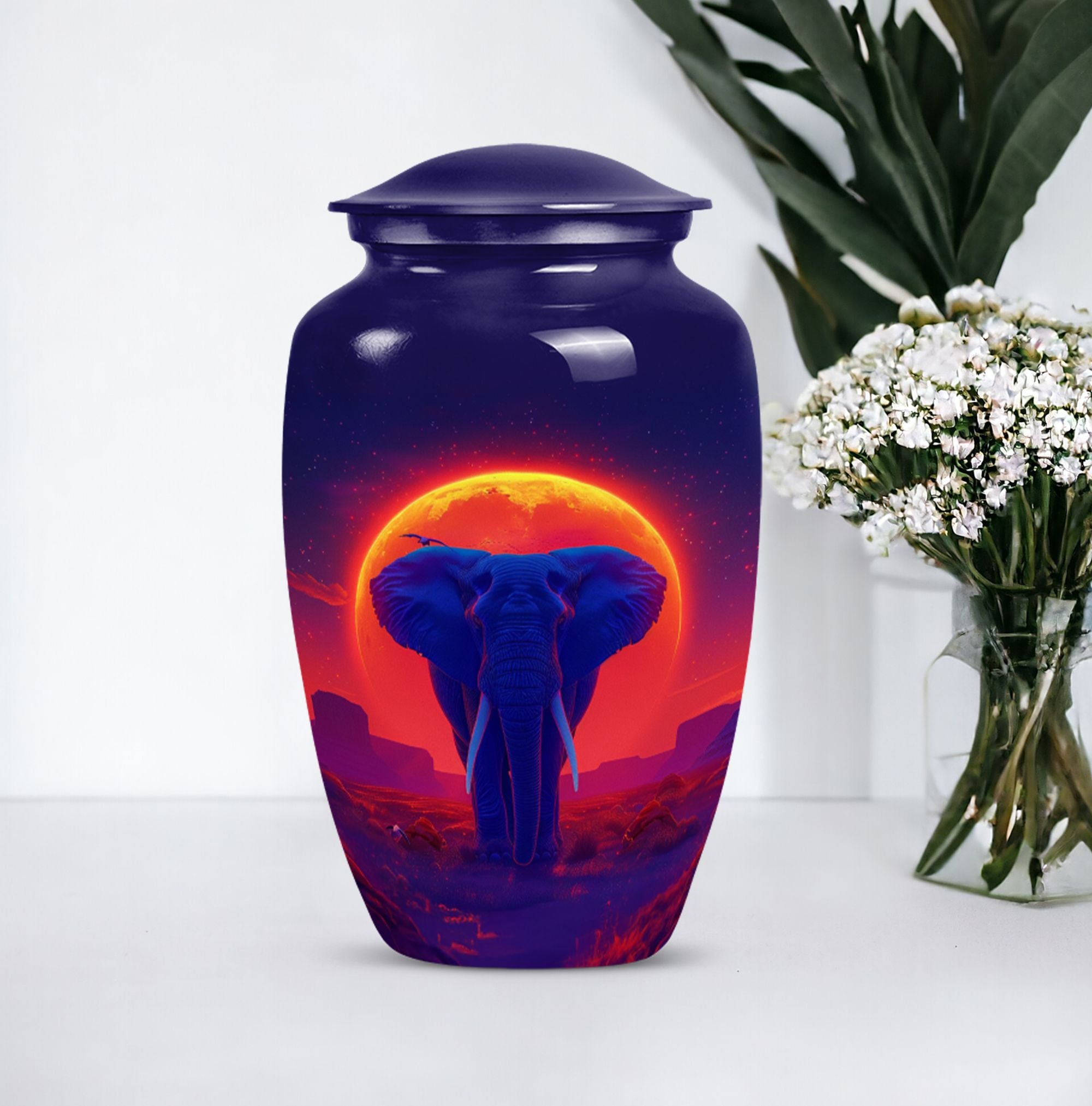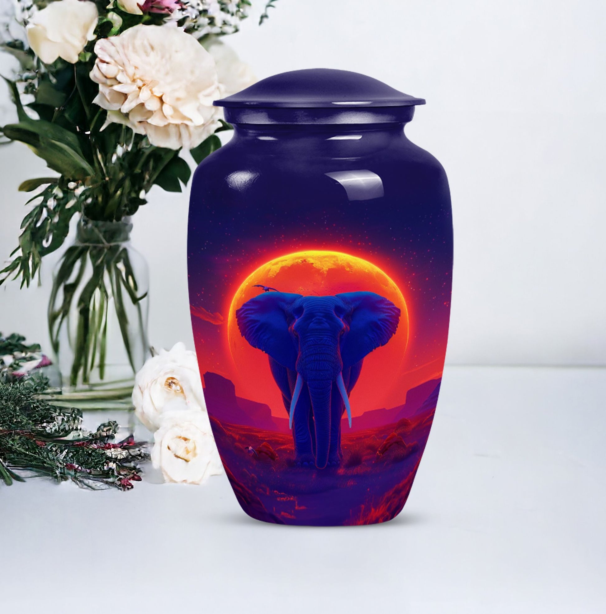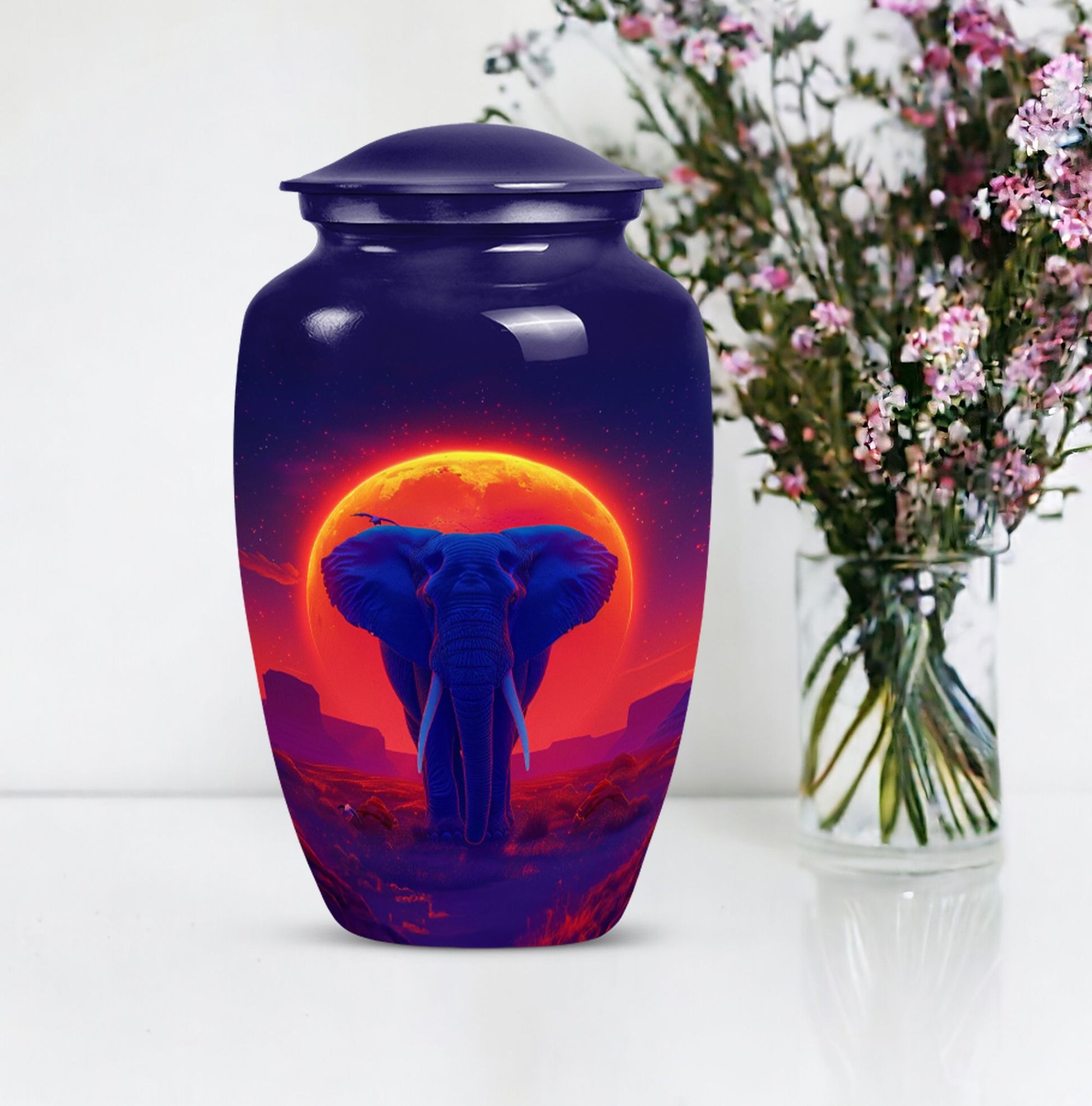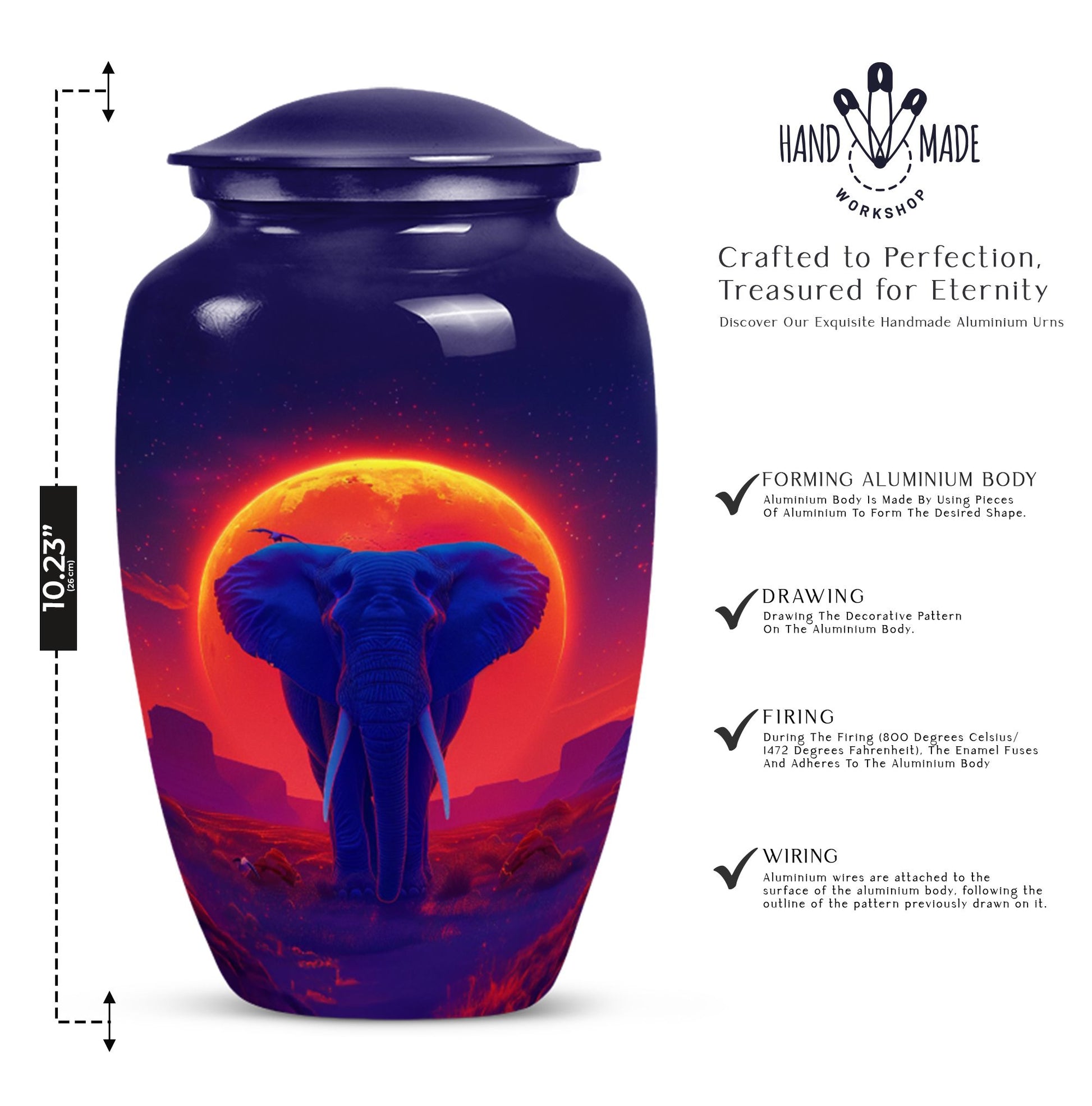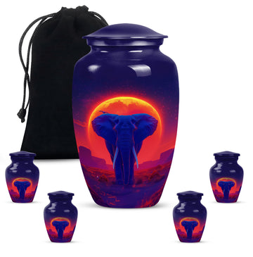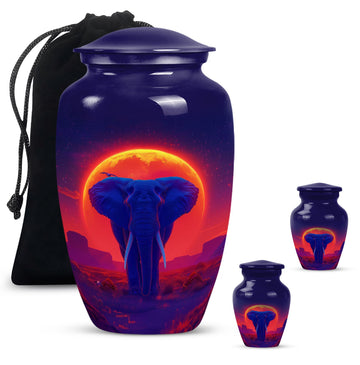 Elegantly express lasting tribute to your loved one with this magnificent 10-inch Elephant Urn. Expertly crafted from top-grade Aluminium, this heavy-duty urn weighs 3.3 pounds and is ideal for both display and ground burial. The traditional classic urn design elegantly embellished with a butterfly theme is perfect for memorial ceremonies. The urn is capable of holding 200 cubic inches of ashes, perfect for most adult women's remains. Your purchase includes a plush velvet pouch which serves as a respectful and dignified containment for the ashes. Personalize the urn by having engraved names added for that touch of uniqueness. This urn is more than just a container; it's a cherished memorial. Our Elephant urn, seamlessly blends affordability with craftsmanship, it's an investment in precious memory preservation. Note: Suitable alternative keywords for this product are 'women urns', 'urns for human ashes' and 'Large Urns'.