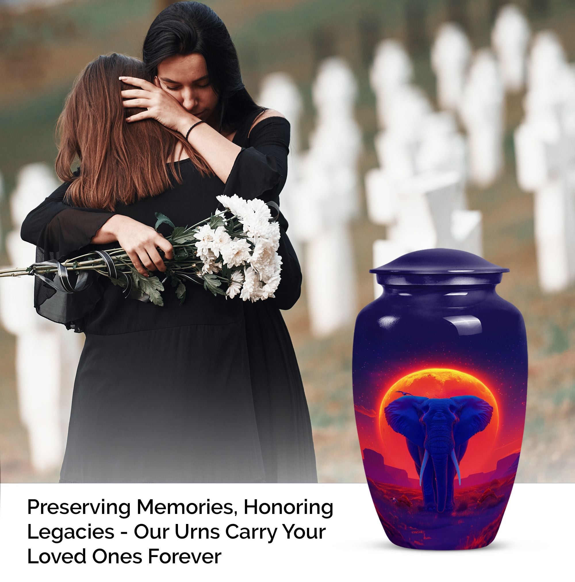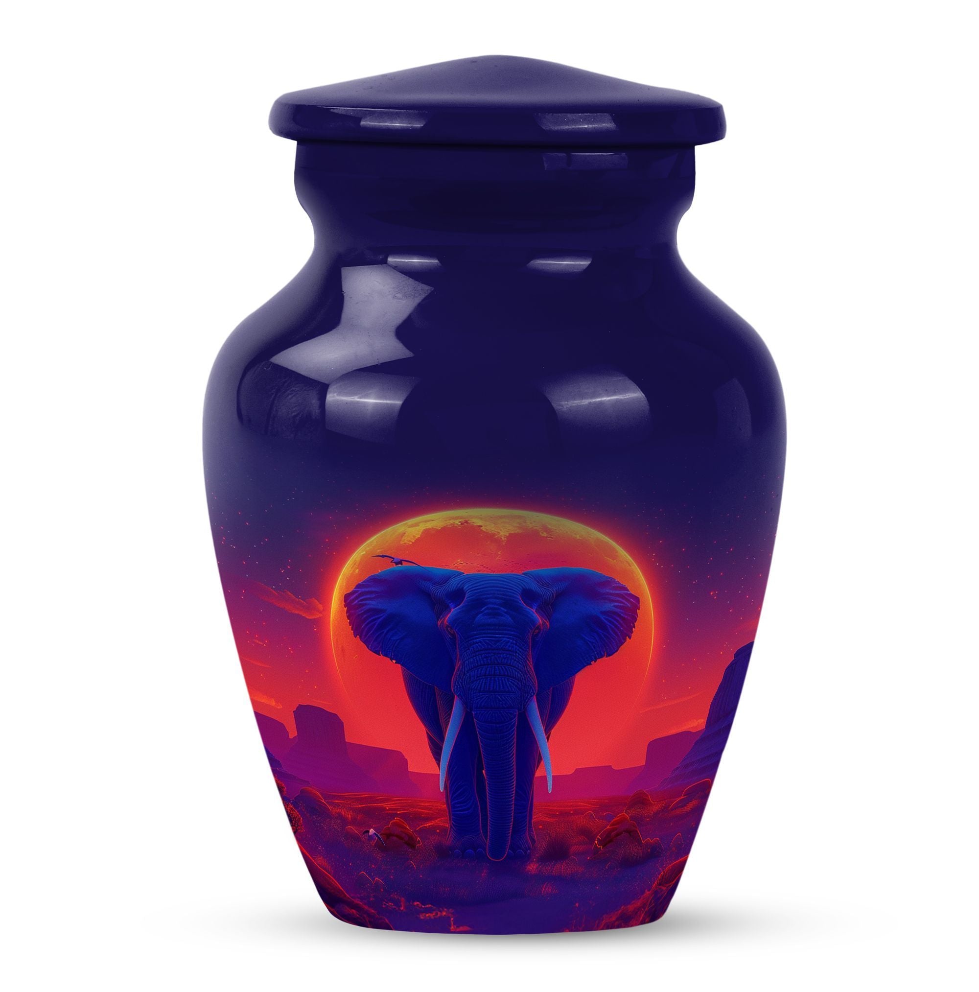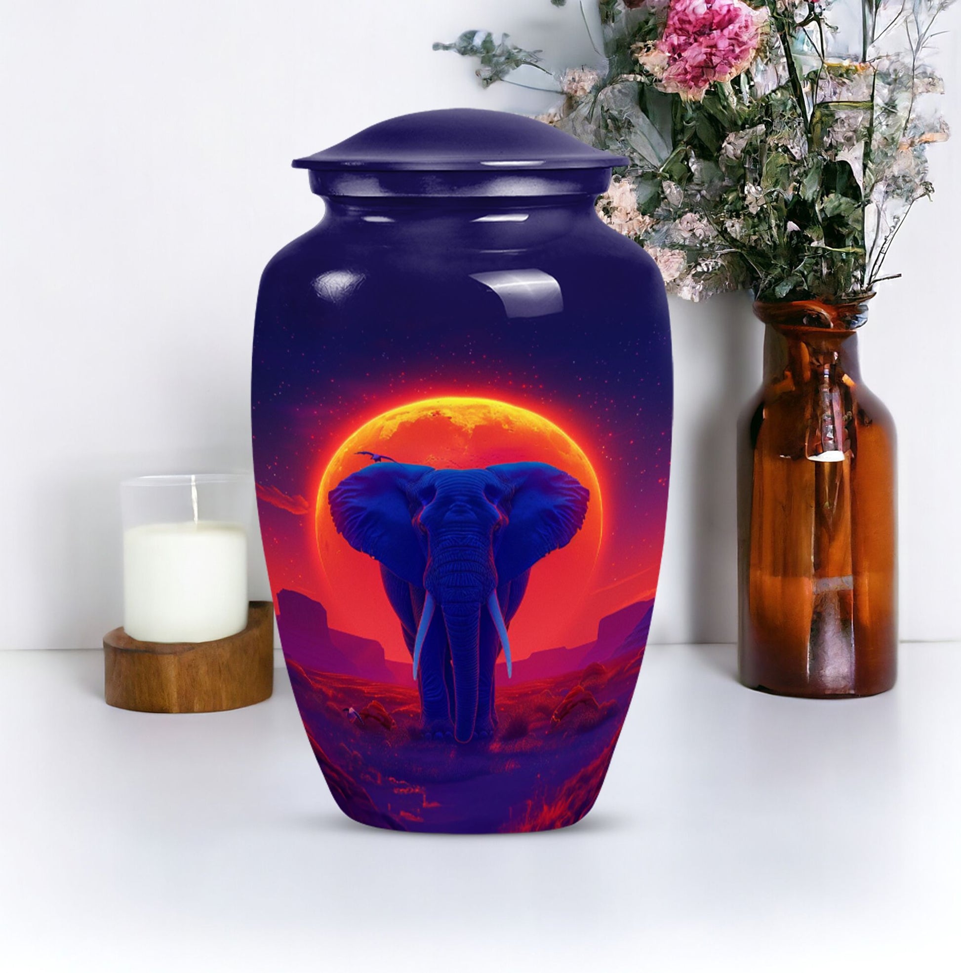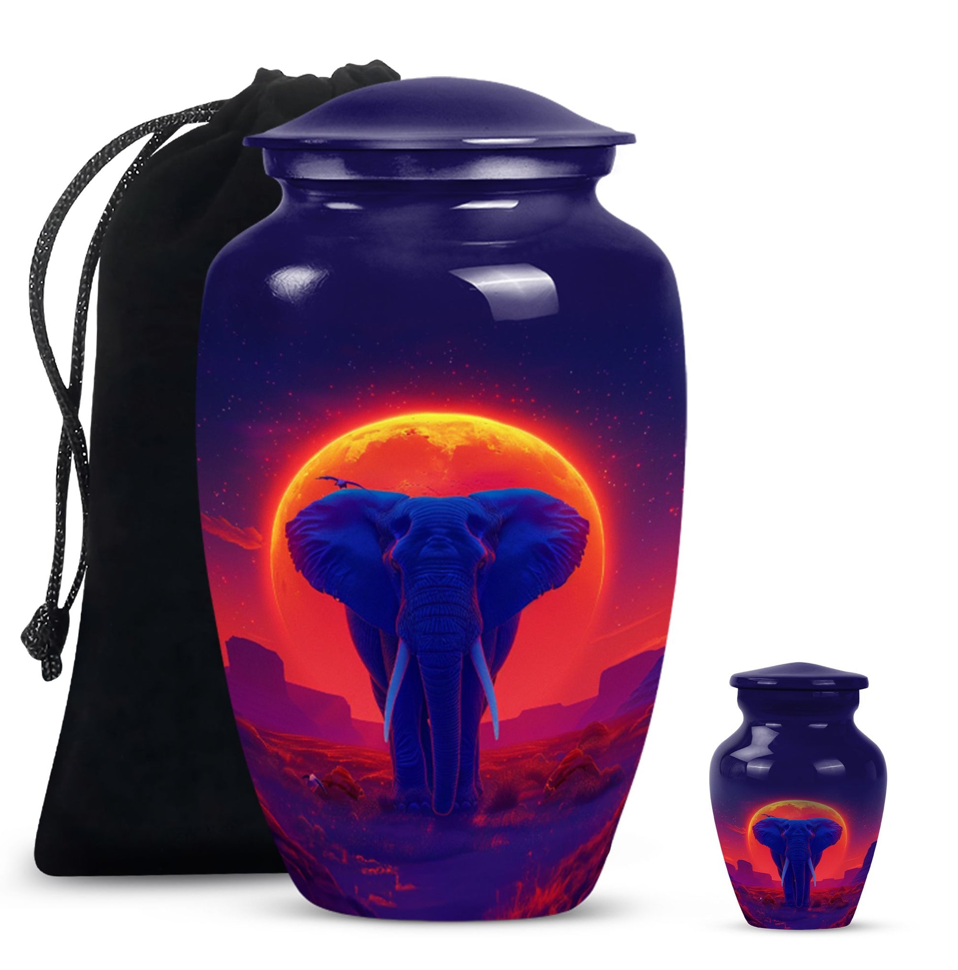 Elegantly express lasting tribute to your loved one with this magnificent 10-inch Elephant Urn. Expertly crafted from top-grade Aluminium, this heavy-duty urn weighs 3.3 pounds and is ideal for both display and ground burial. The traditional classic urn design elegantly embellished with a butterfly theme is perfect for memorial ceremonies. The urn is capable of holding 200 cubic inches of ashes, perfect for most adult women's remains. Your purchase includes a plush velvet pouch which serves as a respectful and dignified containment for the ashes. Personalize the urn by having engraved names added for that touch of uniqueness. This urn is more than just a container; it's a cherished memorial. Our Elephant urn, seamlessly blends affordability with craftsmanship, it's an investment in precious memory preservation. Note: Suitable alternative keywords for this product are 'women urns', 'urns for human ashes' and 'Large Urns'.