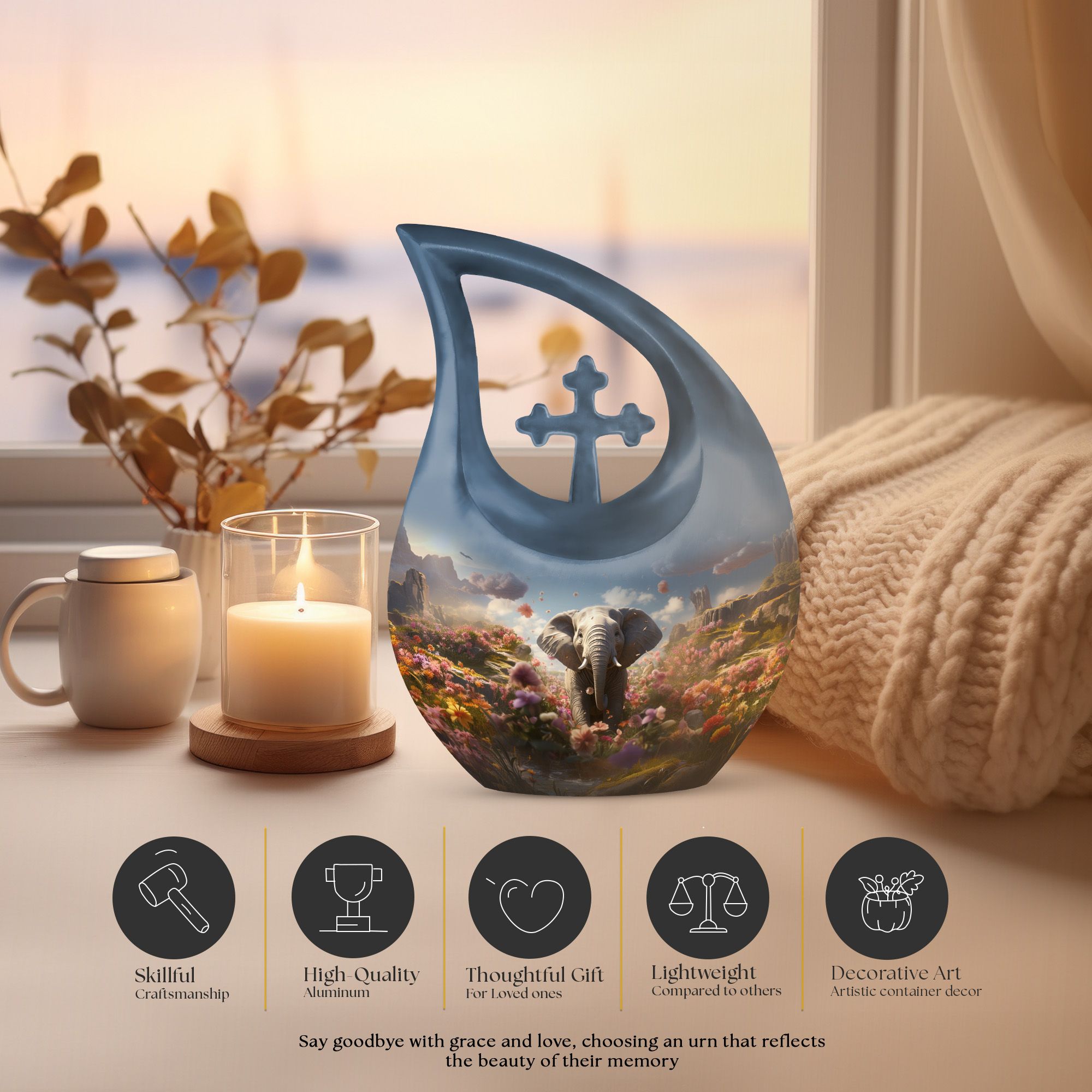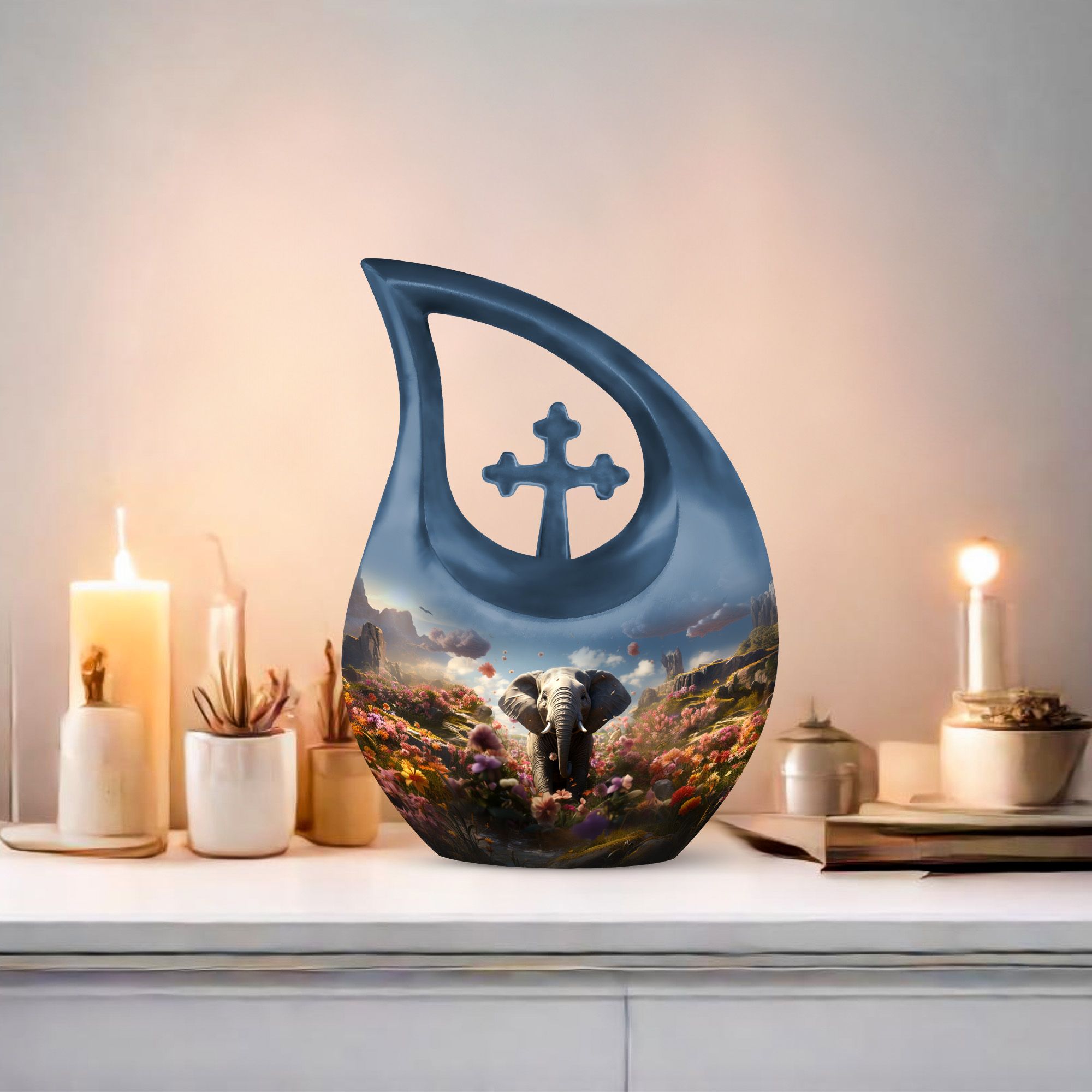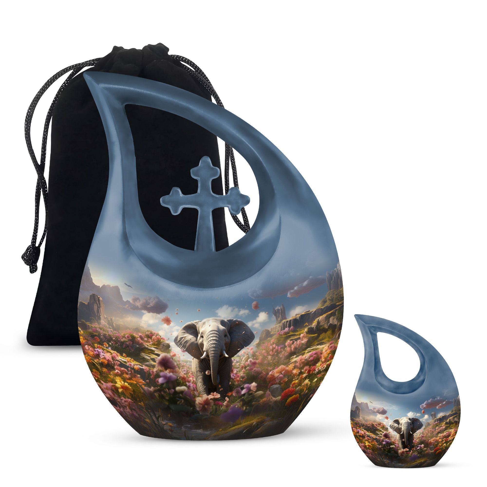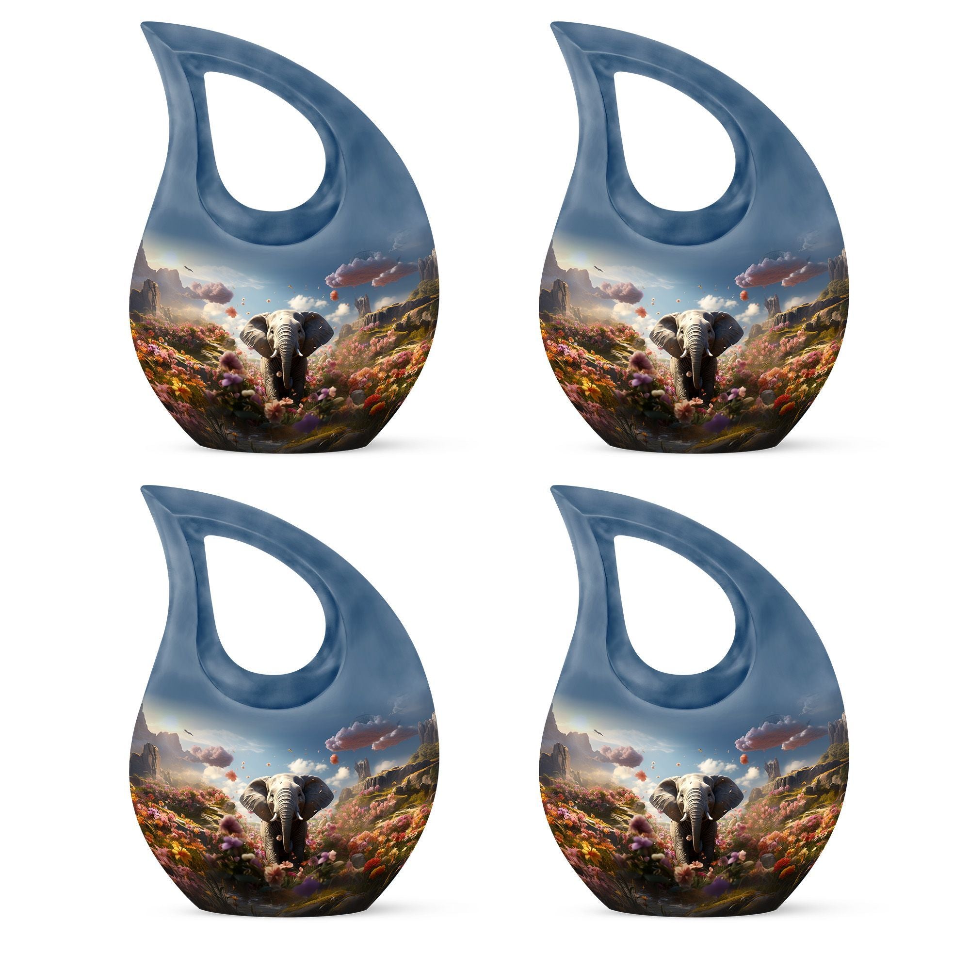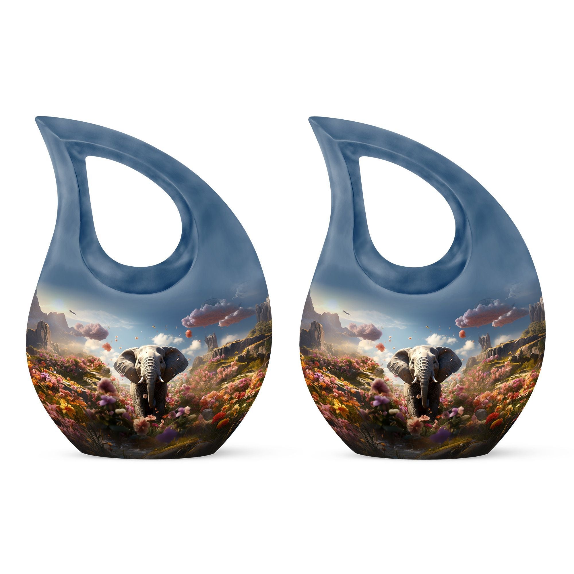 Celebrate the life of your loved one with the Elephant Floral Hillside Cremation Urn, a stunning symbol of peace, beauty, and eternal love. The graceful blue teardrop form evokes serenity and calm, making it a perfect choice among large cremation urns for human ashes and urns for human ashes large. This memorial piece honors life’s journey while offering comfort and elegance.