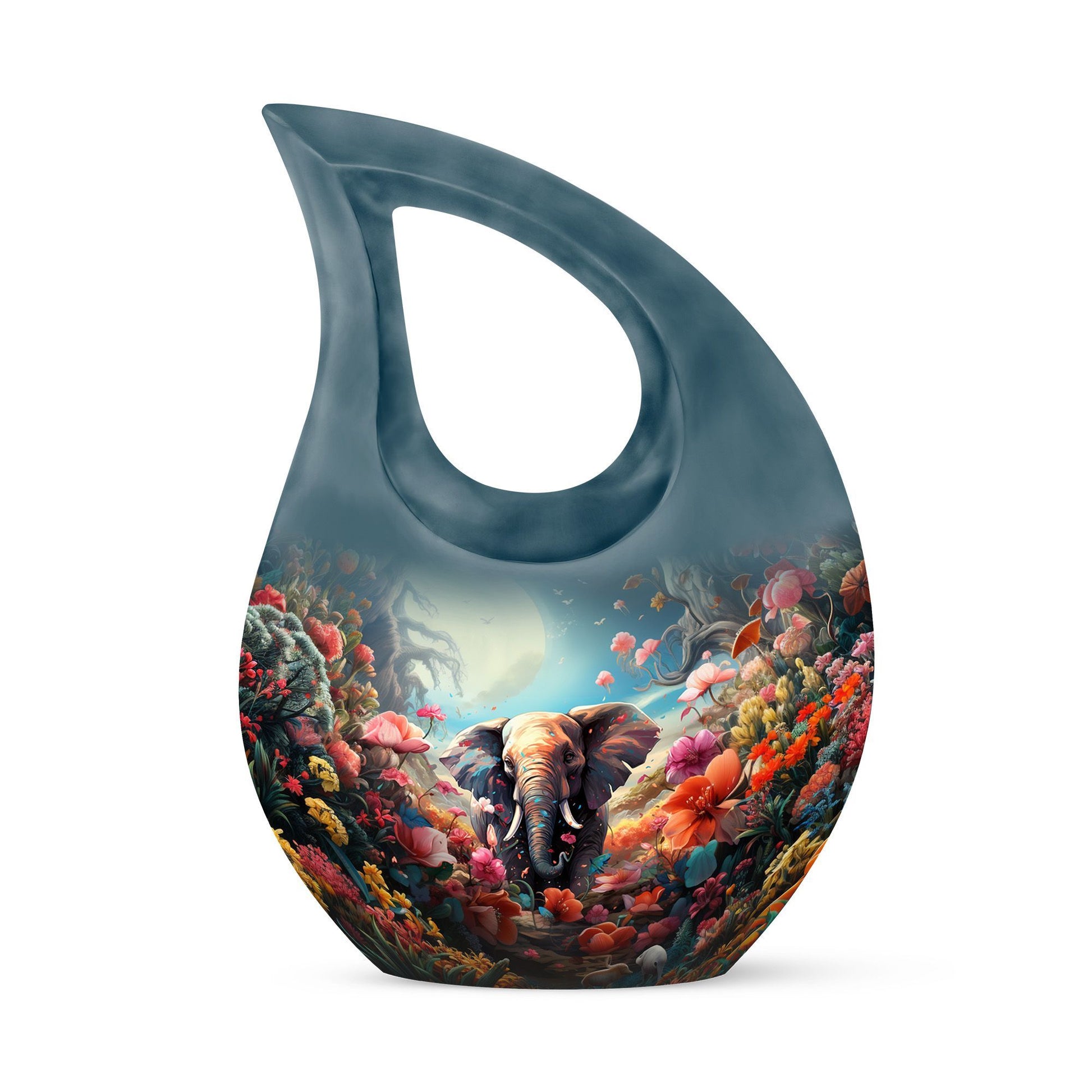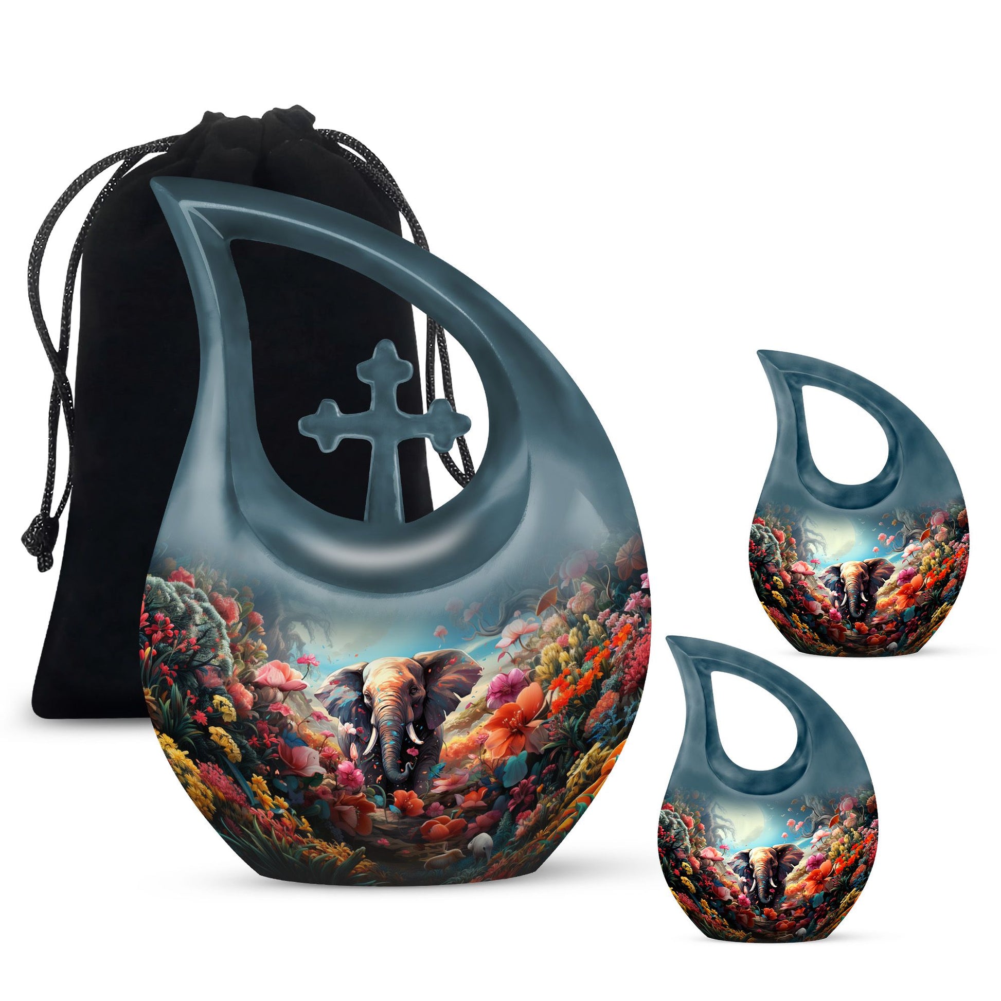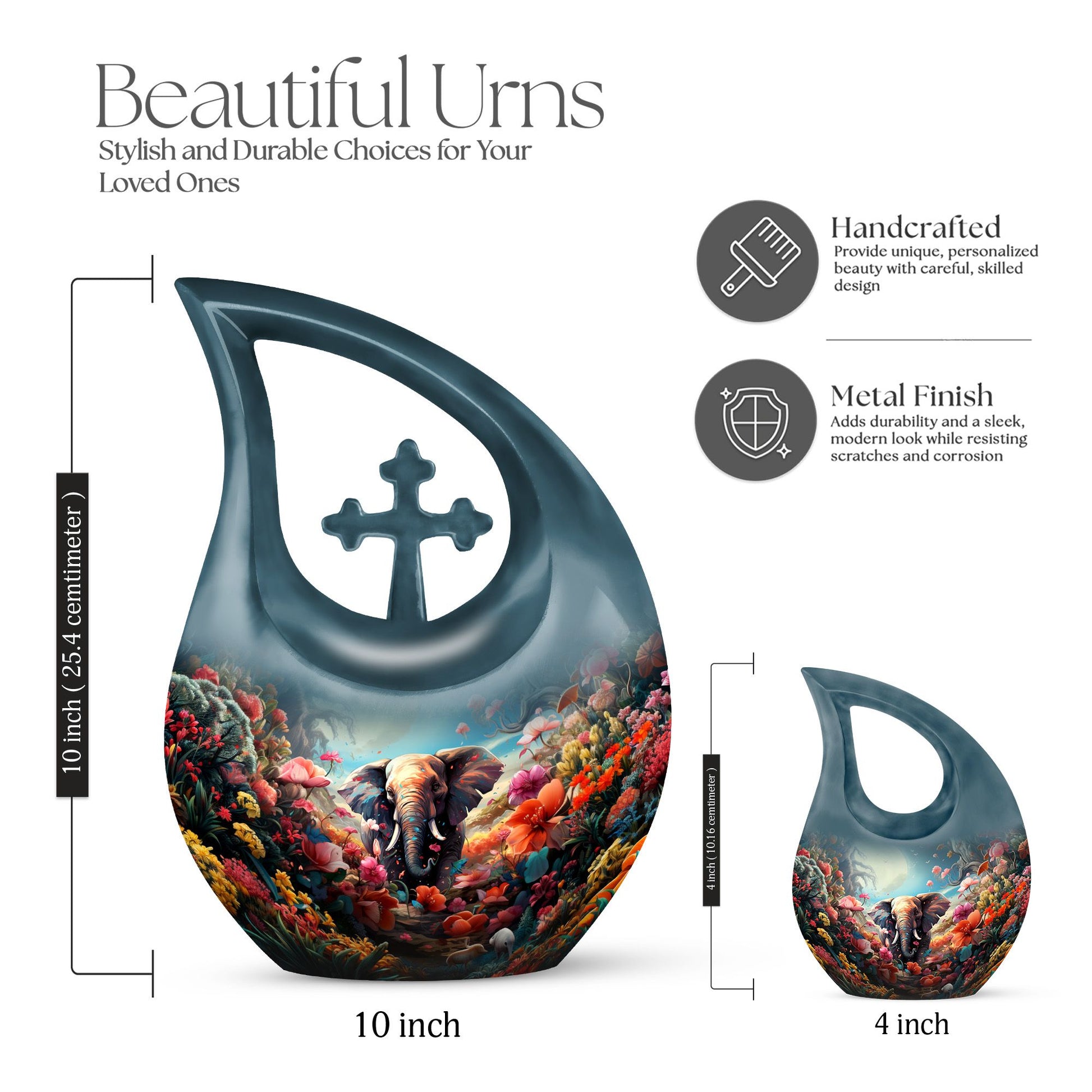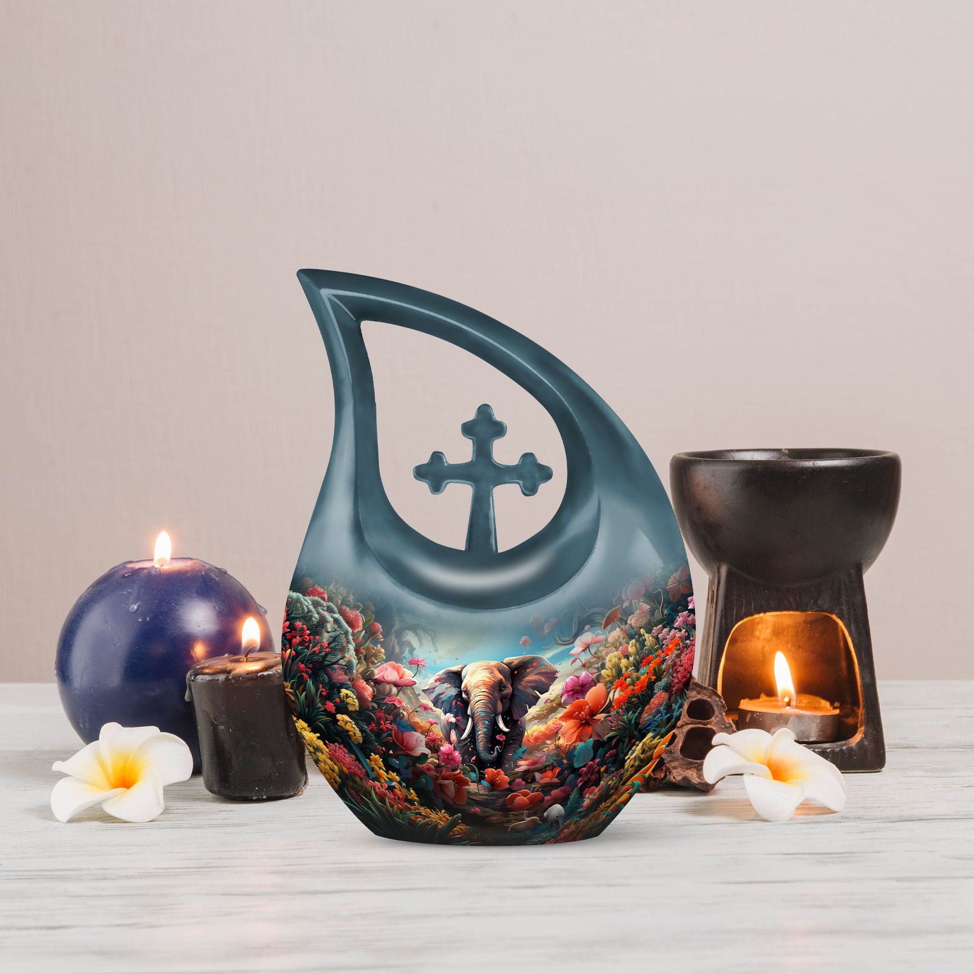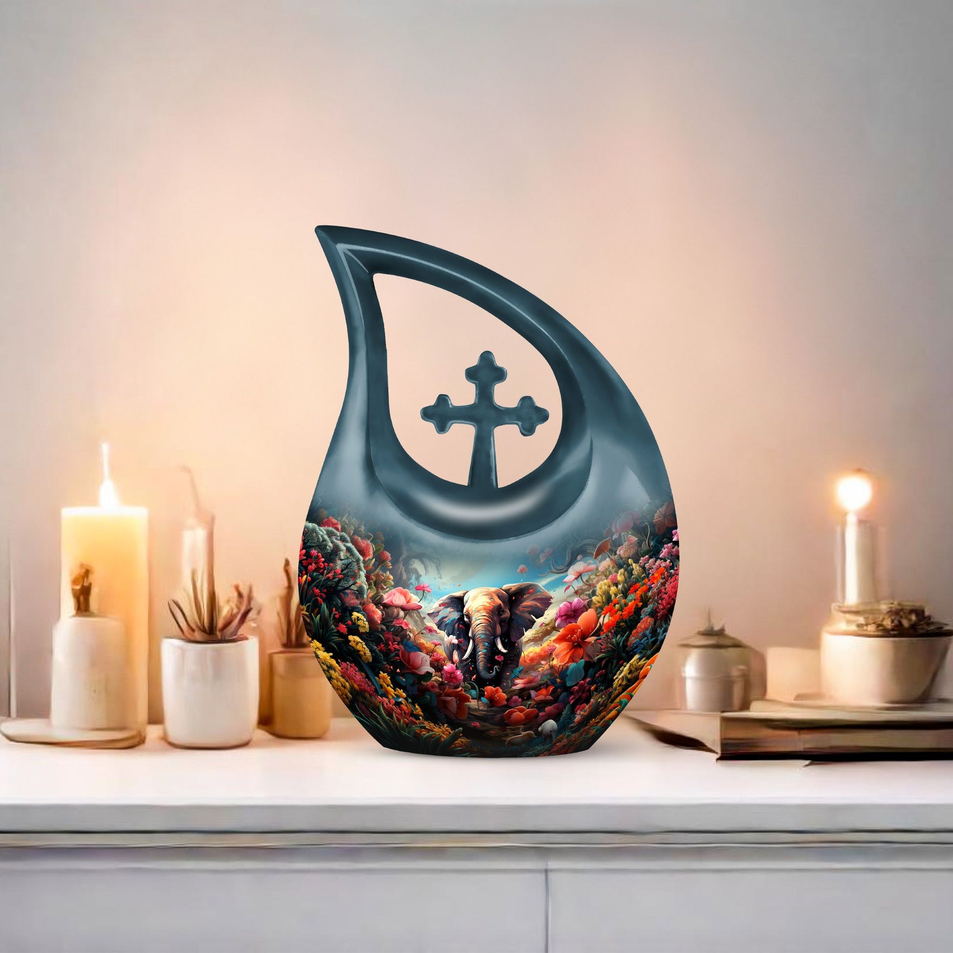 This urn for human ashes adult women is crafted from durable aluminum with a glossy, hand-polished finish. The teardrop silhouette enhances its elegant presence, while the floral and elephant design adds emotional depth and symbolic meaning. With a secure screw-top lid, this urn for women ashes offers both safety and serenity. Its versatile beauty also makes it suitable as one of the most refined funeral urns for men or small urns for women human ashes in a memorial collection.