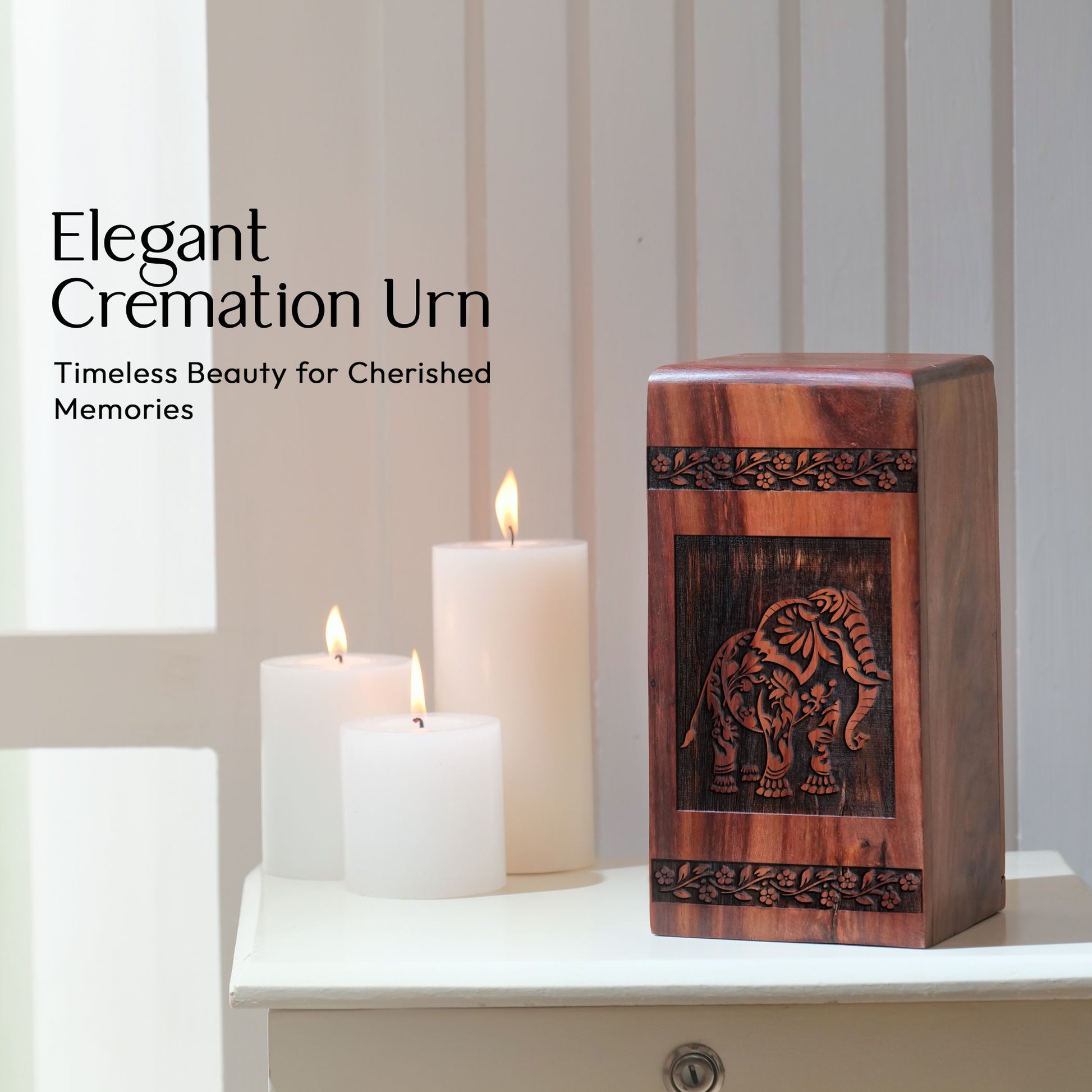 Experience the unmatched craftsmanship and timeless elegance of our Elephant Wooden Cremation Urns. These are not just mere urns but pieces of art reflecting a deep sense of respect and honor for the departed. Crafted for the discerning, funeral supplies shopper, these urns serve as a cherished memorial piece. Unlike common urns, the design incorporates a carved elephant, symbolizing strength, honour, stability, and patience. The product is ideal for adults, and in particular, for men, as it acts as a beautiful reminder of the strength they exhibited in life. This cremation urn seamlessly fits into the genre of keepsakes and memorabilia that seniors, in particular, might be keenly browsing. Make it a meaningful tribute to your beloved patriarch; let it be the 'Urns for Dad' you have been looking for. Search no more for 'Adult urns for men', as this ash urn ticks all the right boxes. Embrace this dignified form of remembrance today.