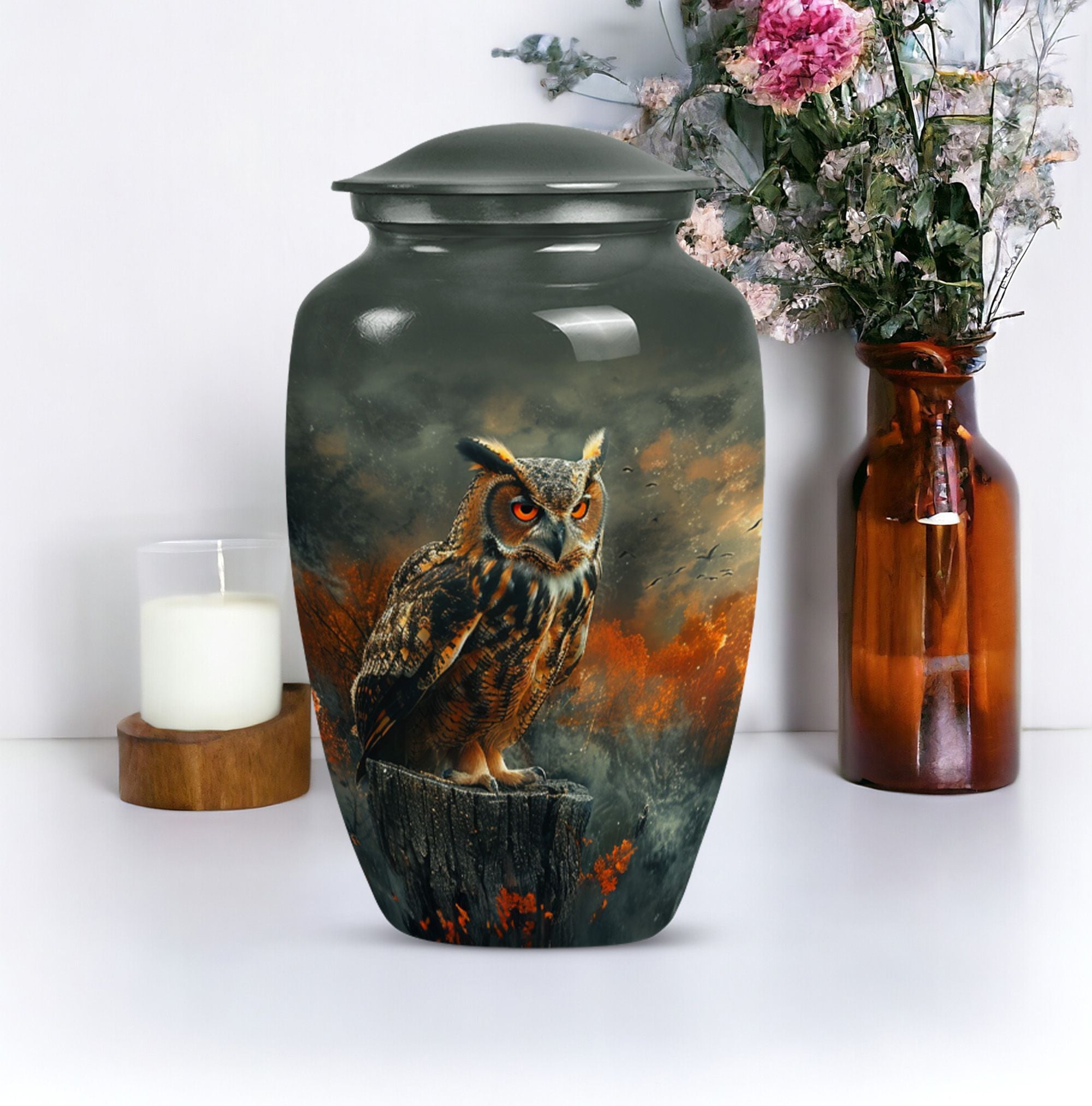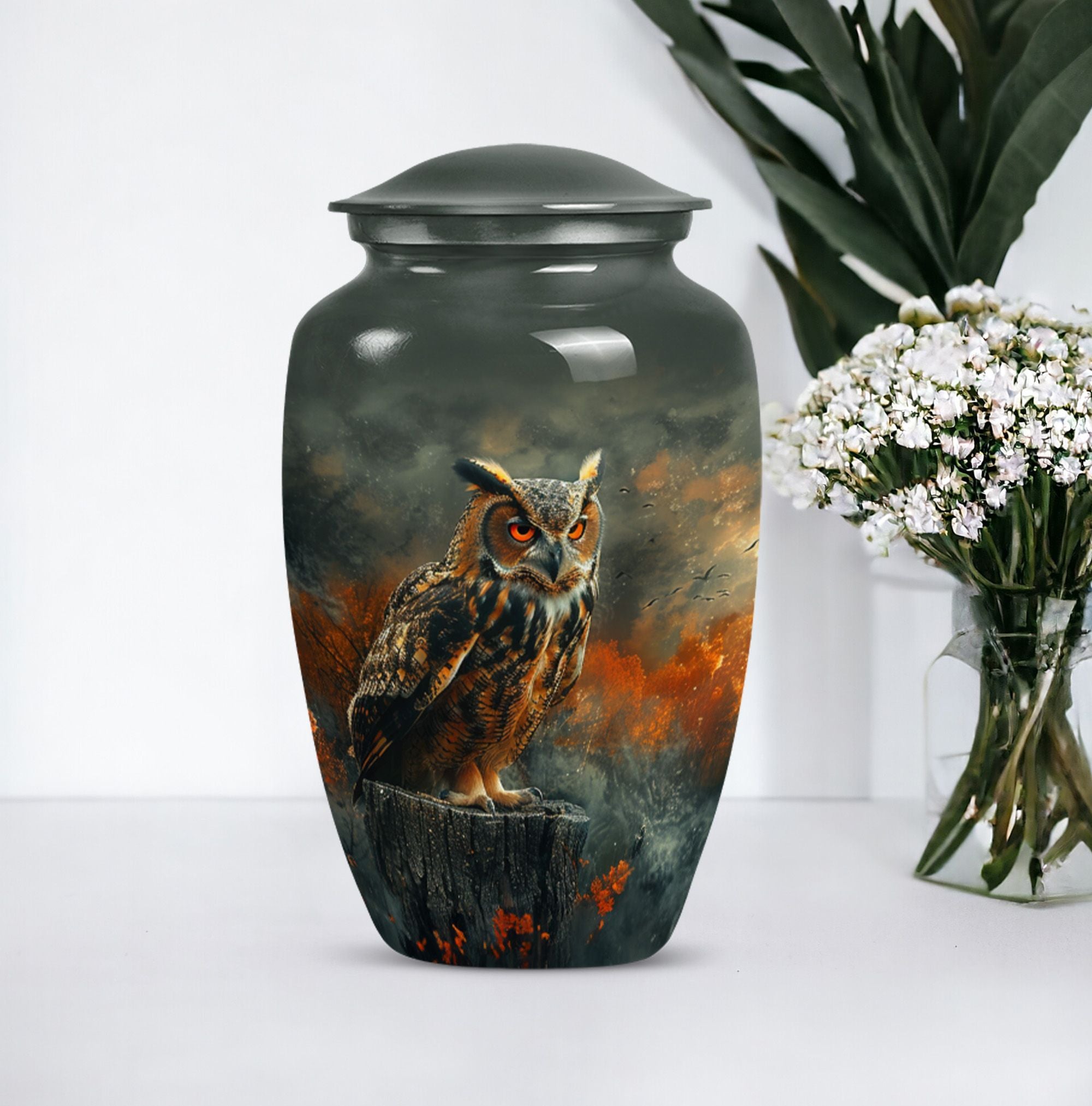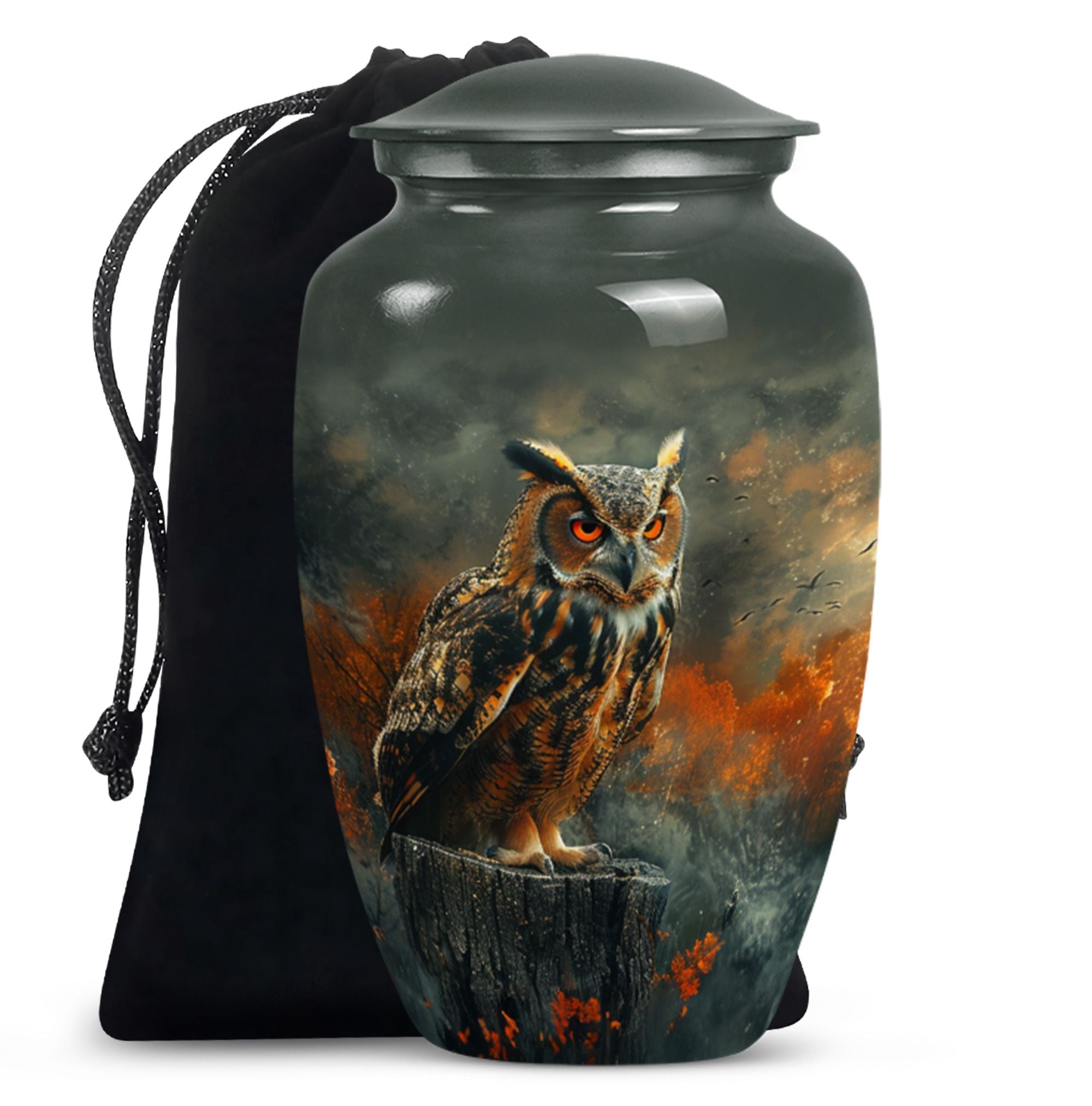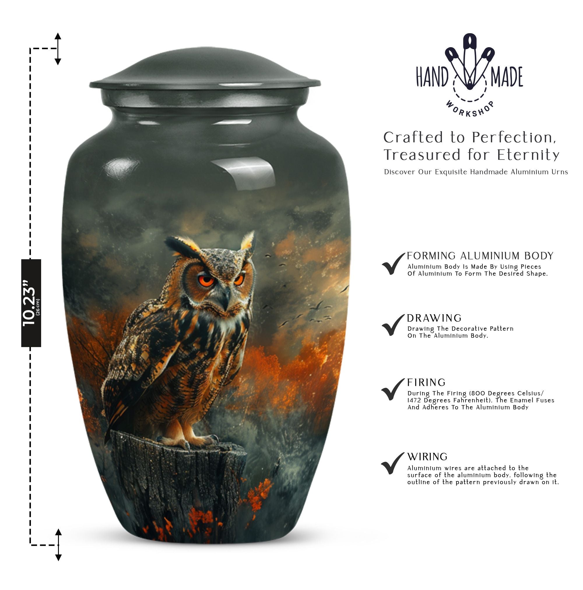 Cherish the memory of your loved ones with our elegantly crafted classic owl urn, designed with a blend of tradition and an abstract theme that carries timeless appeal. With a substantial size, measuring at 10 inches in height and a capacity to hold 200 cubic inches, this substantial urn is made to honor adult or seniors ashes. This funeral urn for men ashes is cast from solid, robust aluminium, weighing 3.3 pounds, making it last for generations to come. This large urn includes a velvet pouch for secure containment of the ashes, adding to your convenience and peace of mind. For a unique personal touch, you can personalize the urn with engraved names. Offering a perfect blend of aesthetics and practicality, this premium memorial urn is ideal for those seeking owl urns or adult urns for ashes. Shop now and experience a comforting presence in your space as you remember your loved ones.
