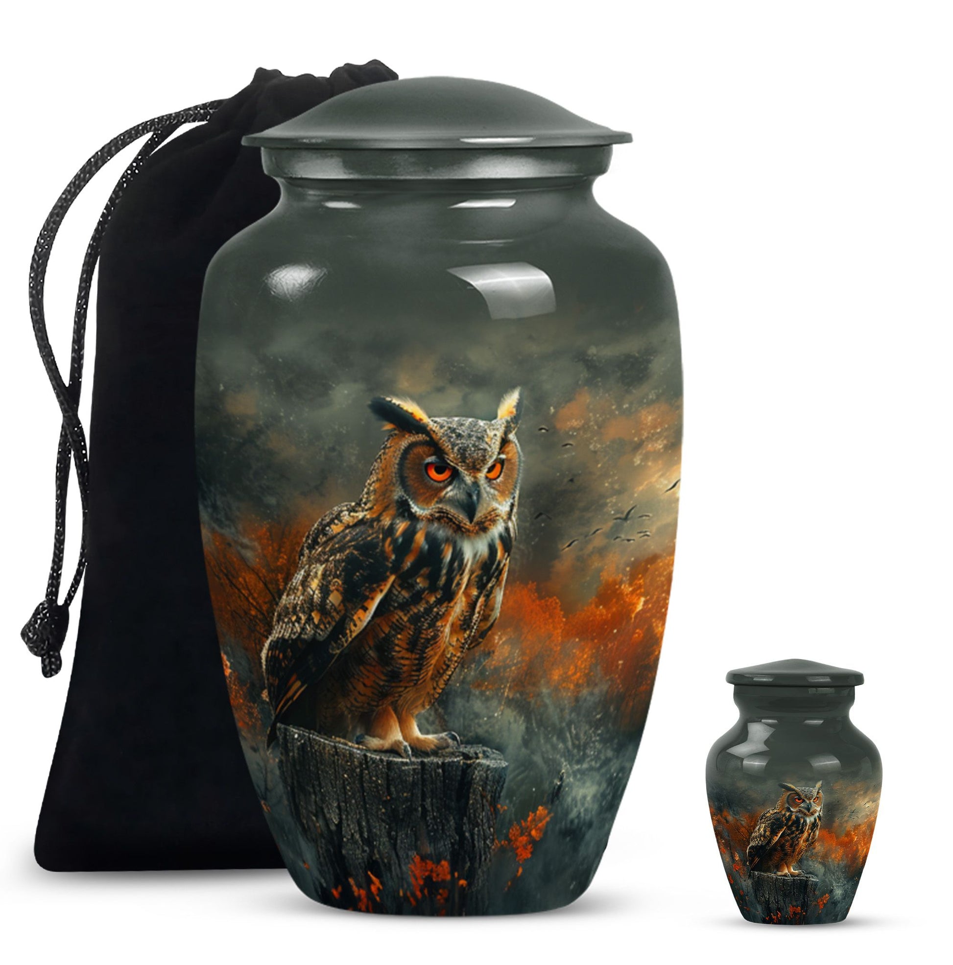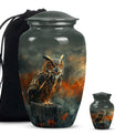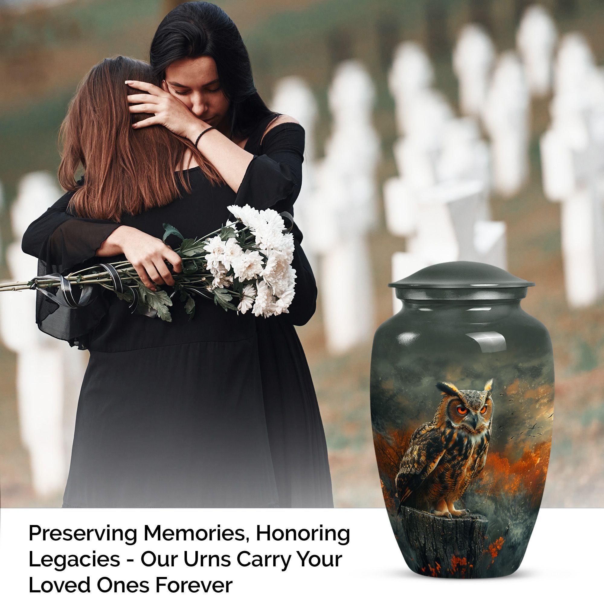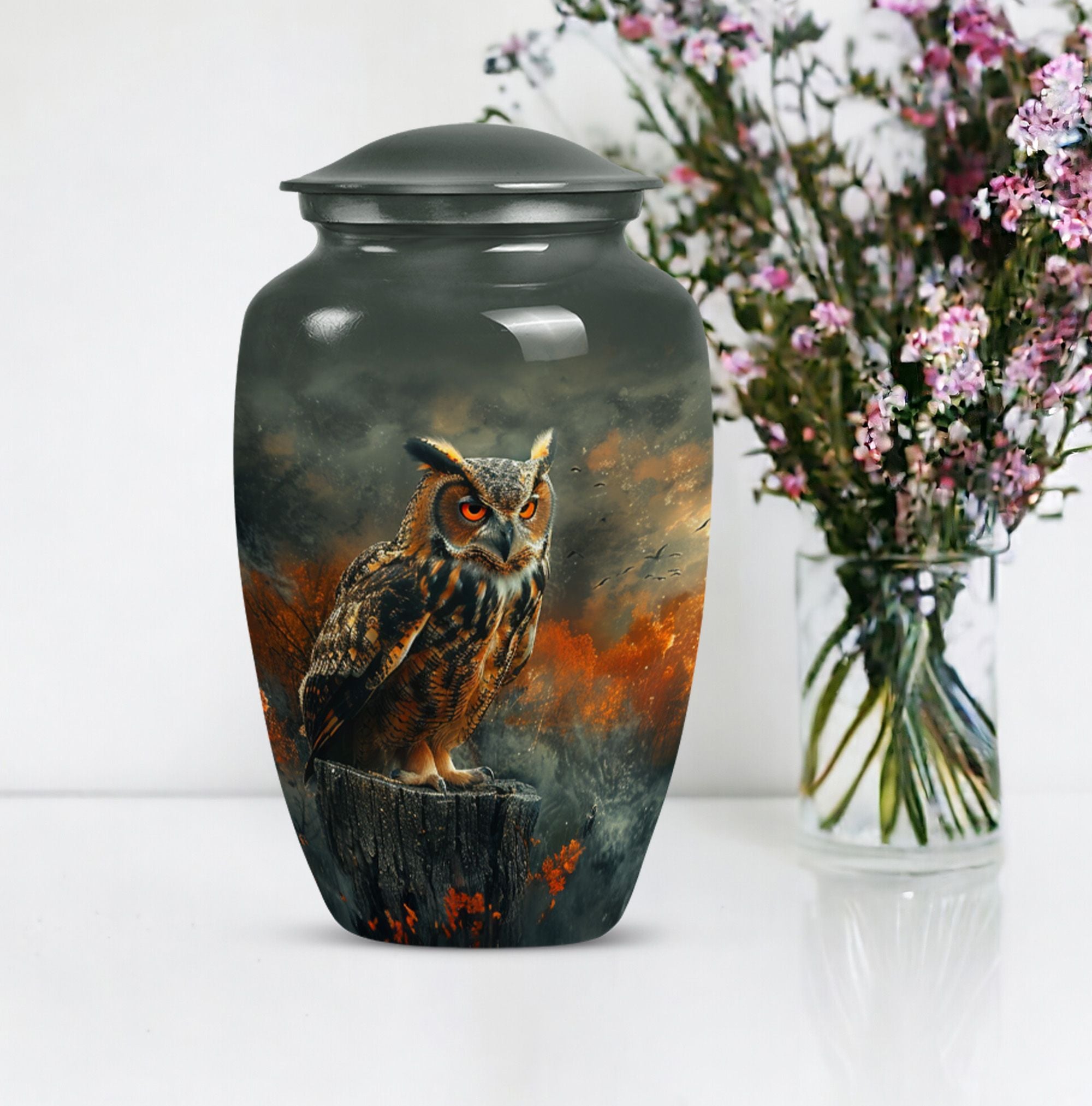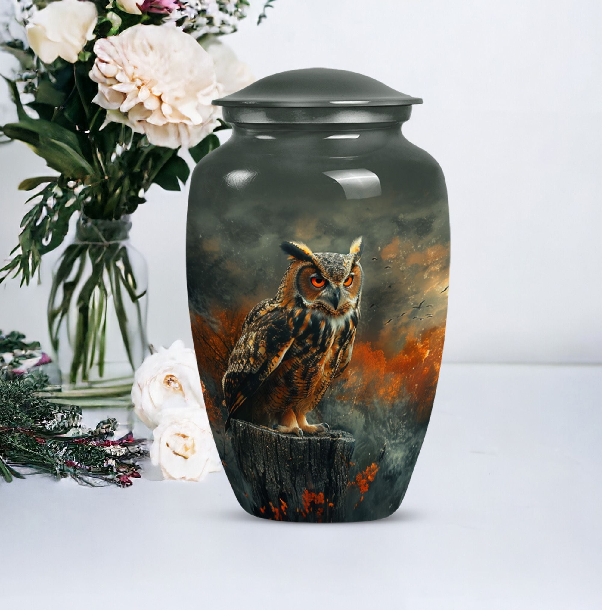 Cherish the memory of your loved ones with our elegantly crafted classic owl urn, designed with a blend of tradition and an abstract theme that carries timeless appeal. With a substantial size, measuring at 10 inches in height and a capacity to hold 200 cubic inches, this substantial urn is made to honor adult or seniors ashes. This funeral urn for men ashes is cast from solid, robust aluminium, weighing 3.3 pounds, making it last for generations to come. This large urn includes a velvet pouch for secure containment of the ashes, adding to your convenience and peace of mind. For a unique personal touch, you can personalize the urn with engraved names. Offering a perfect blend of aesthetics and practicality, this premium memorial urn is ideal for those seeking owl urns or adult urns for ashes. Shop now and experience a comforting presence in your space as you remember your loved ones.