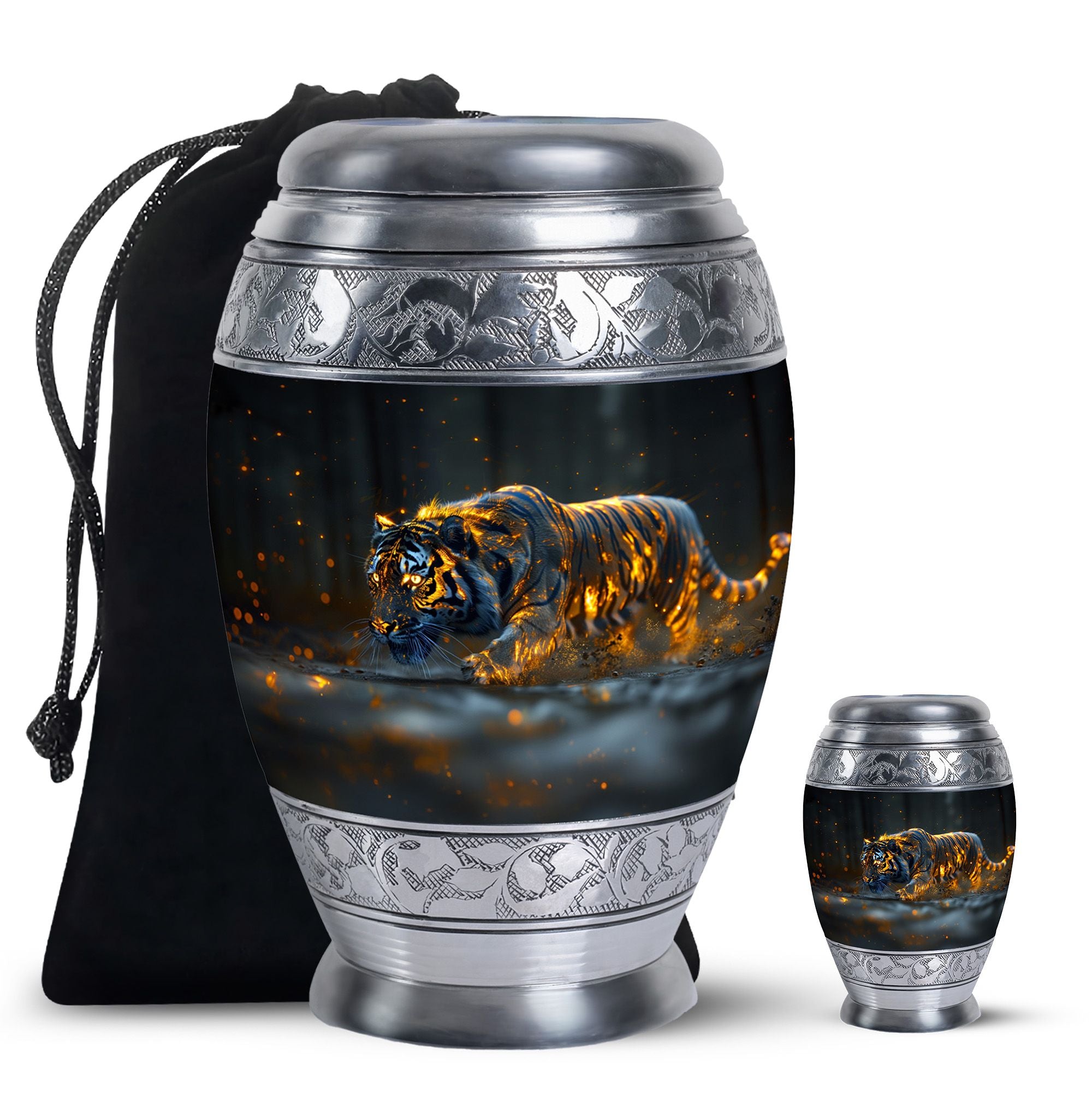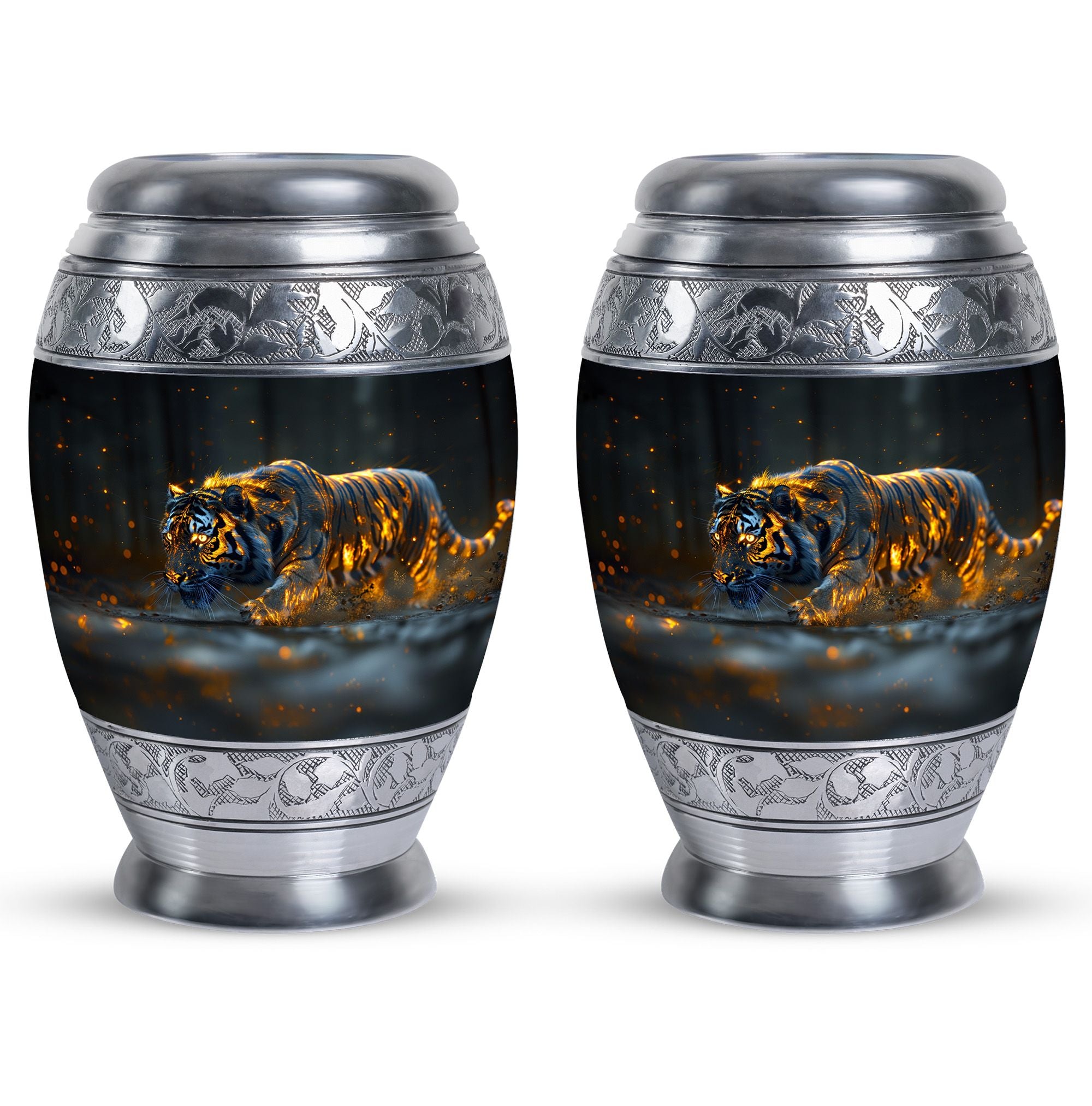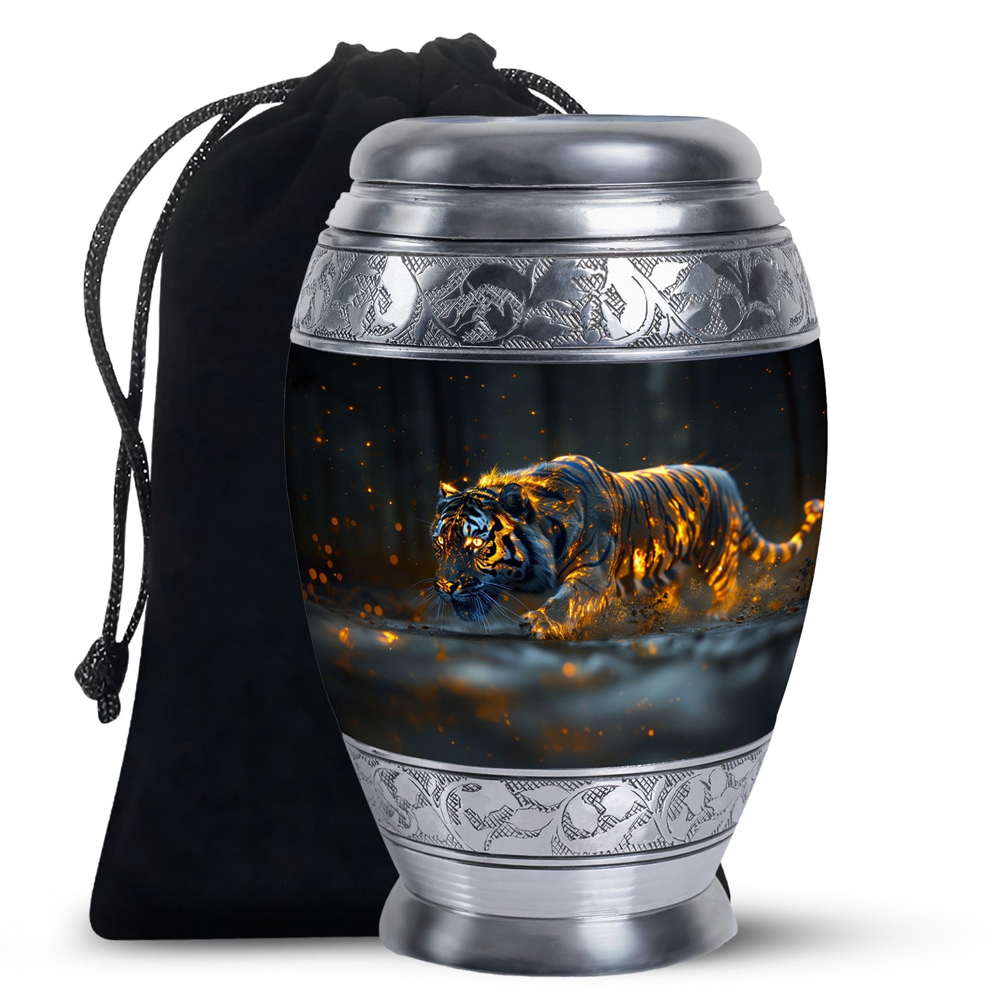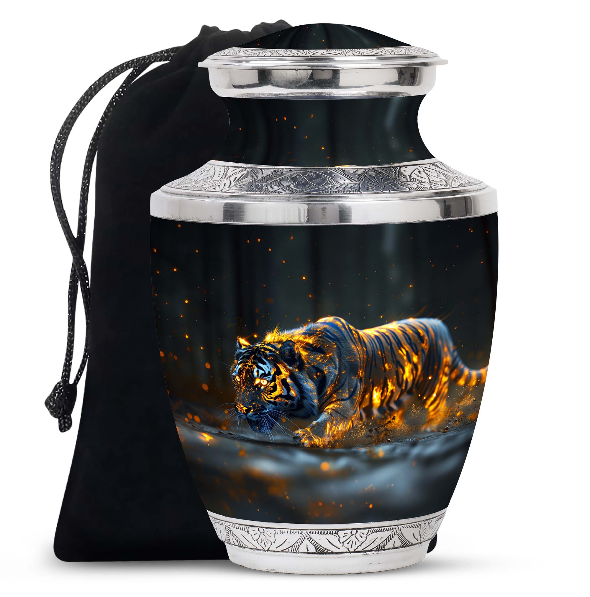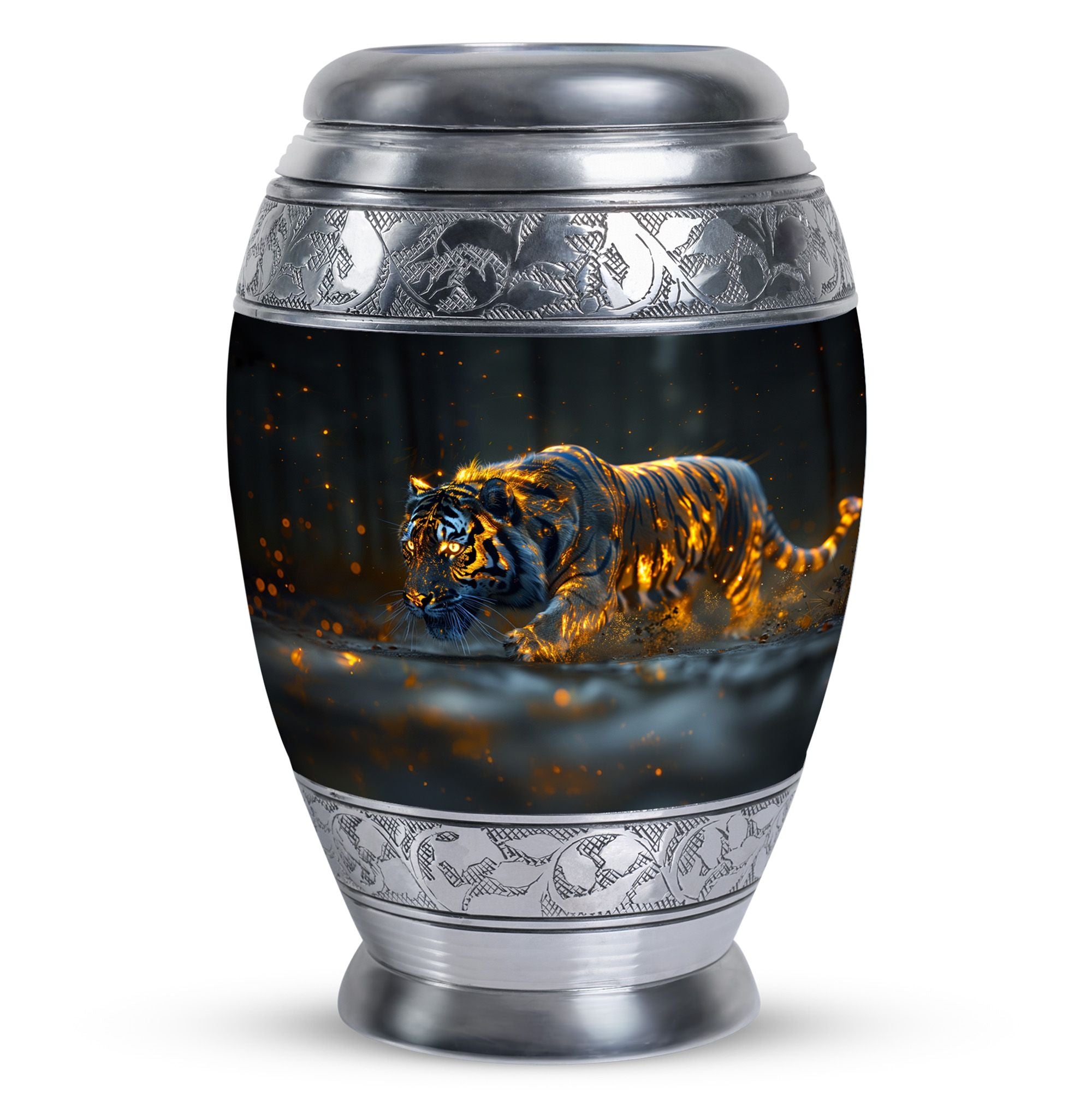 Expertly handcrafted, this elegant urn showcases a deep black finish accented with subtle tiger-inspired detailing—an expression of inner power and peace. The high-quality aluminum construction ensures durability and long-lasting beauty, while the smooth surface and reflective finish enhance its visual appeal. Whether chosen as urns for human ashes adult male dad, urns for adult female mom, or cremation urns for human ashes adult female, it beautifully combines craftsmanship with compassion, making it a timeless keepsake.