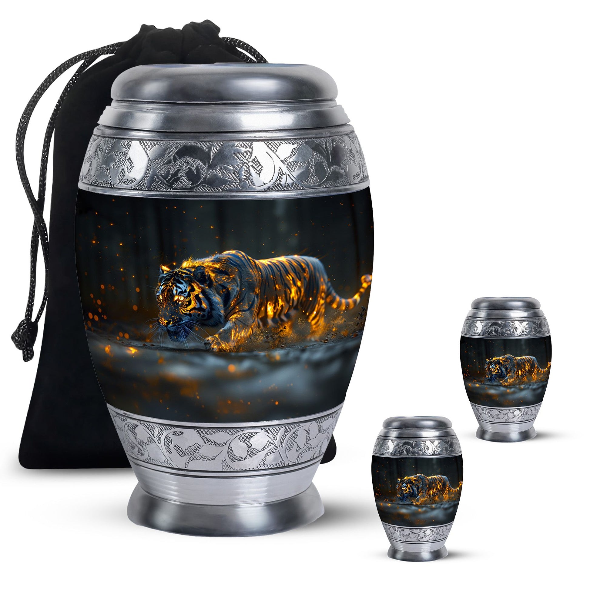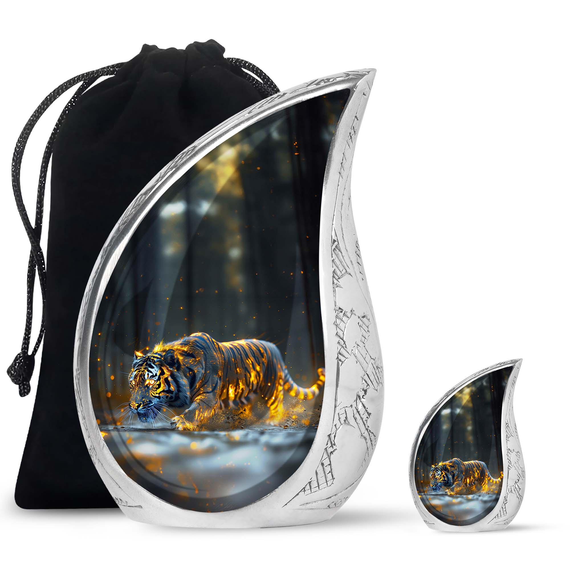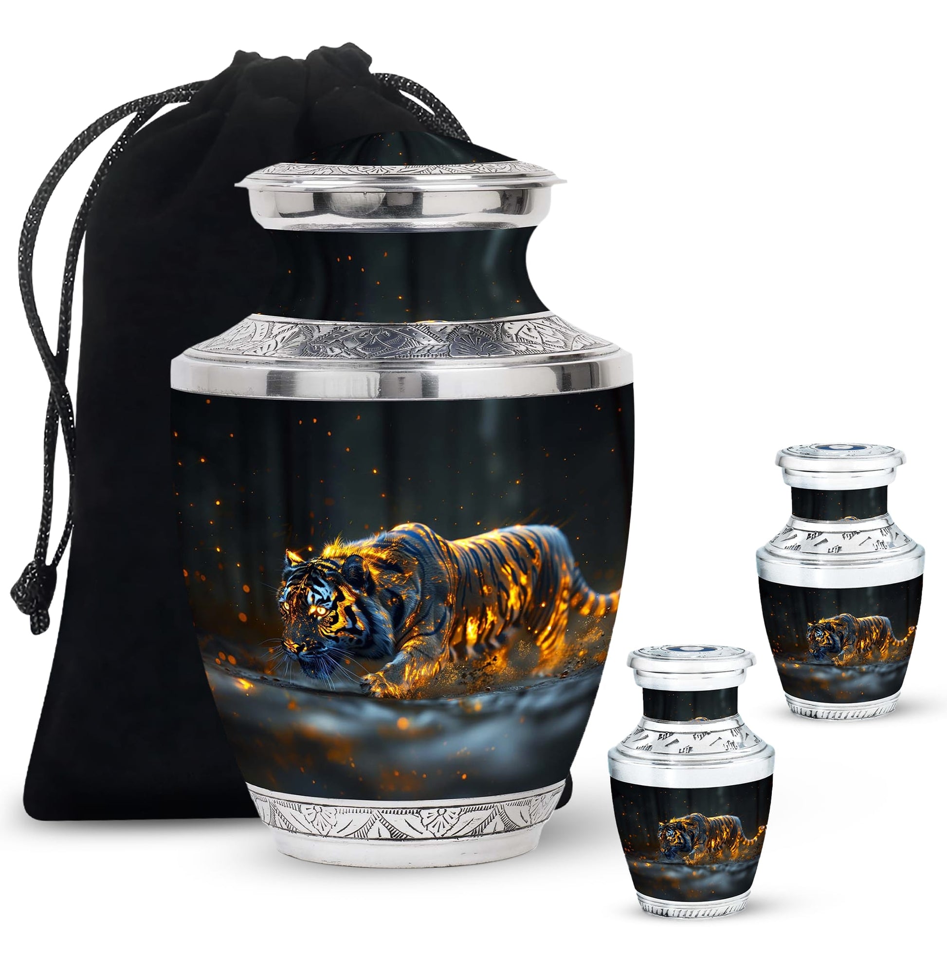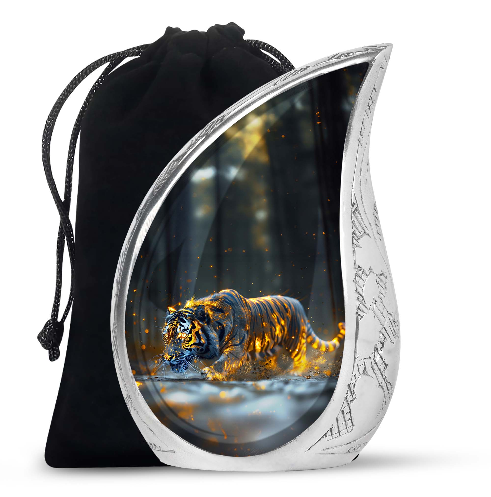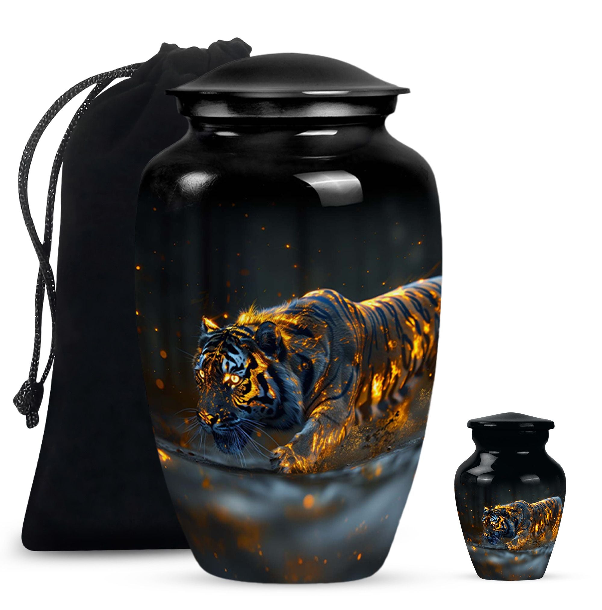 Expertly handcrafted, this elegant urn showcases a deep black finish accented with subtle tiger-inspired detailing—an expression of inner power and peace. The high-quality aluminum construction ensures durability and long-lasting beauty, while the smooth surface and reflective finish enhance its visual appeal. Whether chosen as urns for human ashes adult male dad, urns for adult female mom, or cremation urns for human ashes adult female, it beautifully combines craftsmanship with compassion, making it a timeless keepsake.