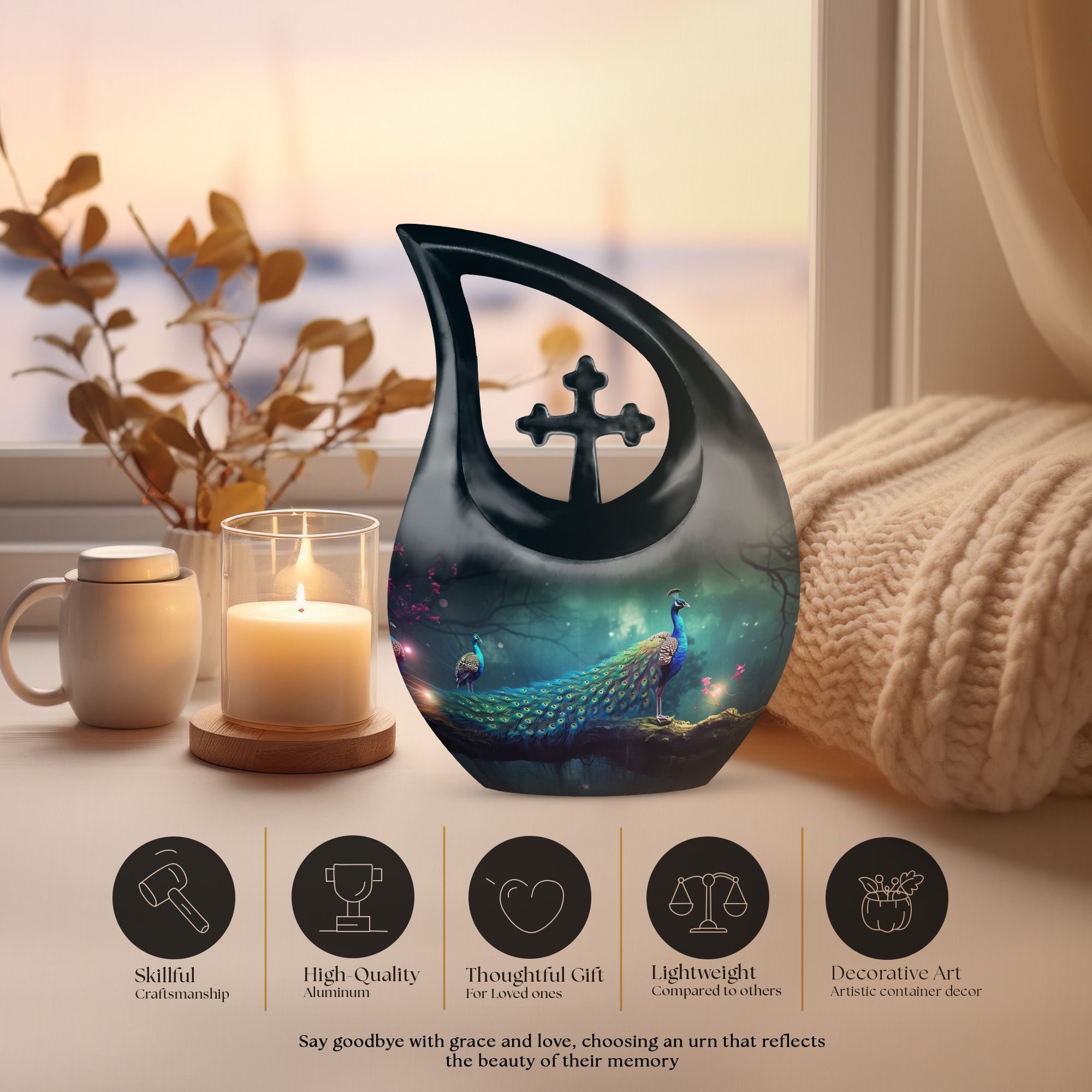 Handcrafted from premium aluminum, this urn features a deep black finish accented by an illuminated cross and delicate peacock motif. The design’s gentle glow brings warmth to any memorial space, serving as a touching reminder of love that never fades. Designed for versatility, it functions beautifully as both a display urn and a burial urn for ashes. Whether you seek urns for burial in ground or funeral keepsake urns for remembrance, this piece embodies reverence, grace, and strength.