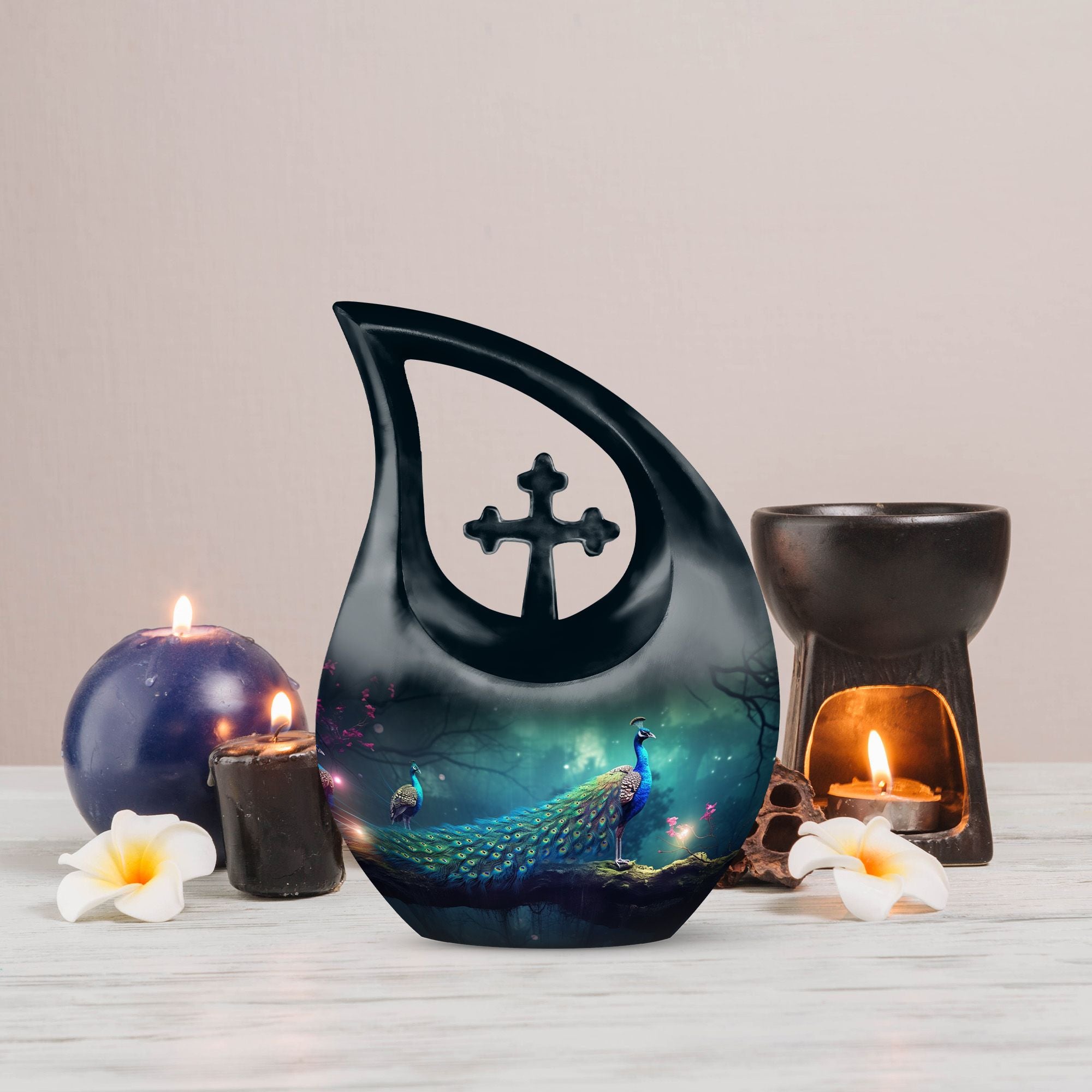 Celebrate your loved one’s eternal journey with the Black Cross Design Urn with Peacocks and Magical Lights. This striking adult funeral urn blends faith, symbolism, and artistry, offering a meaningful way to preserve cherished memories. The radiant peacocks represent peace and eternal life, while the glowing cross detail evokes hope and divine protection — a truly unique urn for human ashes that comforts the heart and uplifts the spirit.