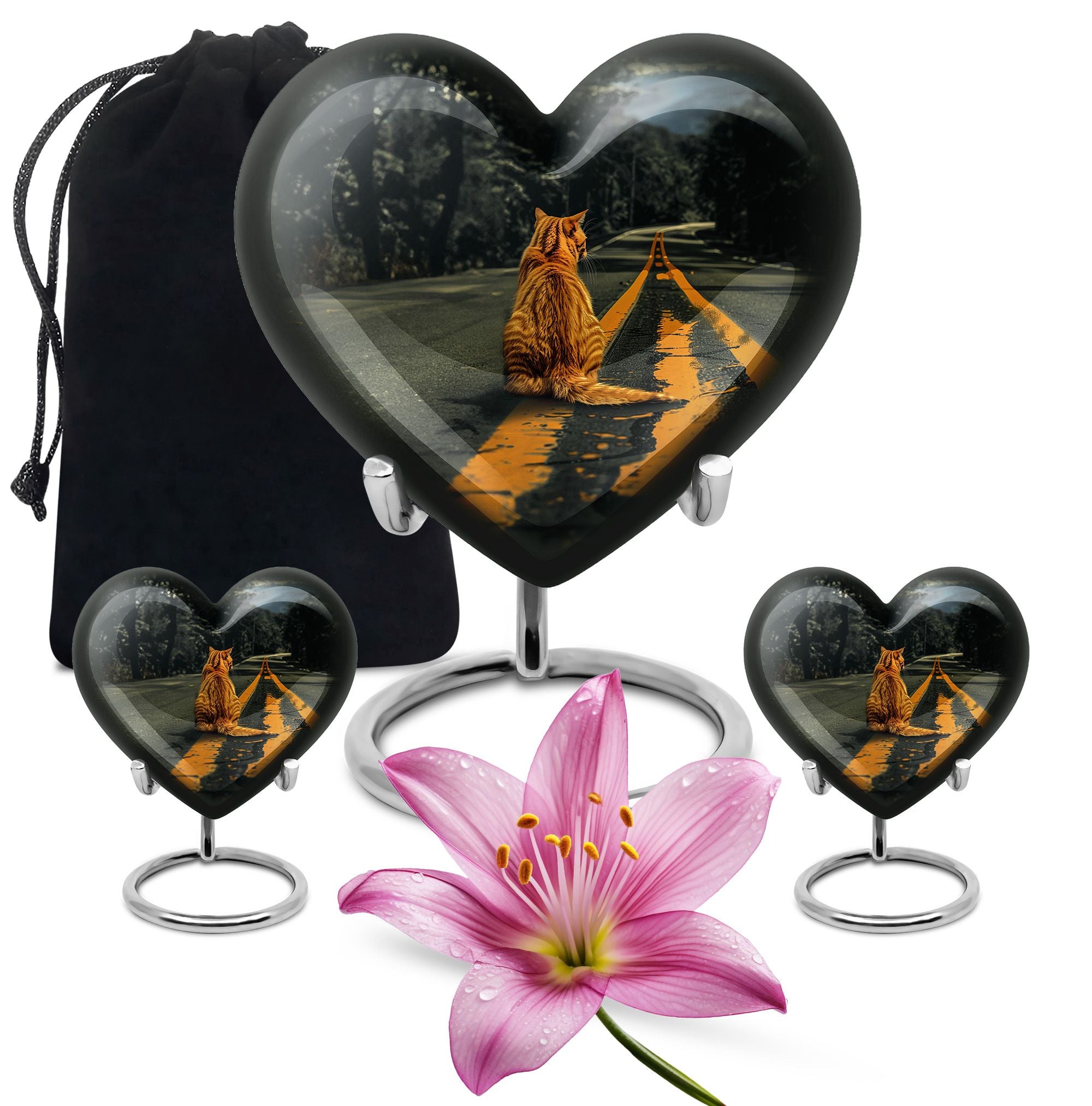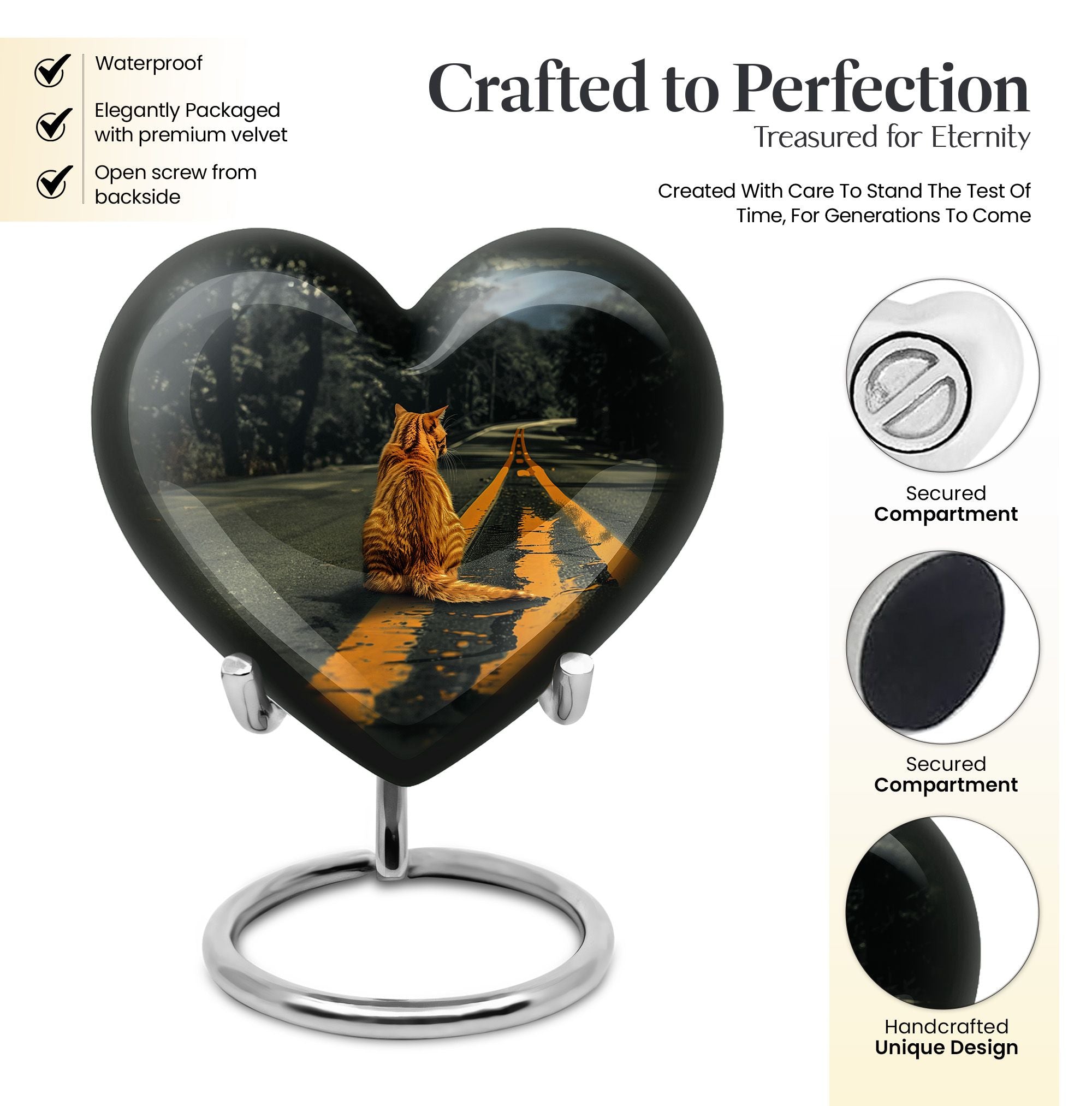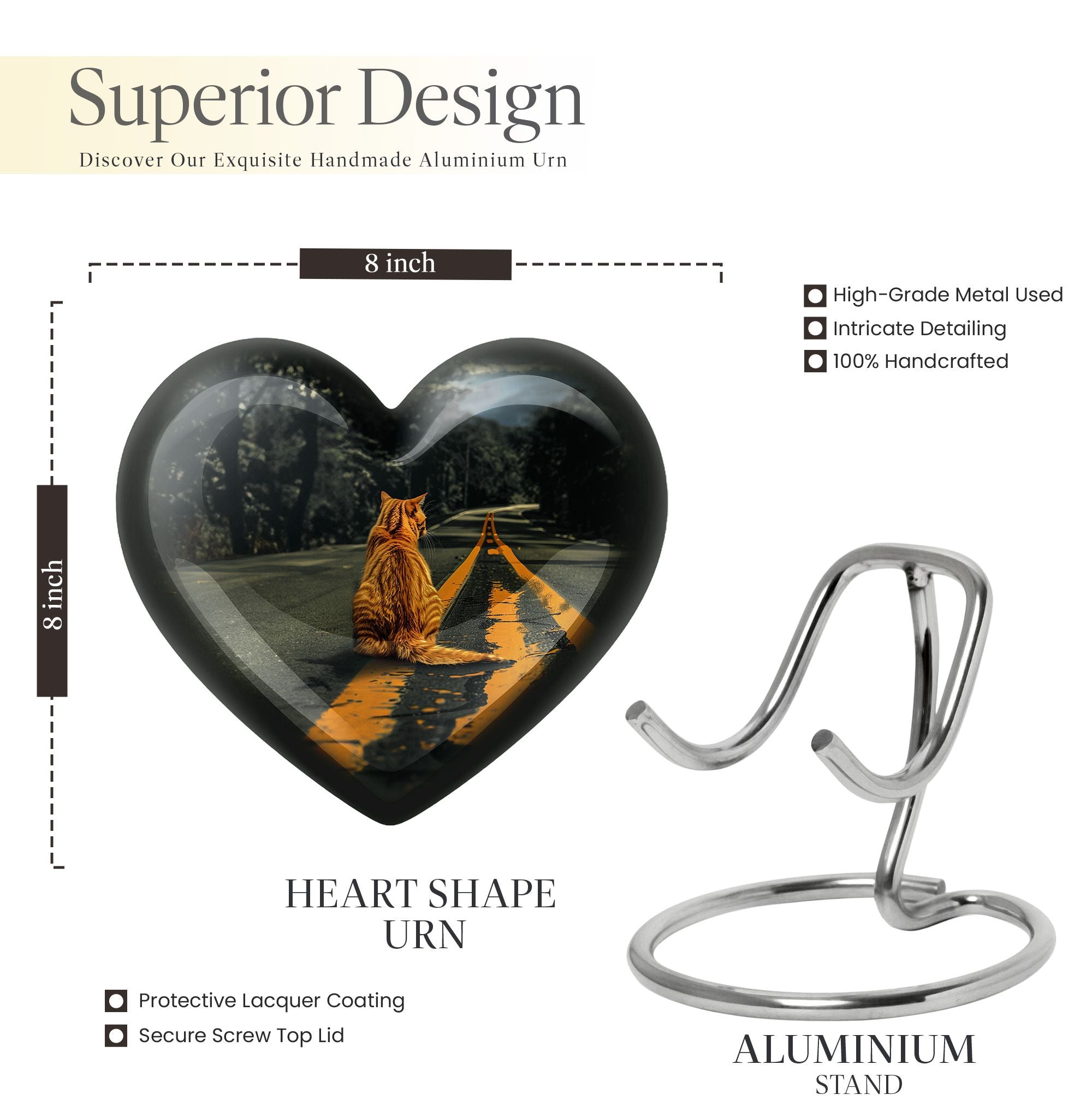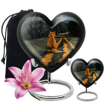 Honor your loved one with our unique, aesthetically pleasing 'orange cat Urn'. As a large 10-Inch burial urn, it showcases an abstract heart-themed motif, offering both uniqueness in design and a personal touch to your memorial ceremony. Weighing a solid 3.3 pounds, this urn has a remarkable dimensional stability with a height of 10 inches. Crafted from resilient aluminium, our urn provides lasting durability, perfect to place in your home or for ground burial. The urn has the capacity to hold up to 200 cubic inches of ashes. To make a more personalized tribute, we offer a customization option to engrave names onto it. Every purchase includes a graceful velvet pouch that ensures safe containment for ashes. Our 'memorial urns' selection caters to both genders with options for dual urns for adult males and females. Take comfort in this functional and symbolic keepsake as it serves as a bittersweet memory of your beloved.